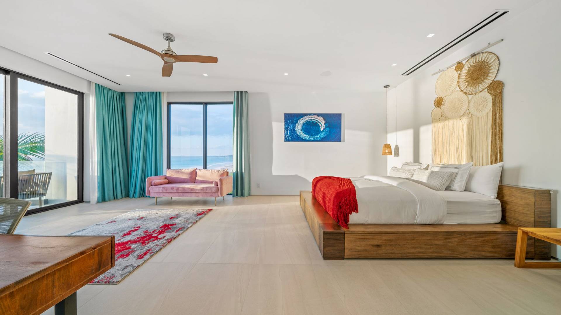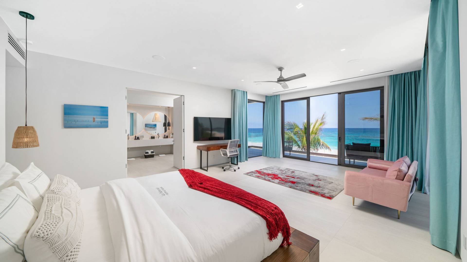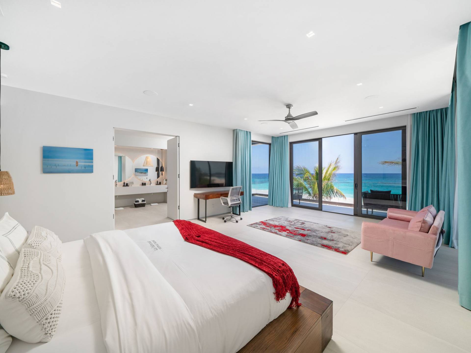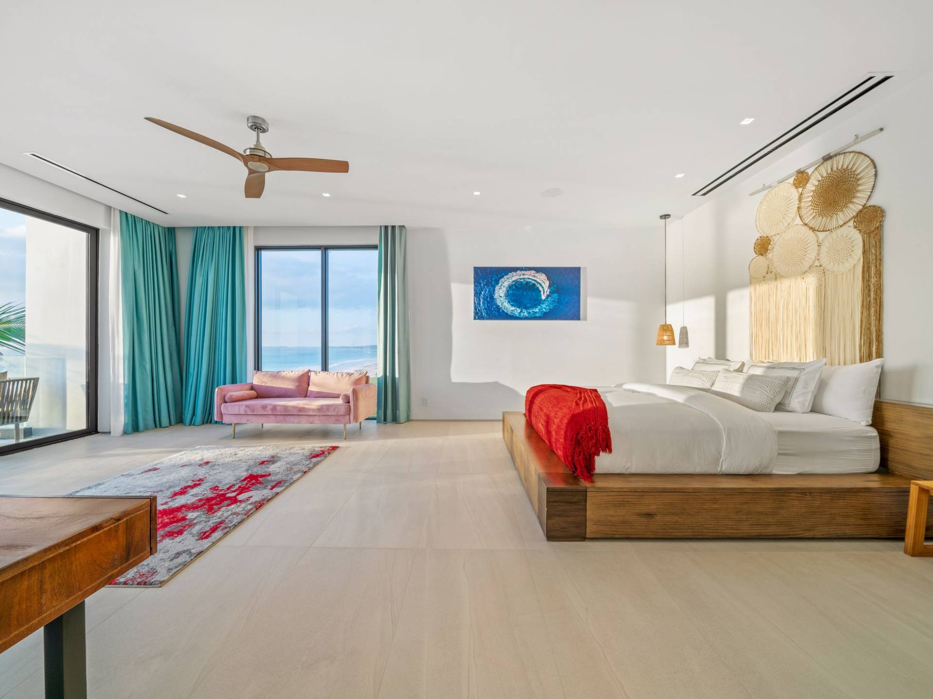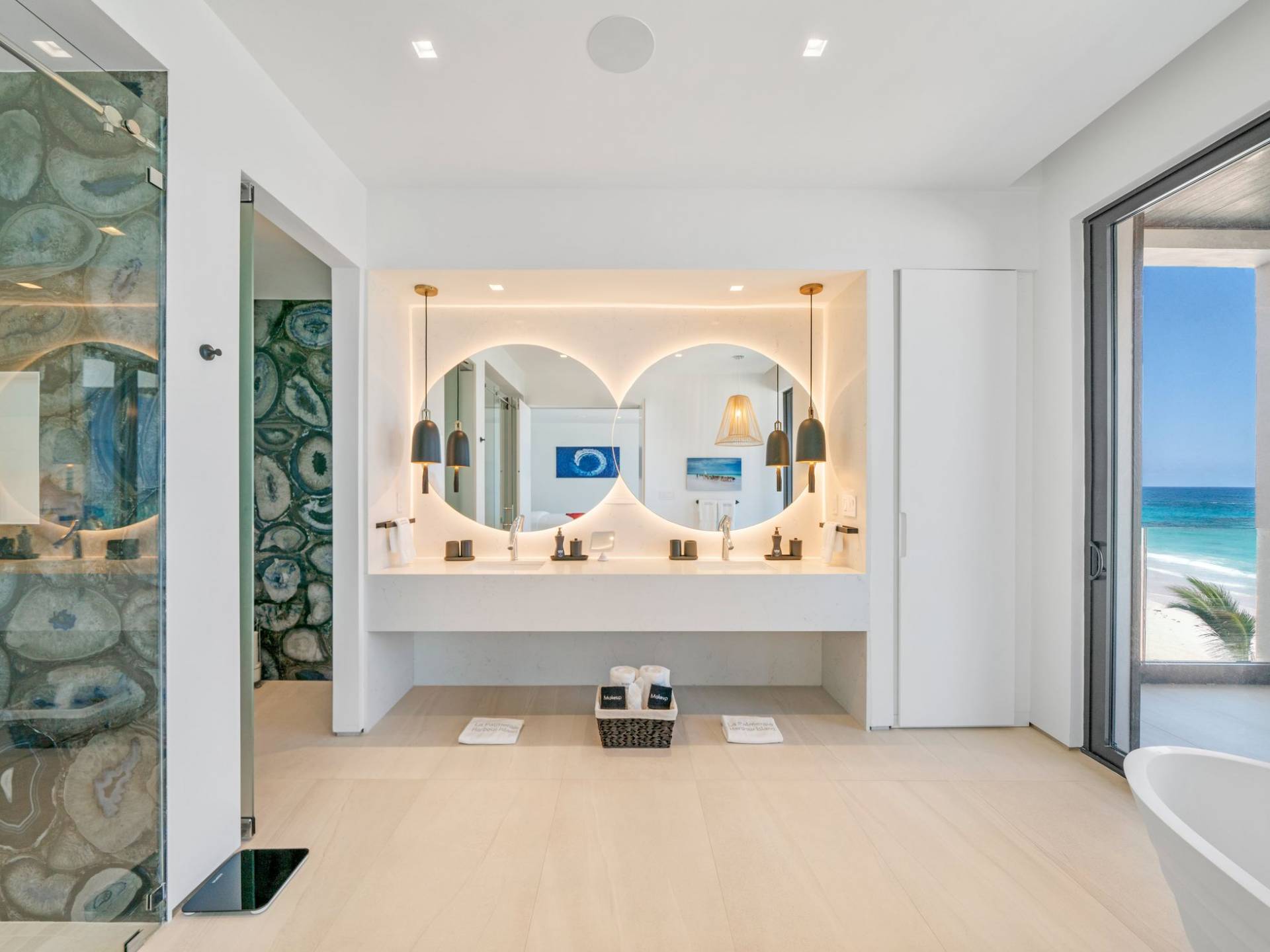 ERSTER STOCK Der weitläufige erste Stock dient als Herzstück des Hauses und verfügt über ein großes offenes Wohnzimmer, eine Gourmetküche und vier luxuriöse Suiten. Glasschiebetüren öffnen sich direkt auf die Strandterrasse und den Infinity-Pool und verbinden das Leben im Innen- und Außenbereich nahtlos. Zwei der Suiten blicken auf die Vorderseite des Hauses, während die anderen beiden direkten Blick auf den Strand und Glasschiebetüren bieten, die einen einfachen Zugang zur Poolterrasse ermöglichen.