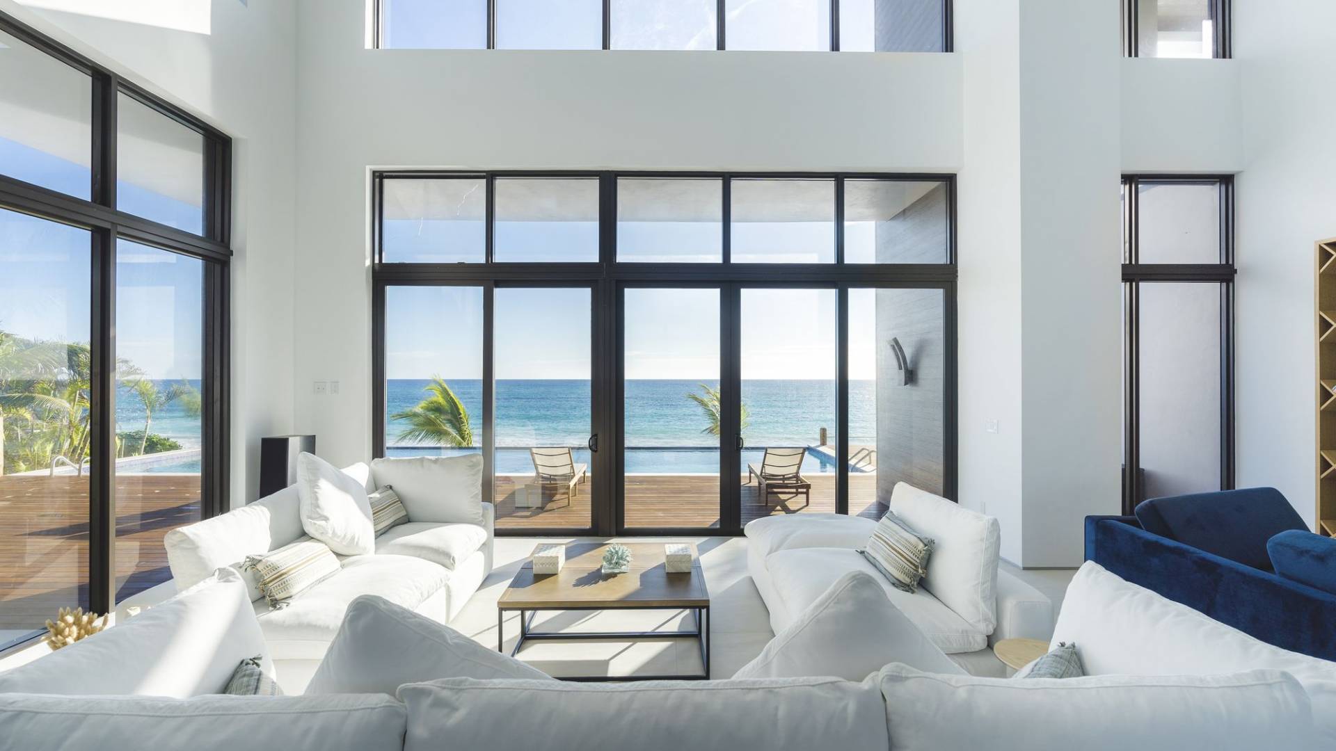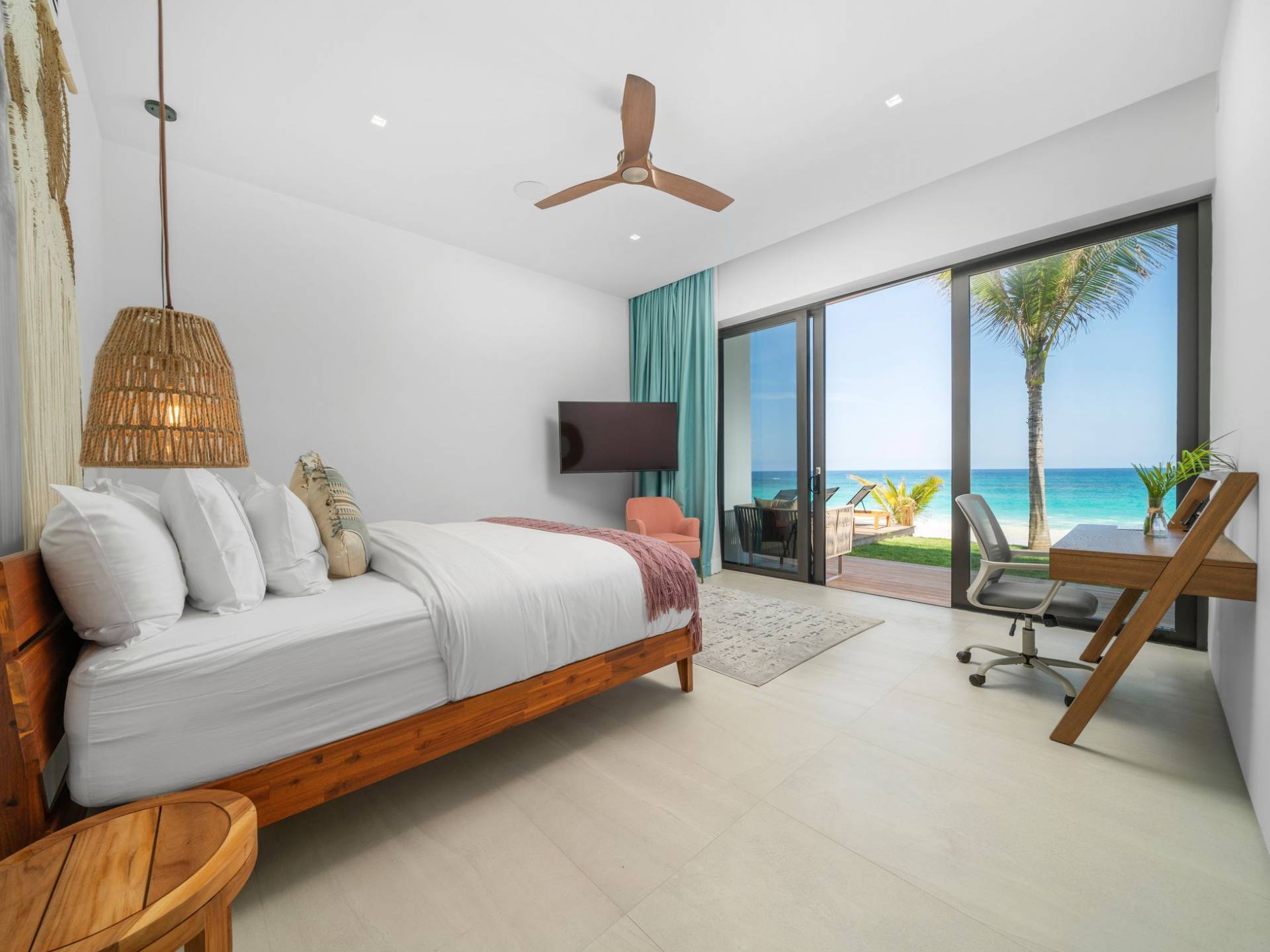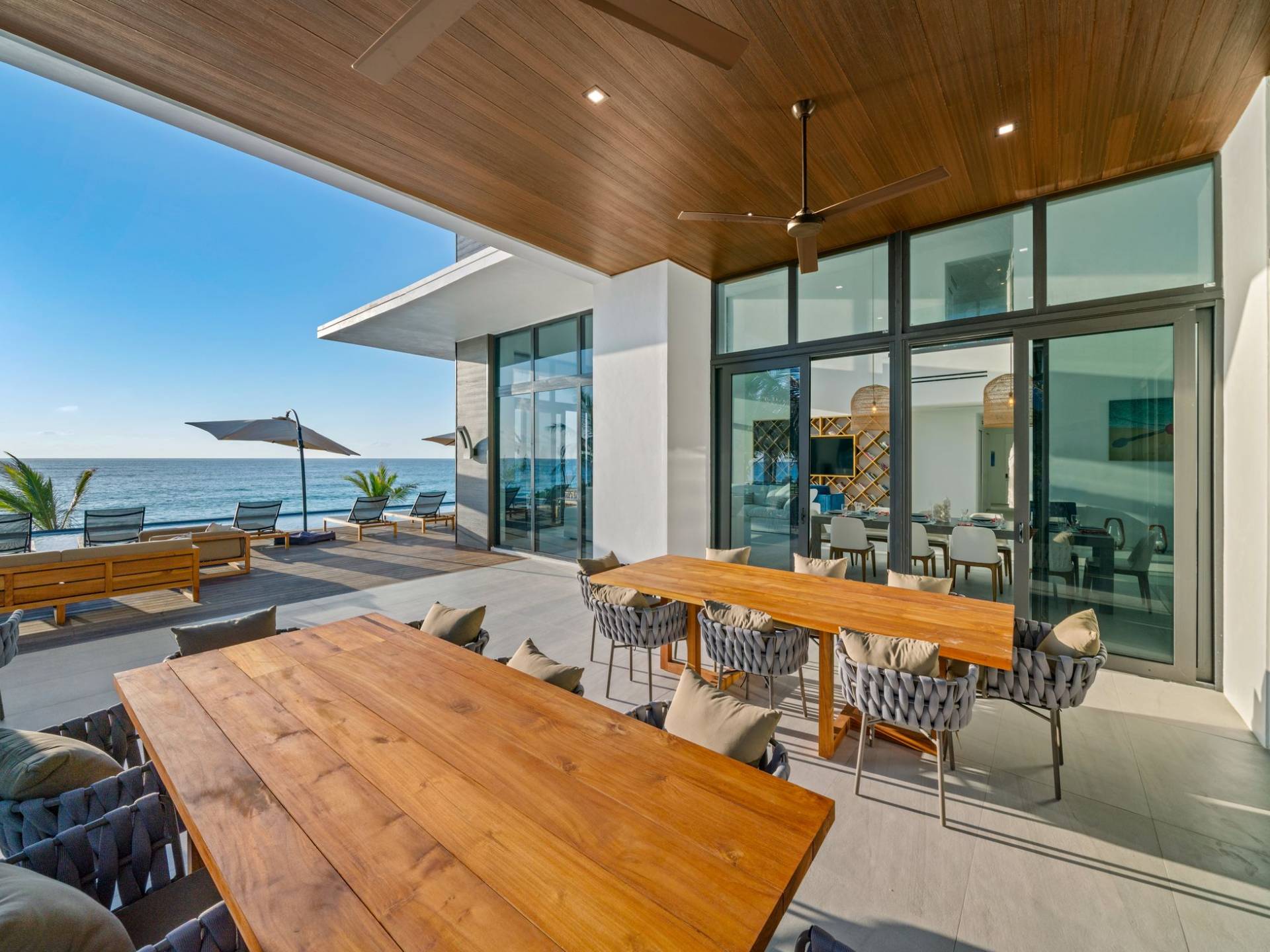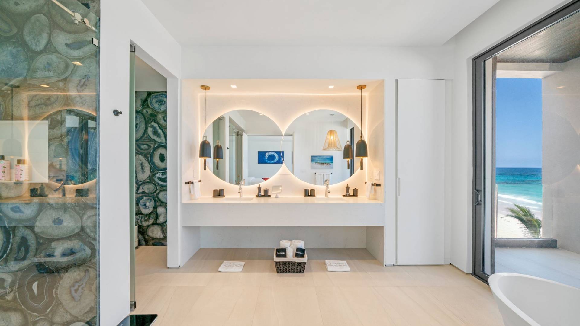 ERSTER STOCK Der weitläufige erste Stock dient als Herzstück des Hauses und verfügt über ein großes offenes Wohnzimmer, eine Gourmetküche und vier luxuriöse Suiten. Glasschiebetüren öffnen sich direkt auf die Strandterrasse und den Infinity-Pool und verbinden das Leben im Innen- und Außenbereich nahtlos. Zwei der Suiten blicken auf die Vorderseite des Hauses, während die anderen beiden direkten Blick auf den Strand und Glasschiebetüren bieten, die einen einfachen Zugang zur Poolterrasse ermöglichen.