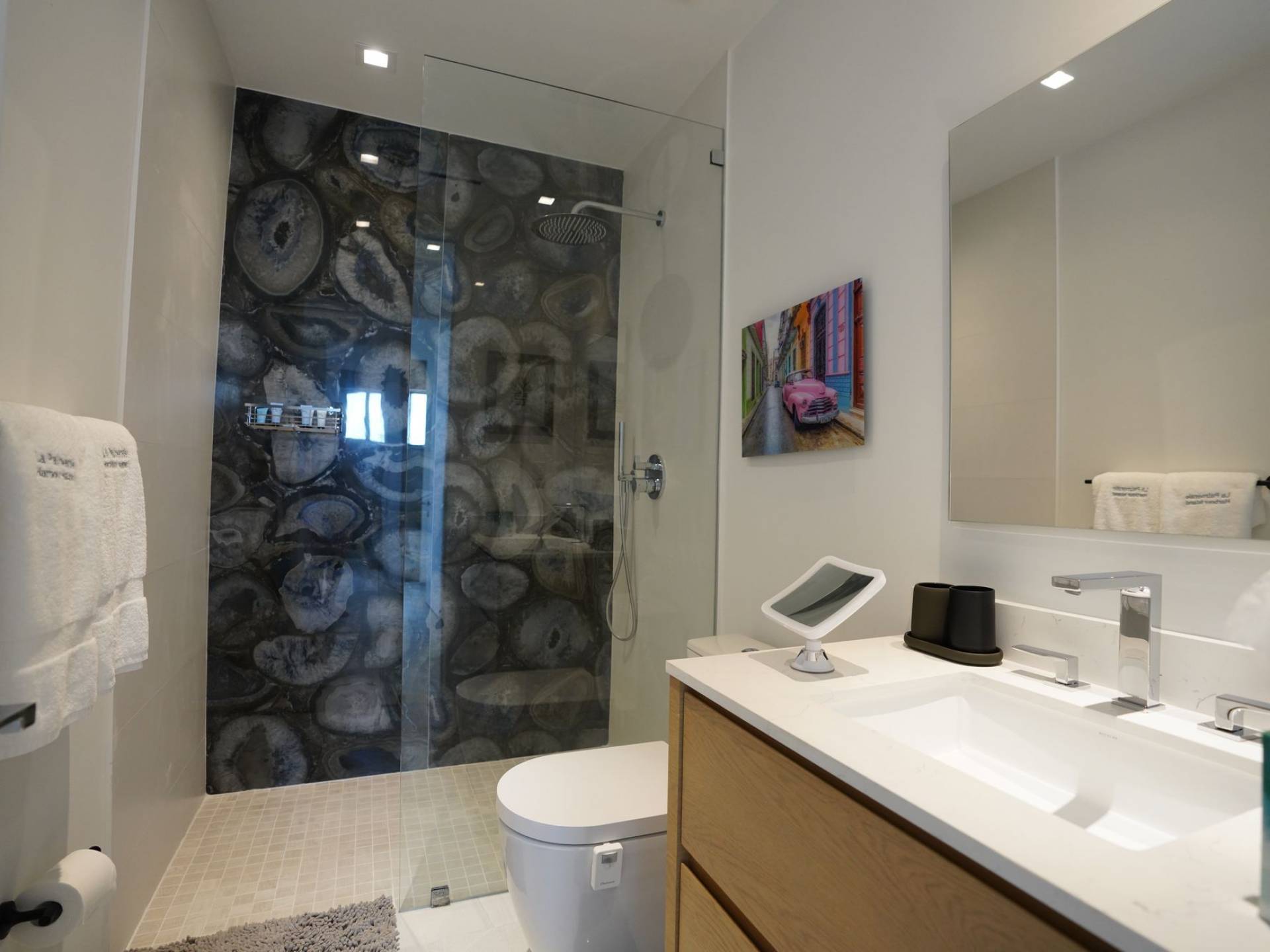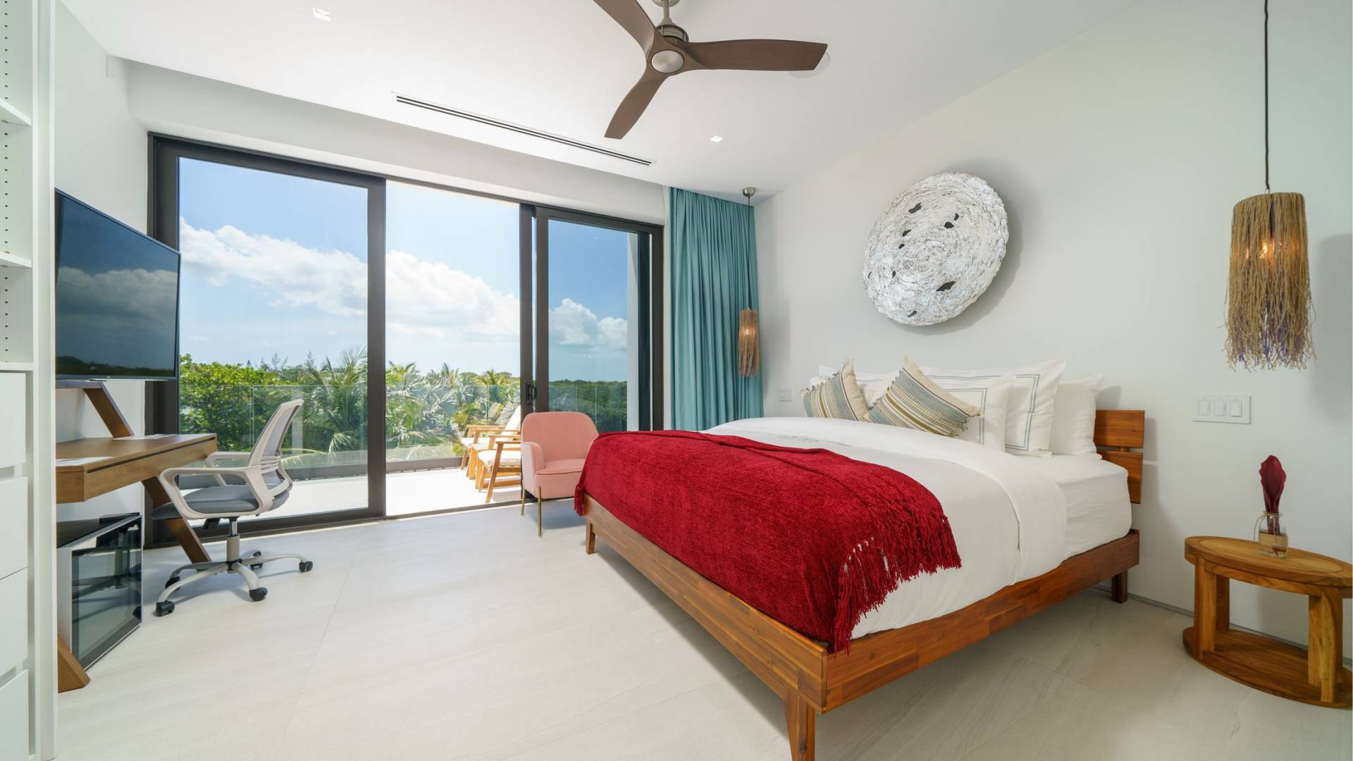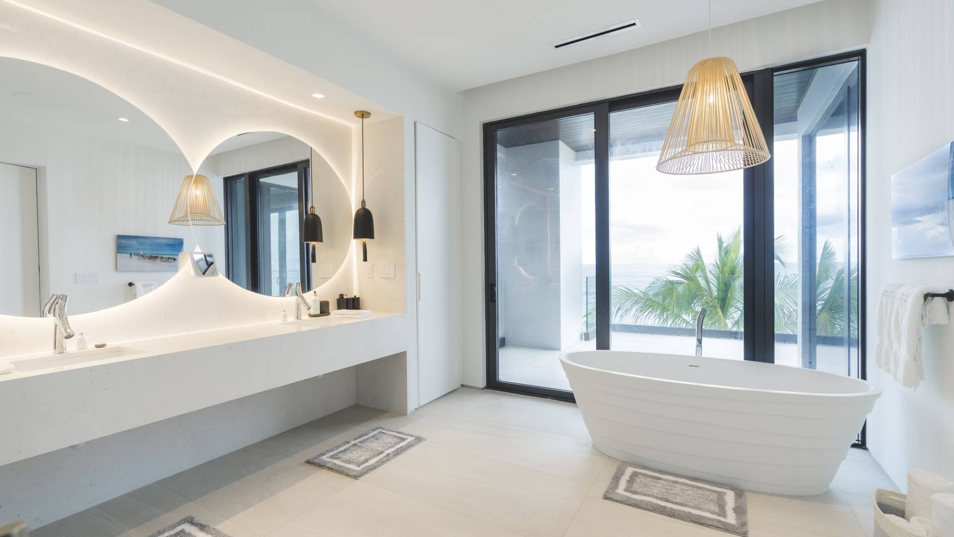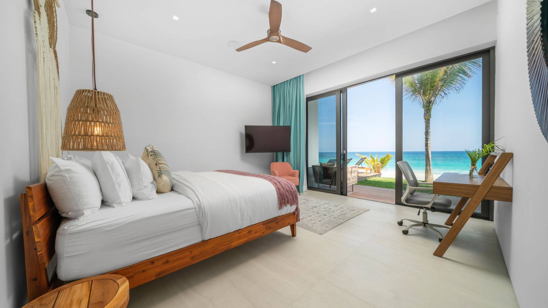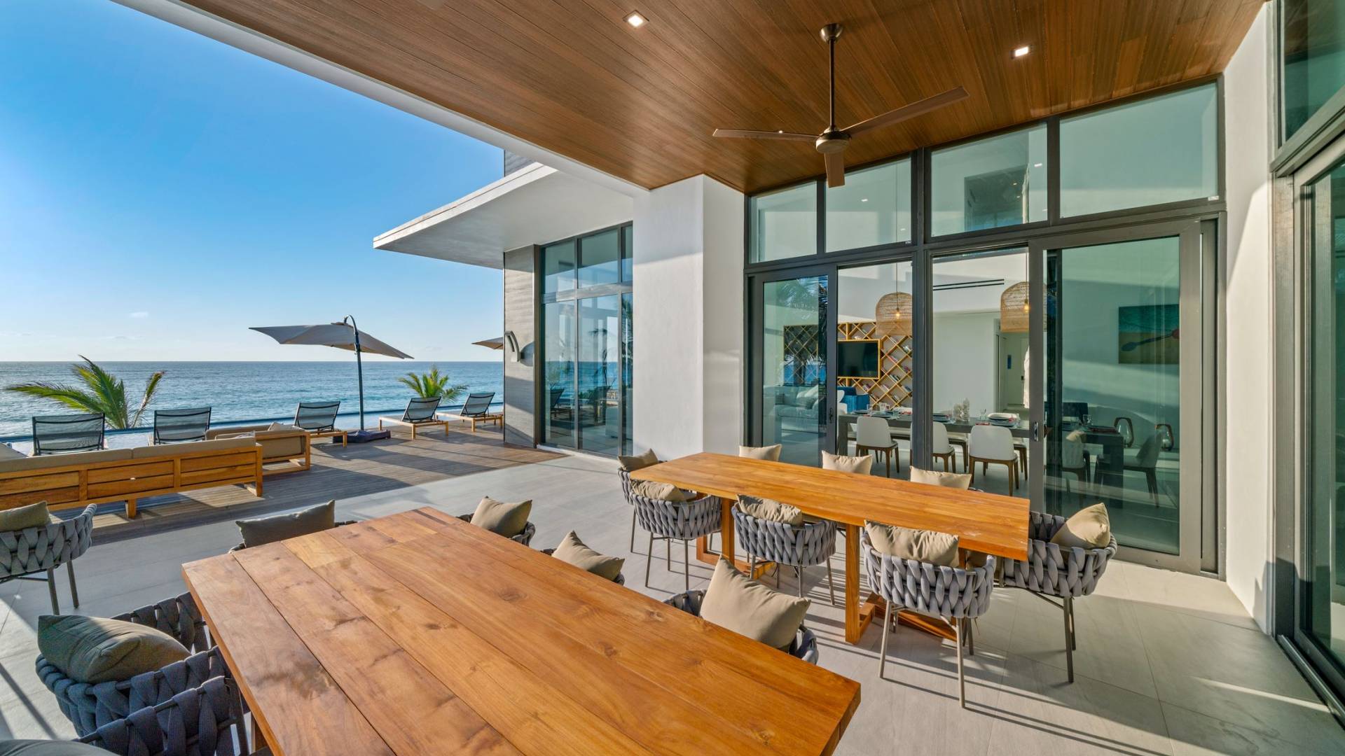 ERSTER STOCK Der weitläufige erste Stock dient als Herzstück des Hauses und verfügt über ein großes offenes Wohnzimmer, eine Gourmetküche und vier luxuriöse Suiten. Glasschiebetüren öffnen sich direkt auf die Strandterrasse und den Infinity-Pool und verbinden das Leben im Innen- und Außenbereich nahtlos. Zwei der Suiten blicken auf die Vorderseite des Hauses, während die anderen beiden direkten Blick auf den Strand und Glasschiebetüren bieten, die einen einfachen Zugang zur Poolterrasse ermöglichen.
