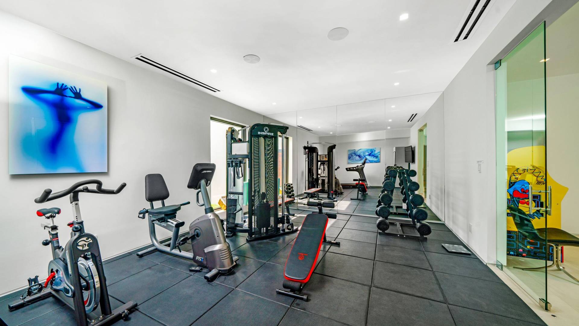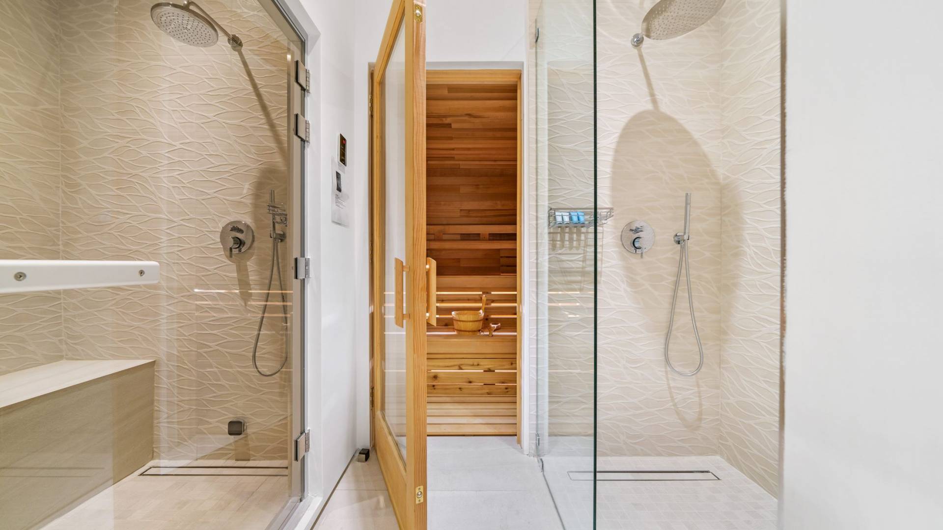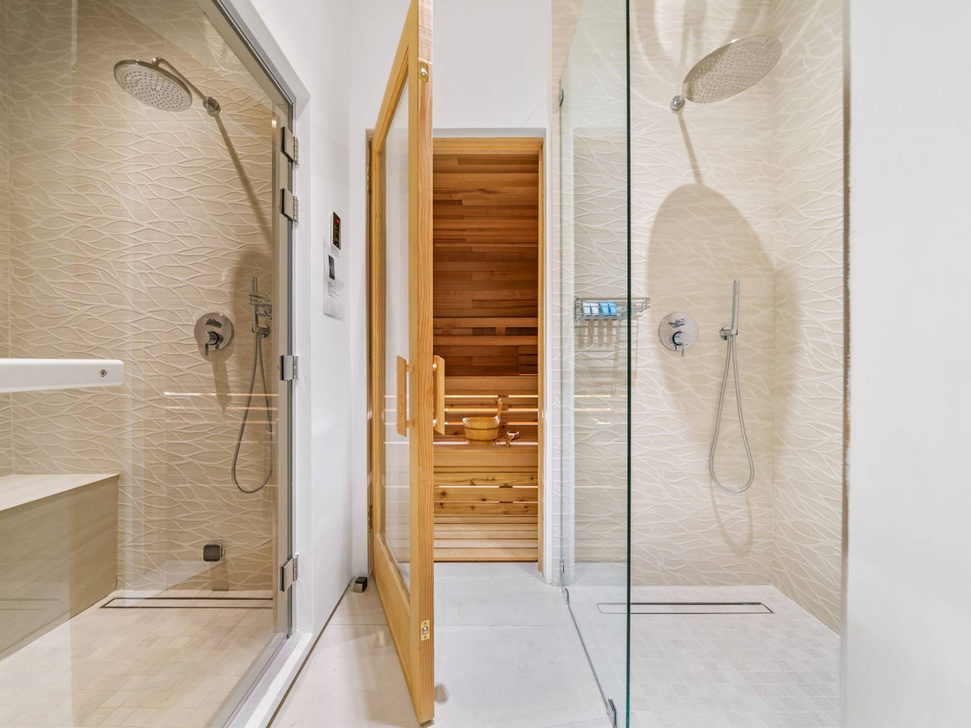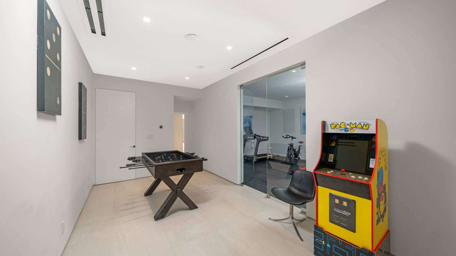 ERDGESCHOSS Das Erdgeschoss ist dem Wohlbefinden und der Erholung gewidmet und verfügt über einen hochmodernen Fitnessraum, eine Sauna, ein Dampfbad und eine Dusche mit angrenzendem Badezimmer. Zur Unterhaltung gibt es ein gemütliches Spielzimmer mit Tischfußball, PacMan-Arcade-Spiel, Dartscheibe und einer Auswahl an Brettspielen.
