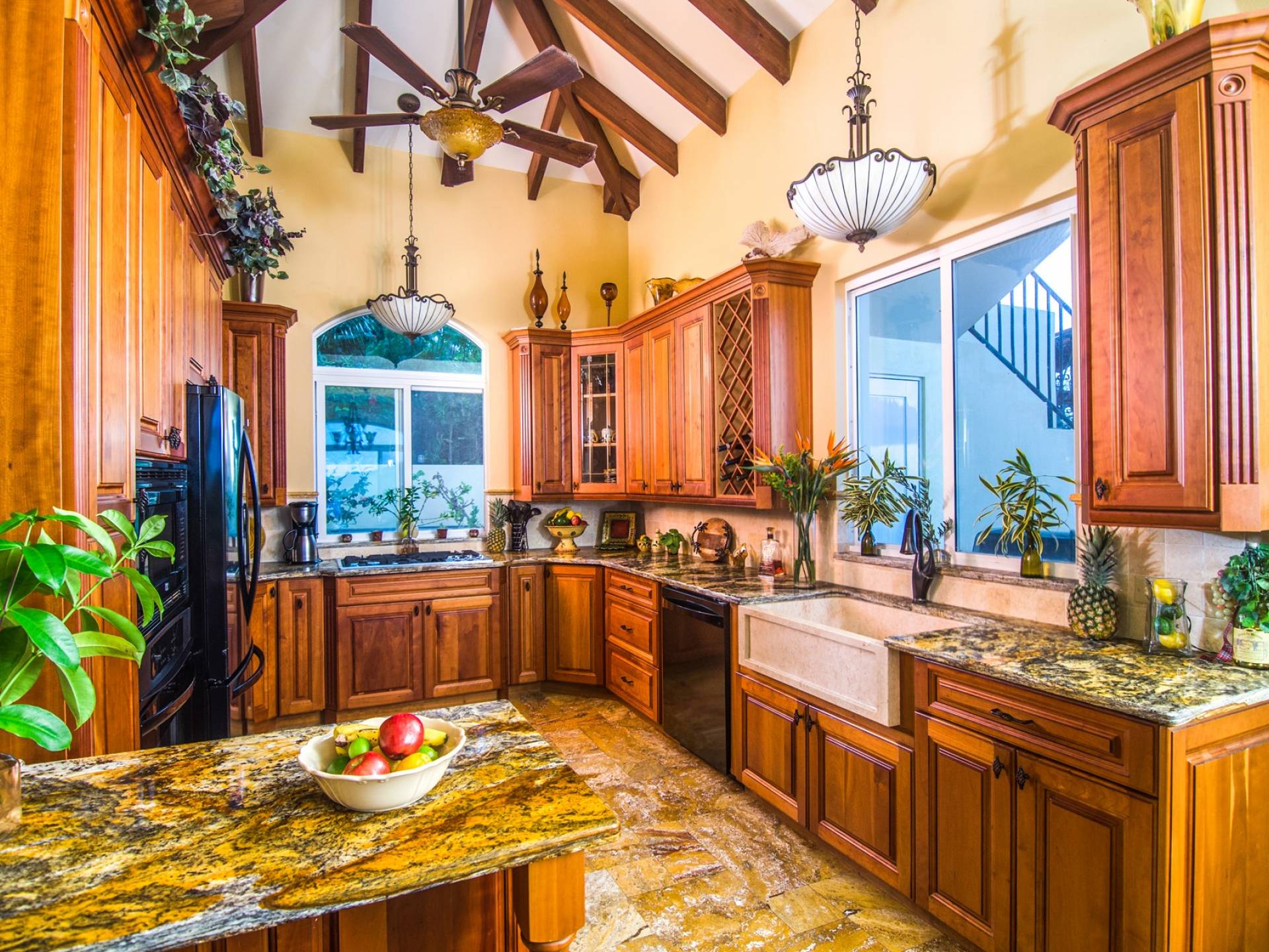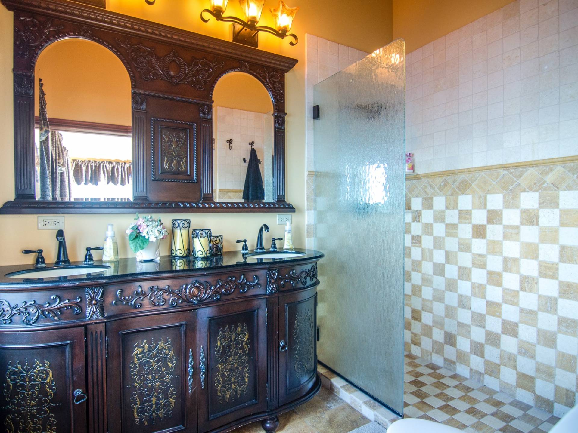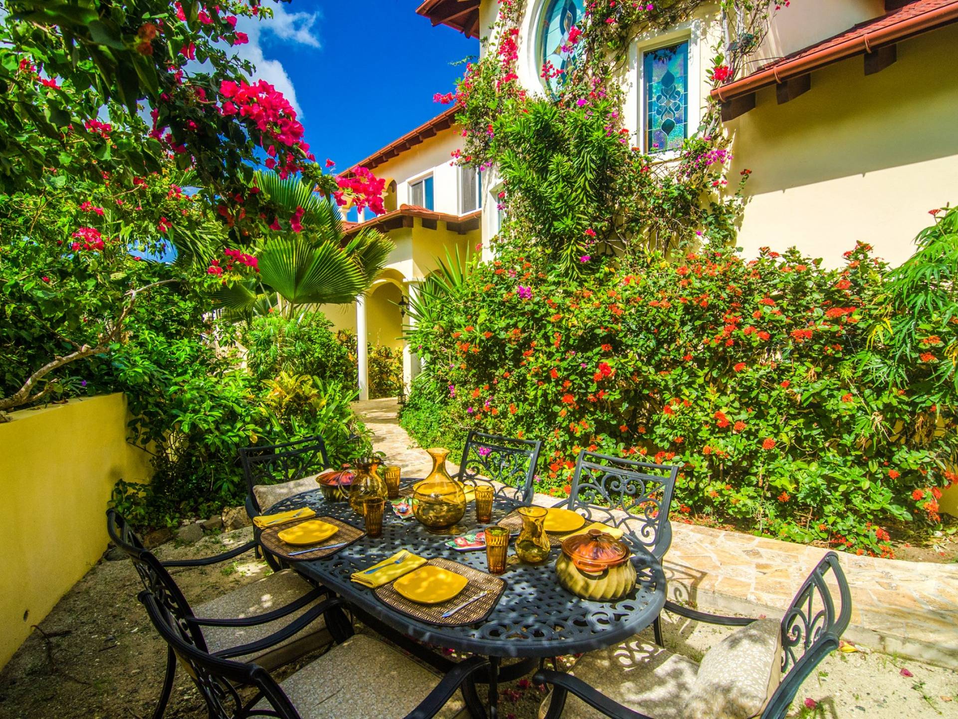 Das Erdgeschoss des Hauses verfügt über eine voll ausgestattete Küche mit Granitarbeitsplatten, ein formelles Esszimmer, ein Wohnzimmer mit einem Unterhaltungszentrum und eine Wäscherei; Gehen Sie den Treppenturm hinauf zum Büro und zum Hauptschlafzimmer. Europäische Handwerker wurden eingeflogen, um die rumänischen Fliesen zu verlegen, die die Villa innen und außen durchziehen. Mit Sonnenschein, blauem Himmel und einem türkisfarbenen Meer im Hintergrund ist das Pooldeck auf zwei Ebenen der richtige Ort! Es gibt einen Gasgrill zum Grillen und einen überdachten Pavillon für Mahlzeiten im Freien mit Blick auf den Infinity-Pool. Am gegenüberliegenden Ende des Hauses befindet sich ein ruhiger „Place in the Rocks“ – eine handgefertigte Terrasse aus einheimischem Stein, die am Fuß mehrerer riesiger Felsbrocken errichtet wurde.