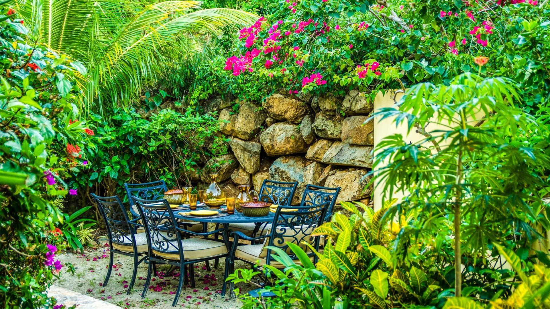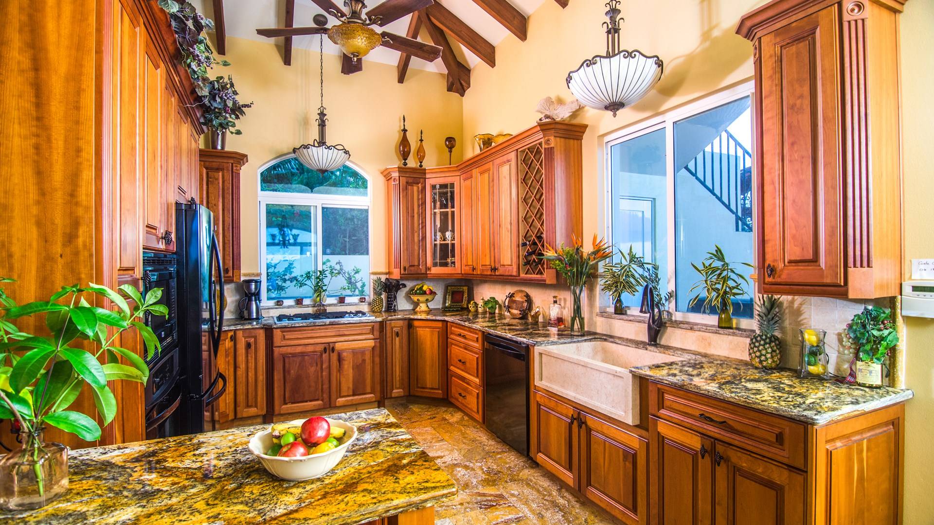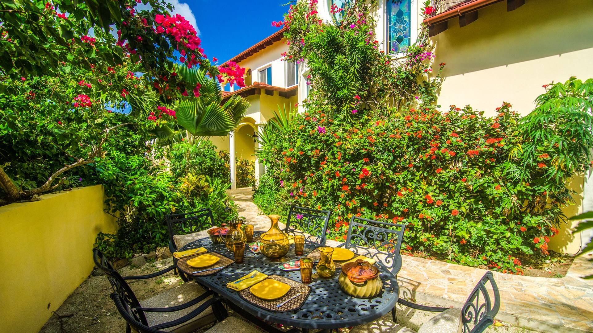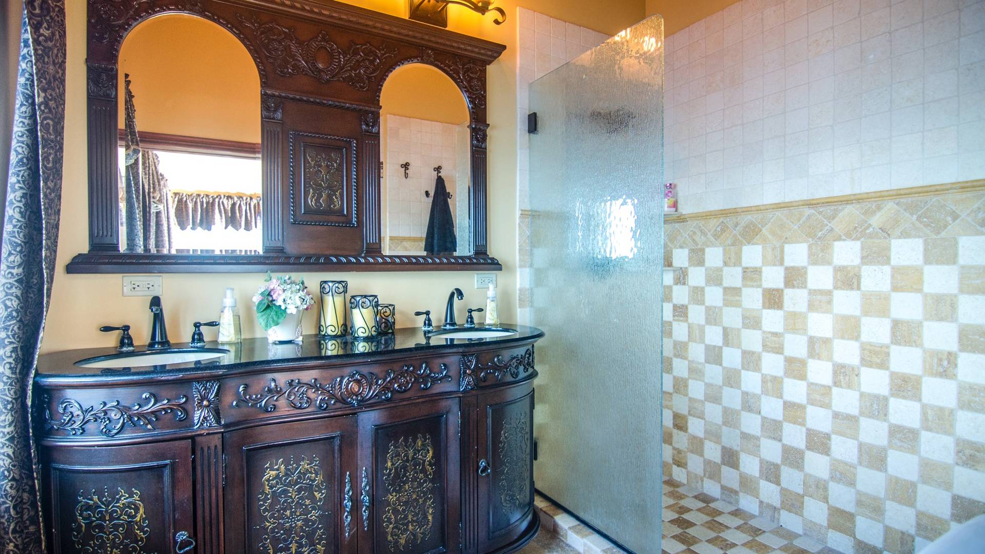 Das Erdgeschoss des Hauses verfügt über eine voll ausgestattete Küche mit Granitarbeitsplatten, ein formelles Esszimmer, ein Wohnzimmer mit einem Unterhaltungszentrum und eine Wäscherei; Gehen Sie den Treppenturm hinauf zum Büro und zum Hauptschlafzimmer. Europäische Handwerker wurden eingeflogen, um die rumänischen Fliesen zu verlegen, die die Villa innen und außen durchziehen. Mit Sonnenschein, blauem Himmel und einem türkisfarbenen Meer im Hintergrund ist das Pooldeck auf zwei Ebenen der richtige Ort! Es gibt einen Gasgrill zum Grillen und einen überdachten Pavillon für Mahlzeiten im Freien mit Blick auf den Infinity-Pool. Am gegenüberliegenden Ende des Hauses befindet sich ein ruhiger „Place in the Rocks“ – eine handgefertigte Terrasse aus einheimischem Stein, die am Fuß mehrerer riesiger Felsbrocken errichtet wurde.