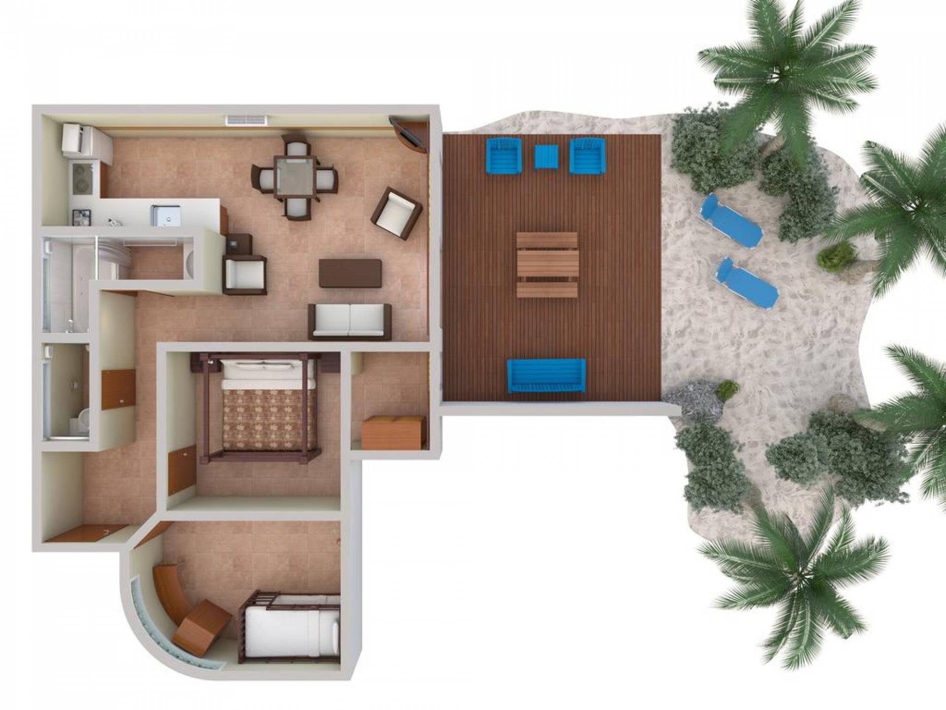 Diese Suiten verfügen über ein Hauptschlafzimmer mit einem Kingsize-Himmelbett, das sich auf die Veranda öffnet, ein zweites Schlafzimmer mit zwei Einzelbetten oder zwei Etagenbetten, eine voll ausgestattete Küche (einschließlich Mikrowelle, Kochfeld, Kühlschrank, Tee-/Kaffeezubereiter) Einrichtungen), ein gefliestes Badezimmer mit Whirlpool/Dusche, separater Toilette und ein Wohn- und Esszimmer, das sich auf eine geräumige Veranda öffnet. Das Wohnzimmer ist mit Sat-TV, Sofa, Sesseln, Esstisch und Stühlen ausgestattet, die zum Essen drinnen oder im Freien verwendet werden können. Die Suiten mit 2 Schlafzimmern am Strand verfügen außerdem über zwei separate, individuell regulierbare Klimaanlagen im Wohnzimmer und im Flur.
