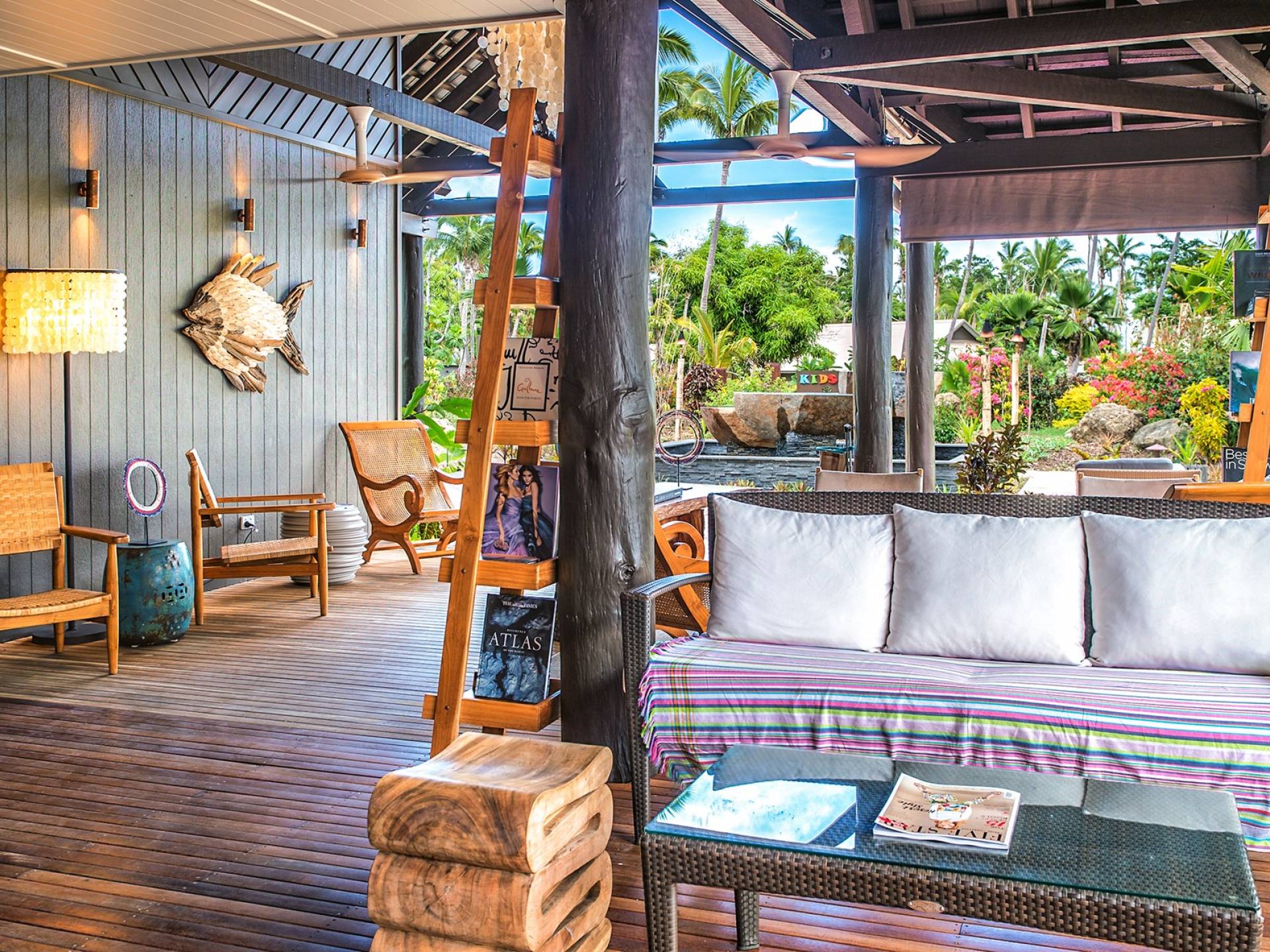 Mit starken Design-Anklängen an Ozeanien ist dieses Meisterwerk mit 5 Schlafzimmern unbestreitbar Fidschis architektonisch fortschrittlichste und luxuriöseste Residenz, die Sonne, Schatten, Brise und natürlich atemberaubende Ausblicke auf das Meer optimal nutzt. Der Hauptkomplex ist ein durch Glas geteiltes „Langhaus“ mit Wohn-, Ess-, Küchen-, Back-of-House-Funktionen und einem weitläufigen überdachten Veranstaltungsbereich im Freien. Die Wohn- und Esszimmer werden durch minimale Glastüren definiert, die sich wegschieben lassen, damit sich die sehr große Lounge, das Esszimmer und der Eingangsbereich zu einem durchgehenden Raum verbinden, der zu Unterhaltungsdecks mit Blick auf den 25 Meter langen Infinity-Pool mit Holzkohlefliesen führt.
