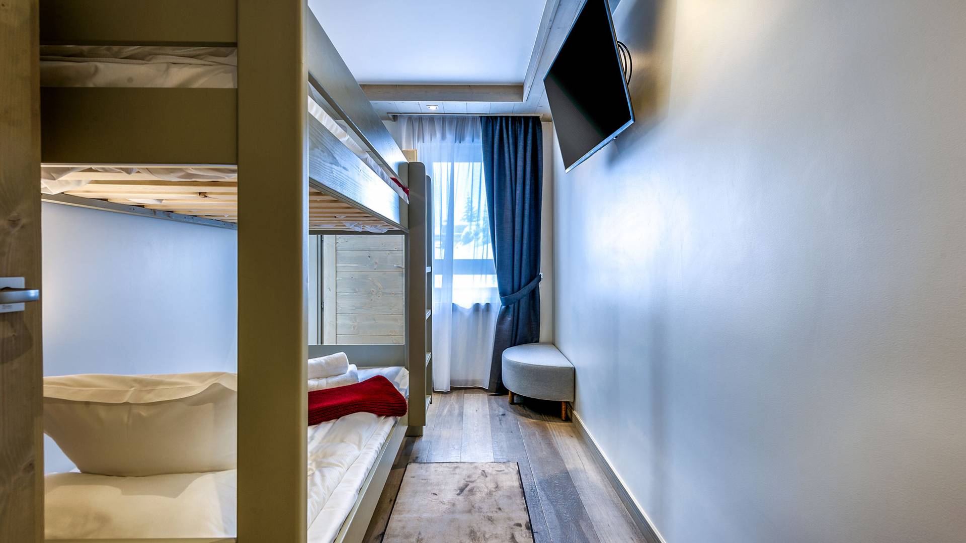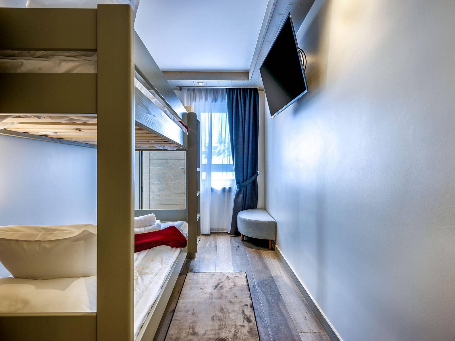 Das Apartment A03, das sich im 1. Stock der Residence Le C befindet, ist mit einer Fläche von 109 m² ideal für bis zu 8 Personen. Dieses Apartment verfügt über zwei Schlafzimmer mit Doppelbetten, zwei Schlafzimmerkabinen mit einem Etagenbett und drei Badezimmer. Das Wohnzimmer mit TV hat auch einen Essbereich, eine voll ausgestattete Küche und einen Balkon. Während Ihres Urlaubs profitieren Sie von einem Stellplatz auf dem Privatparkplatz, einem Skiraum und WLAN-Zugang.