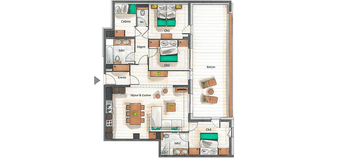 Das Apartment B05 im 1. Stock der Whistler Lodge Courchevel 1650 mit einer Fläche von 135 m² ist perfekt für 8 Personen mit maximal 6 Erwachsenen geeignet.