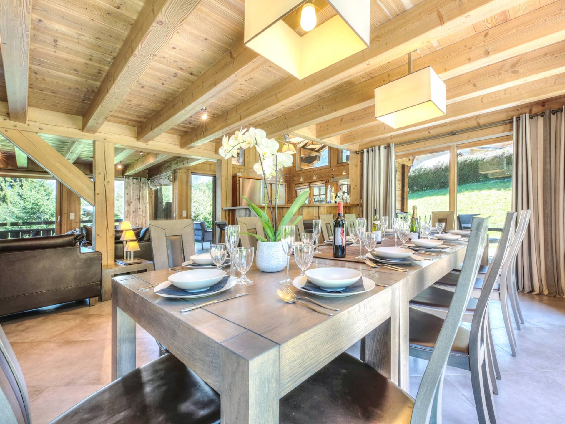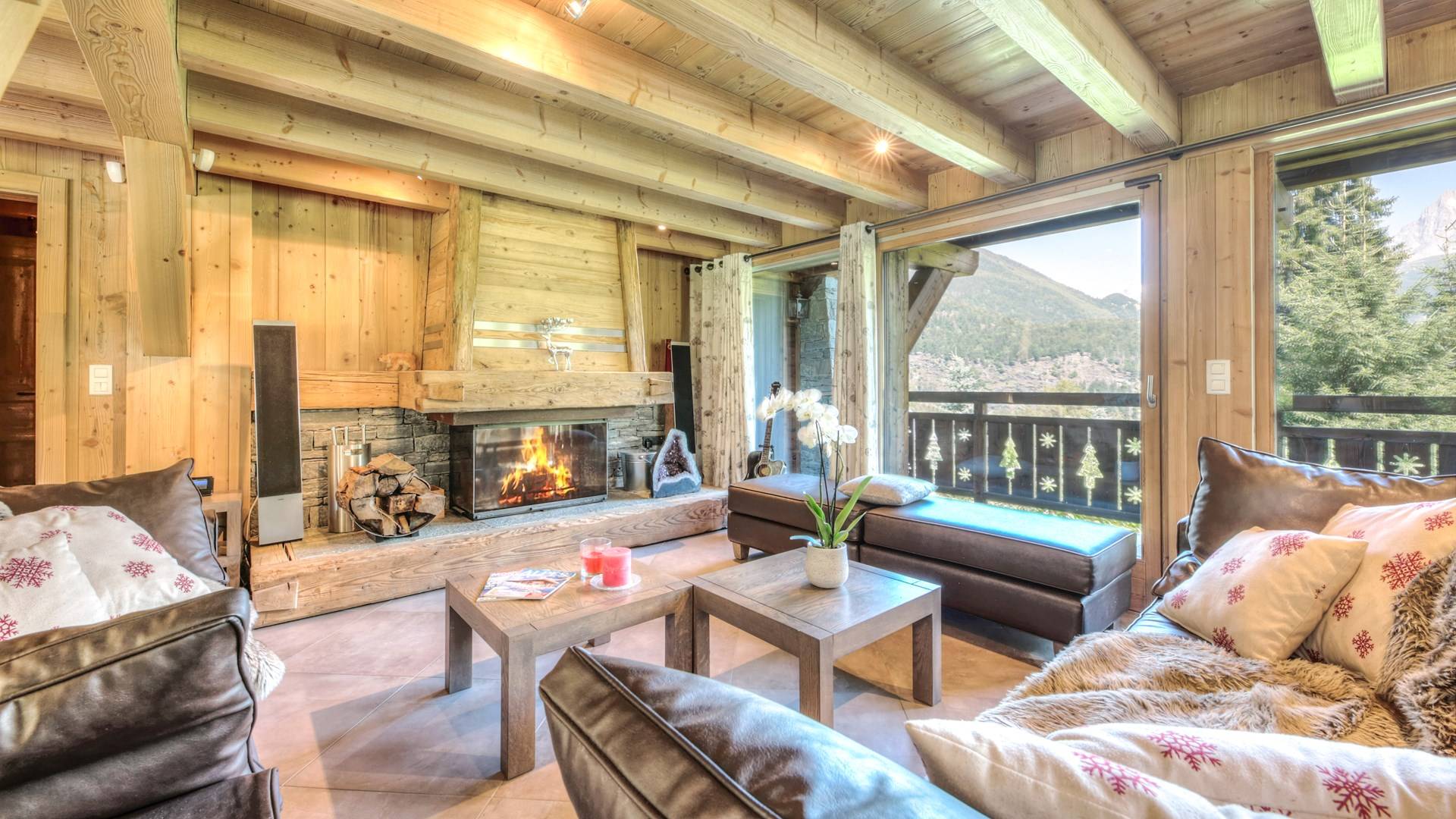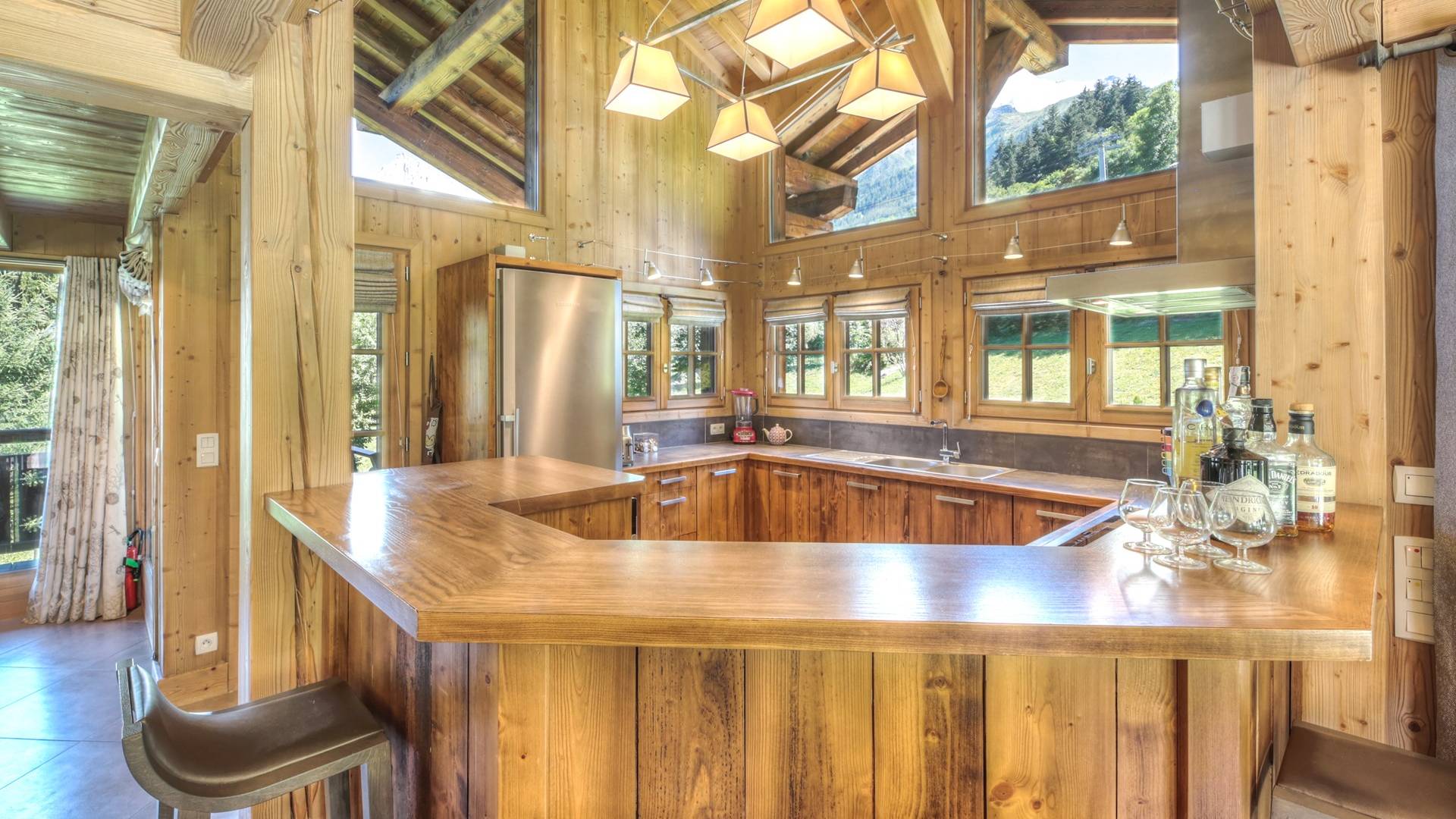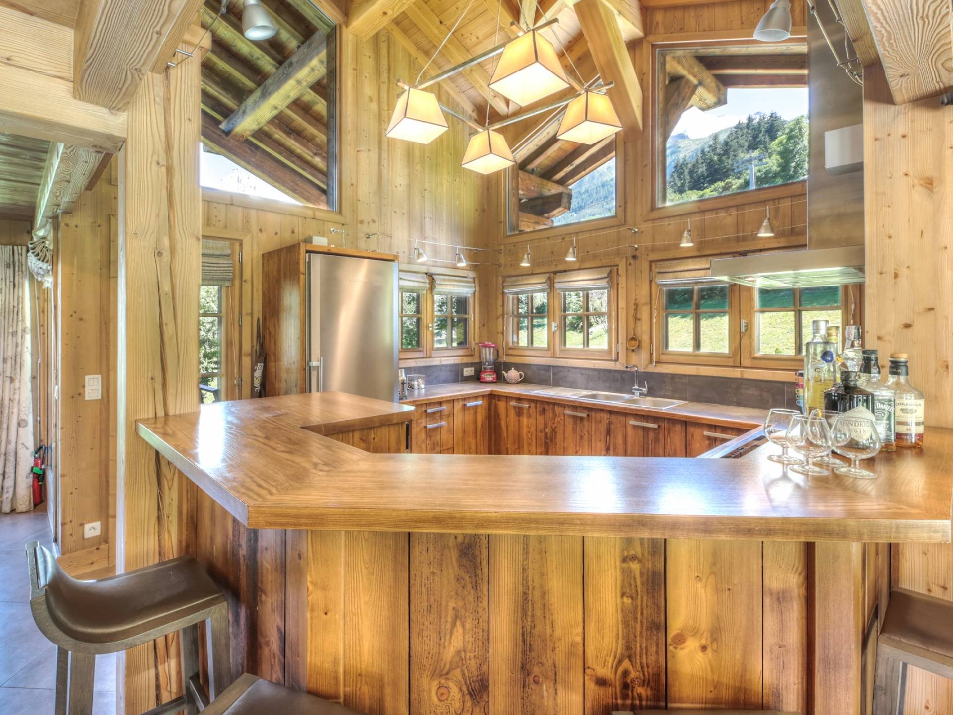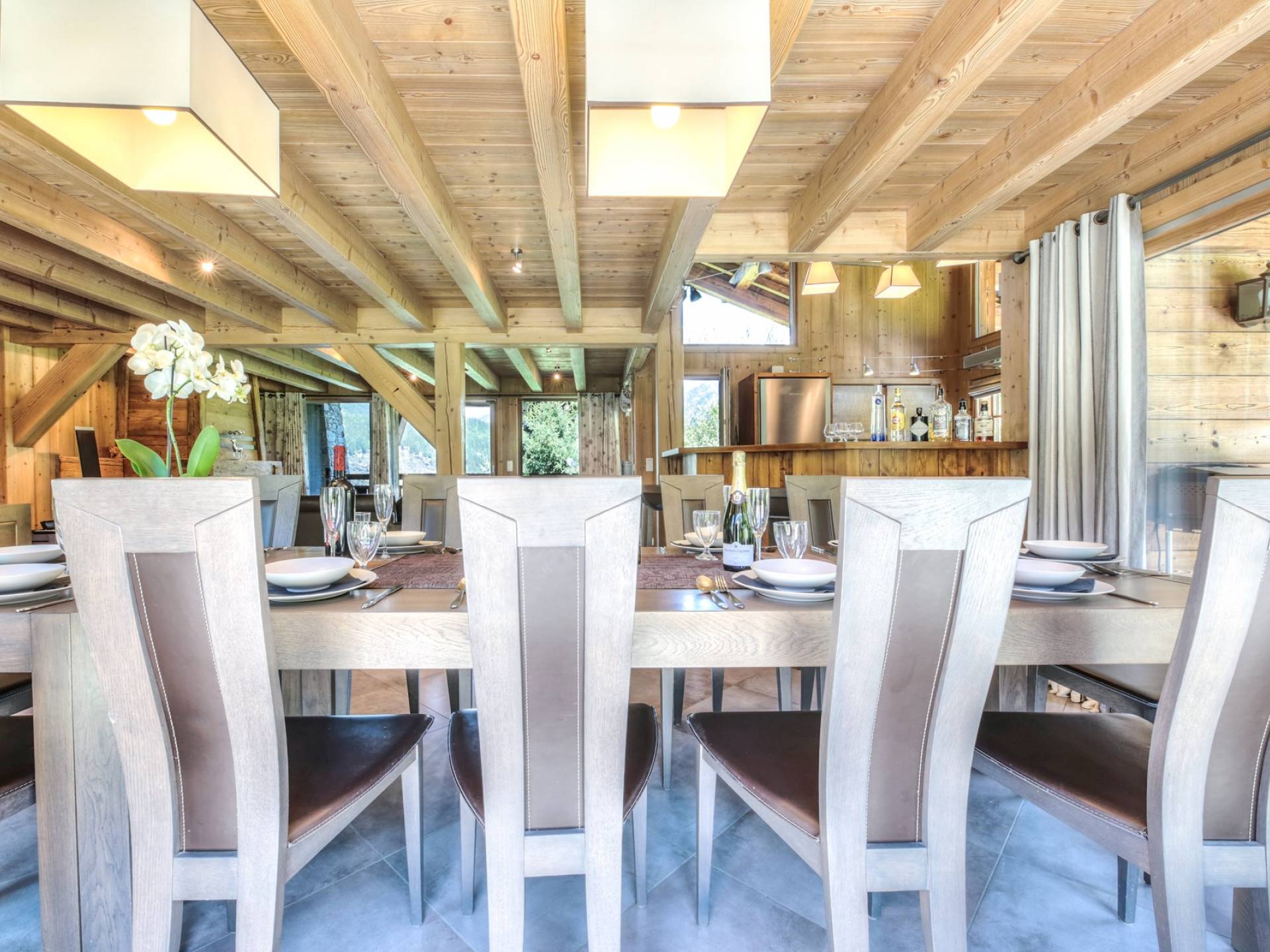 Im ersten Stock entdecken Sie ein großes Wohnzimmer mit einem schönen traditionellen Holzkamin, einem Essbereich, großen Erkerfenstern mit Blick auf den Garten und einem eingelassenen Whirlpool. Das Chalet verfügt über eine offene Küche mit Bar, was es zu einem sehr geselligen Bereich macht, um Gäste zu unterhalten, und perfekt für einen Skiurlaub mit Vollverpflegung. Das Wohnzimmer öffnet sich auf eine überdachte Terrasse mit direktem Zugang zu einem großen umzäunten Garten und einem eingelassenen Whirlpool mit Ozonfiltersystem.