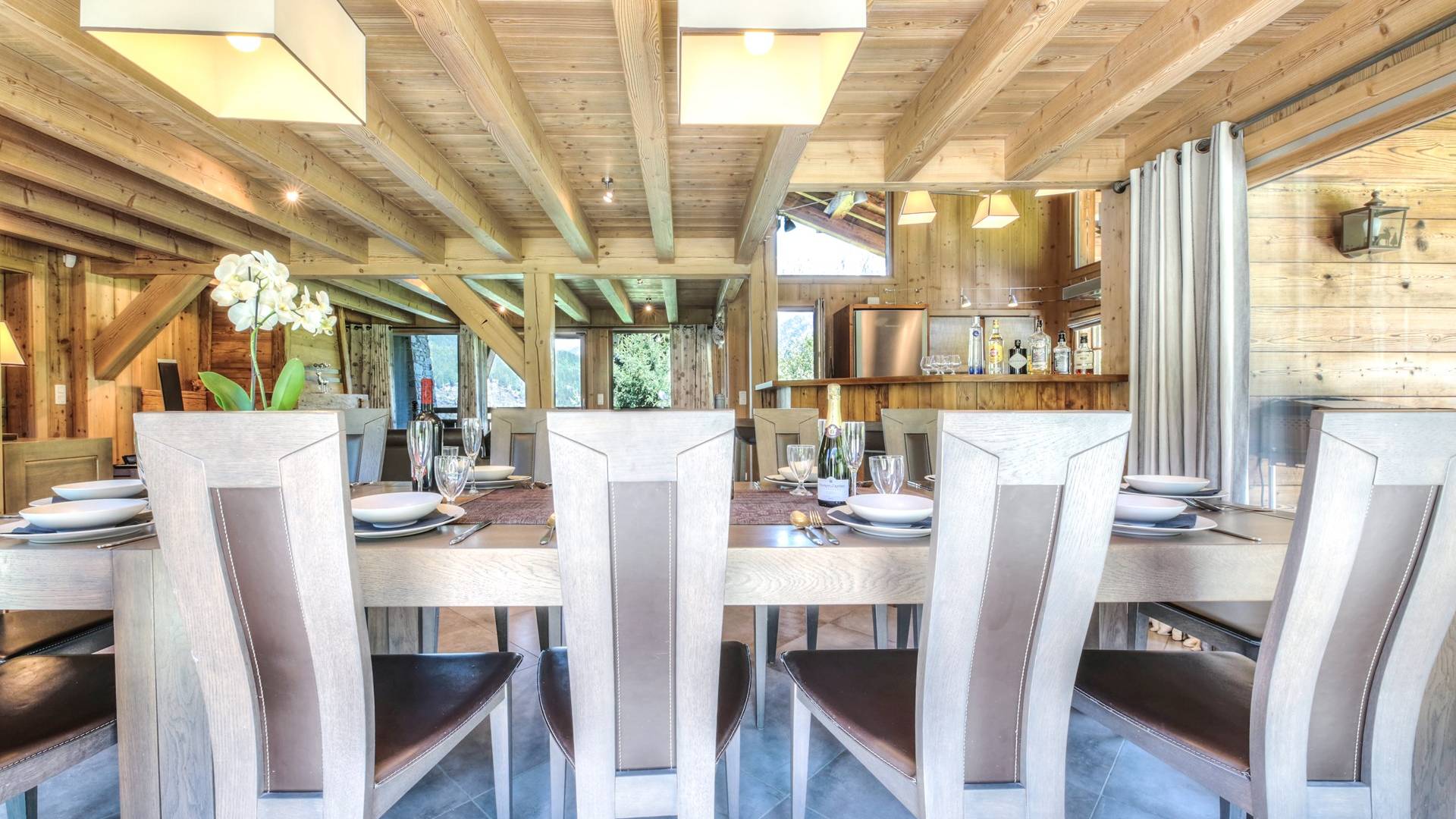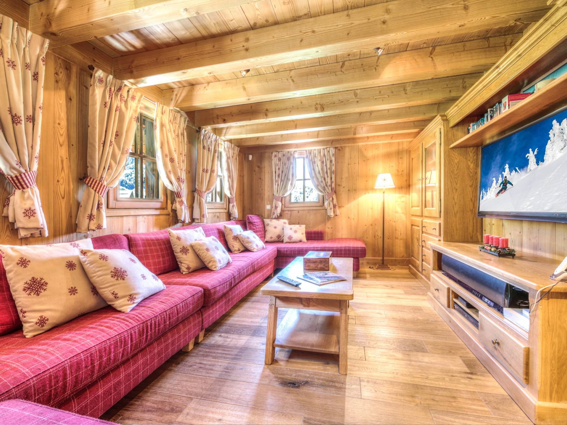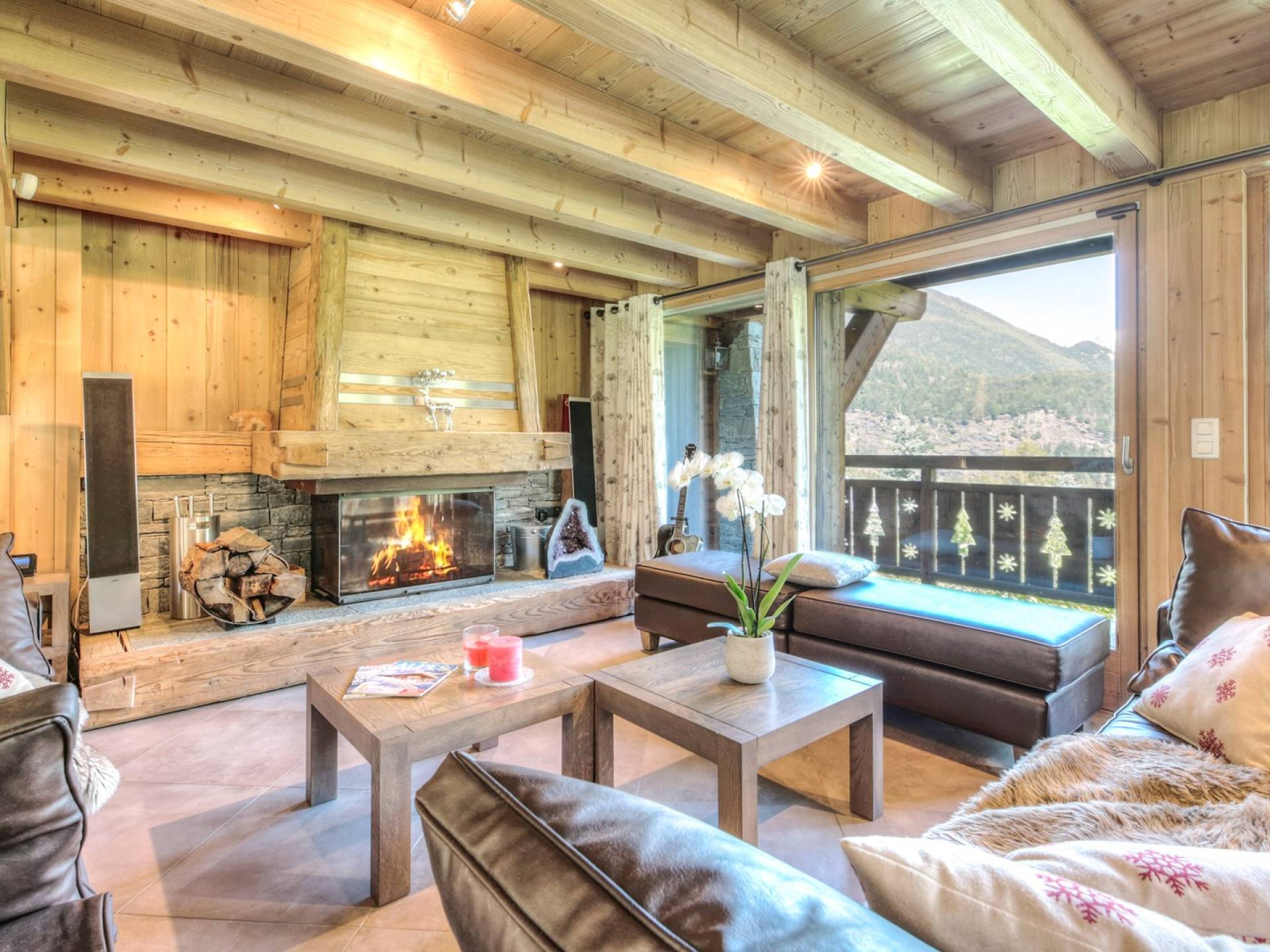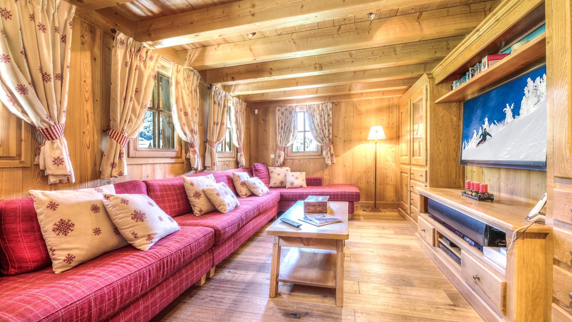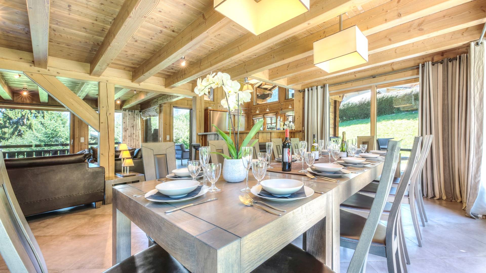 Im ersten Stock entdecken Sie ein großes Wohnzimmer mit einem schönen traditionellen Holzkamin, einem Essbereich, großen Erkerfenstern mit Blick auf den Garten und einem eingelassenen Whirlpool. Das Chalet verfügt über eine offene Küche mit Bar, was es zu einem sehr geselligen Bereich macht, um Gäste zu unterhalten, und perfekt für einen Skiurlaub mit Vollverpflegung. Das Wohnzimmer öffnet sich auf eine überdachte Terrasse mit direktem Zugang zu einem großen umzäunten Garten und einem eingelassenen Whirlpool mit Ozonfiltersystem.