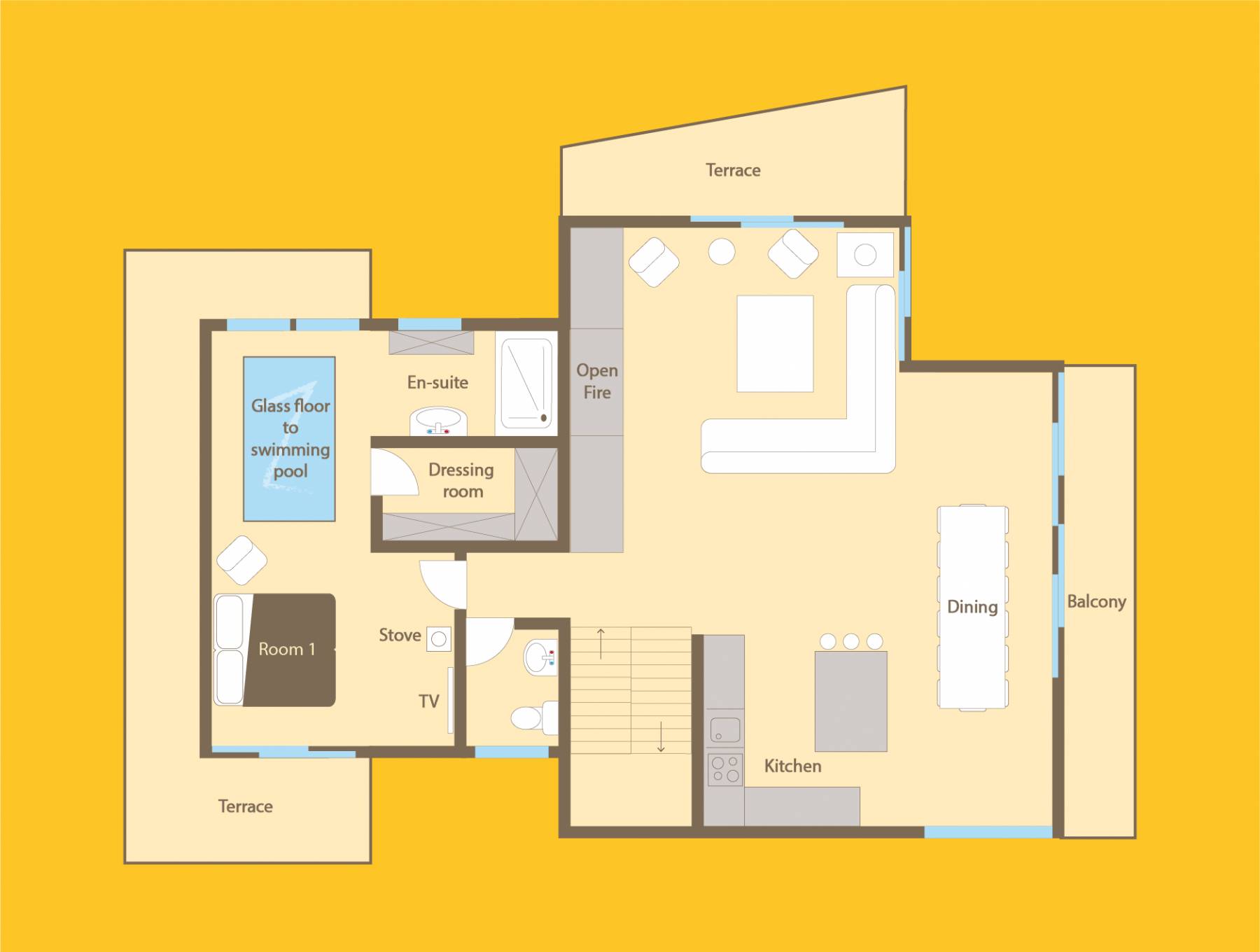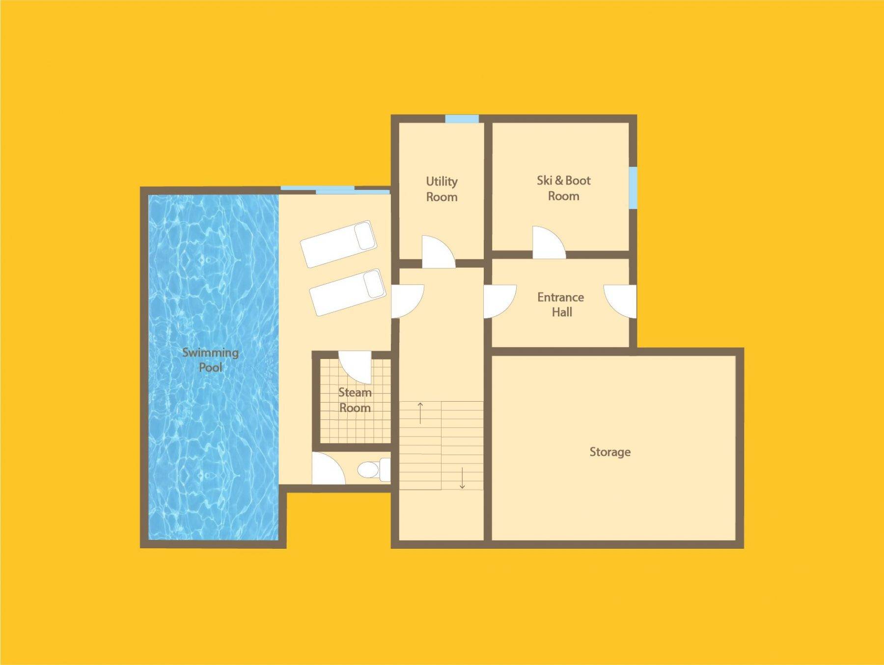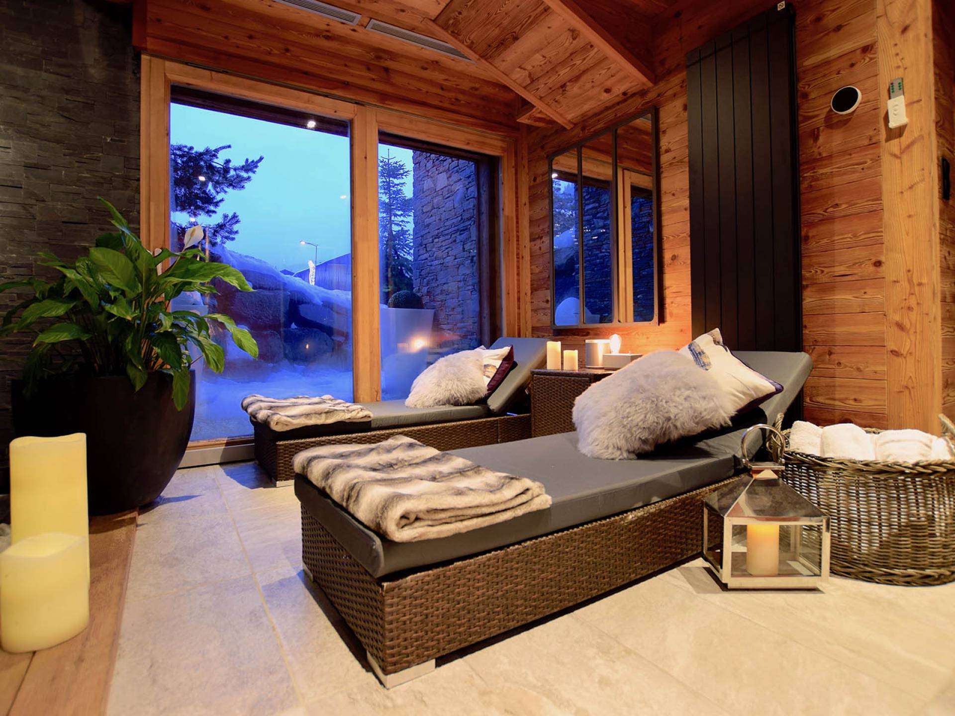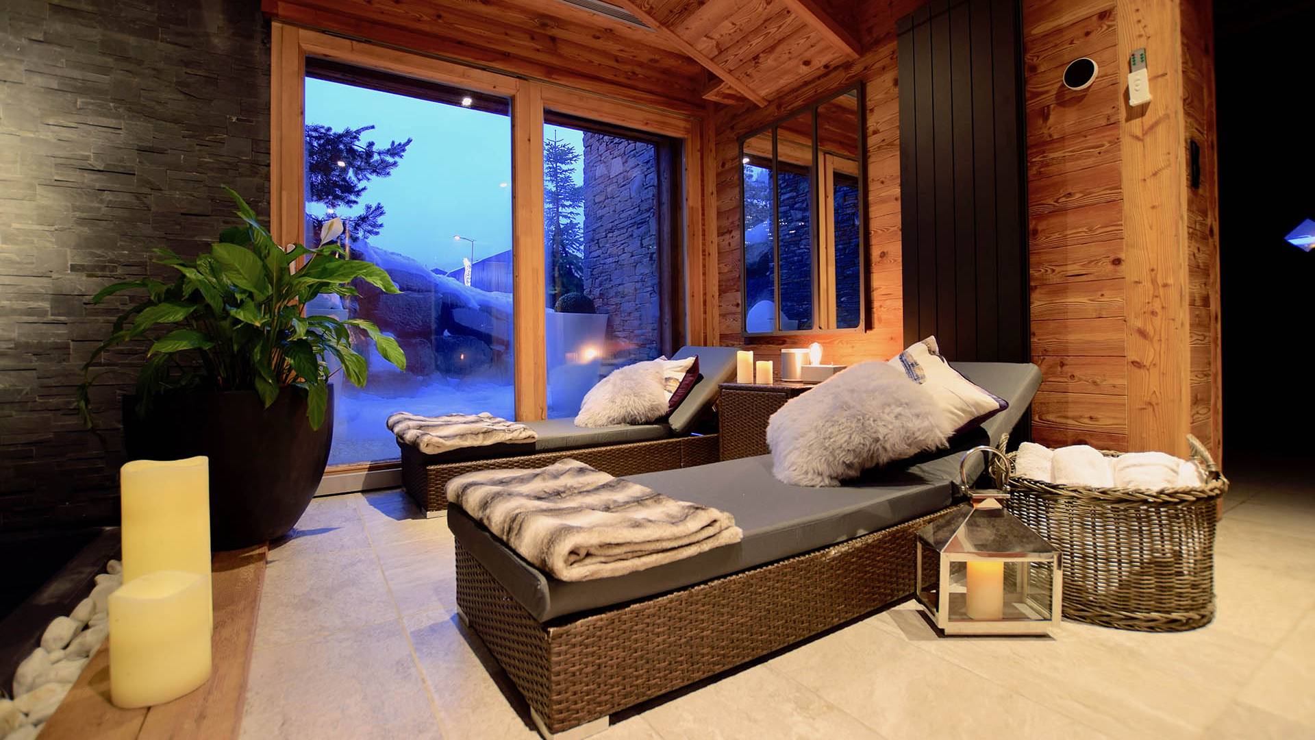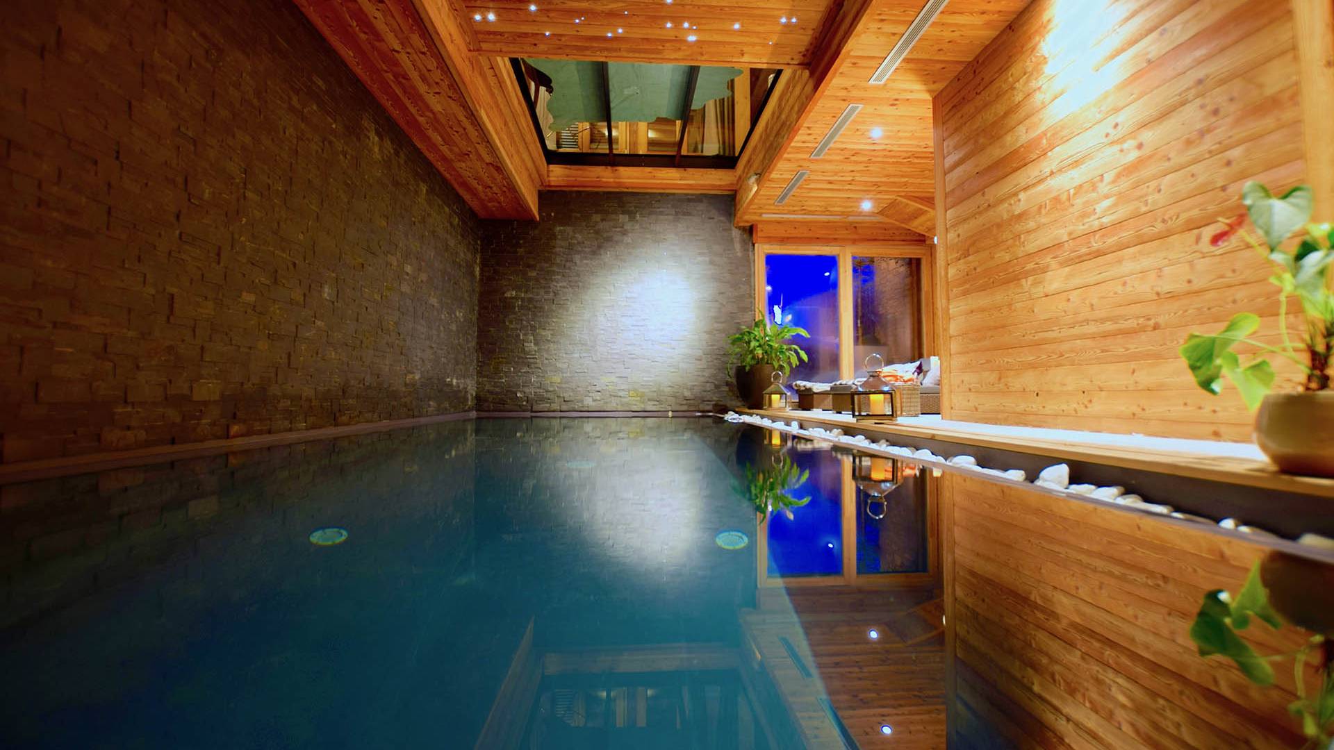 Auch im Erdgeschoss befindet sich der fabelhafte Pool- und Spa-Bereich; der perfekte Ort, um nach einem aufregenden Tag in den Bergen zu entspannen. Wählen Sie zwischen einem Bad unter einer Decke aus funkelnden Lichtern, belebendem Dampf oder entspannen Sie einfach bei einem Drink auf einer der Liegen am Pool.