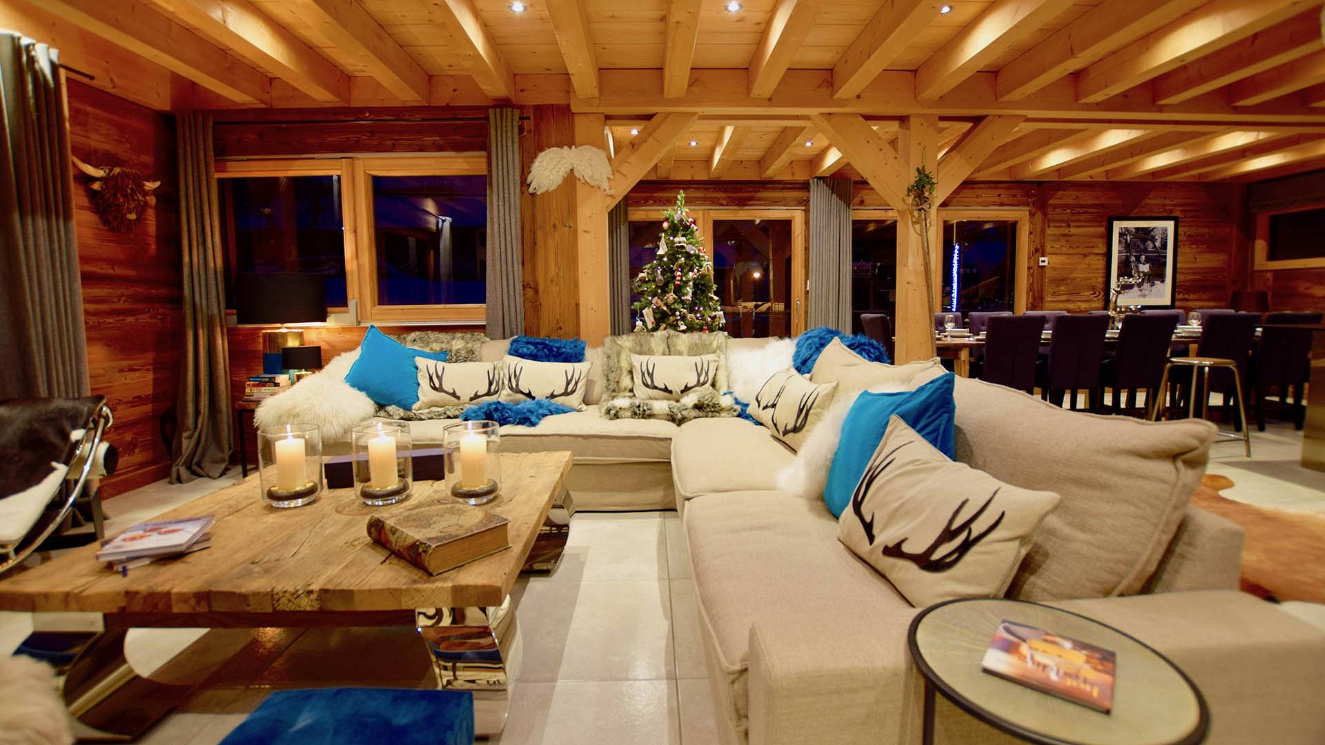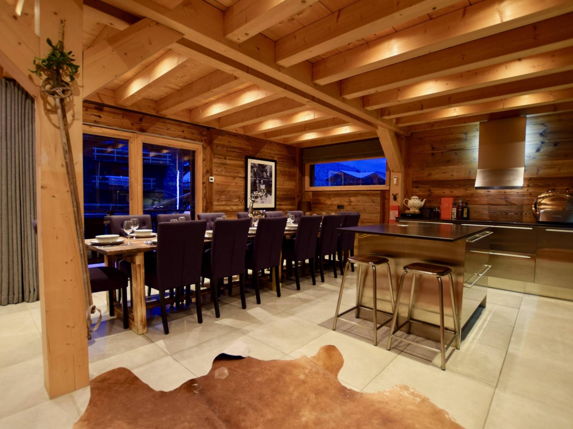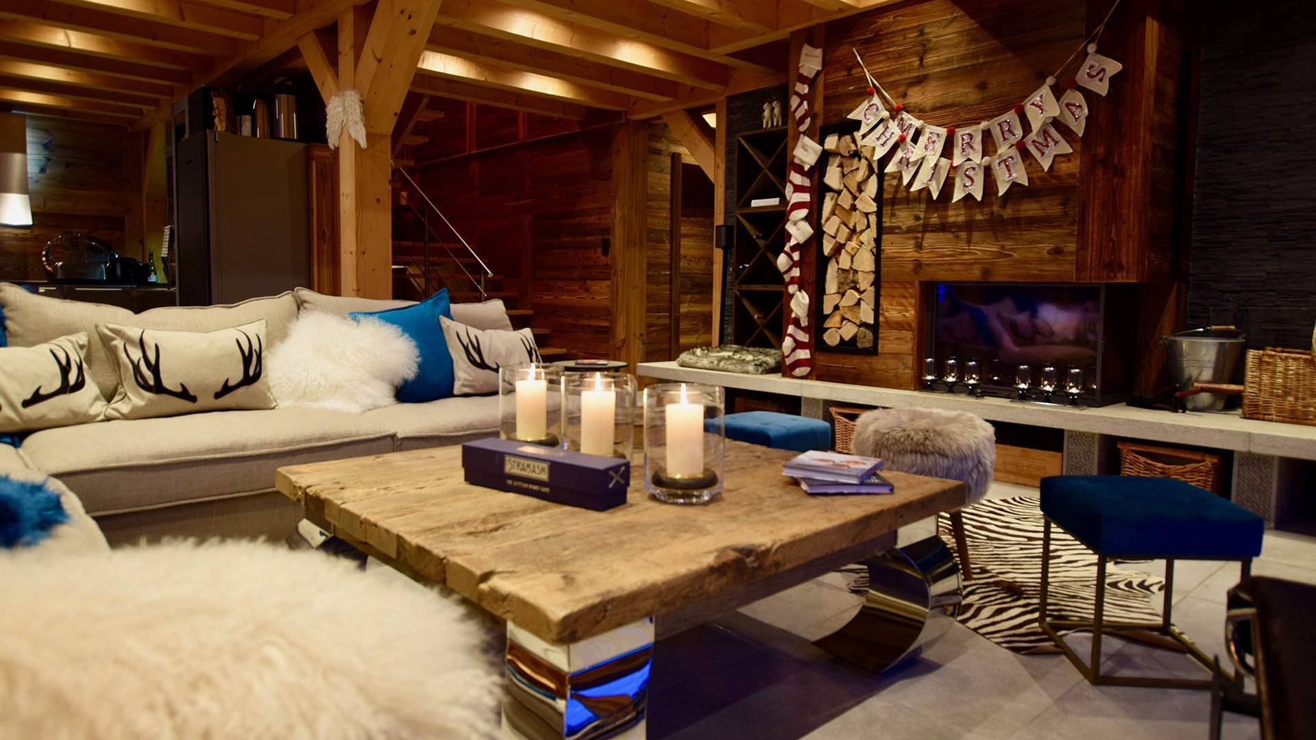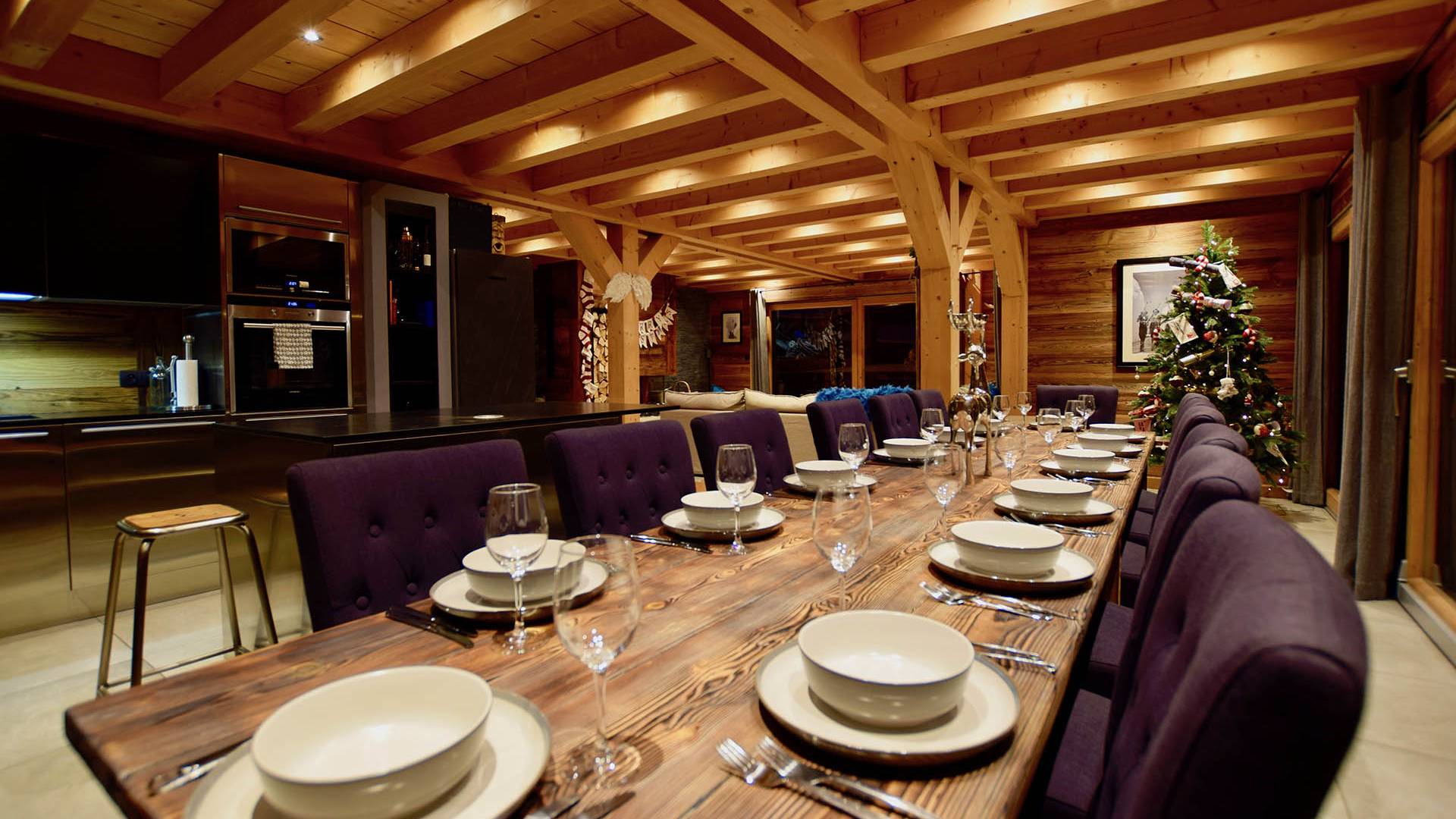 Wenn Sie in den ersten Stock gehen, werden Sie von dem herrlichen Wohn- und Essbereich mit offenem Schnitt begrüßt. Dieser Raum ist aufgrund der fabelhaften raumhohen Terrassentüren, die sich auf die Balkone öffnen, mit natürlichem Licht durchflutet. Gut ausgewählte Stücke richten diesen stilvollen offenen Raum ein; Ein wunderschöner Couchtisch aus wiedergewonnener Eiche und Chrom von Andrew Martin und ein luxuriöses L-förmiges Sofa aus Leinen umgeben das große lodernde Feuer. Das Chalet Valambrun bietet beste Unterhaltung mit einem großen Flachbildfernseher, WLAN, einem Sonos-System und einer Auswahl an Gesellschaftsspielen.