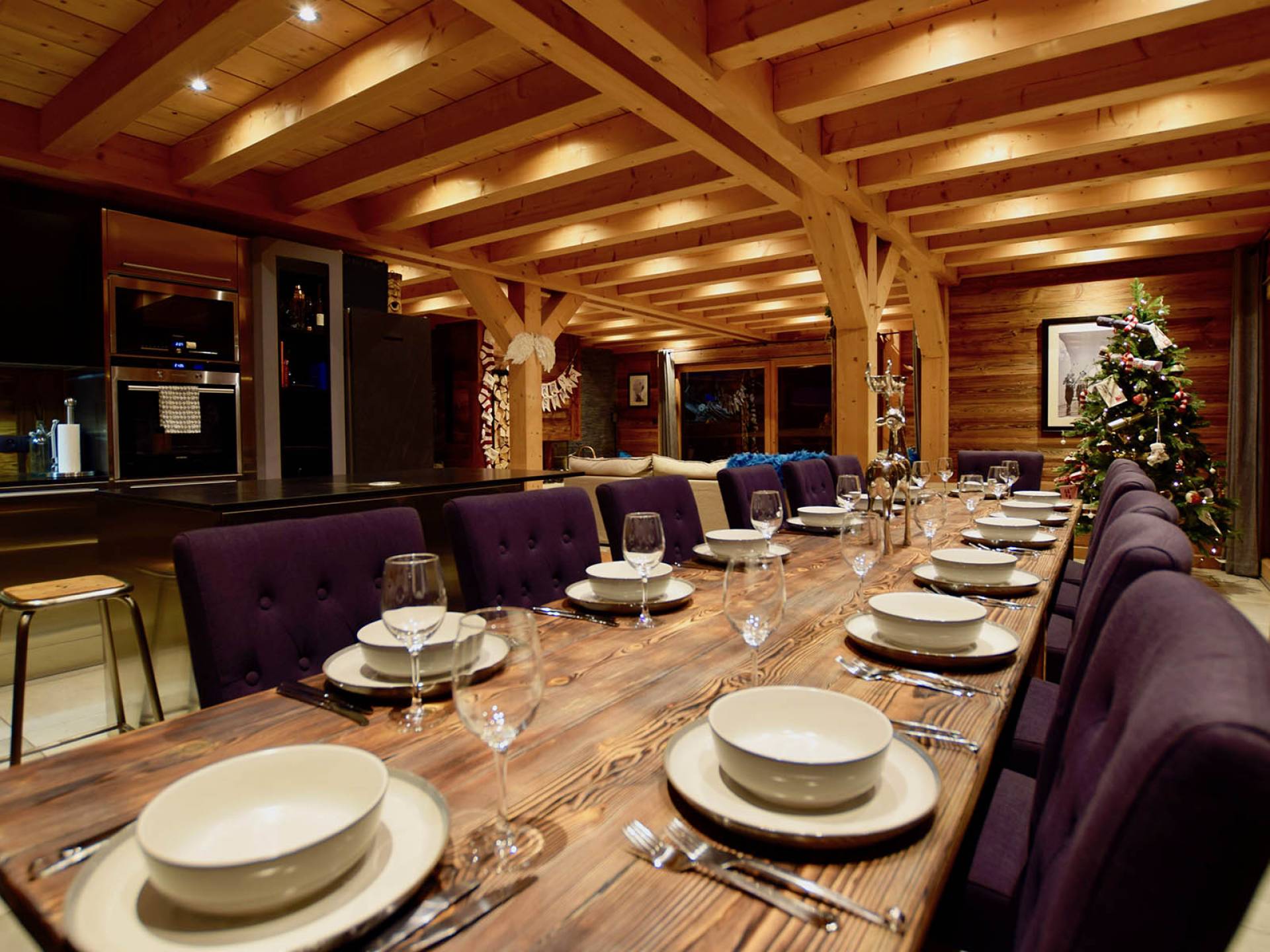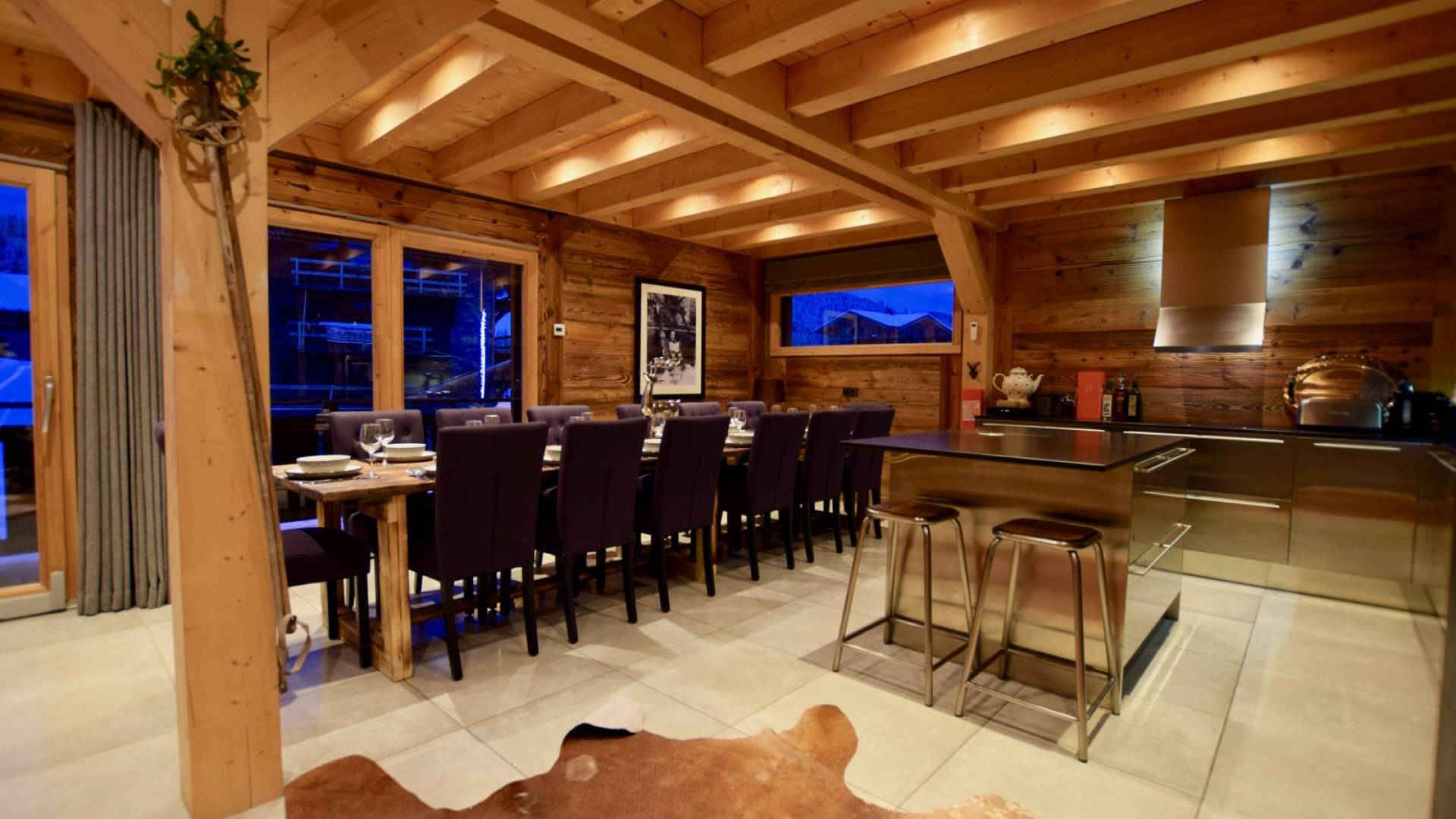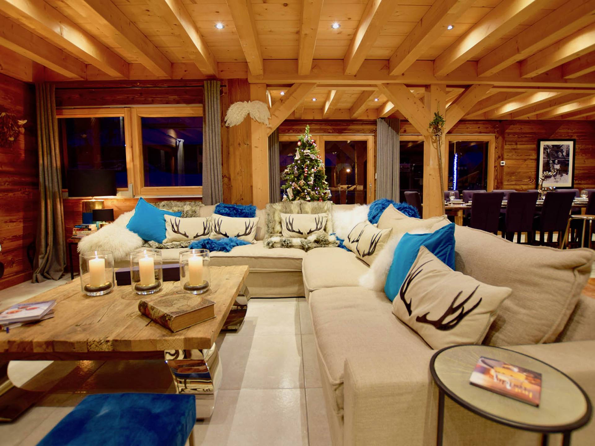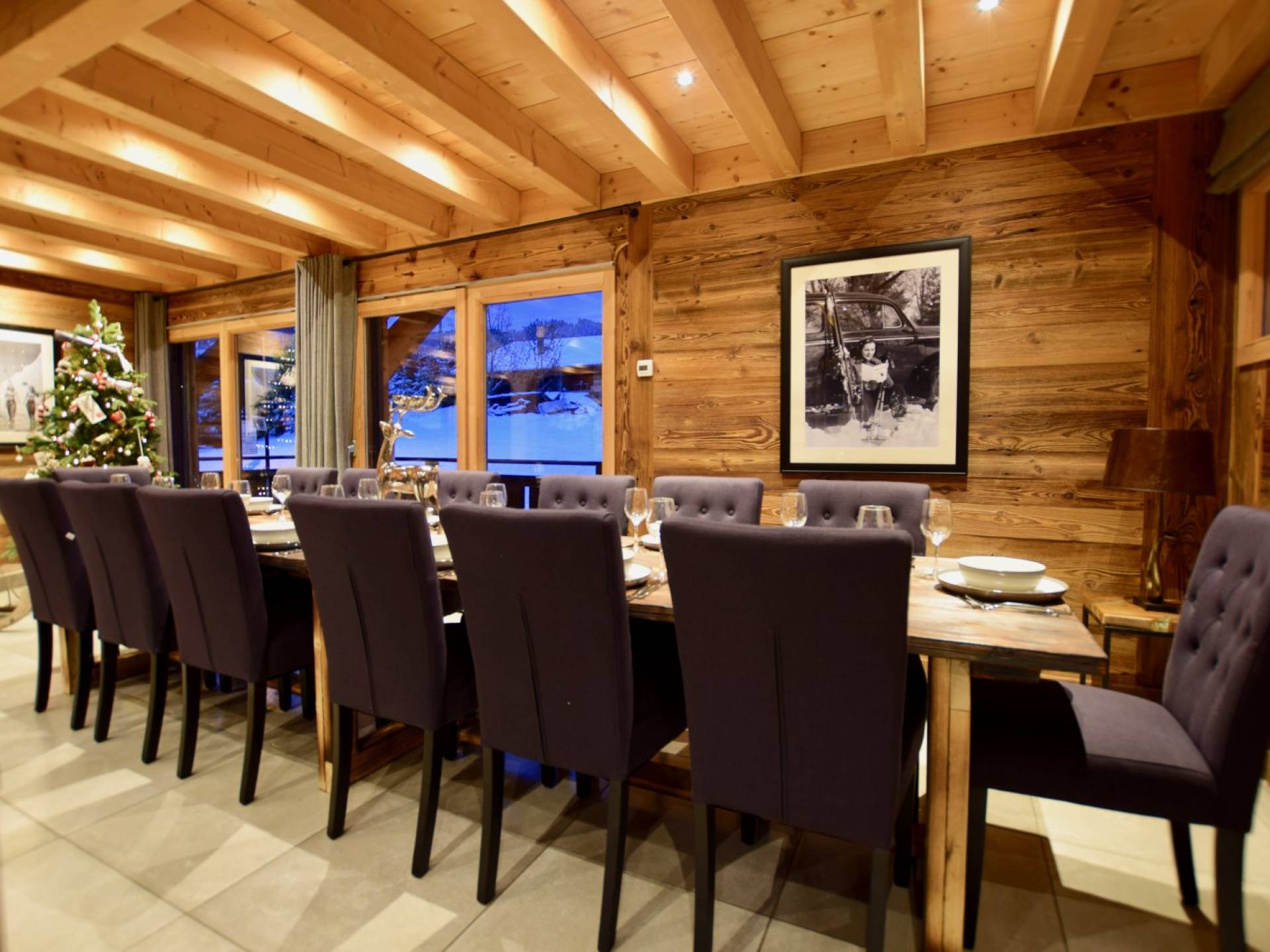Wenn Sie in den ersten Stock gehen, werden Sie von dem herrlichen Wohn- und Essbereich mit offenem Schnitt begrüßt. Dieser Raum ist aufgrund der fabelhaften raumhohen Terrassentüren, die sich auf die Balkone öffnen, mit natürlichem Licht durchflutet. Gut ausgewählte Stücke richten diesen stilvollen offenen Raum ein; Ein wunderschöner Couchtisch aus wiedergewonnener Eiche und Chrom von Andrew Martin und ein luxuriöses L-förmiges Sofa aus Leinen umgeben das große lodernde Feuer. Das Chalet Valambrun bietet beste Unterhaltung mit einem großen Flachbildfernseher, WLAN, einem Sonos-System und einer Auswahl an Gesellschaftsspielen.