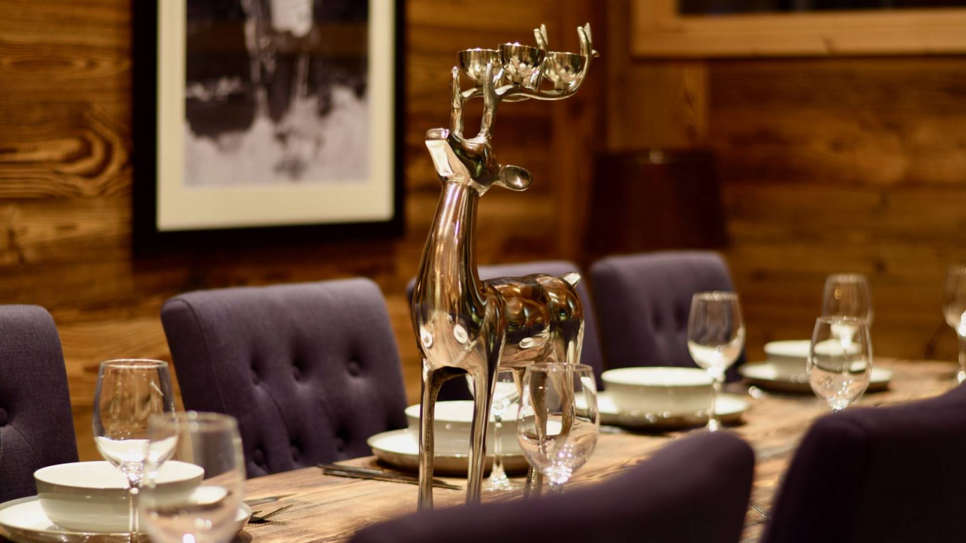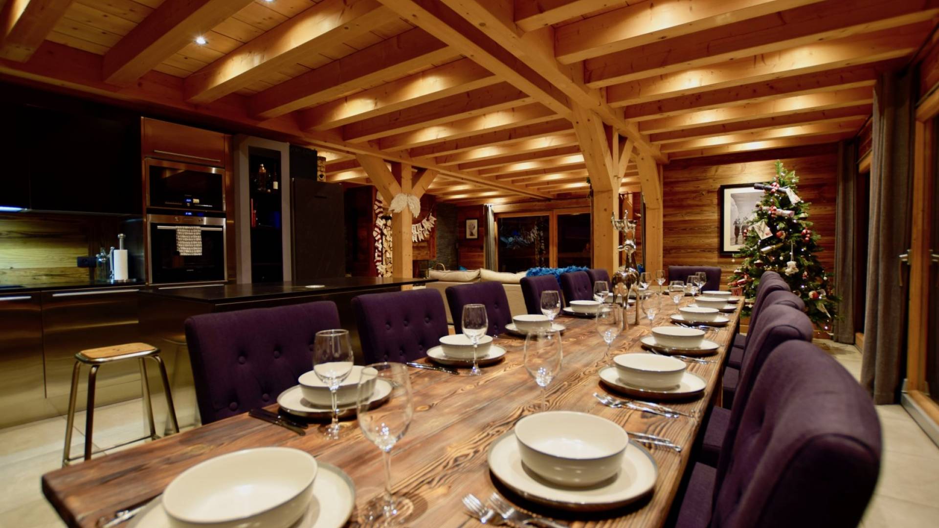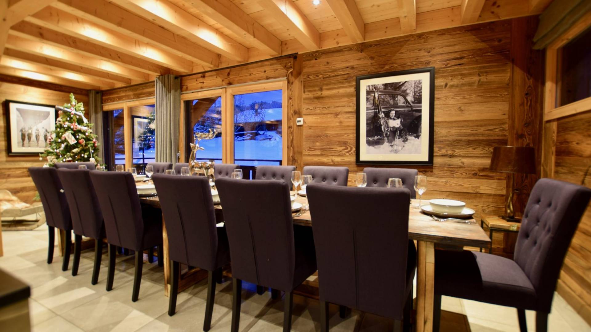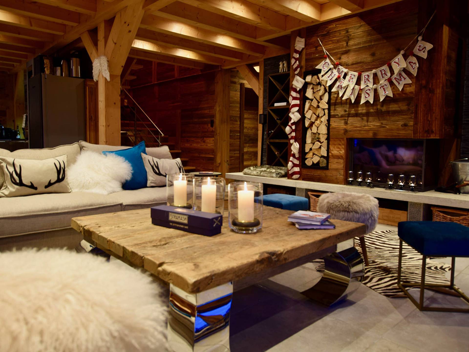 Wenn Sie in den ersten Stock gehen, werden Sie von dem herrlichen Wohn- und Essbereich mit offenem Schnitt begrüßt. Dieser Raum ist aufgrund der fabelhaften raumhohen Terrassentüren, die sich auf die Balkone öffnen, mit natürlichem Licht durchflutet. Gut ausgewählte Stücke richten diesen stilvollen offenen Raum ein; Ein wunderschöner Couchtisch aus wiedergewonnener Eiche und Chrom von Andrew Martin und ein luxuriöses L-förmiges Sofa aus Leinen umgeben das große lodernde Feuer. Das Chalet Valambrun bietet beste Unterhaltung mit einem großen Flachbildfernseher, WLAN, einem Sonos-System und einer Auswahl an Gesellschaftsspielen.