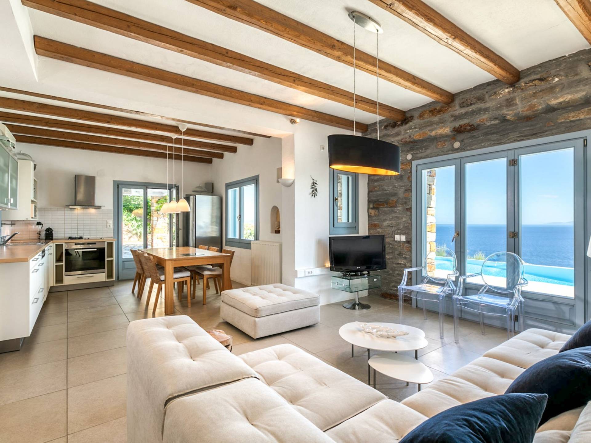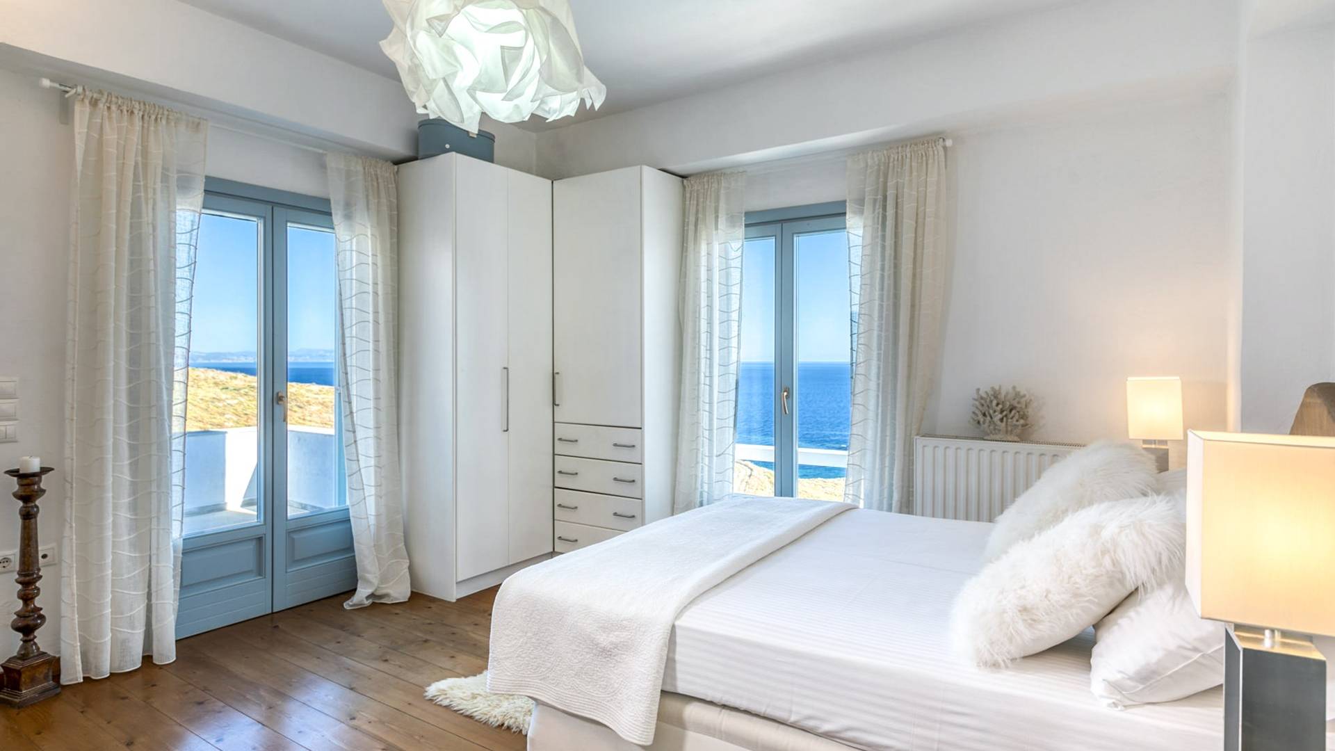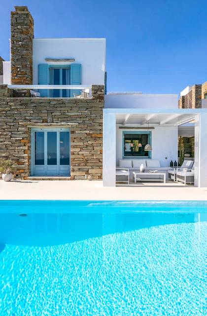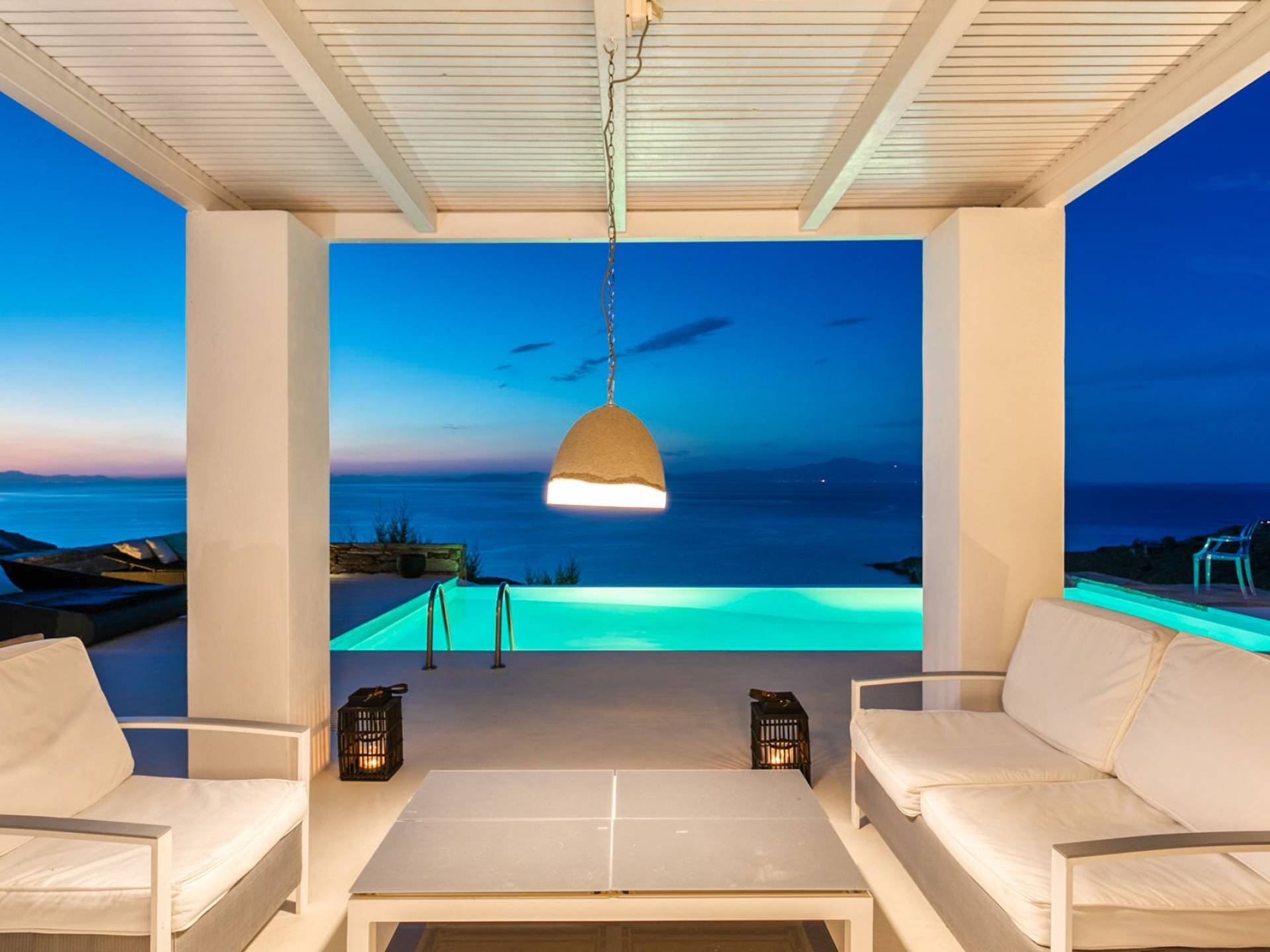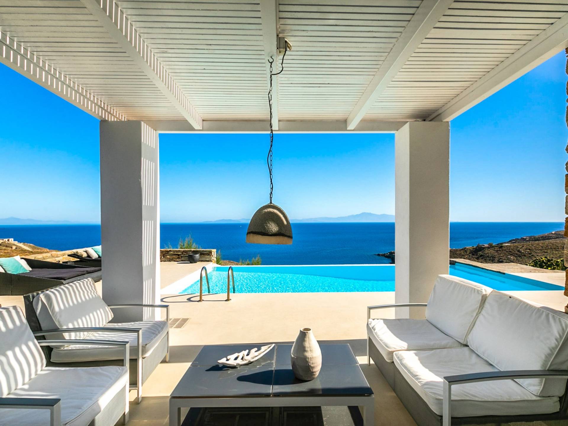 Traumhafte Kingsize-Betten mit direktem Meerblick, raumhohe Glastüren, komfortable und schön eingerichtete Gemeinschaftsbereiche, strahlend weiße Wände, die die starke Sonne der Kykladen reflektieren und dazu beitragen, dass die Häuser kühl bleiben, geräumige, voll möblierte Terrassen mit Pergolen und elegante Esszimmermöbel, entspannende lange Stühle, süße Couchtische, bequeme Sonnenliegen und schattige Pergolen machen es schwer, die Villa zu verlassen.