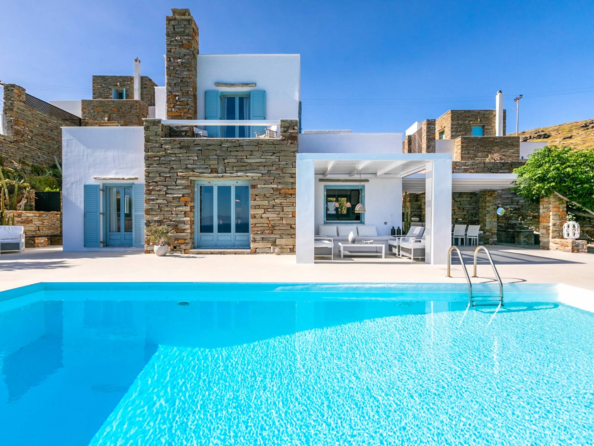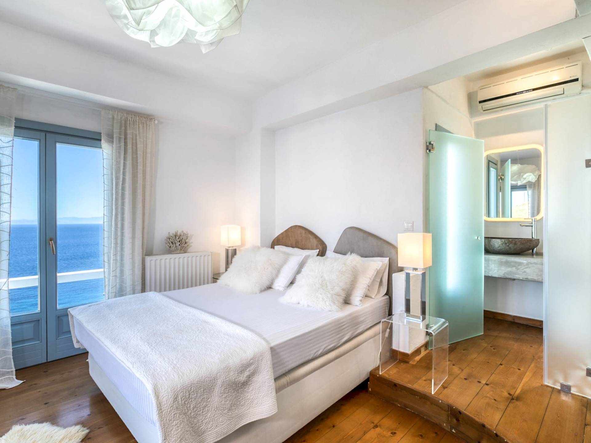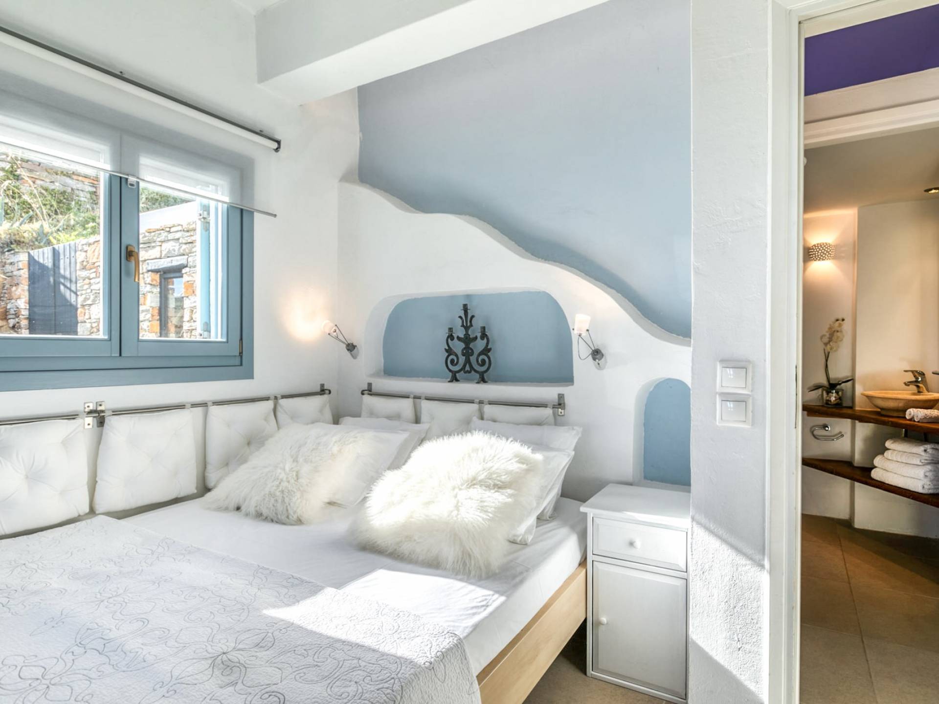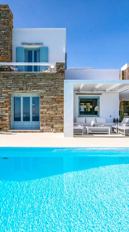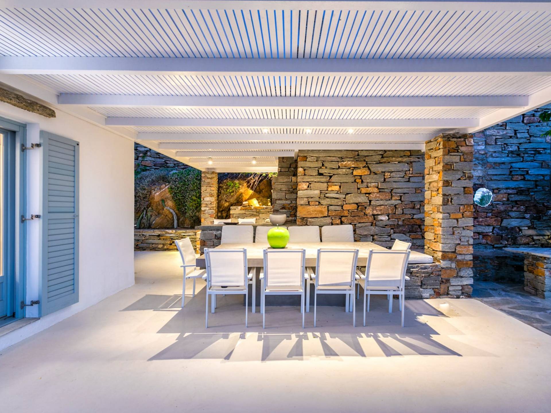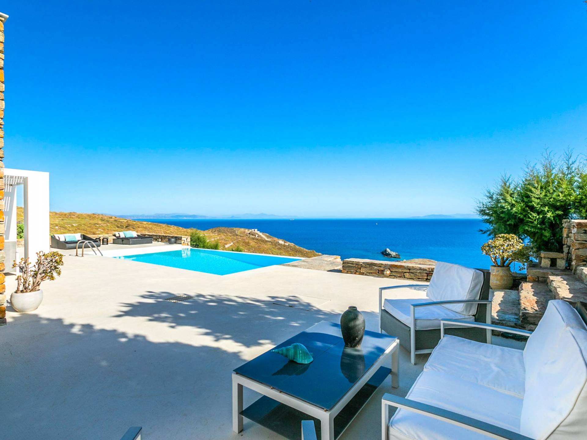 Traumhafte Kingsize-Betten mit direktem Meerblick, raumhohe Glastüren, komfortable und schön eingerichtete Gemeinschaftsbereiche, strahlend weiße Wände, die die starke Sonne der Kykladen reflektieren und dazu beitragen, dass die Häuser kühl bleiben, geräumige, voll möblierte Terrassen mit Pergolen und elegante Esszimmermöbel, entspannende lange Stühle, süße Couchtische, bequeme Sonnenliegen und schattige Pergolen machen es schwer, die Villa zu verlassen.