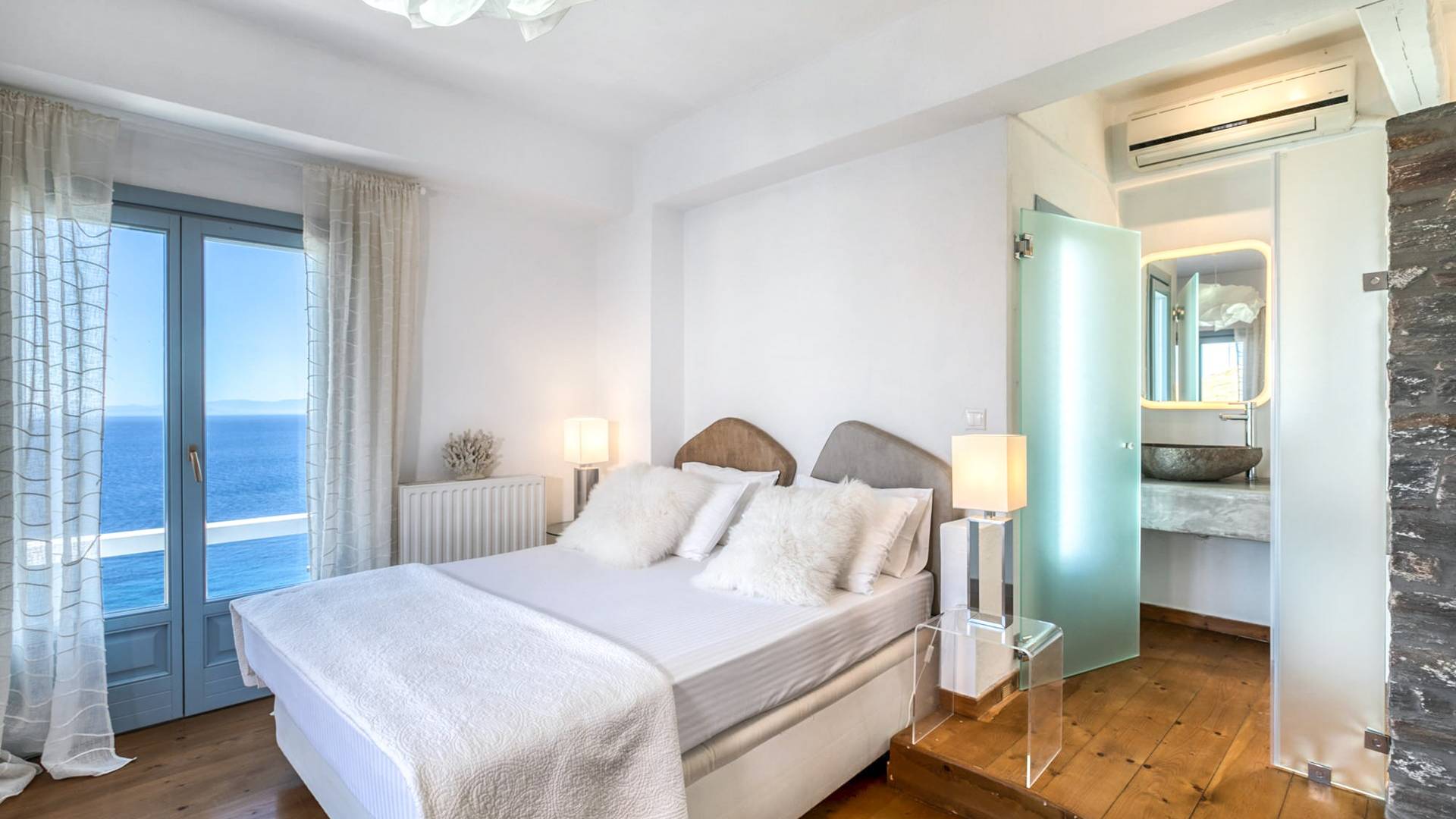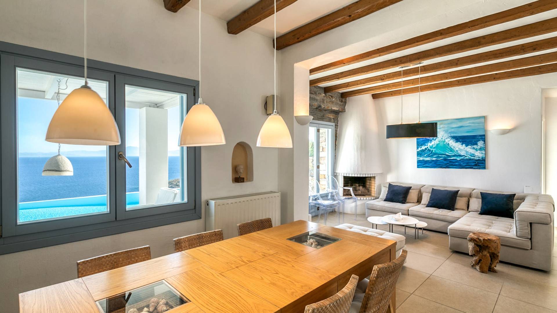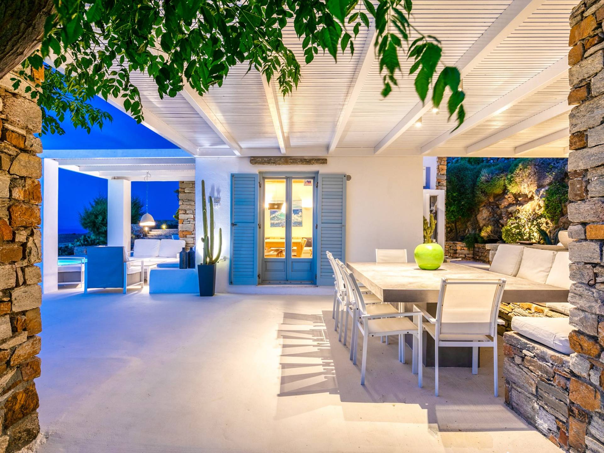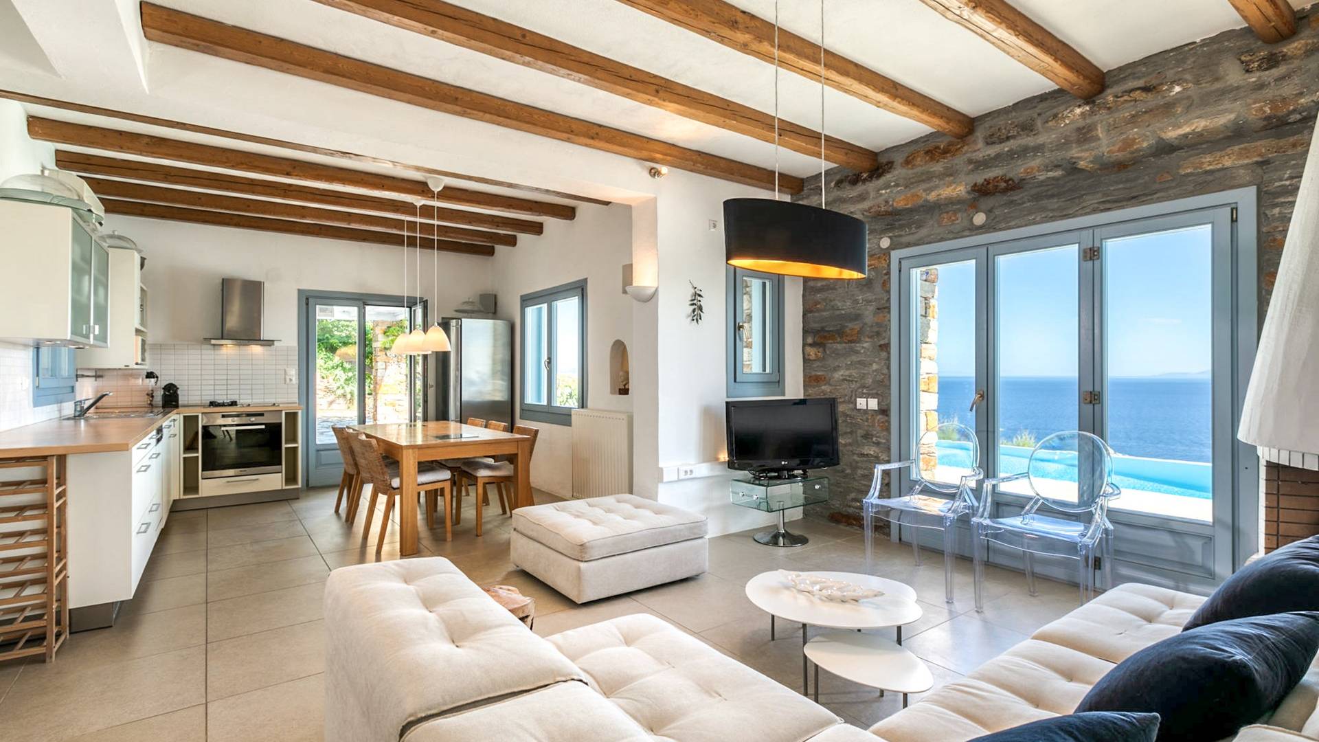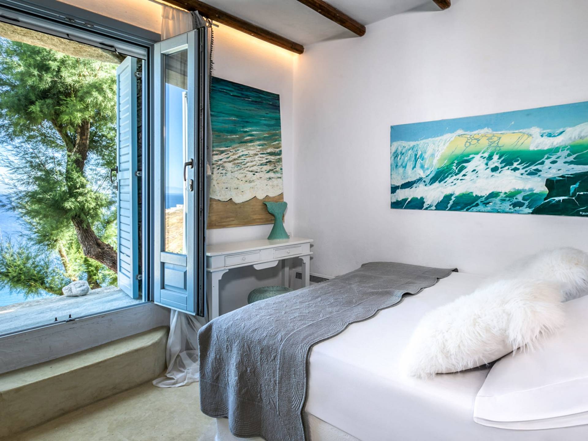 Traumhafte Kingsize-Betten mit direktem Meerblick, raumhohe Glastüren, komfortable und schön eingerichtete Gemeinschaftsbereiche, strahlend weiße Wände, die die starke Sonne der Kykladen reflektieren und dazu beitragen, dass die Häuser kühl bleiben, geräumige, voll möblierte Terrassen mit Pergolen und elegante Esszimmermöbel, entspannende lange Stühle, süße Couchtische, bequeme Sonnenliegen und schattige Pergolen machen es schwer, die Villa zu verlassen.
