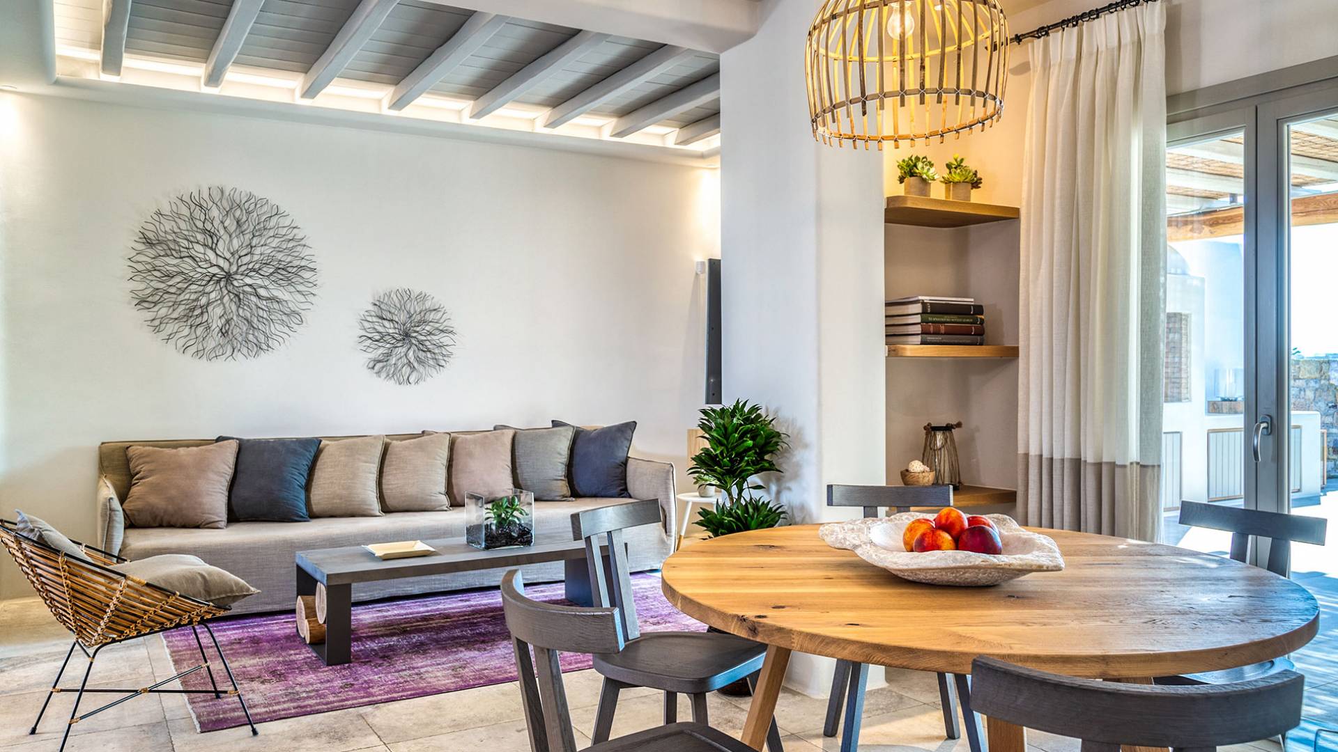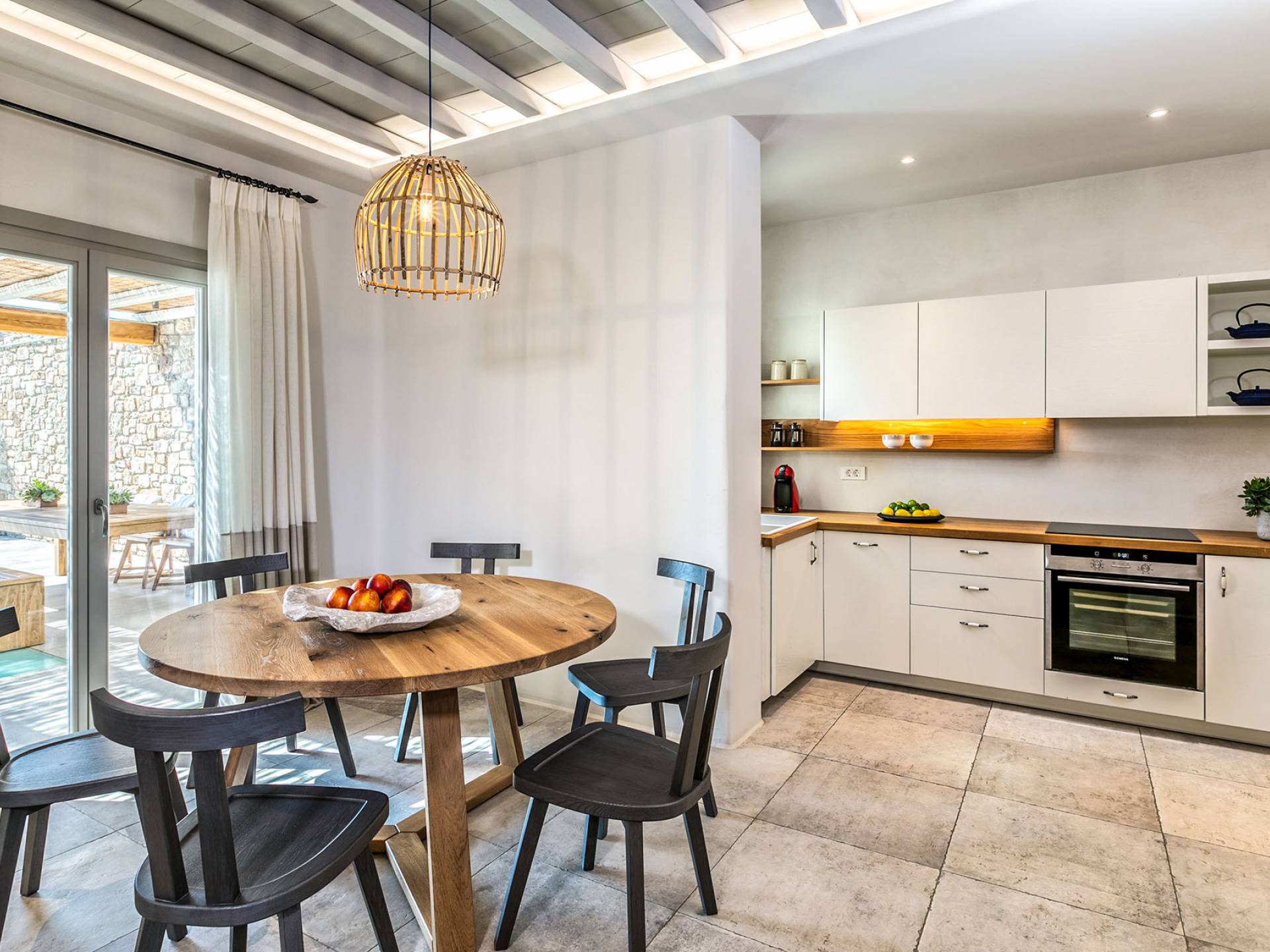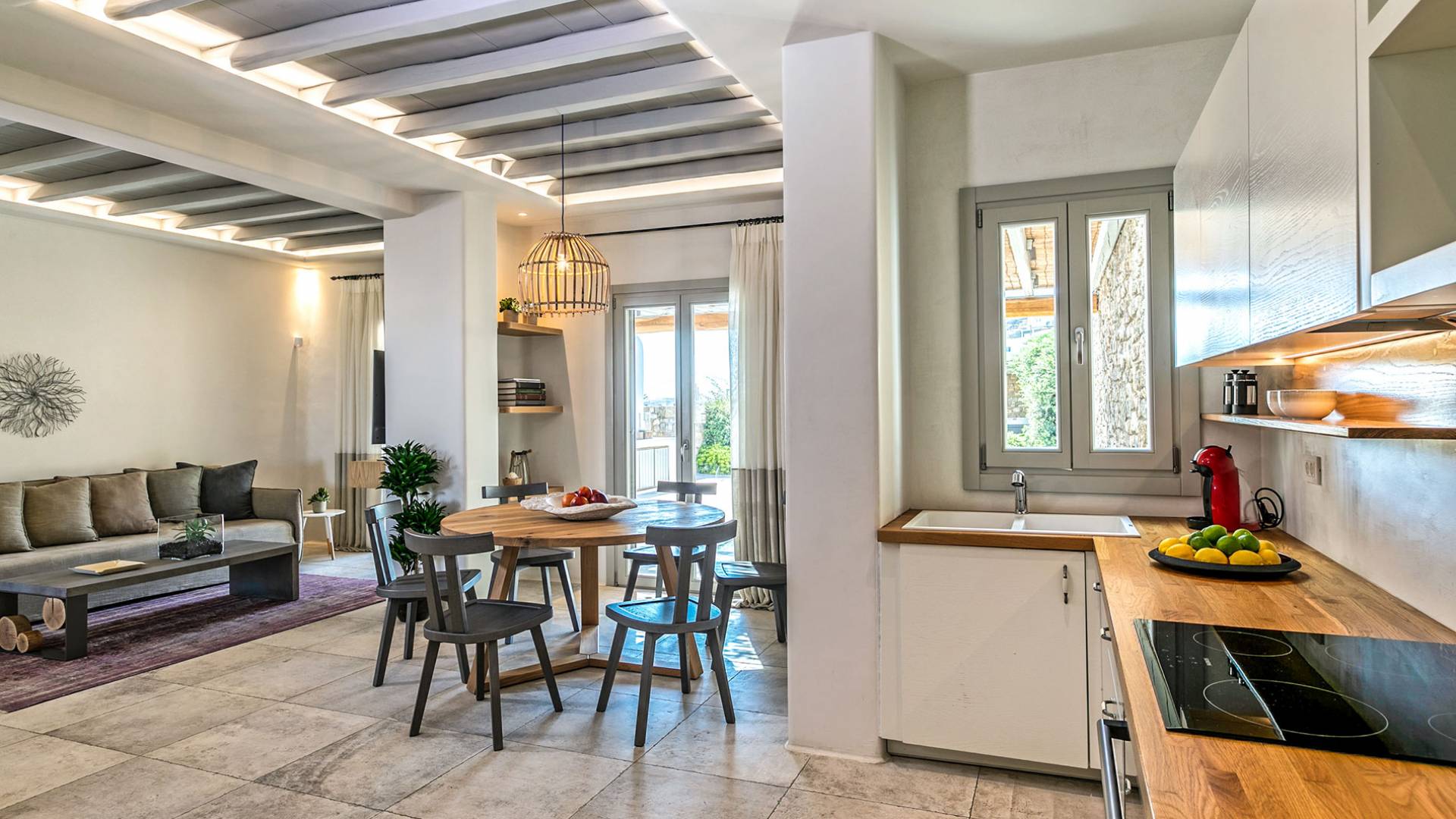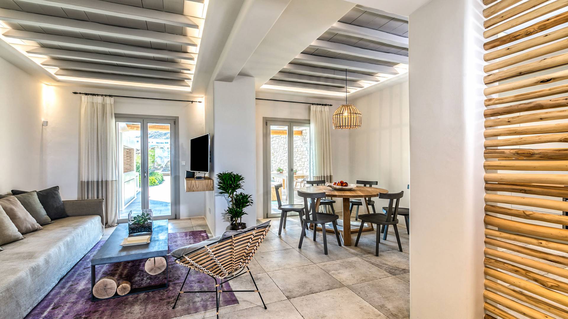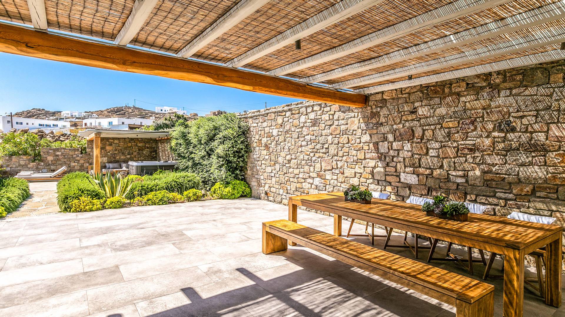 Sorgfältig entworfen, um vor dem berühmten "Meltemi" - dem starken Nordwind, der ein Markenzeichen der Insel ist - zu schützen, ist die 159 m² große M-Two Villa auf Mykonos ideal für Familien mit Kindern. Die Kleinen werden es lieben, in der offenen Wohn- und Essküche zu Abend zu essen, während sie ihren Lieblingsfilm sehen. Gleichzeitig genießen die Erwachsenen einen sternenklaren Grillabend im großzügigen Gastgarten und probieren lokale Köstlichkeiten. Der Aufenthalt in diesem wunderschönen Haus mit Blick auf die glitzernde mykonische Küste wird dazu beitragen, unvergessliche Erinnerungen zu schaffen… Die Annehmlichkeiten der Villa umfassen 2 Doppelzimmer mit eigenem Bad im Erdgeschoss, einen Wohnbereich, eine voll ausgestattete offene Küche und eine Toilette auf der Eingangsebene, und 2 Hauptschlafzimmer mit einem gemeinsamen Badezimmer im Obergeschoss. Draußen gibt es geräumige Ess- und Loungebereiche, einen Grill und einen privaten Whirlpool im Freien.