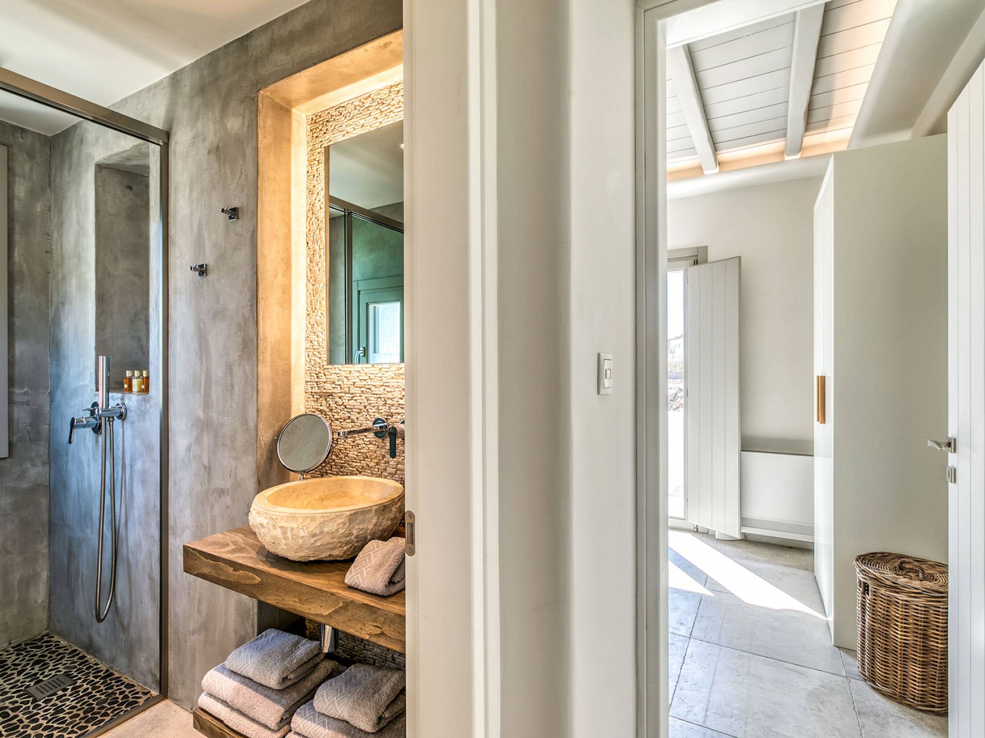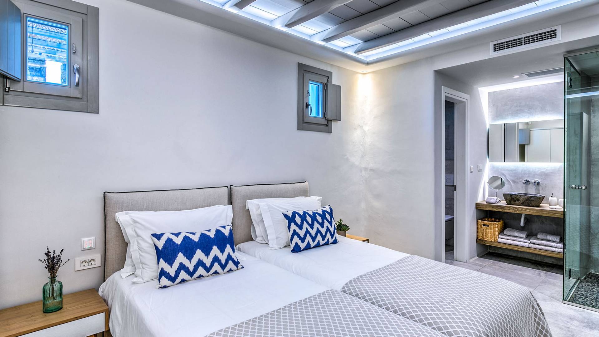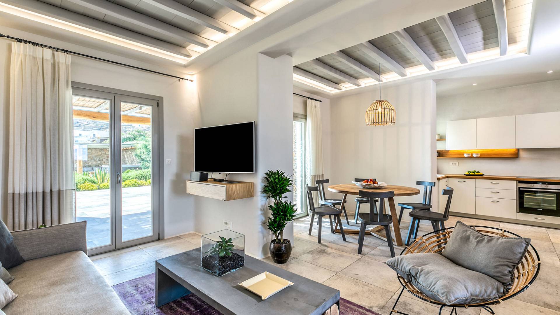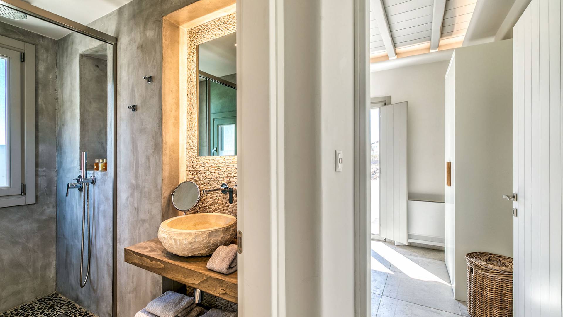 Sorgfältig entworfen, um vor dem berühmten "Meltemi" - dem starken Nordwind, der ein Markenzeichen der Insel ist - zu schützen, ist die 159 m² große M-Two Villa auf Mykonos ideal für Familien mit Kindern. Die Kleinen werden es lieben, in der offenen Wohn- und Essküche zu Abend zu essen, während sie ihren Lieblingsfilm sehen. Gleichzeitig genießen die Erwachsenen einen sternenklaren Grillabend im großzügigen Gastgarten und probieren lokale Köstlichkeiten. Der Aufenthalt in diesem wunderschönen Haus mit Blick auf die glitzernde mykonische Küste wird dazu beitragen, unvergessliche Erinnerungen zu schaffen… Die Annehmlichkeiten der Villa umfassen 2 Doppelzimmer mit eigenem Bad im Erdgeschoss, einen Wohnbereich, eine voll ausgestattete offene Küche und eine Toilette auf der Eingangsebene, und 2 Hauptschlafzimmer mit einem gemeinsamen Badezimmer im Obergeschoss. Draußen gibt es geräumige Ess- und Loungebereiche, einen Grill und einen privaten Whirlpool im Freien.