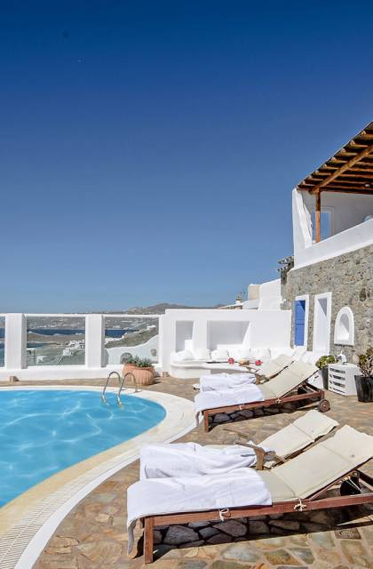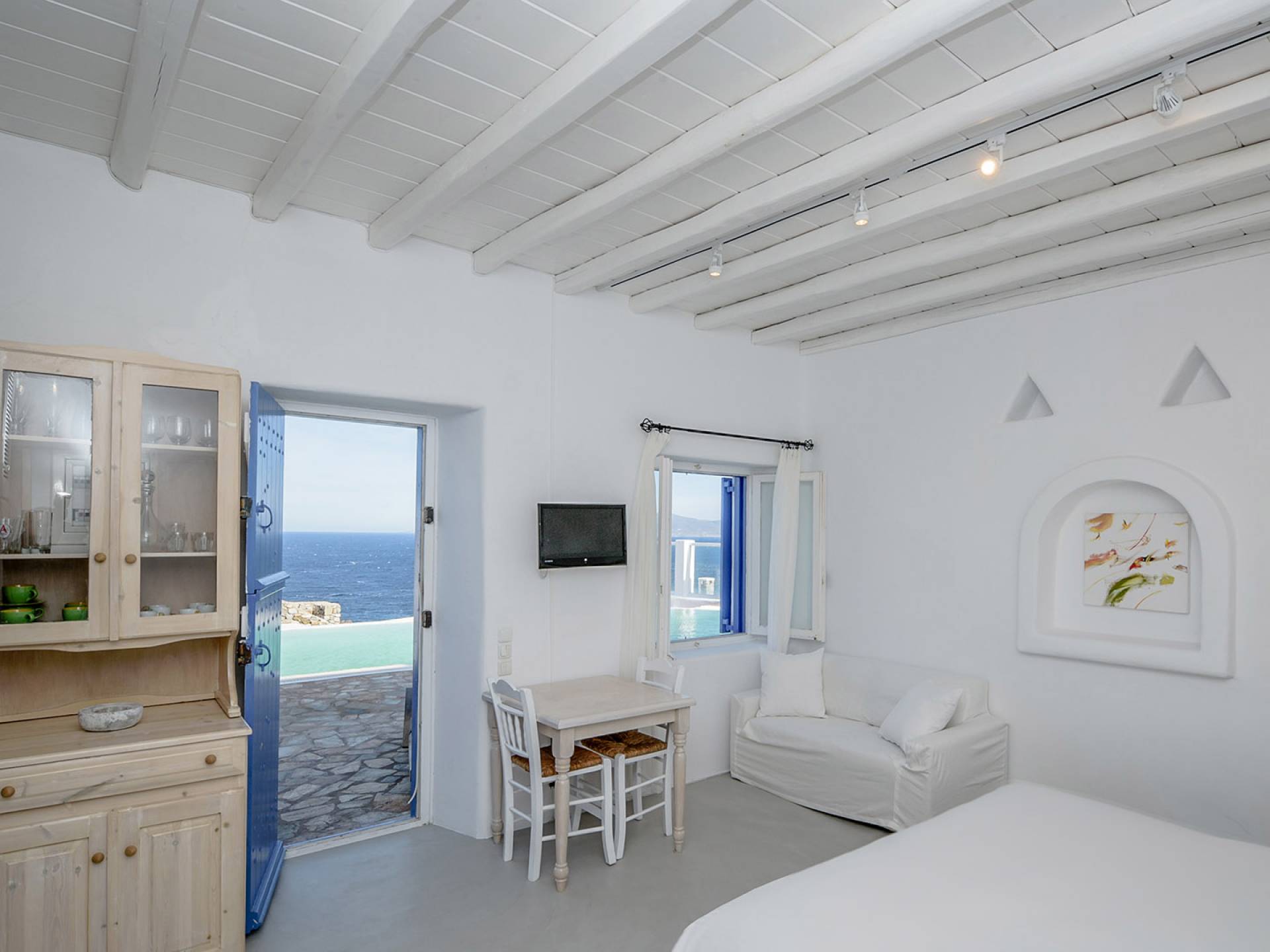 Die Villa bietet Platz für 10 Personen in den 5 Zimmern, aber mit den 3 Schlafsofas der 2 Wohnzimmer könnten 6 weitere Personen untergebracht werden. Daher beträgt die theoretische Gesamtzahl der untergebrachten Personen 16. Die Kombination aus Luxus, Originalgemälden, atemberaubenden Ausblicken und Sonnenuntergängen, riesigen Außenterrassen, mit großer Poolposition Mykonos Art Villa als ideale Option für Ihren Urlaub auf Mykonos.