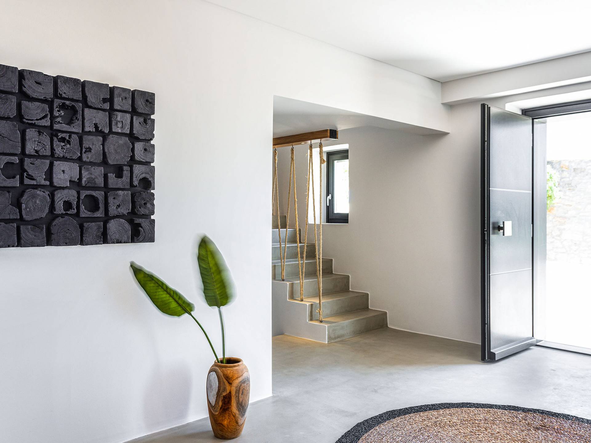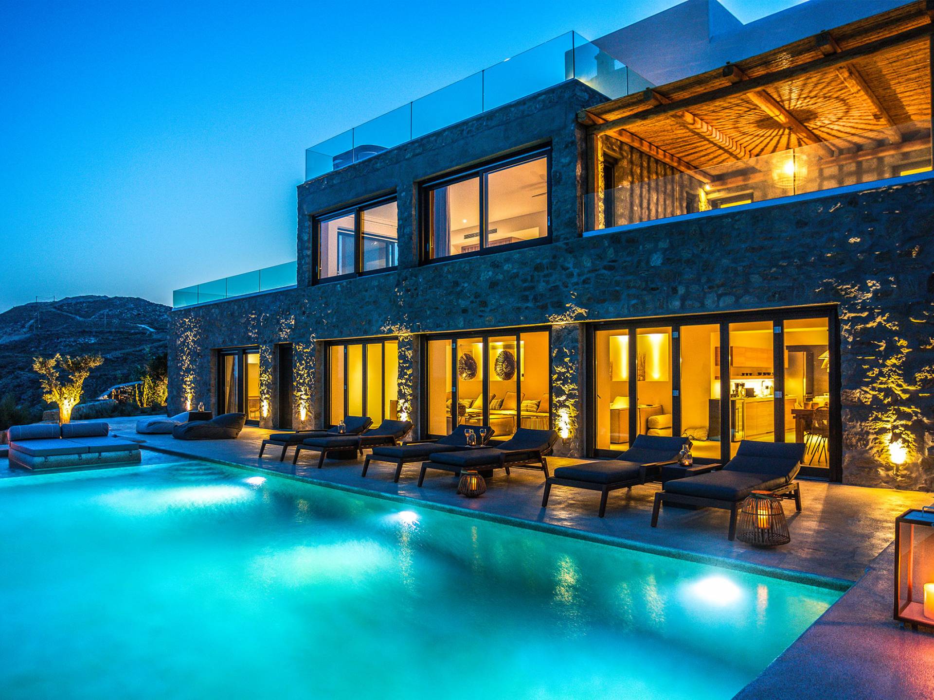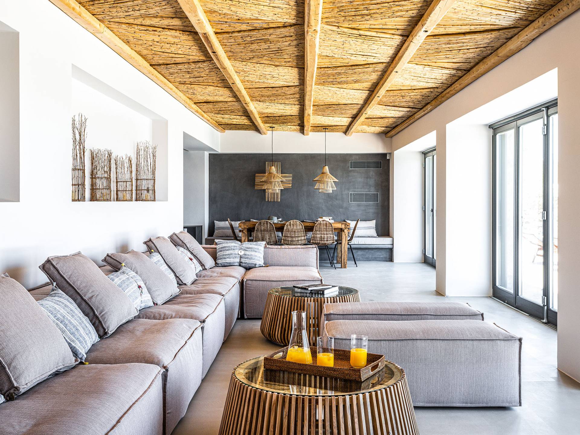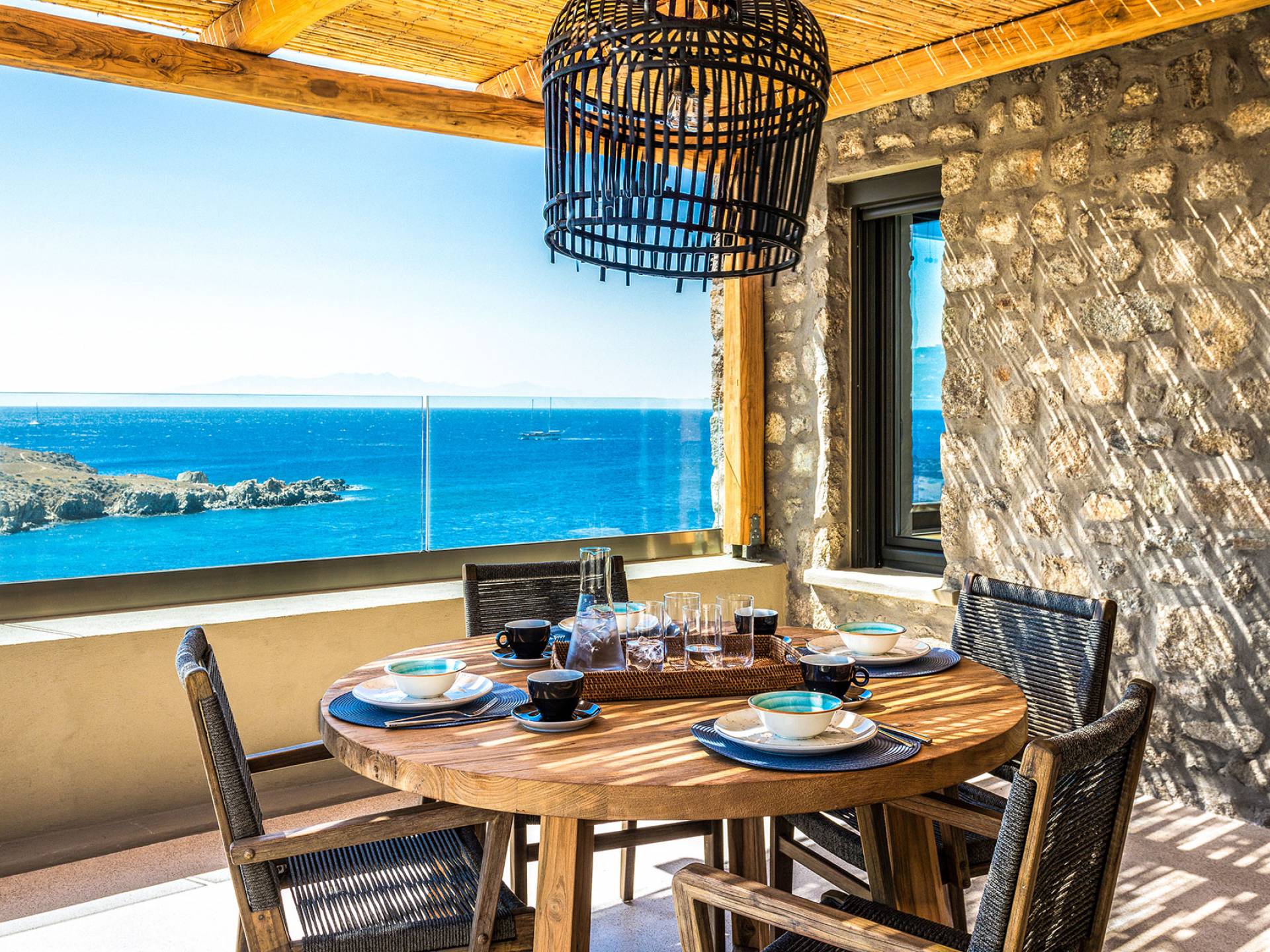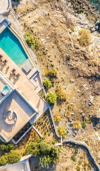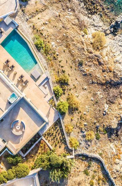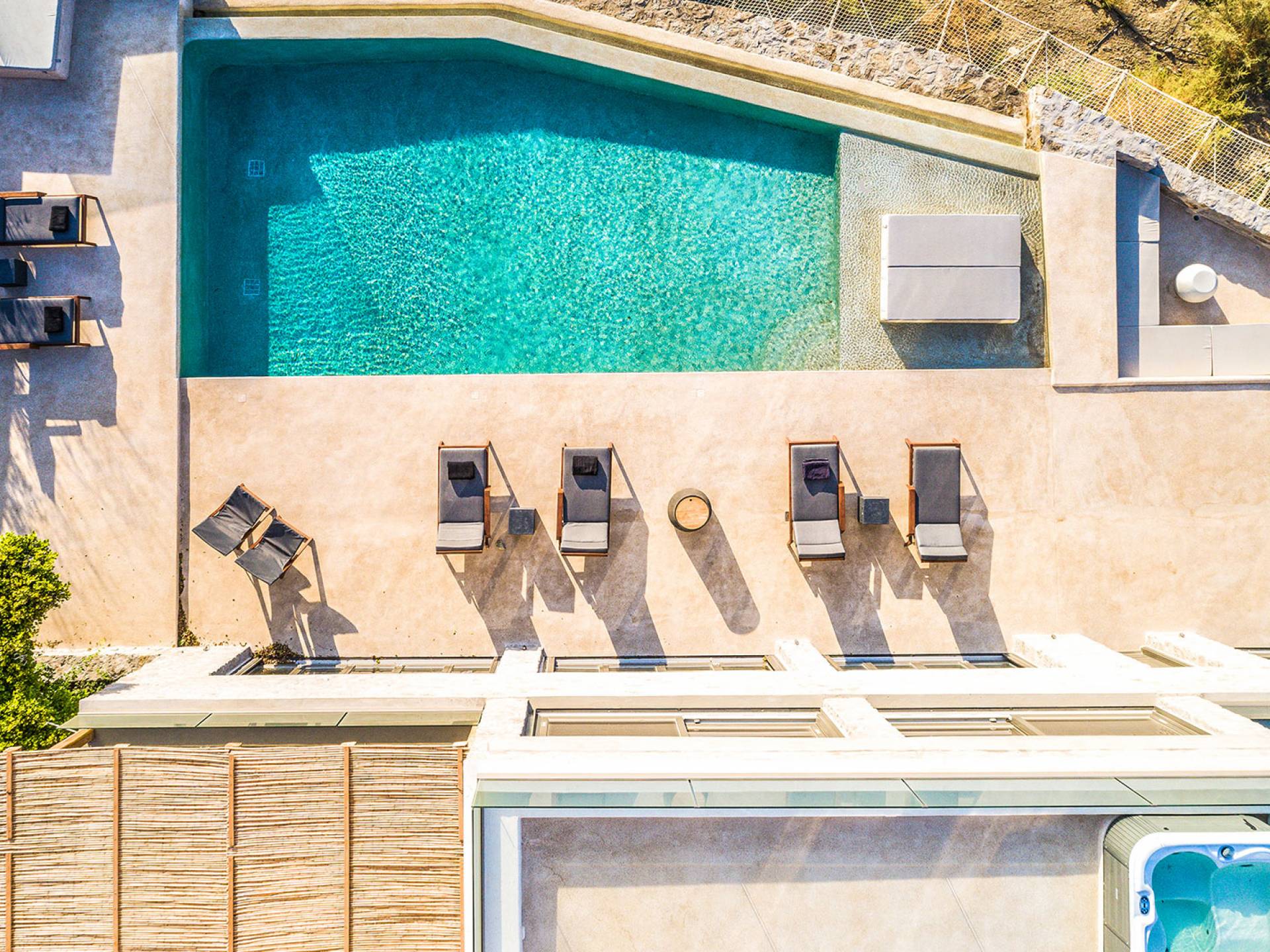 Das Erdgeschoss verfügt über ein geräumiges Wohnzimmer, das sich zum Hauptaußenbereich mit dem Pool und dem Essbereich im Freien öffnet, eine voll ausgestattete offene Küche, einen Essbereich, ein Gäste-WC und 3 Doppelzimmer mit Bad (außer welches als Zwilling eingestellt werden kann). Die erste Etage verfügt über die zweite offene Küche und 2 Doppelzimmer mit Bad, von denen eines ein Masterzimmer mit Panoramablick auf das Meer ist. Beide Schlafzimmer öffnen sich zur Terrasse im ersten Stock mit eingebauten Loungebereichen und der Feuerstelle.