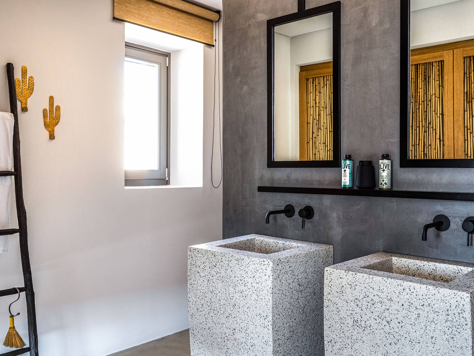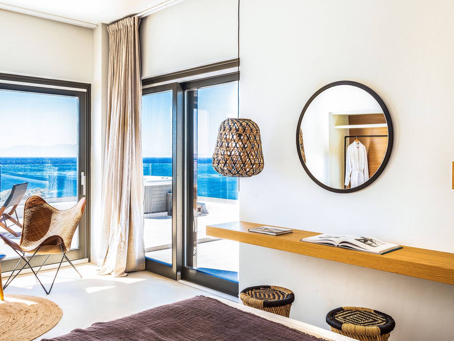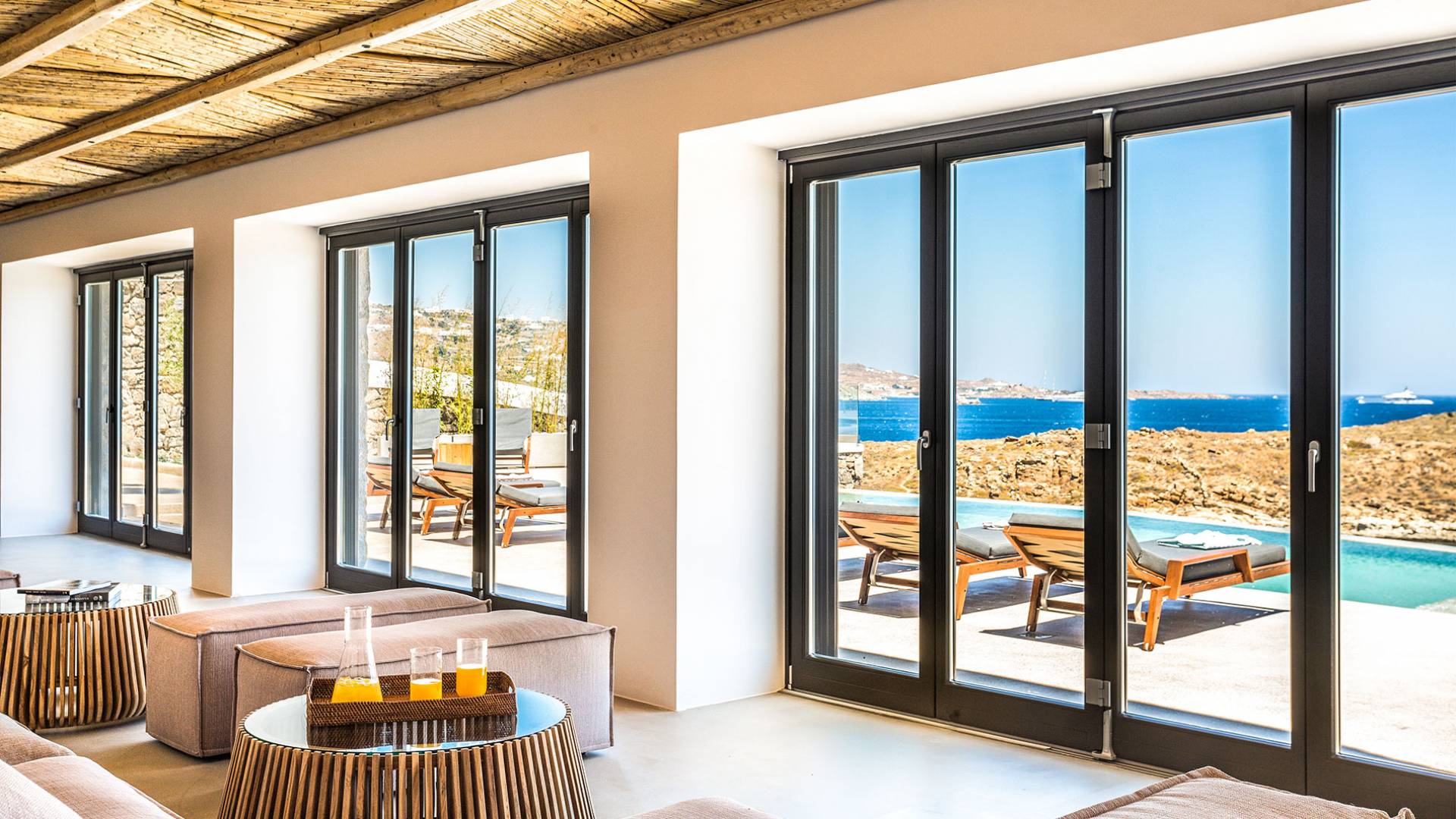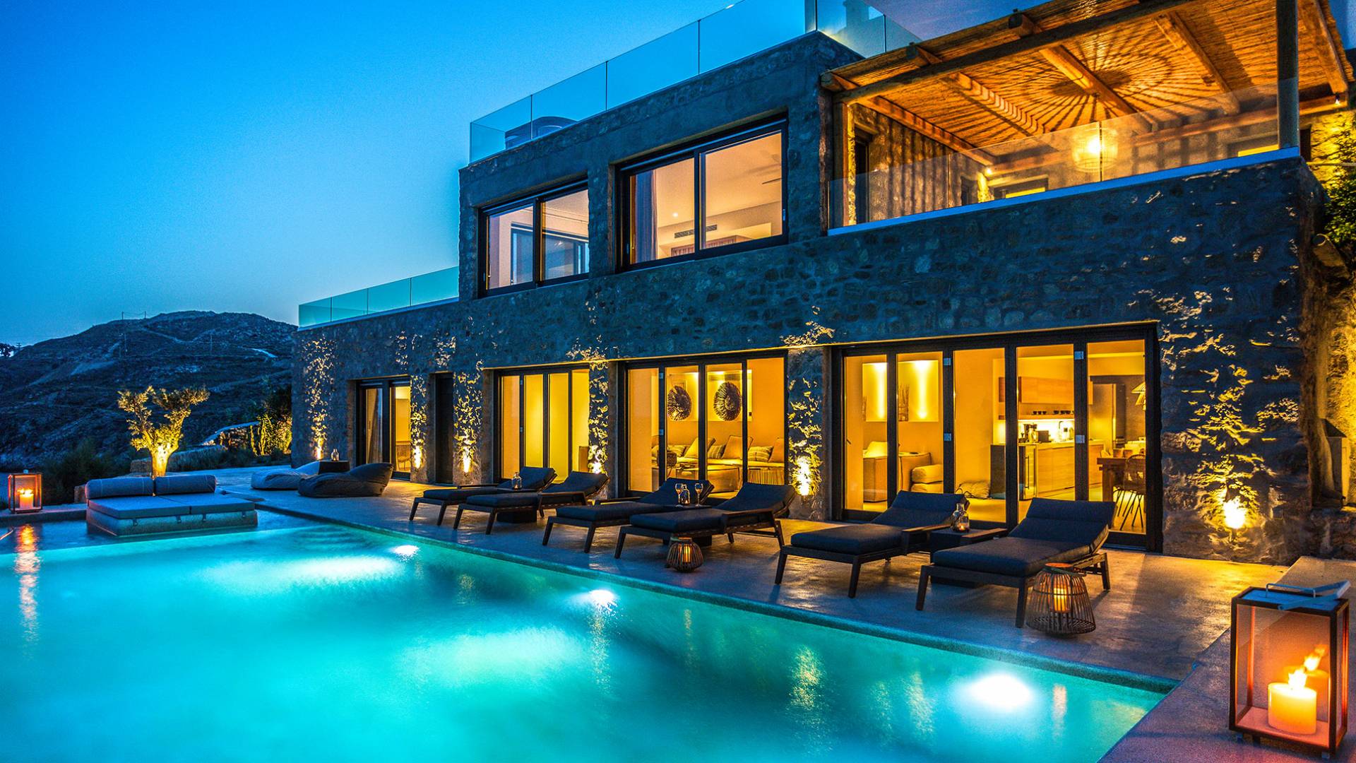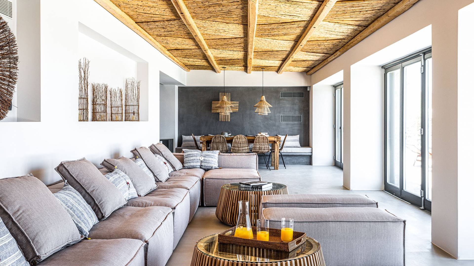 Das Erdgeschoss verfügt über ein geräumiges Wohnzimmer, das sich zum Hauptaußenbereich mit dem Pool und dem Essbereich im Freien öffnet, eine voll ausgestattete offene Küche, einen Essbereich, ein Gäste-WC und 3 Doppelzimmer mit Bad (außer welches als Zwilling eingestellt werden kann). Die erste Etage verfügt über die zweite offene Küche und 2 Doppelzimmer mit Bad, von denen eines ein Masterzimmer mit Panoramablick auf das Meer ist. Beide Schlafzimmer öffnen sich zur Terrasse im ersten Stock mit eingebauten Loungebereichen und der Feuerstelle.