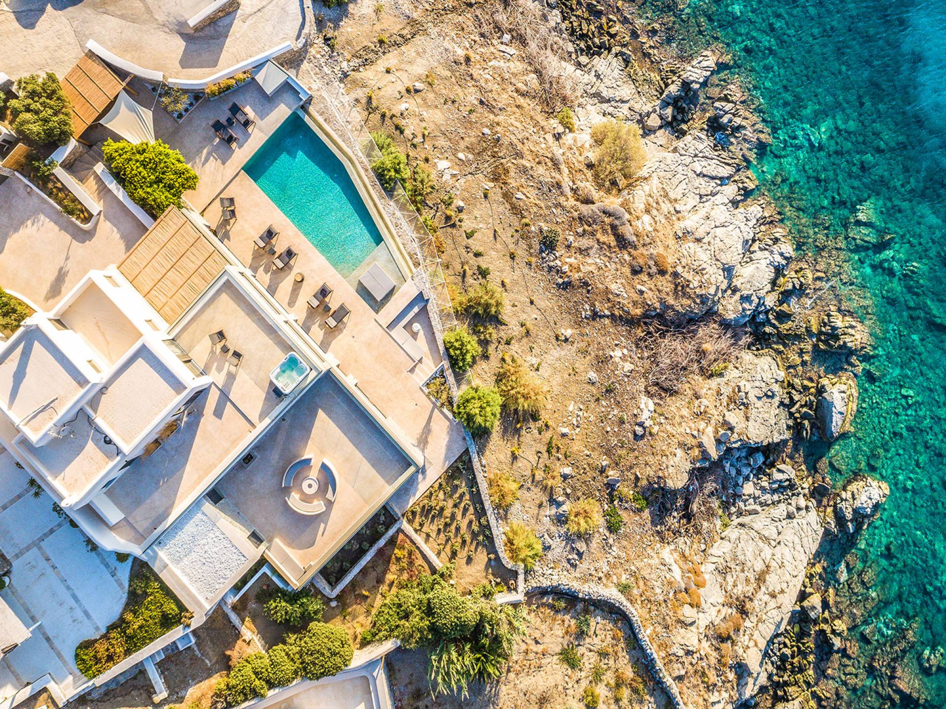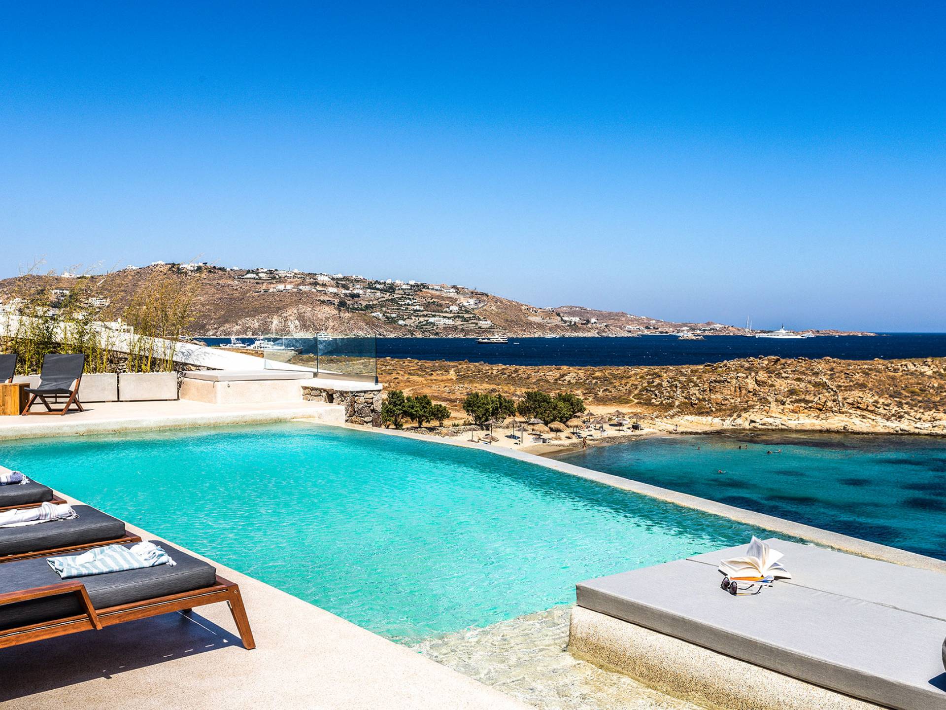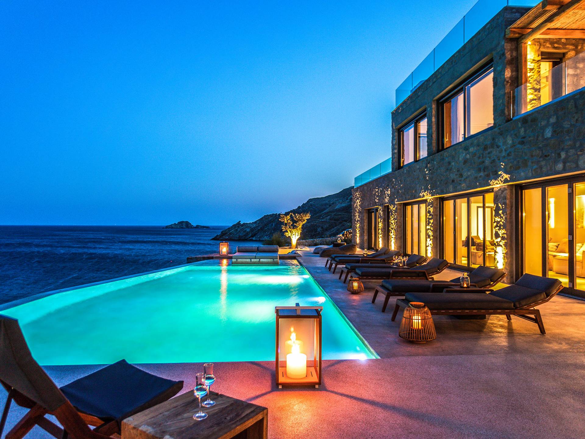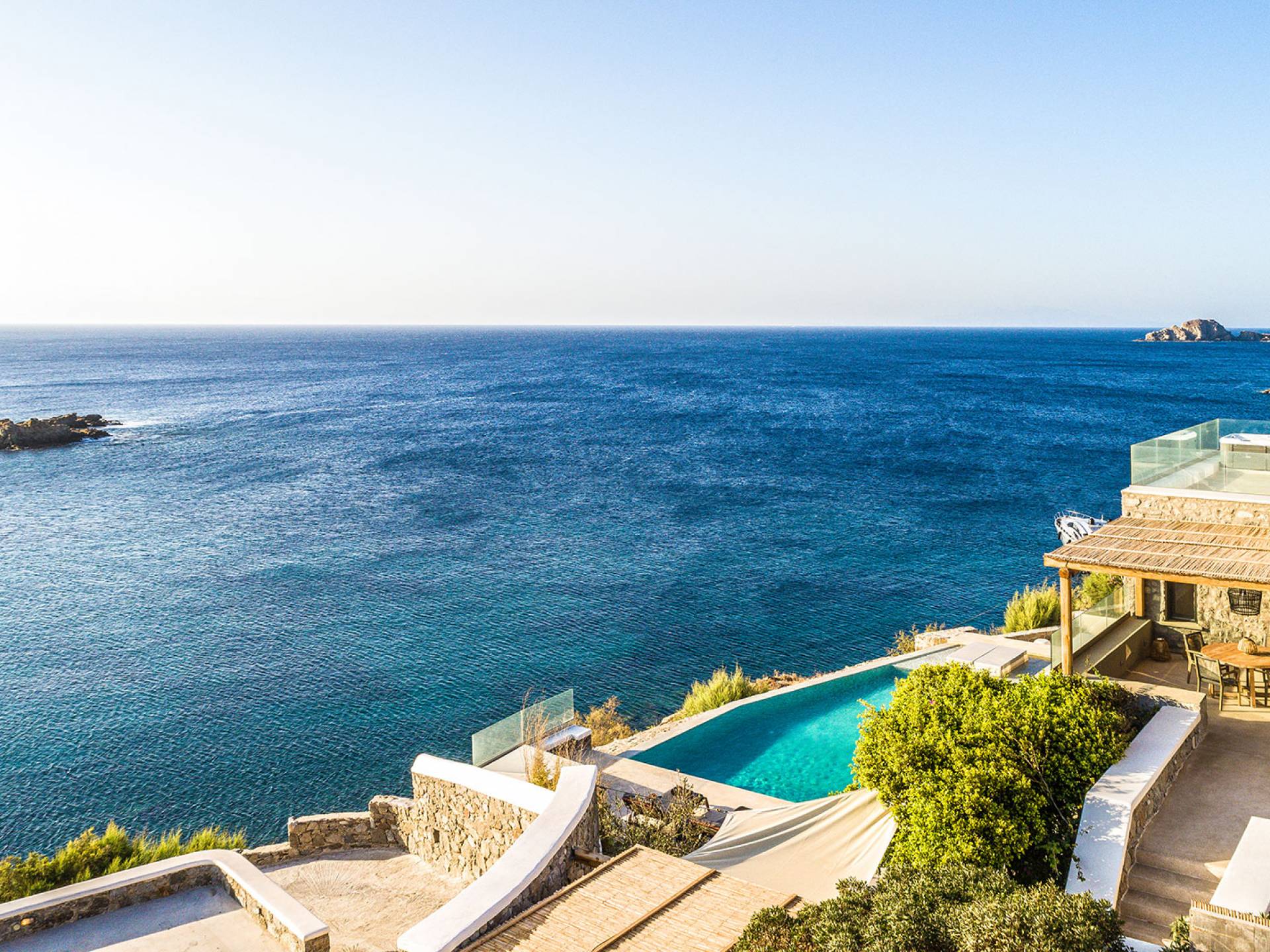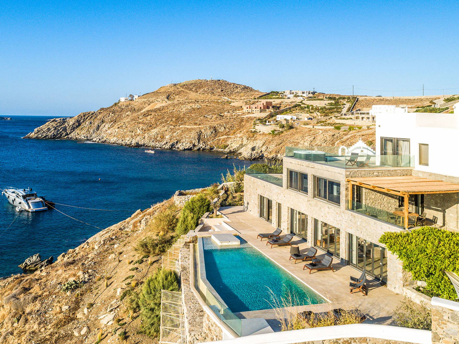 Villa Cascade Mykonos ist eine Luxusvilla mit 6 Schlafzimmern und einem privaten Pool. Die Villa Cascade ist ein brandneues Anwesen am Wasser in Aleomandra mit atemberaubendem, unverbaubarem Meerblick, das am Rand einer felsigen Küste an einem windgeschützten Ort direkt über den Gewässern der Ägäis erbaut wurde.