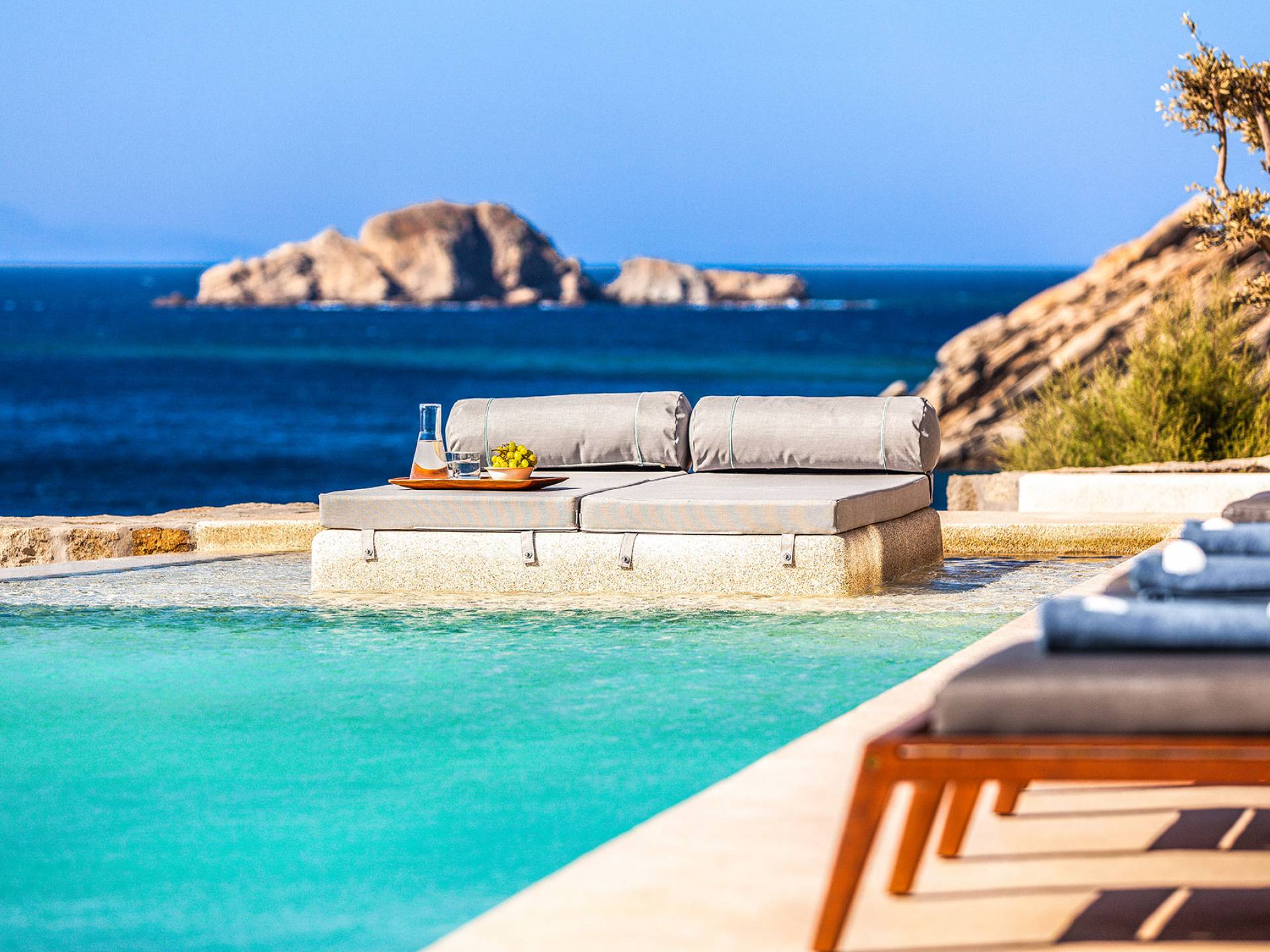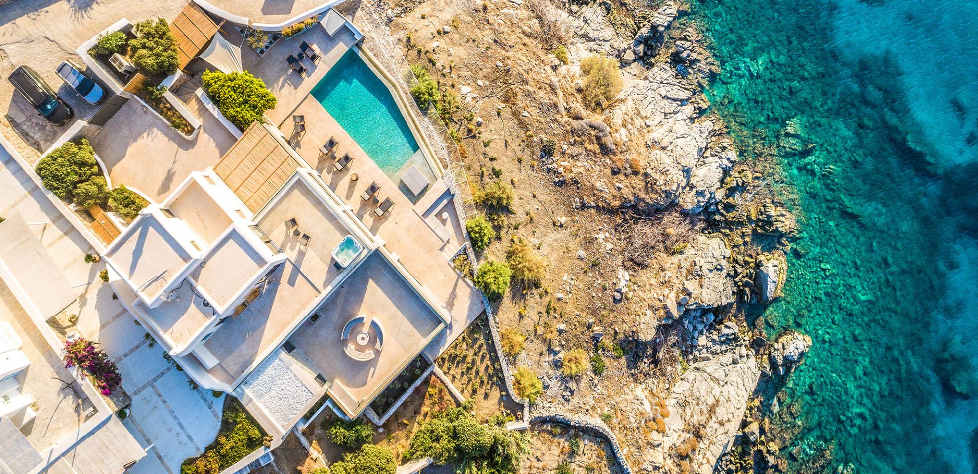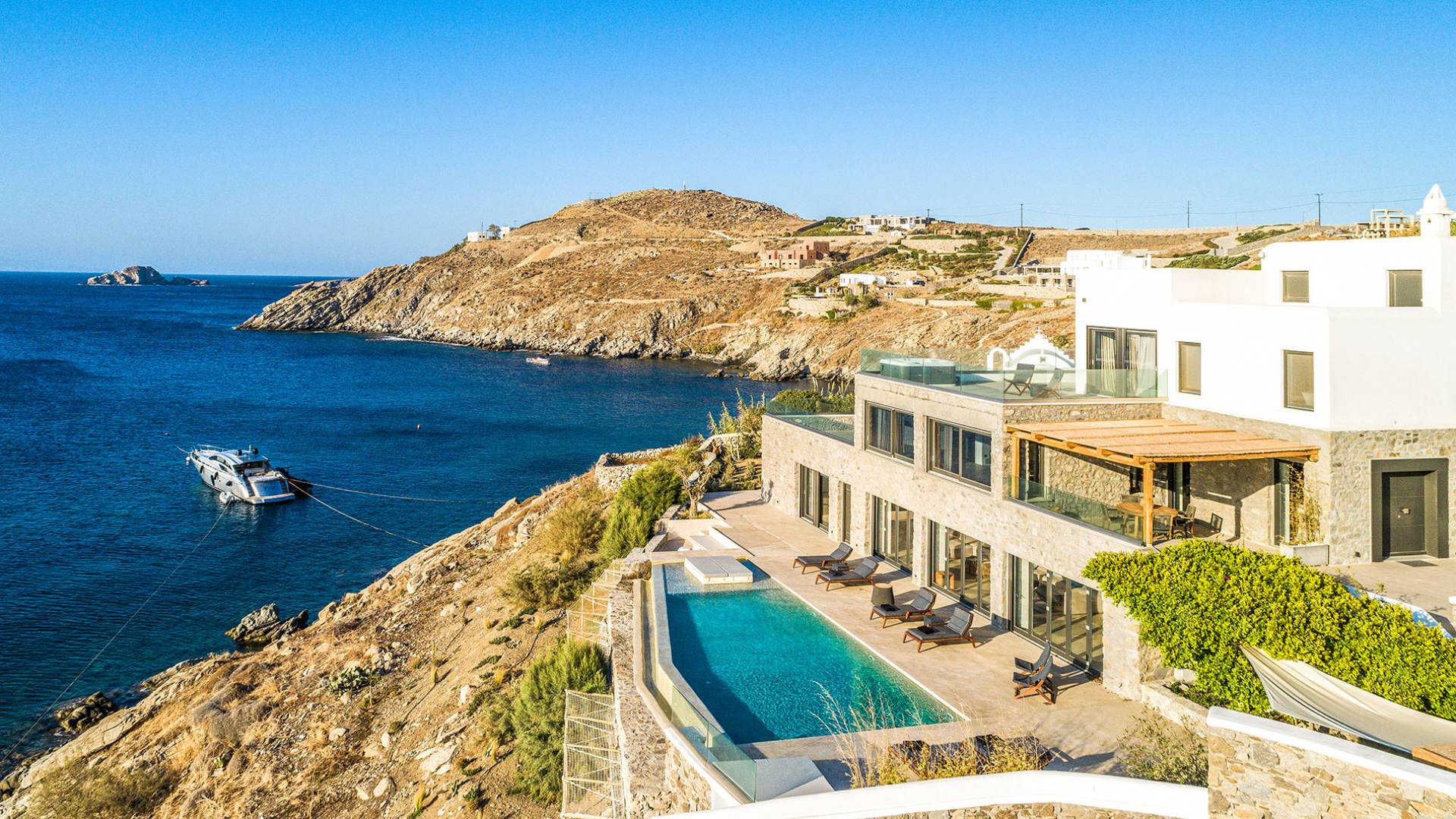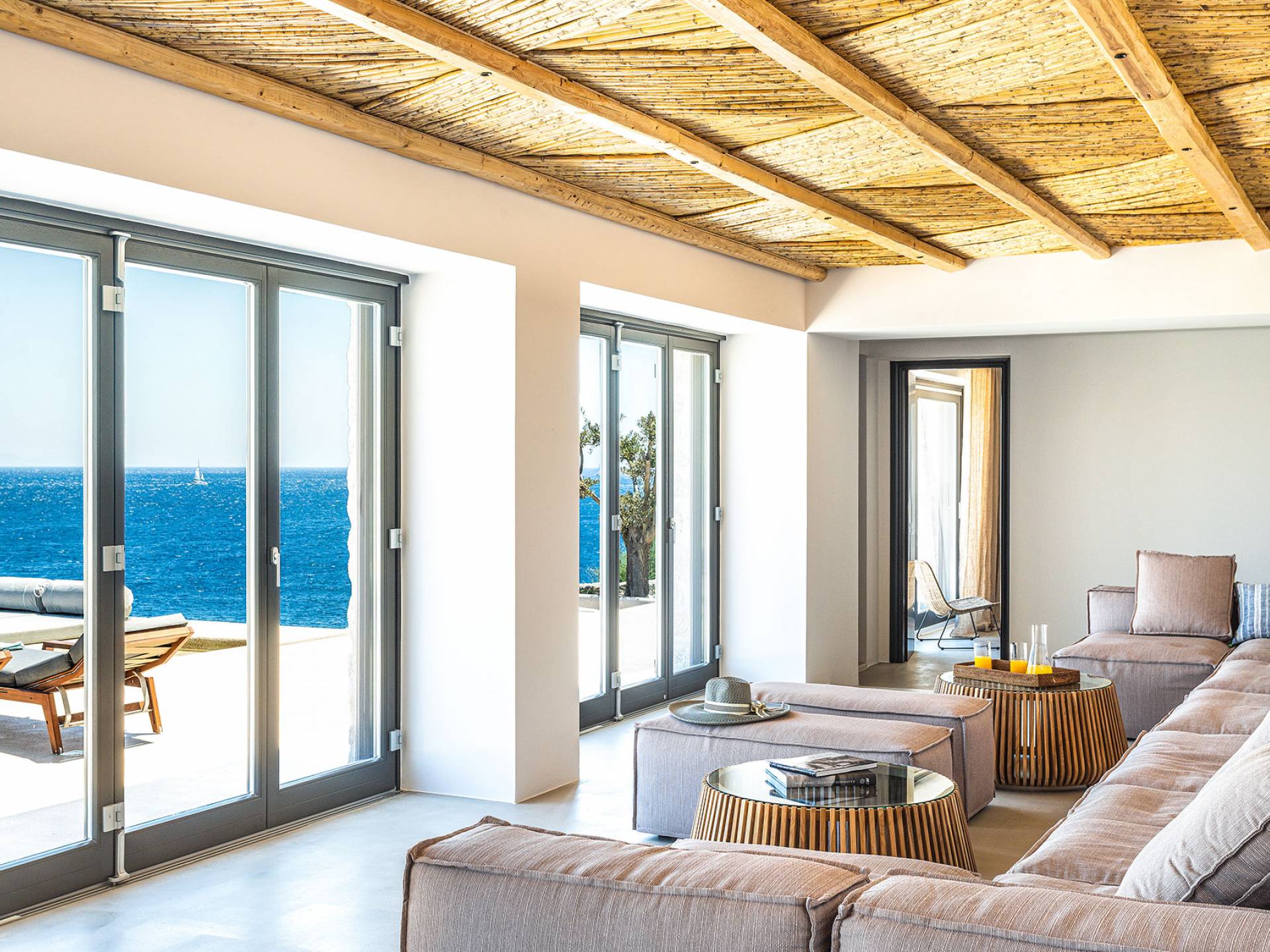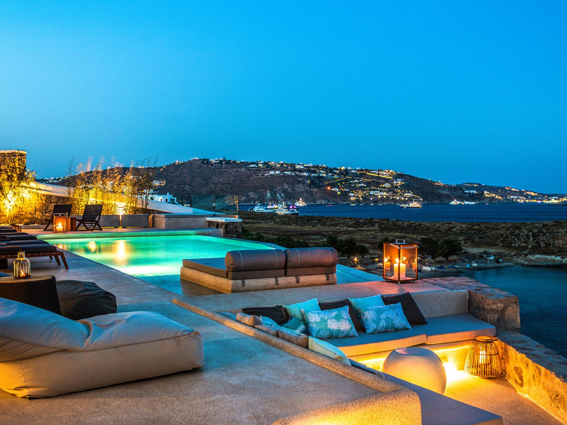 Villa Cascade Mykonos ist eine Luxusvilla mit 6 Schlafzimmern und einem privaten Pool. Die Villa Cascade ist ein brandneues Anwesen am Wasser in Aleomandra mit atemberaubendem, unverbaubarem Meerblick, das am Rand einer felsigen Küste an einem windgeschützten Ort direkt über den Gewässern der Ägäis erbaut wurde.