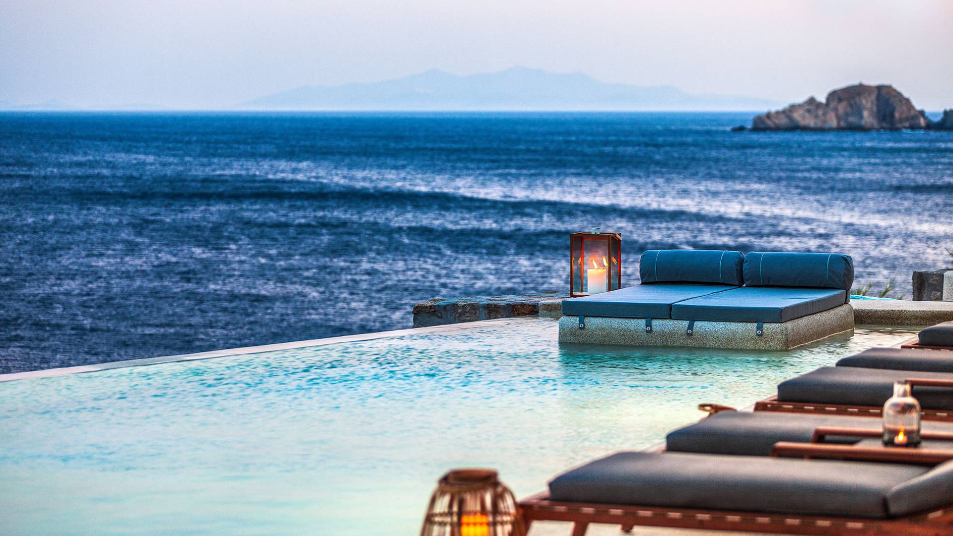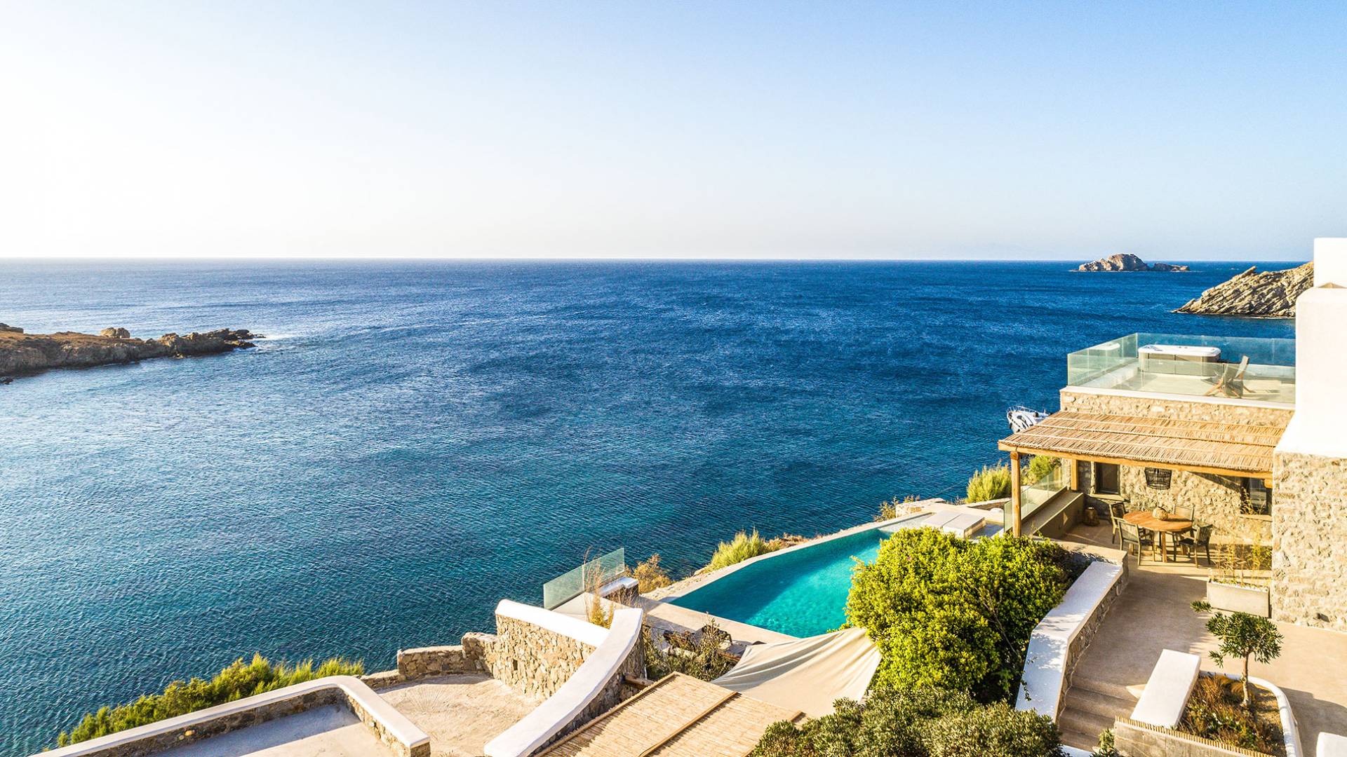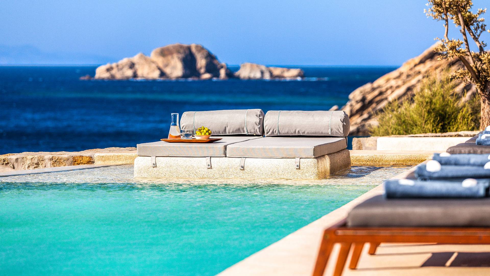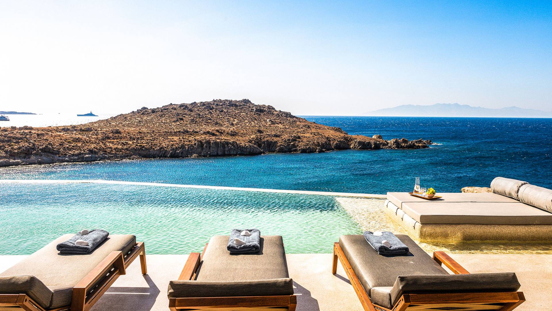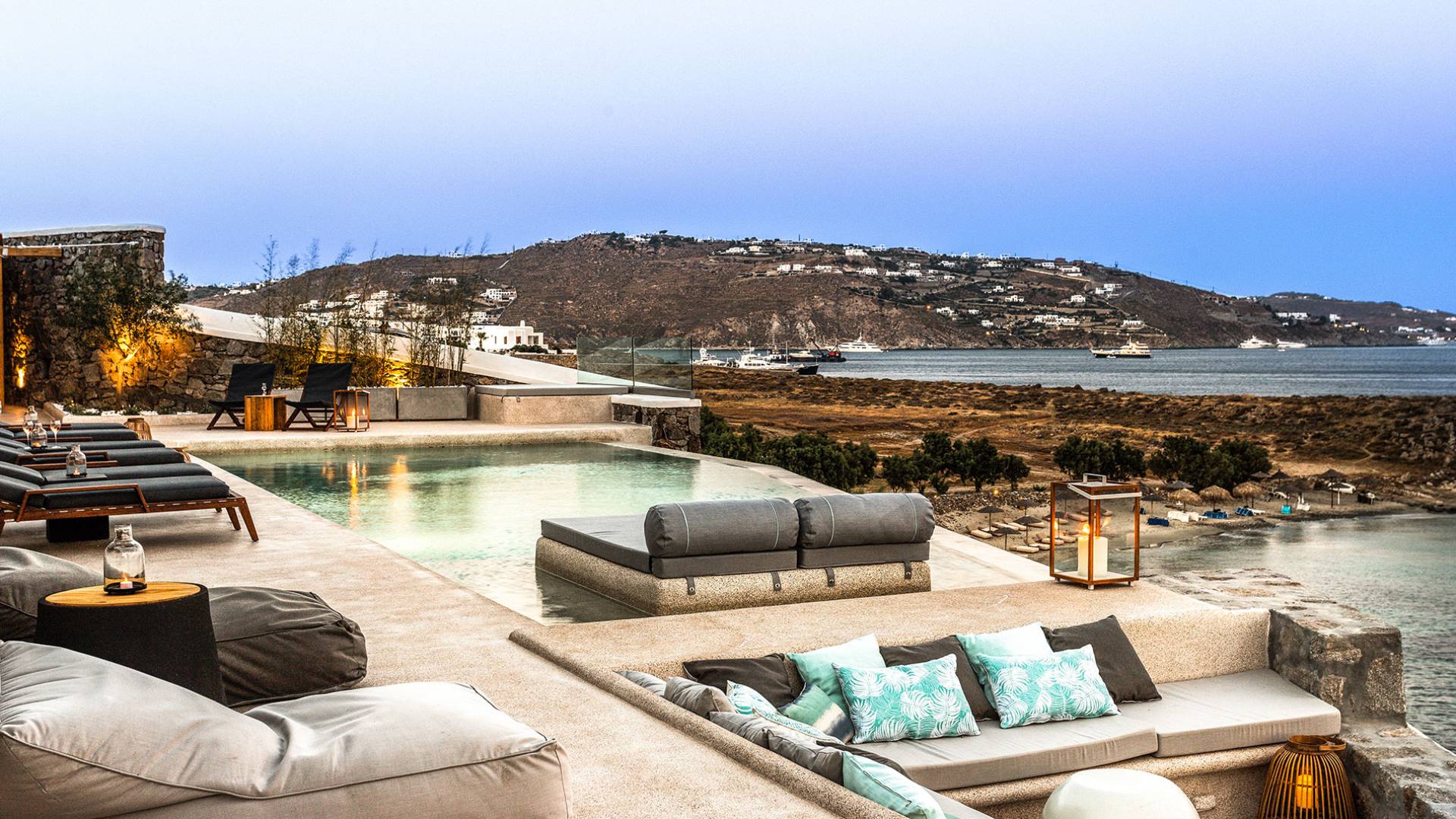 Villa Cascade Mykonos ist eine Luxusvilla mit 6 Schlafzimmern und einem privaten Pool. Die Villa Cascade ist ein brandneues Anwesen am Wasser in Aleomandra mit atemberaubendem, unverbaubarem Meerblick, das am Rand einer felsigen Küste an einem windgeschützten Ort direkt über den Gewässern der Ägäis erbaut wurde.