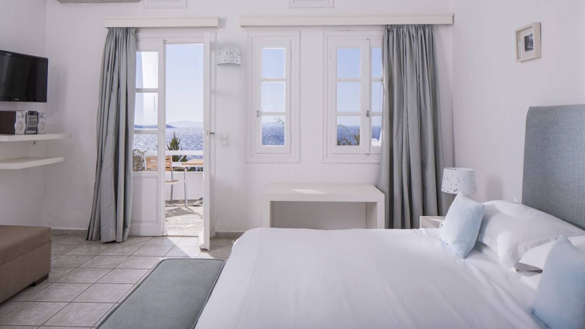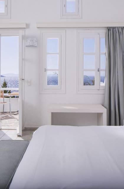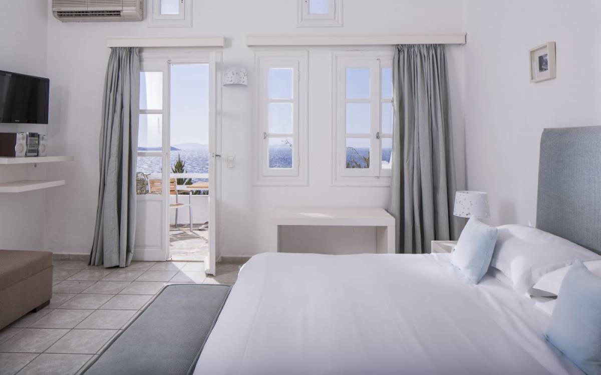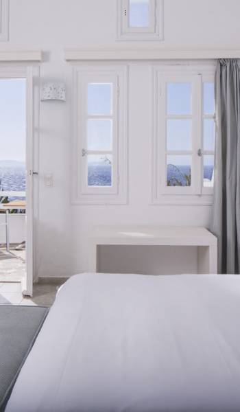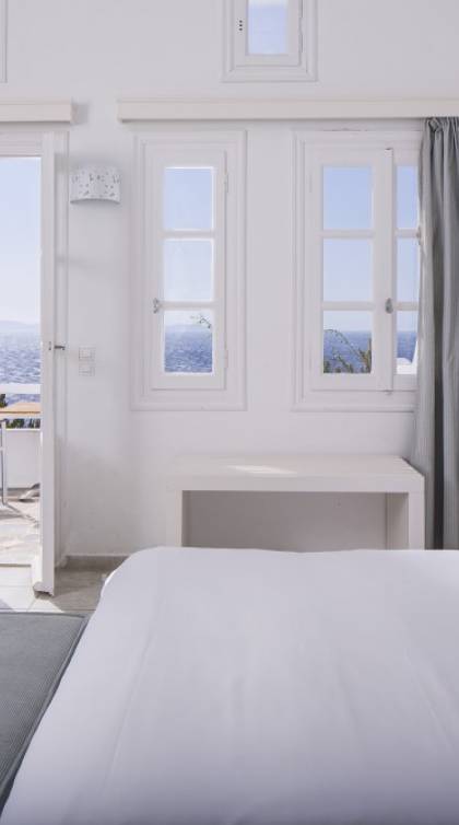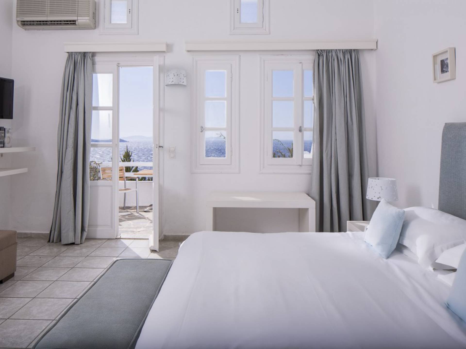 Unsere Superior-Zimmer mit freiem Blick auf das Blau der Ägäis sind geräumig (40 m²) und mit einem Kingsize-Bett oder zwei Einzelbetten ausgestattet. Es sind schöne Zimmer mit allen modernen Annehmlichkeiten und luxuriösen Annehmlichkeiten, die Ihren Aufenthalt auf Mykonos zu einem unvergesslichen Erlebnis machen. Gäste sind herzlich eingeladen, die magische Aussicht von ihrem privaten Balkon oder ihrer Veranda mit Blick auf das unendliche Blau des Meeres und des Himmels zu genießen. Moderne Einrichtung, volle Funktionalität und erstklassiger Service, minimales Dekor und reichlich Sonnenlicht bilden den Traum in Apanema!