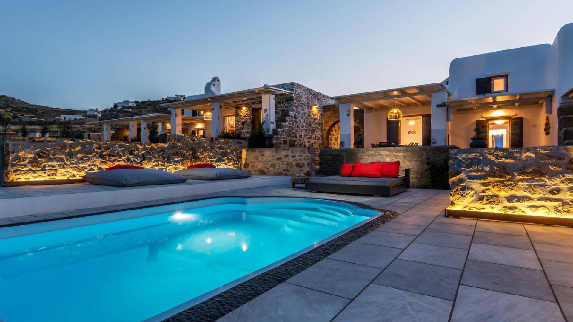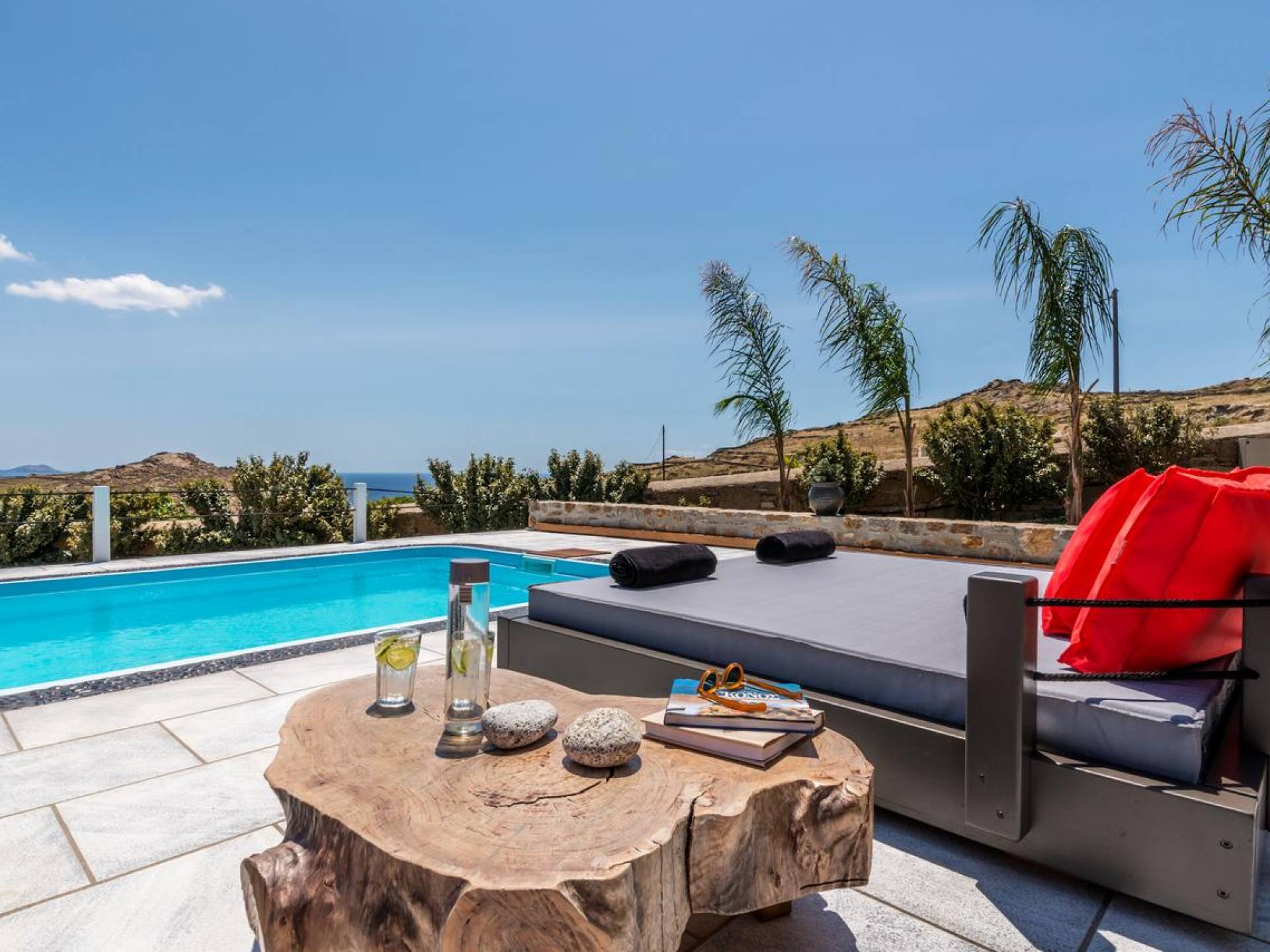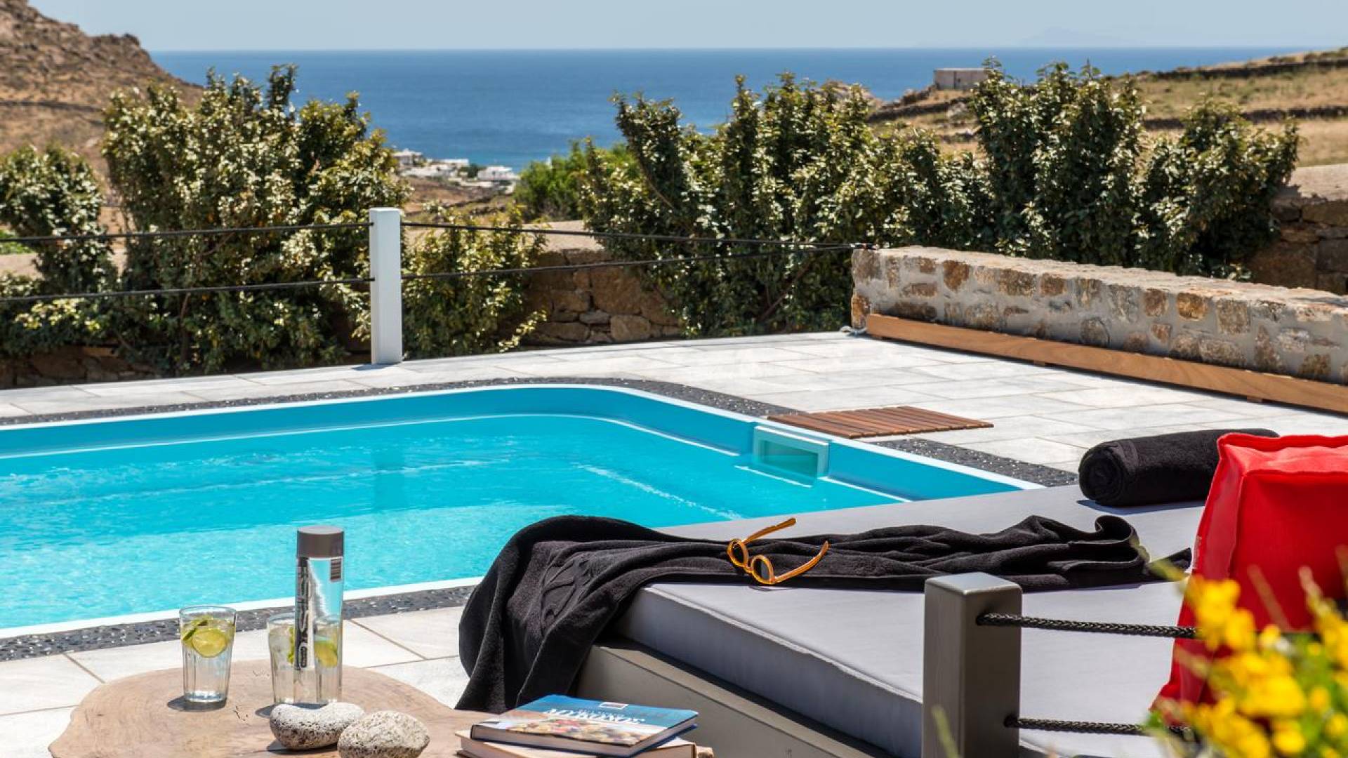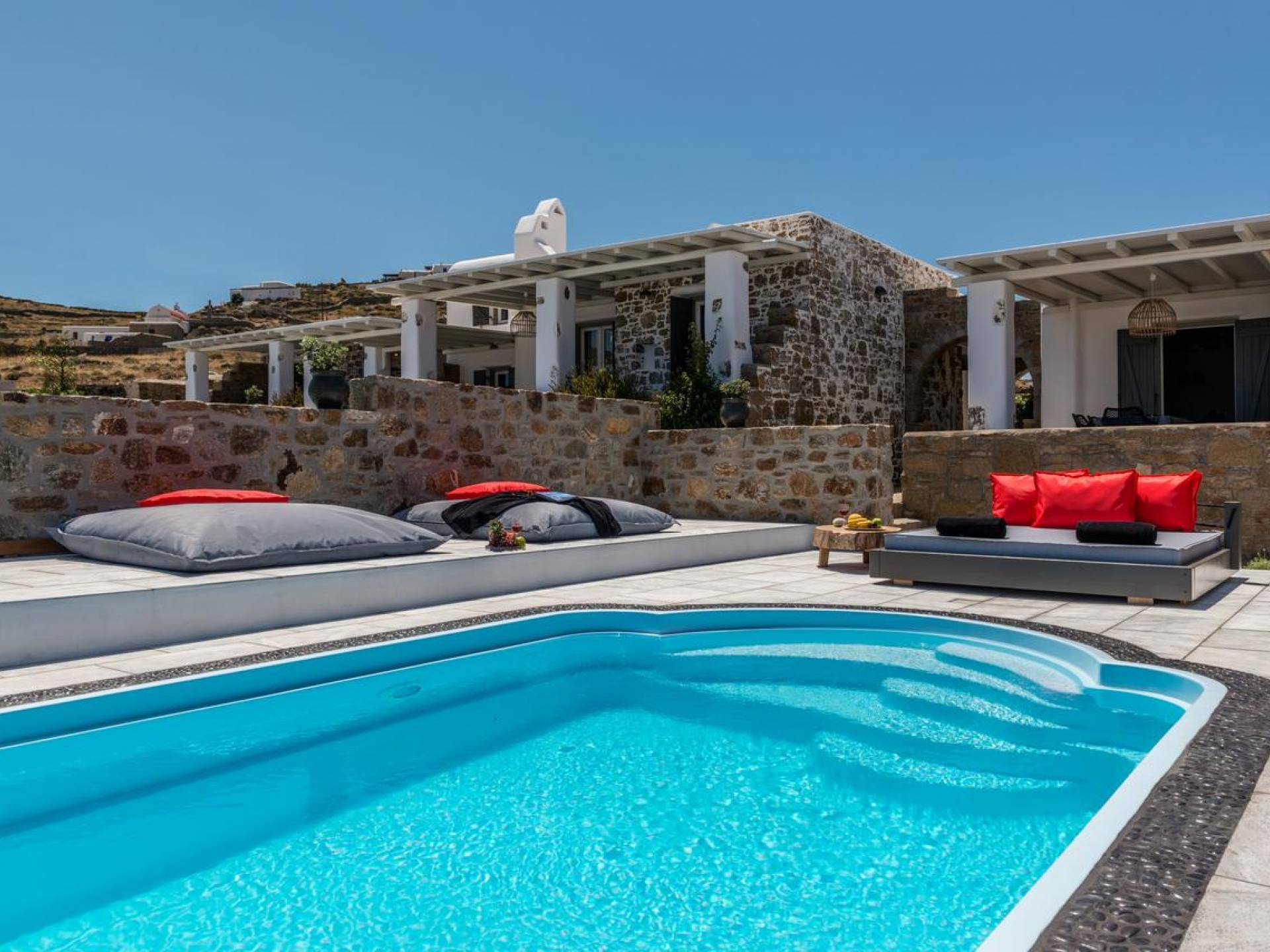 Aurora Mykonos-Villen. Ein privates Paradies auf Mykonos. Die vier luxuriösen Neubauvillen liegen nur einen Steinwurf von den schönsten Stränden von Mykonos, wie Κalafatis, Lia, Kalo Livadi, Fokos und Merkia entfernt. Erbaut mit Blick auf das Meer im Osten, in völliger Harmonie mit der natürlichen Umgebung, nach den klaren minimalistischen Linien der Kykladen.
