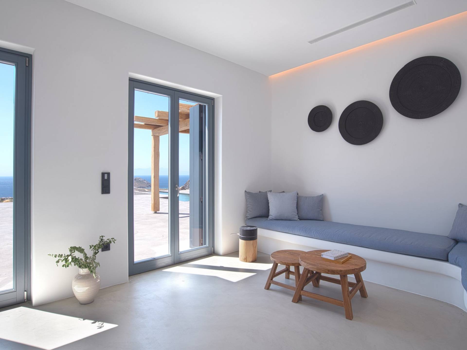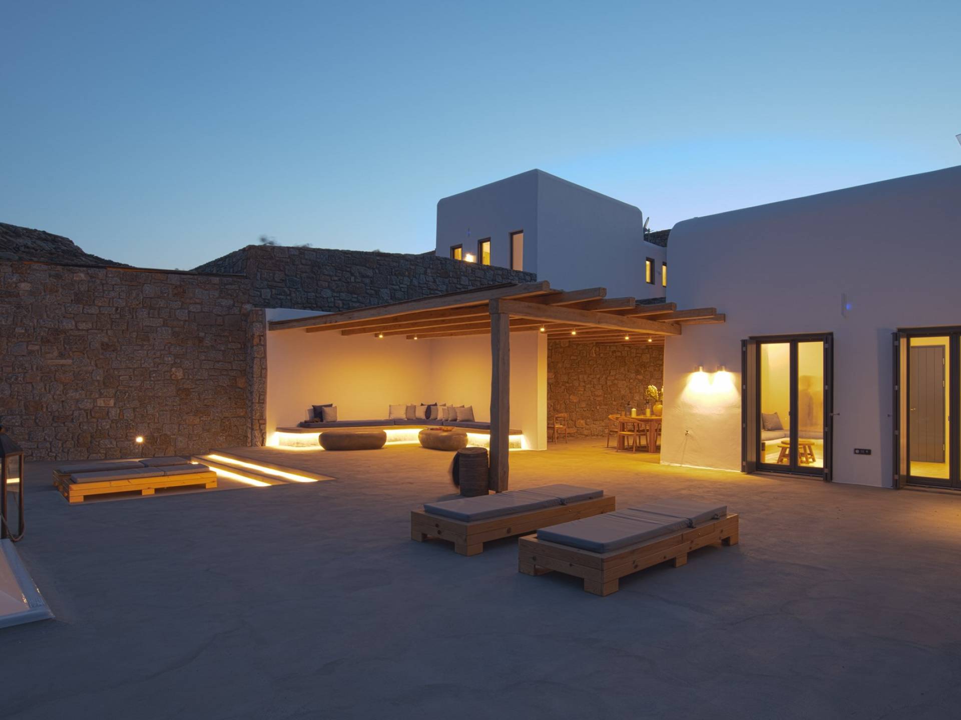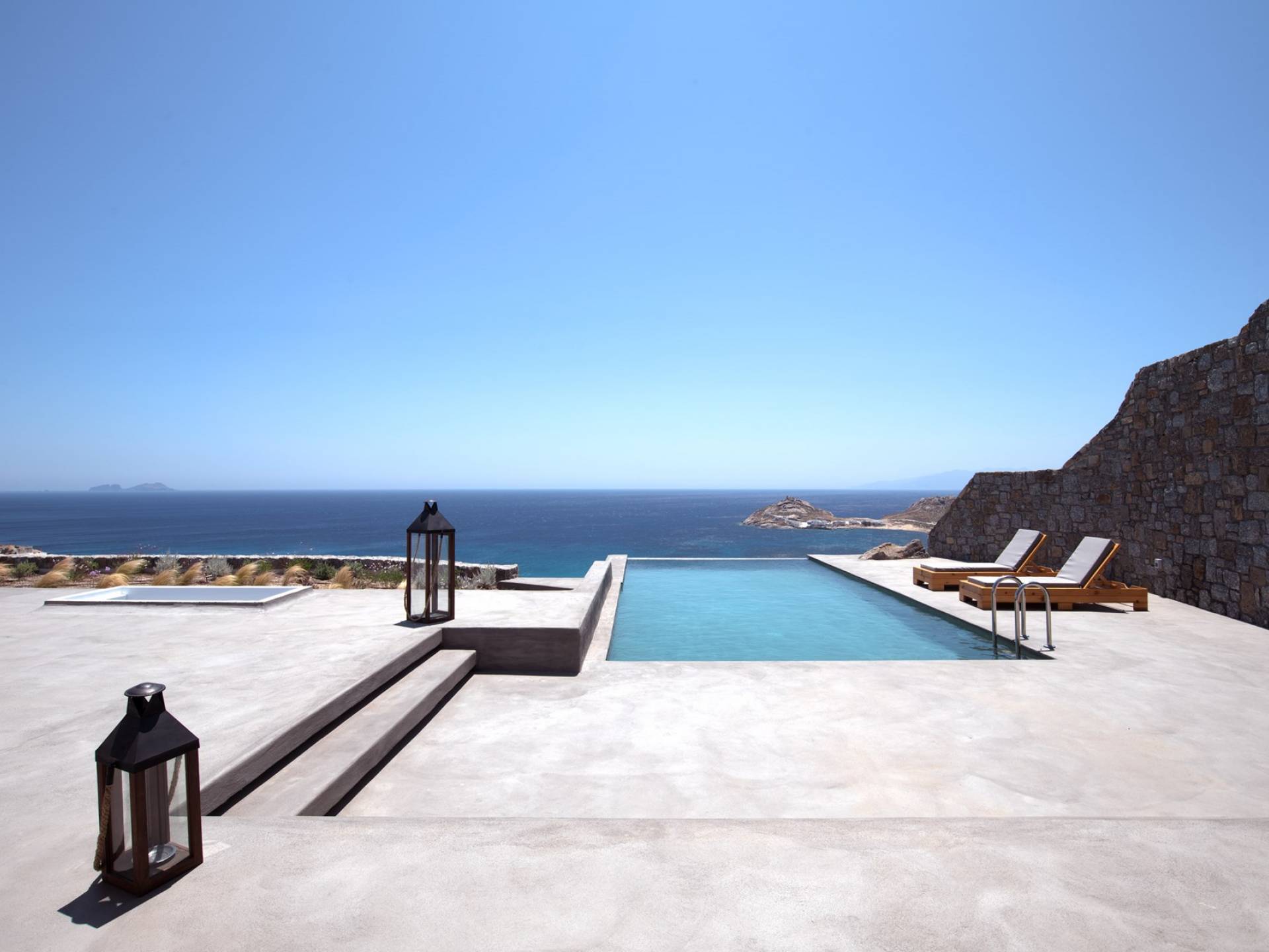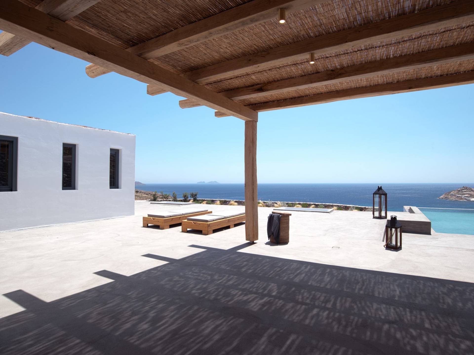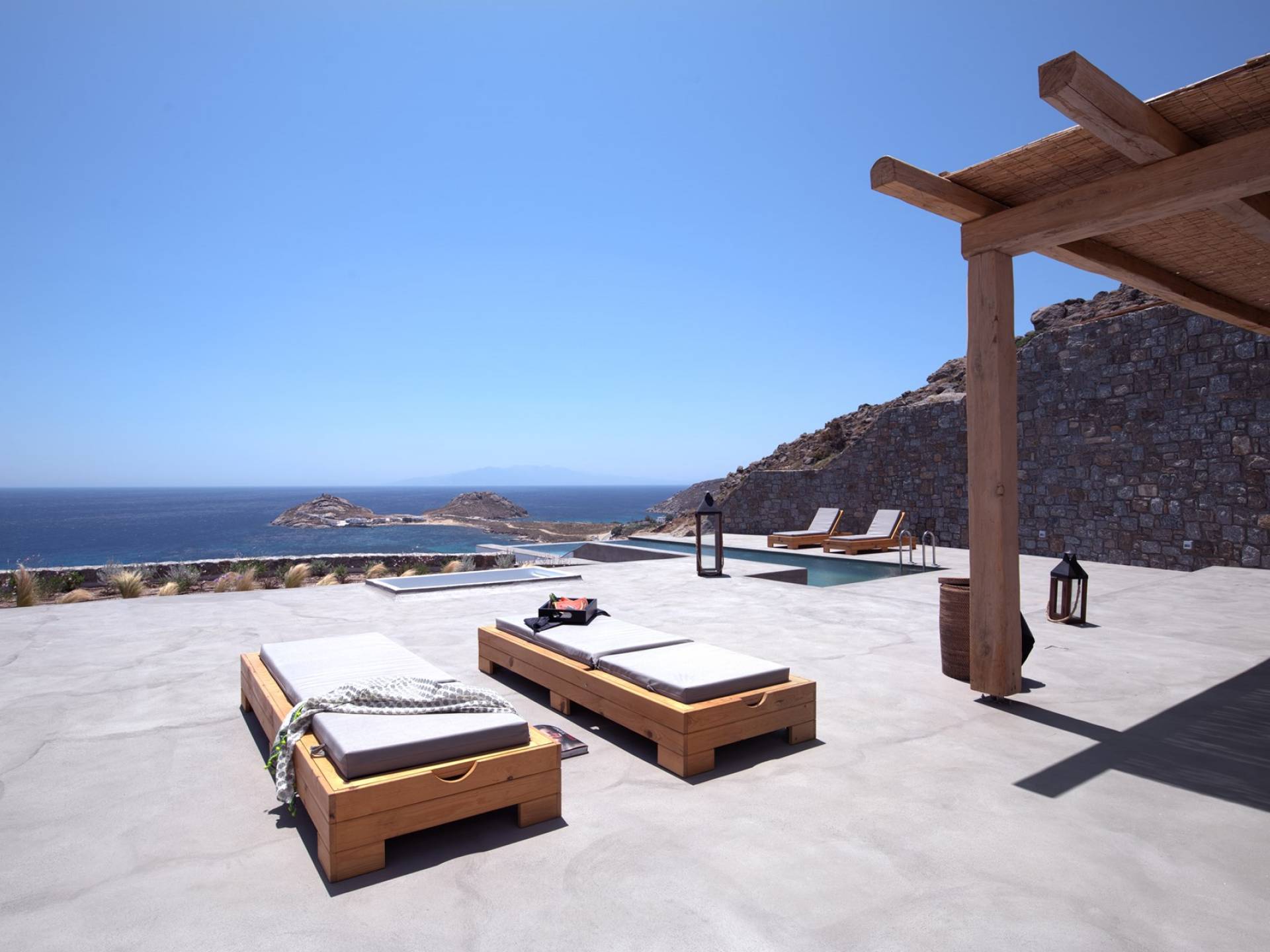 Das strahlend weiße Äußere des Wohnhauses ist teilweise mit Stein verkleidet, sodass es so aussieht, als wäre es aus seiner Umgebung herausgewachsen. Ständig vernarrt in die herrliche Aussicht auf die Ägäis, stattete der Architekt die Terrasse mit bequemen Lounge-/Essplätzen, einer Open-Air-Küche und einem wunderschönen Infinity-Pool aus, die alle auf eine Meereslandschaft ausgerichtet sind, die sich im Laufe des Tages ständig verändert.