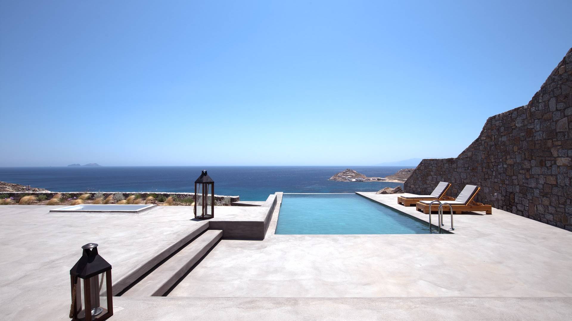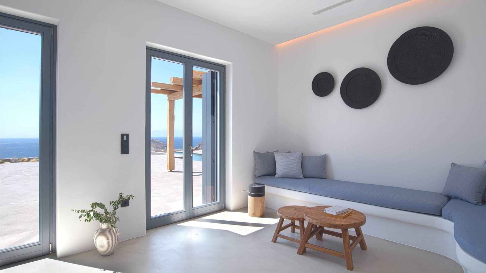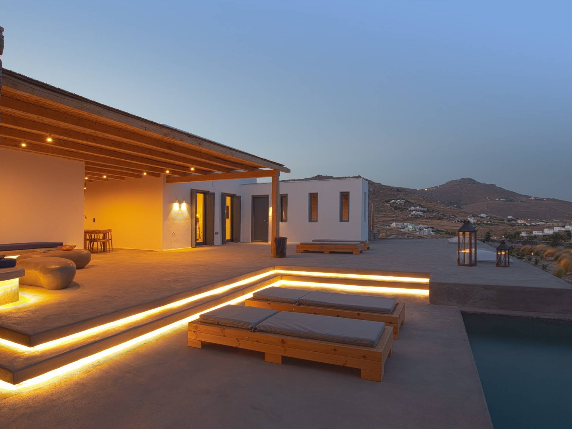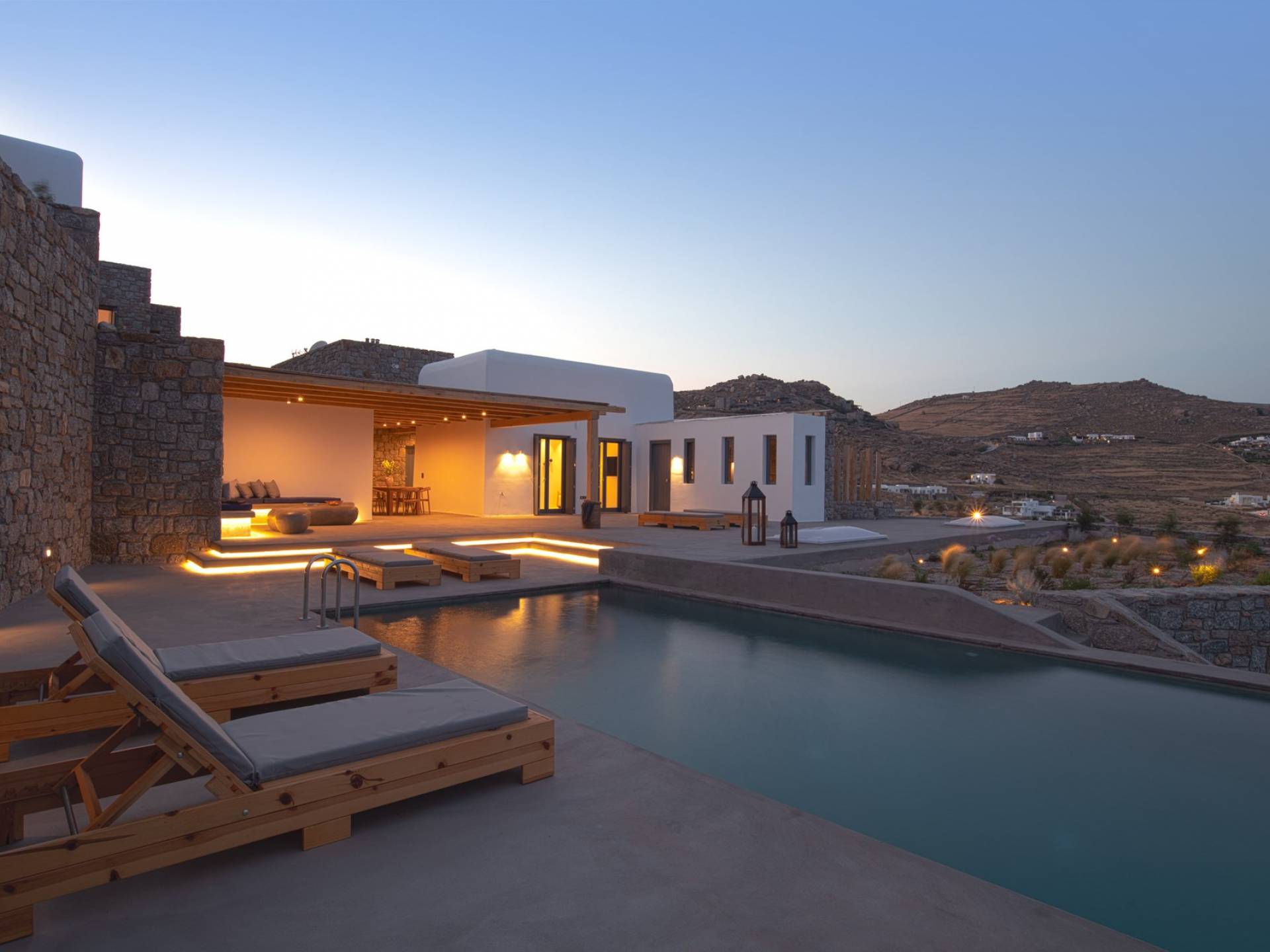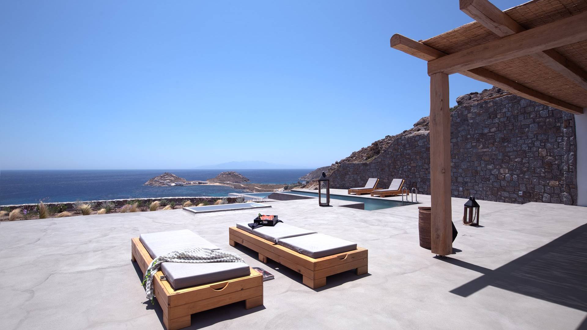 Das strahlend weiße Äußere des Wohnhauses ist teilweise mit Stein verkleidet, sodass es so aussieht, als wäre es aus seiner Umgebung herausgewachsen. Ständig vernarrt in die herrliche Aussicht auf die Ägäis, stattete der Architekt die Terrasse mit bequemen Lounge-/Essplätzen, einer Open-Air-Küche und einem wunderschönen Infinity-Pool aus, die alle auf eine Meereslandschaft ausgerichtet sind, die sich im Laufe des Tages ständig verändert.