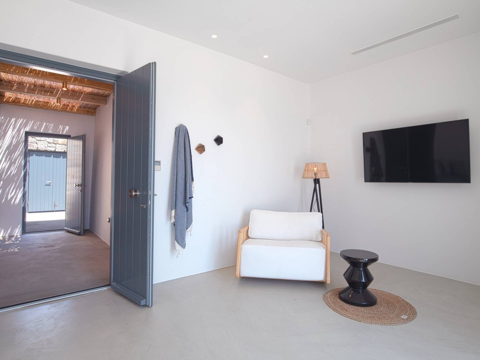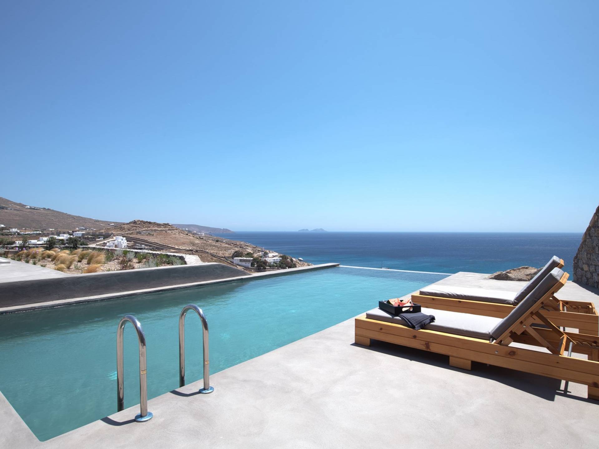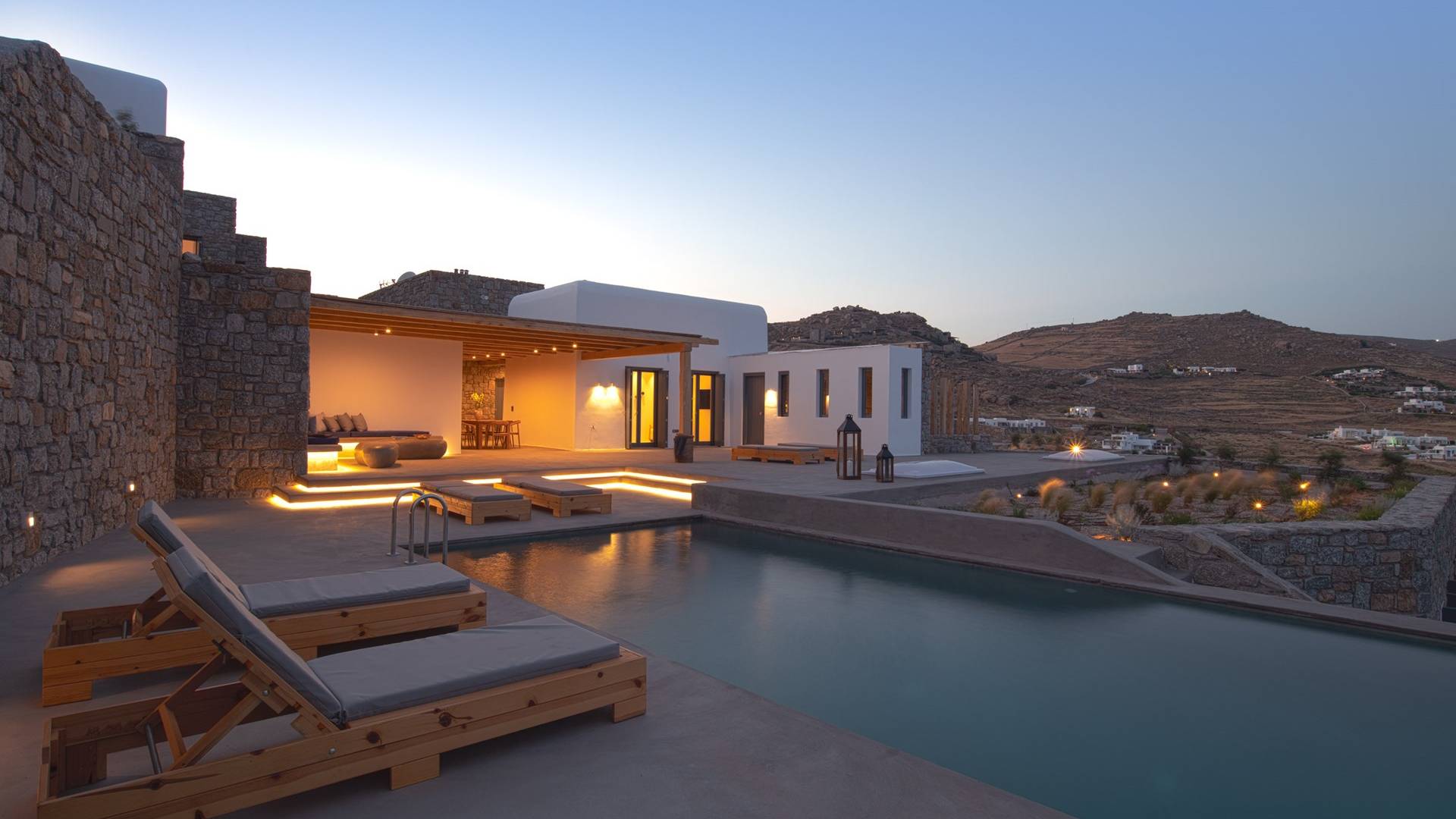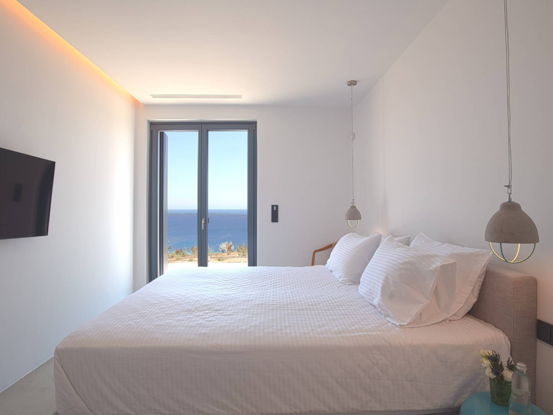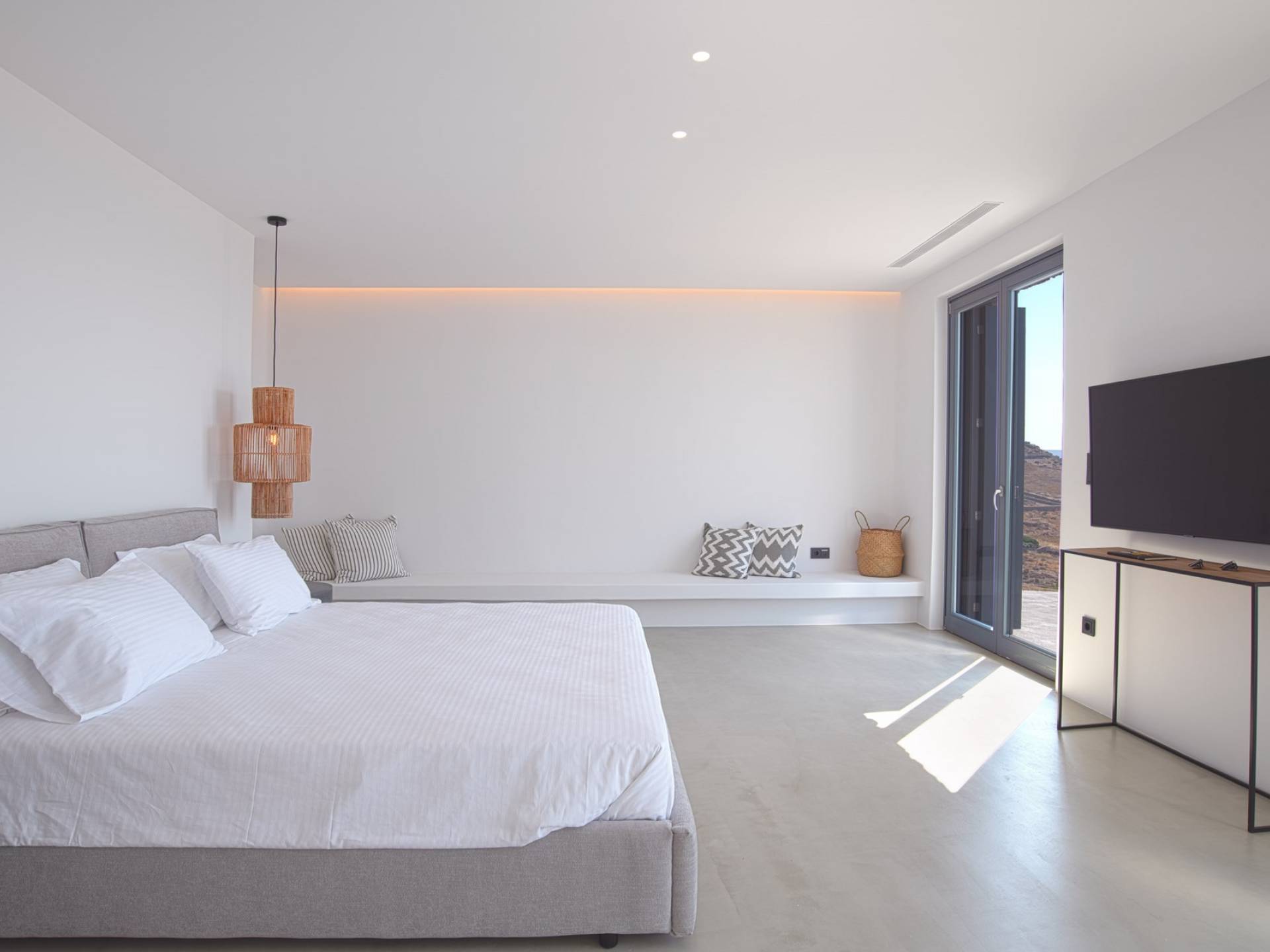 Das strahlend weiße Äußere des Wohnhauses ist teilweise mit Stein verkleidet, sodass es so aussieht, als wäre es aus seiner Umgebung herausgewachsen. Ständig vernarrt in die herrliche Aussicht auf die Ägäis, stattete der Architekt die Terrasse mit bequemen Lounge-/Essplätzen, einer Open-Air-Küche und einem wunderschönen Infinity-Pool aus, die alle auf eine Meereslandschaft ausgerichtet sind, die sich im Laufe des Tages ständig verändert.