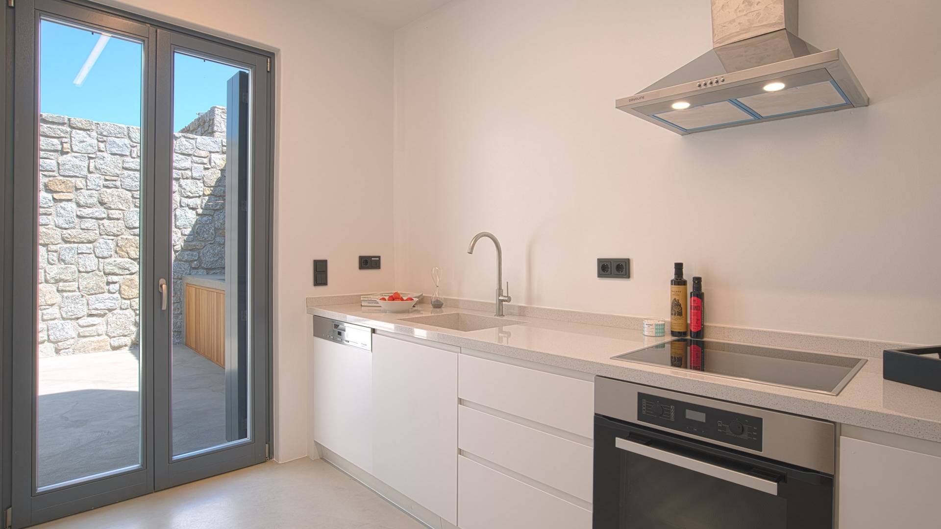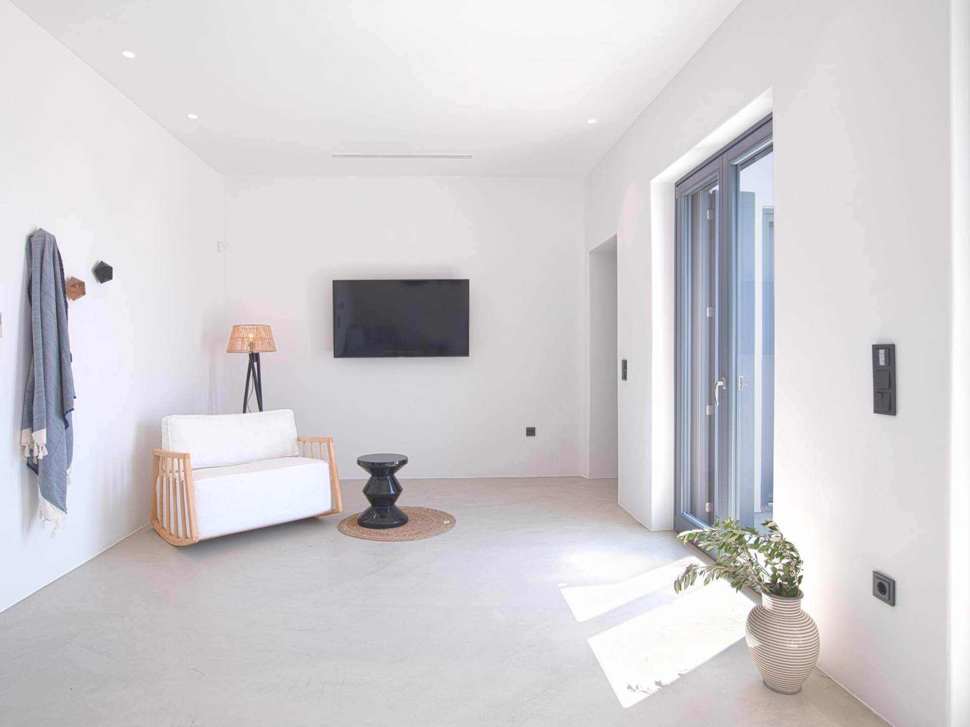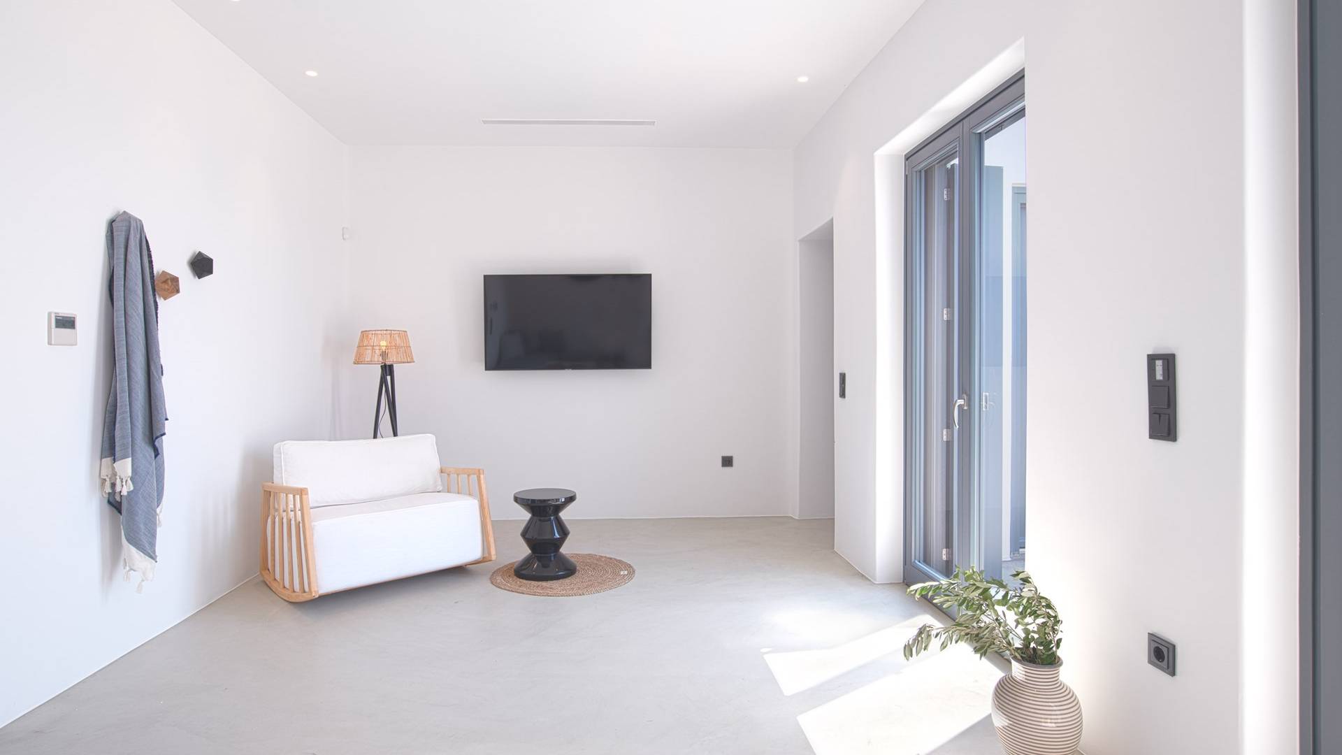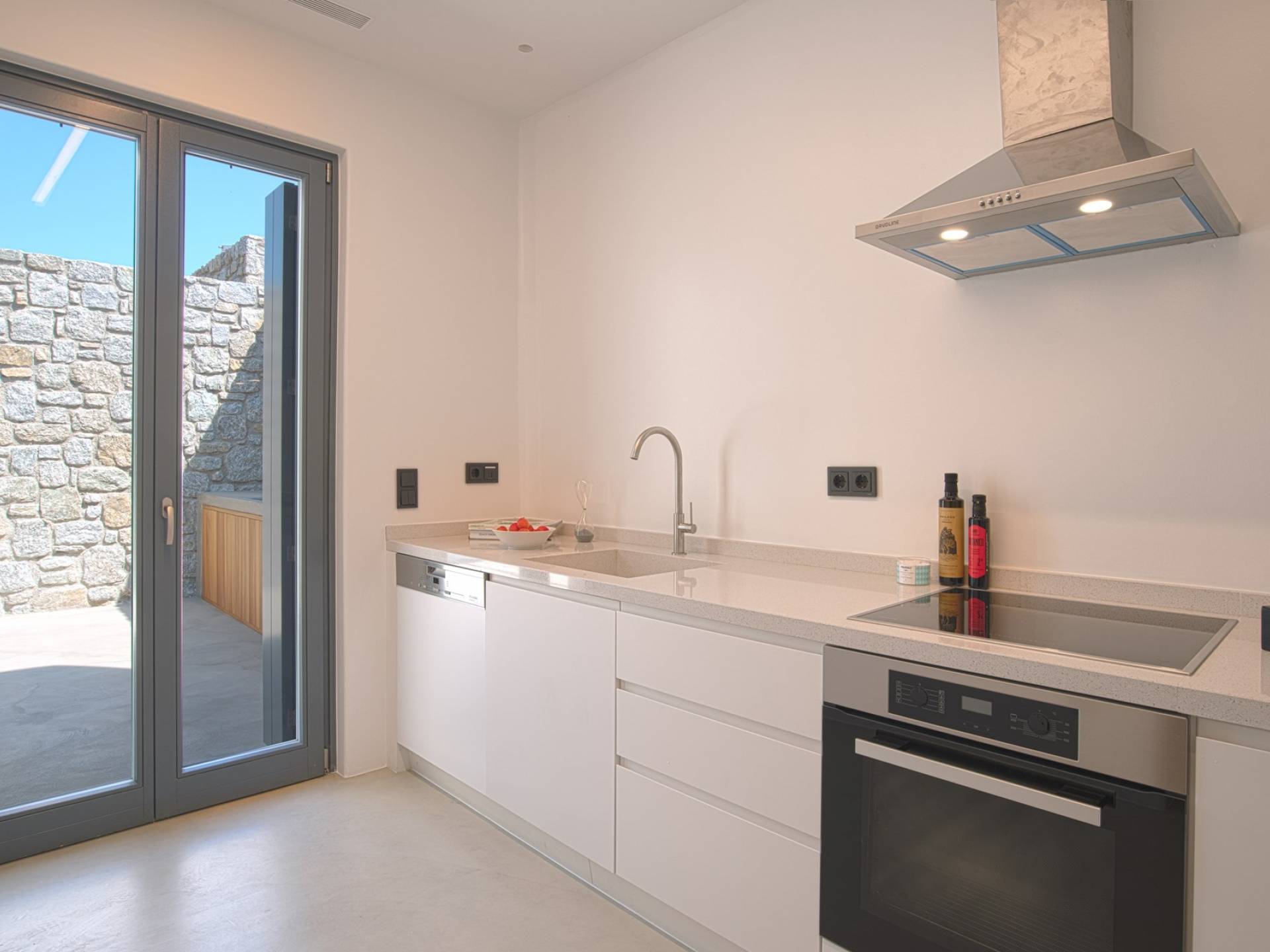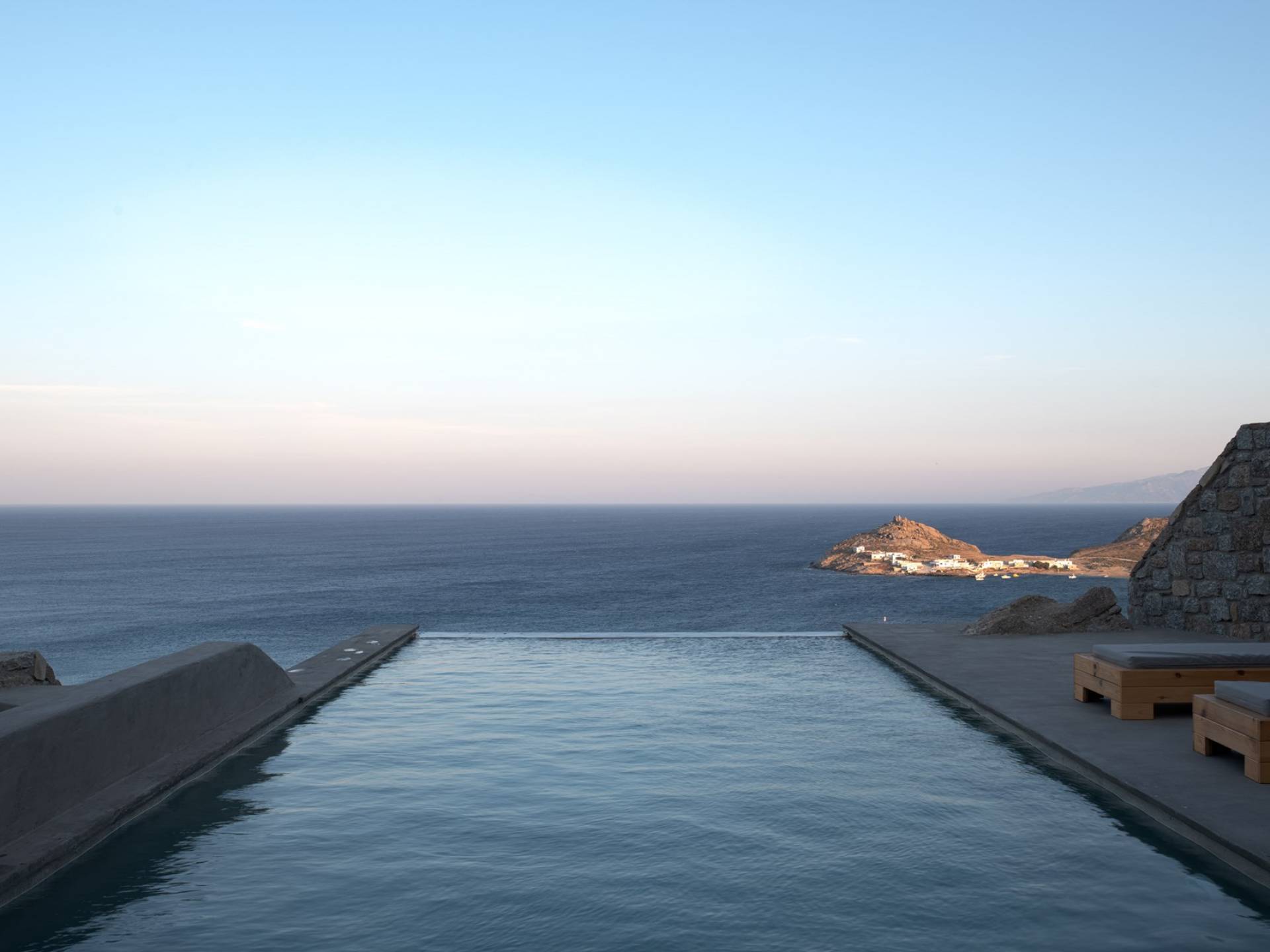 Das strahlend weiße Äußere des Wohnhauses ist teilweise mit Stein verkleidet, sodass es so aussieht, als wäre es aus seiner Umgebung herausgewachsen. Ständig vernarrt in die herrliche Aussicht auf die Ägäis, stattete der Architekt die Terrasse mit bequemen Lounge-/Essplätzen, einer Open-Air-Küche und einem wunderschönen Infinity-Pool aus, die alle auf eine Meereslandschaft ausgerichtet sind, die sich im Laufe des Tages ständig verändert.