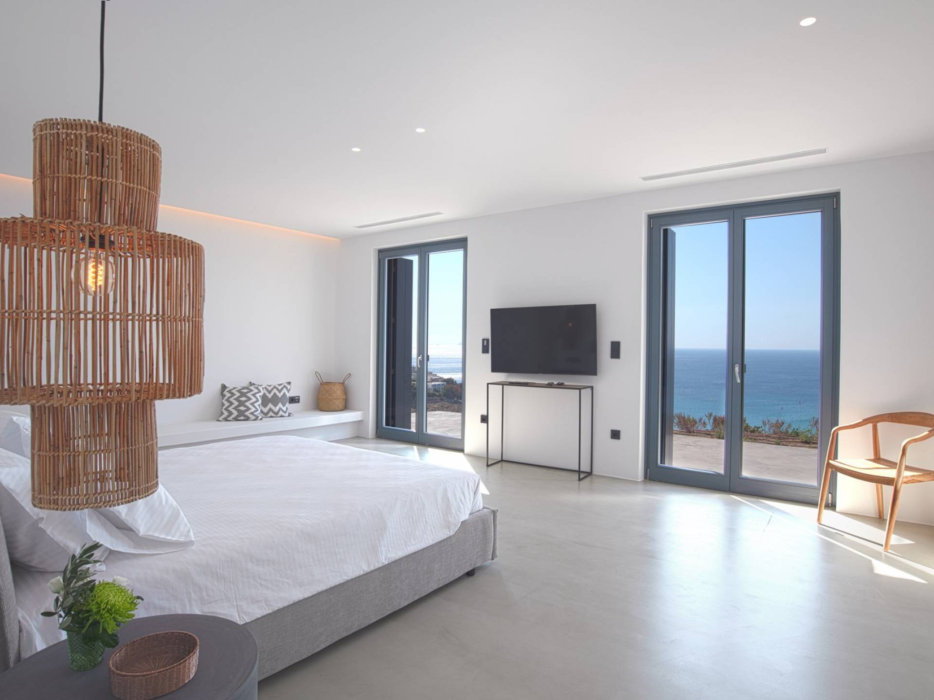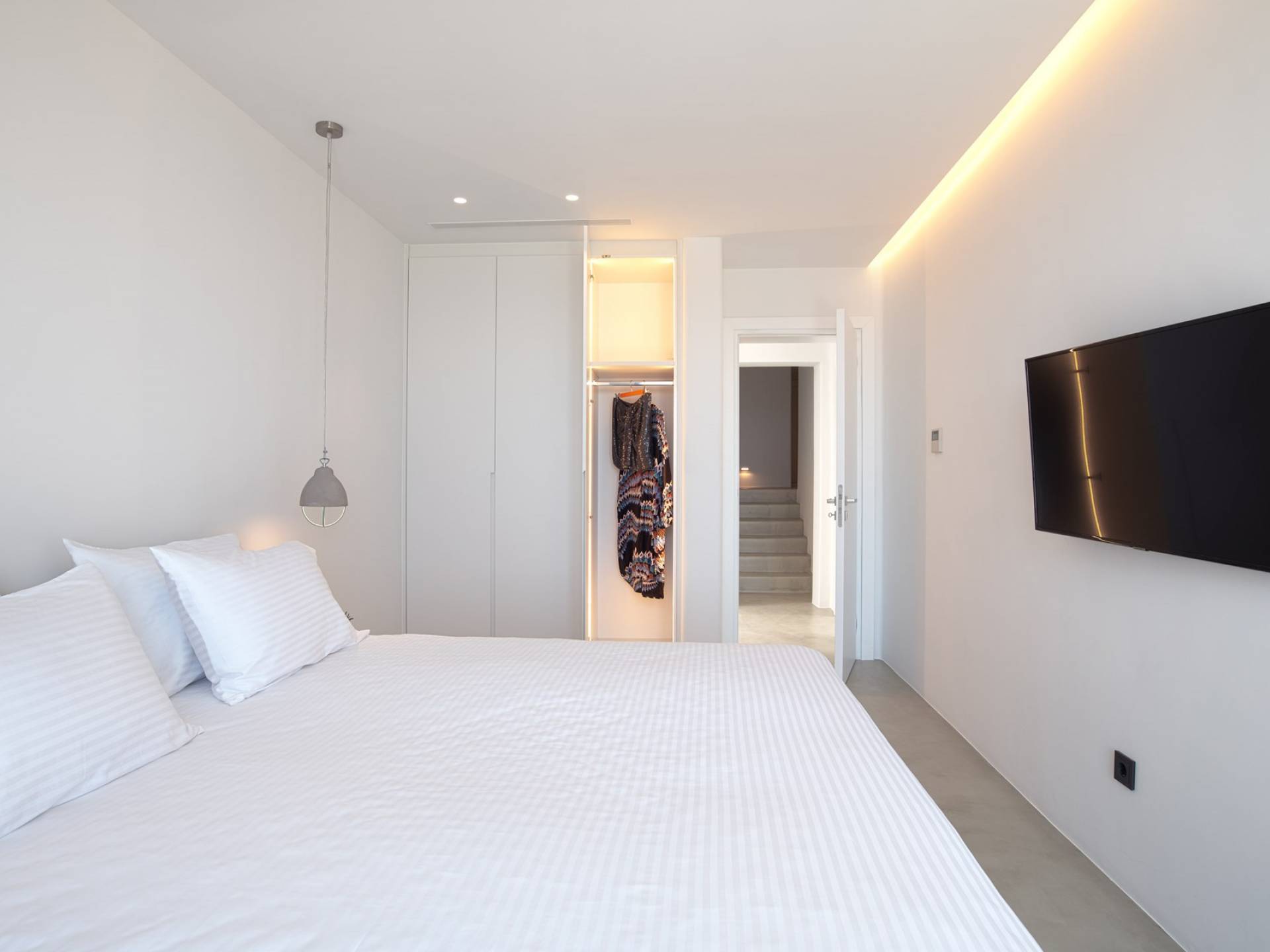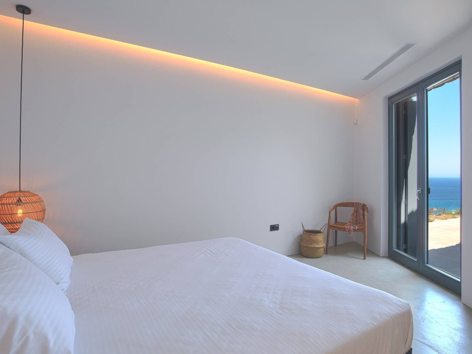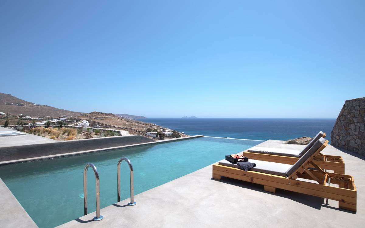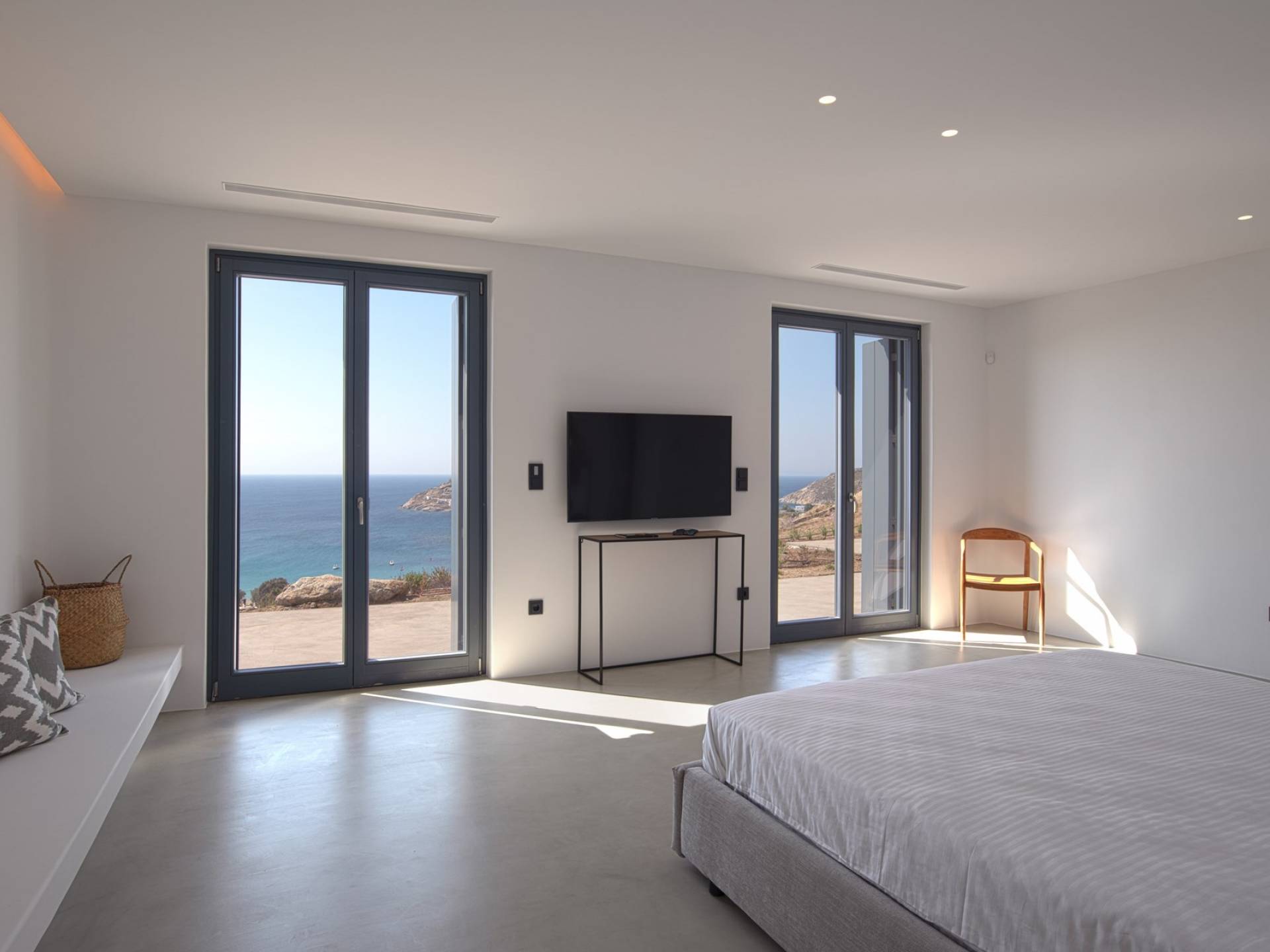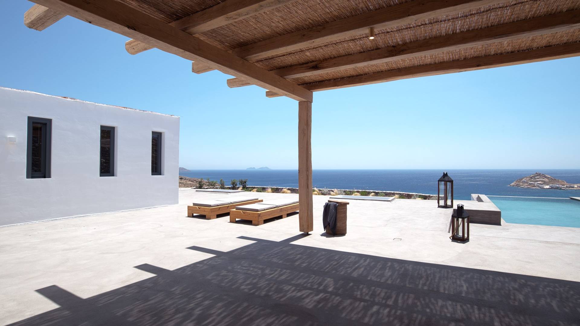 Das strahlend weiße Äußere des Wohnhauses ist teilweise mit Stein verkleidet, sodass es so aussieht, als wäre es aus seiner Umgebung herausgewachsen. Ständig vernarrt in die herrliche Aussicht auf die Ägäis, stattete der Architekt die Terrasse mit bequemen Lounge-/Essplätzen, einer Open-Air-Küche und einem wunderschönen Infinity-Pool aus, die alle auf eine Meereslandschaft ausgerichtet sind, die sich im Laufe des Tages ständig verändert.