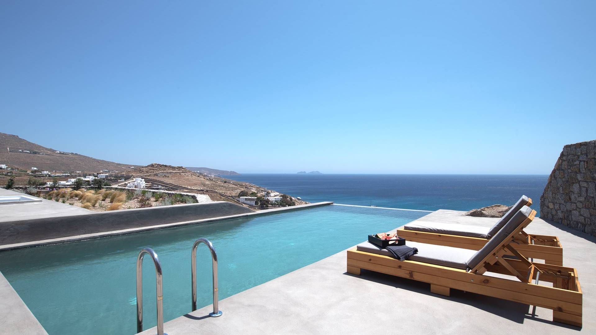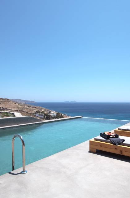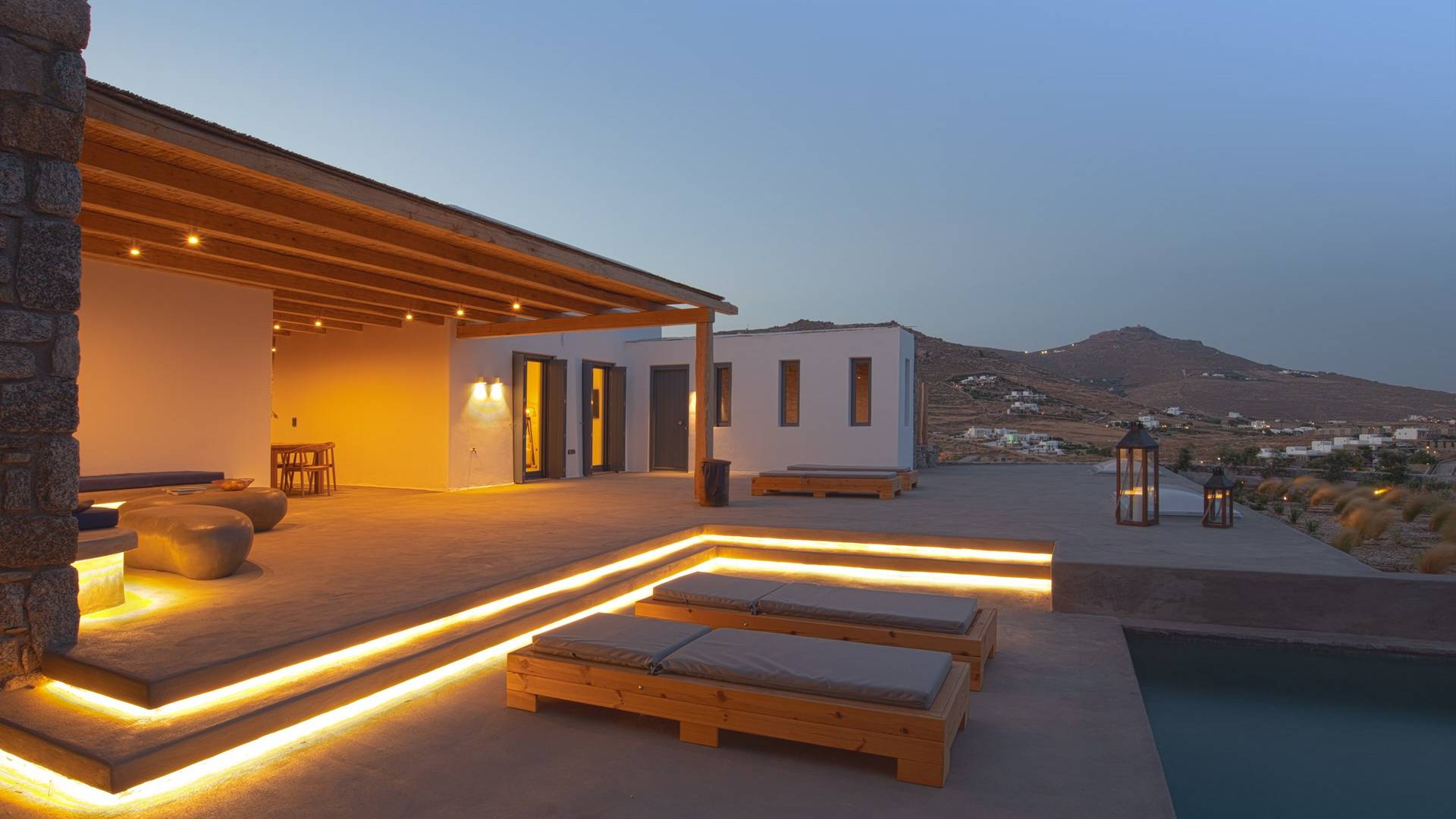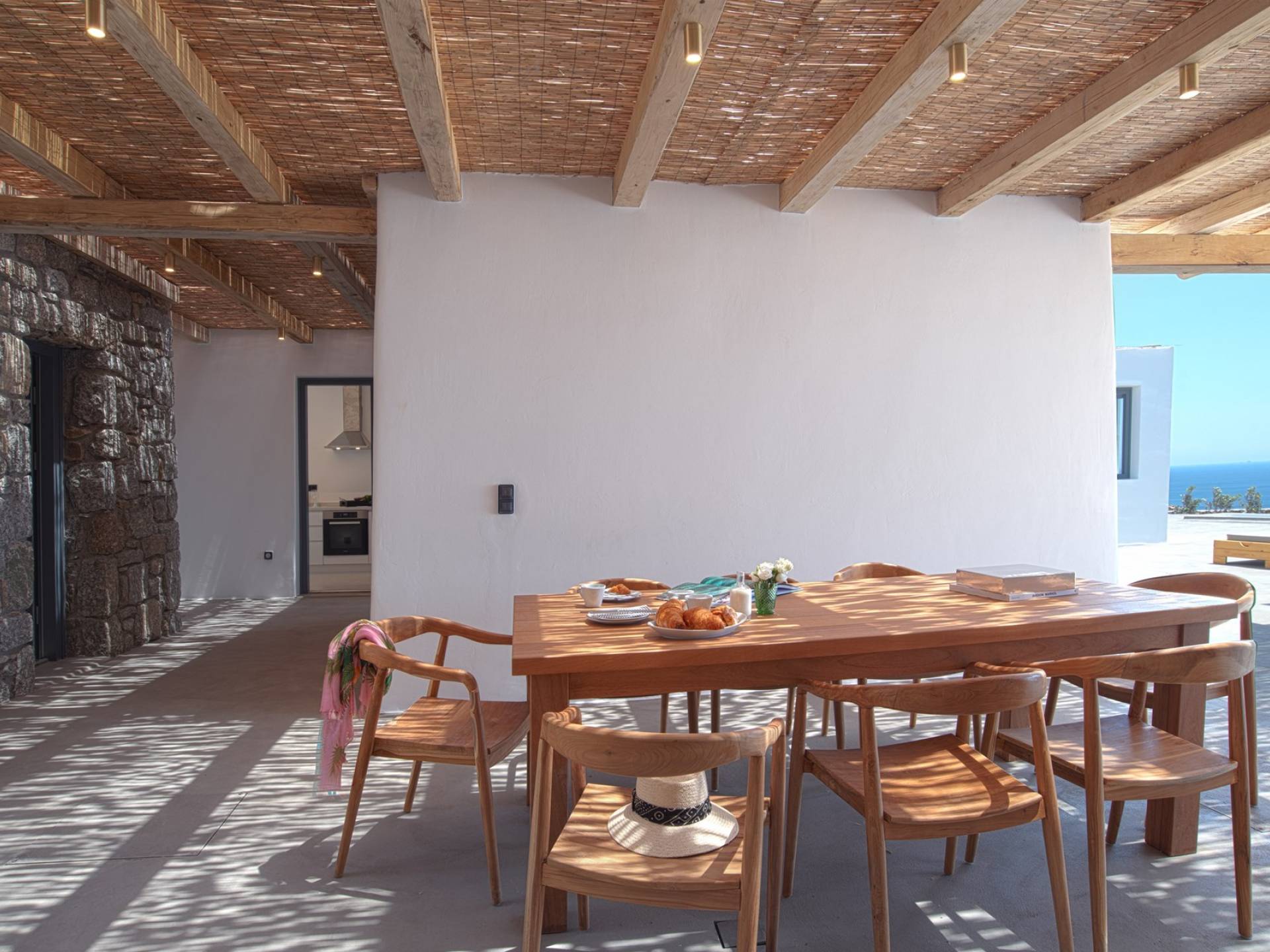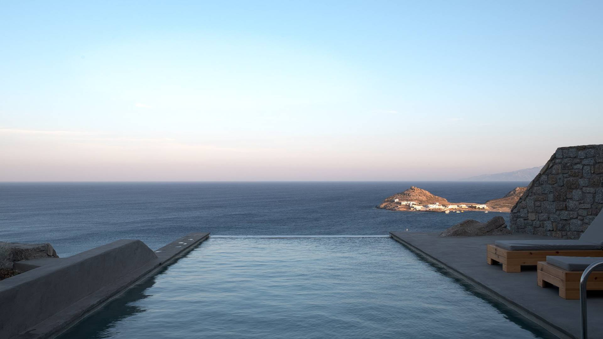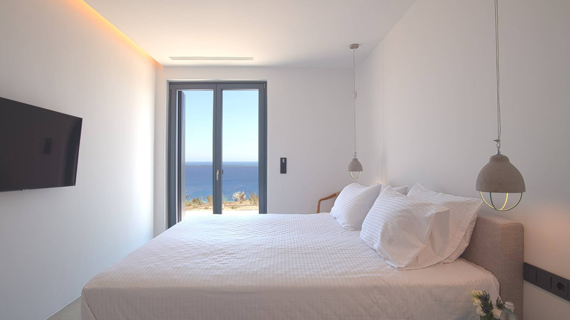 Das strahlend weiße Äußere des Wohnhauses ist teilweise mit Stein verkleidet, sodass es so aussieht, als wäre es aus seiner Umgebung herausgewachsen. Ständig vernarrt in die herrliche Aussicht auf die Ägäis, stattete der Architekt die Terrasse mit bequemen Lounge-/Essplätzen, einer Open-Air-Küche und einem wunderschönen Infinity-Pool aus, die alle auf eine Meereslandschaft ausgerichtet sind, die sich im Laufe des Tages ständig verändert.