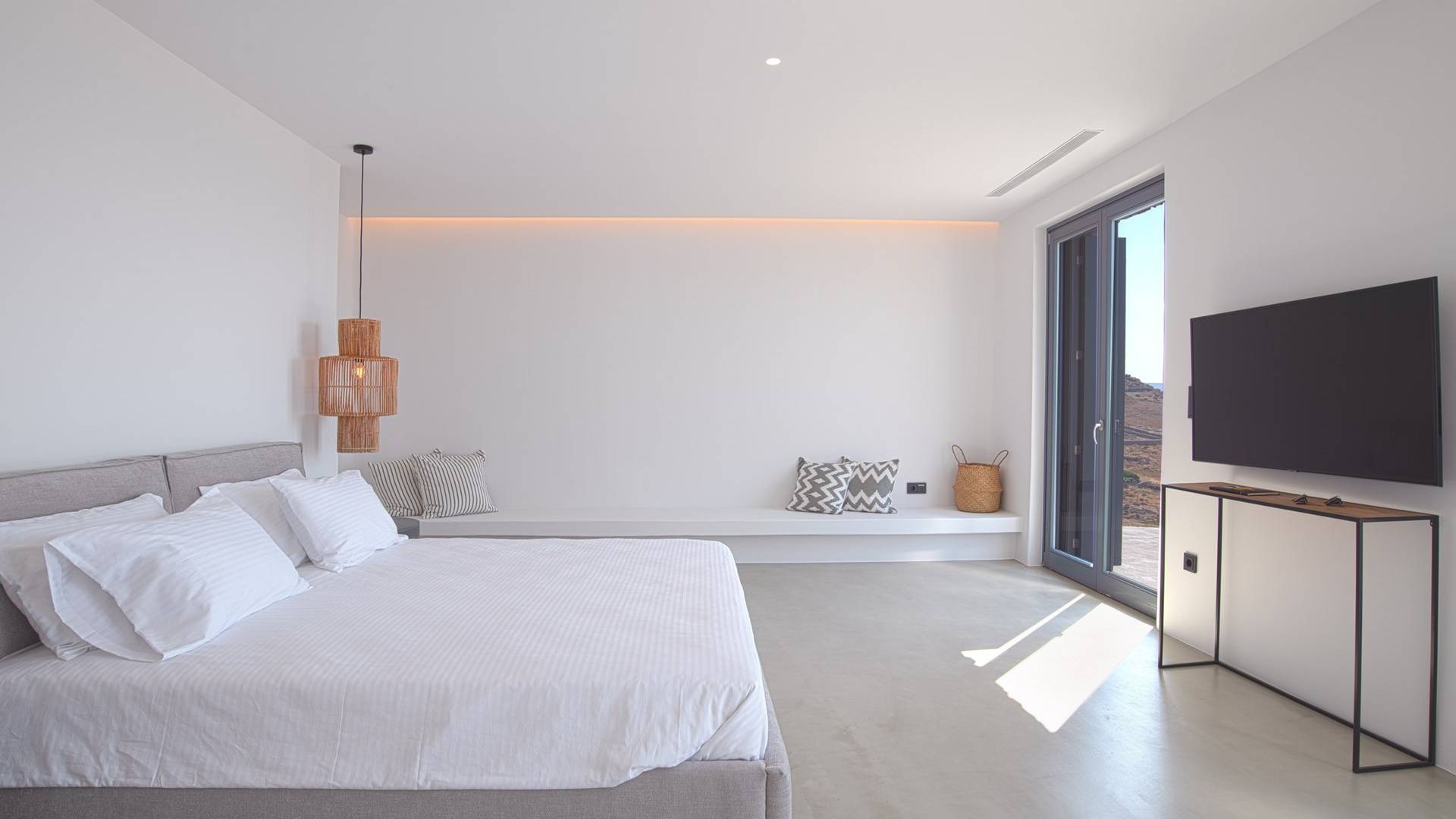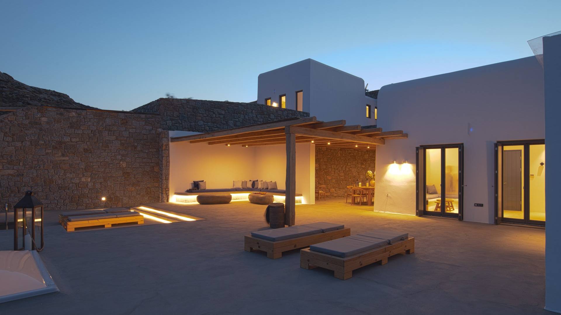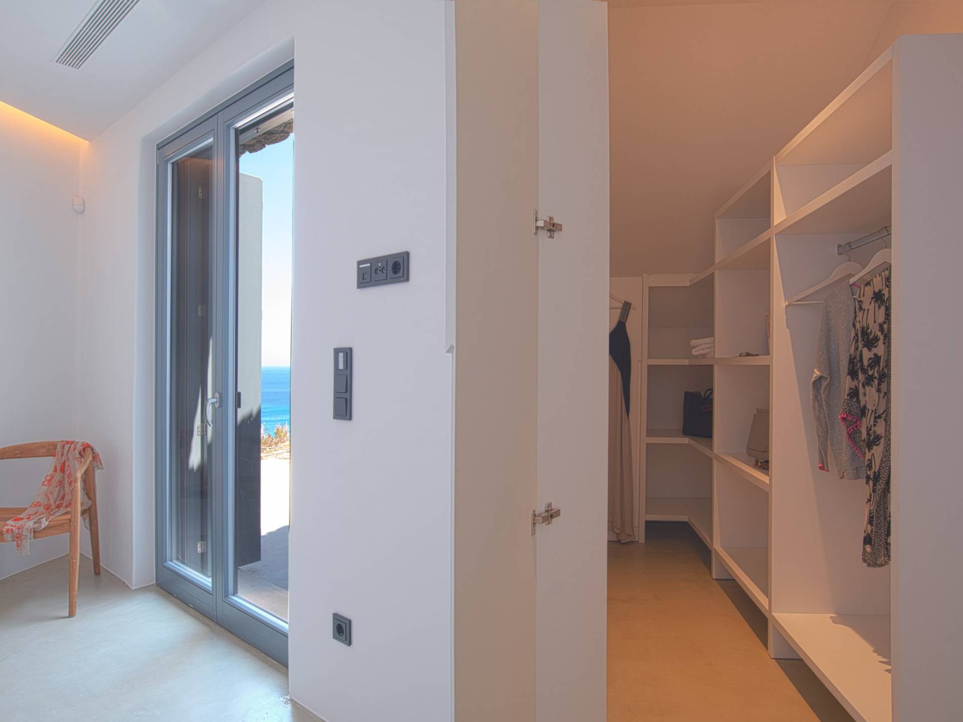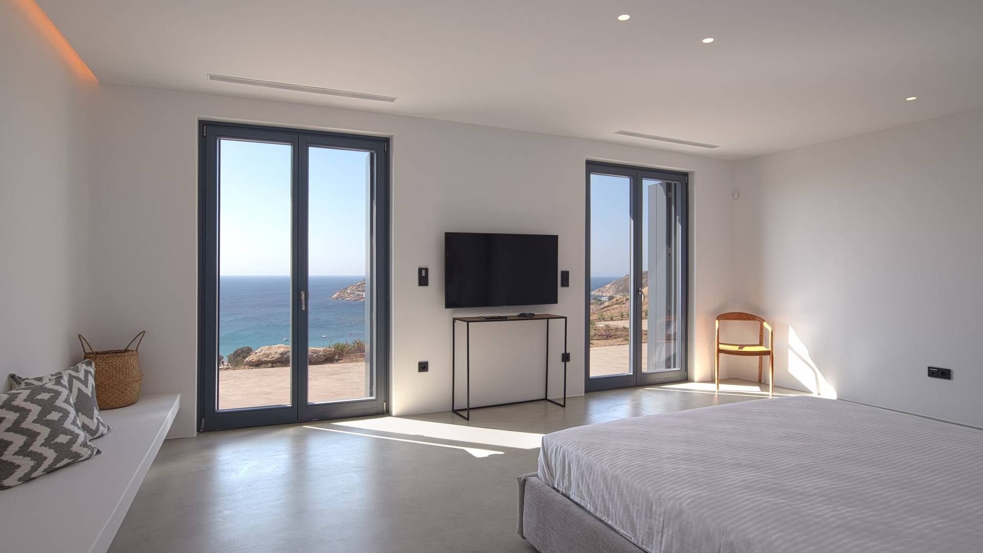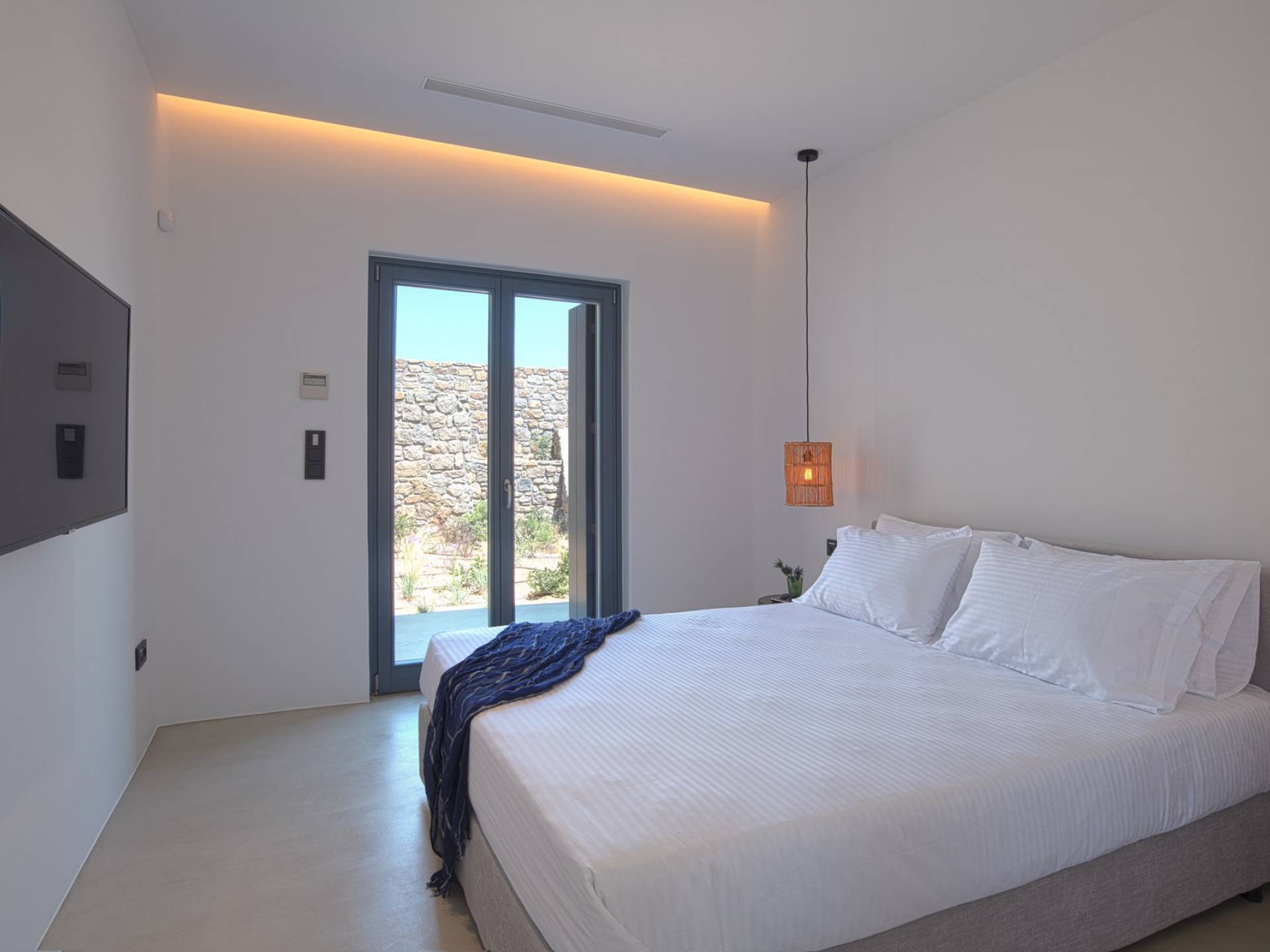 Das strahlend weiße Äußere des Wohnhauses ist teilweise mit Stein verkleidet, sodass es so aussieht, als wäre es aus seiner Umgebung herausgewachsen. Ständig vernarrt in die herrliche Aussicht auf die Ägäis, stattete der Architekt die Terrasse mit bequemen Lounge-/Essplätzen, einer Open-Air-Küche und einem wunderschönen Infinity-Pool aus, die alle auf eine Meereslandschaft ausgerichtet sind, die sich im Laufe des Tages ständig verändert.