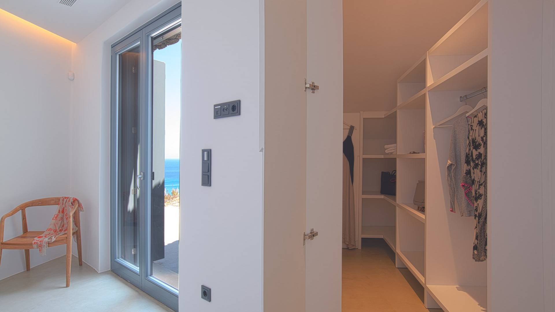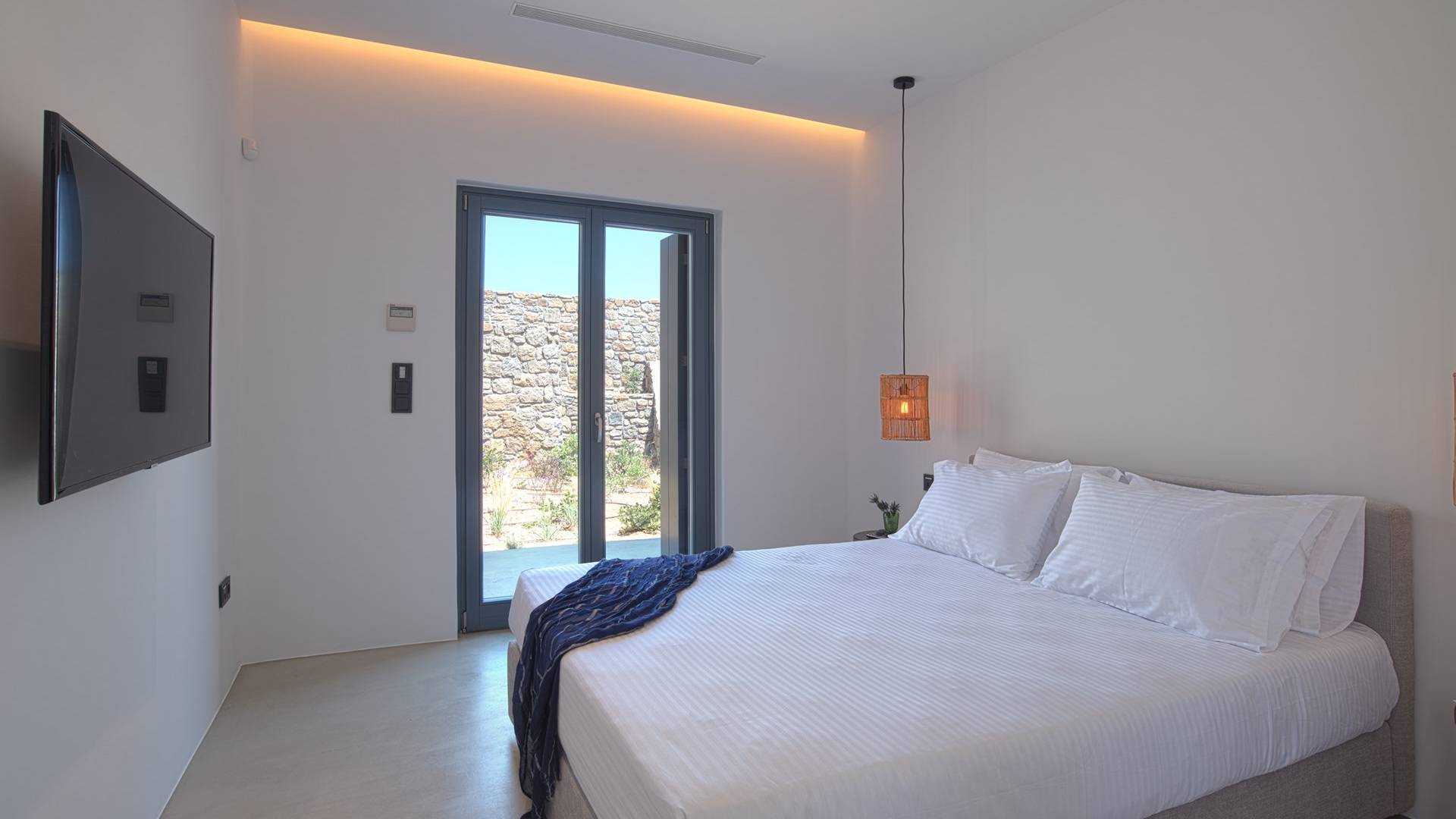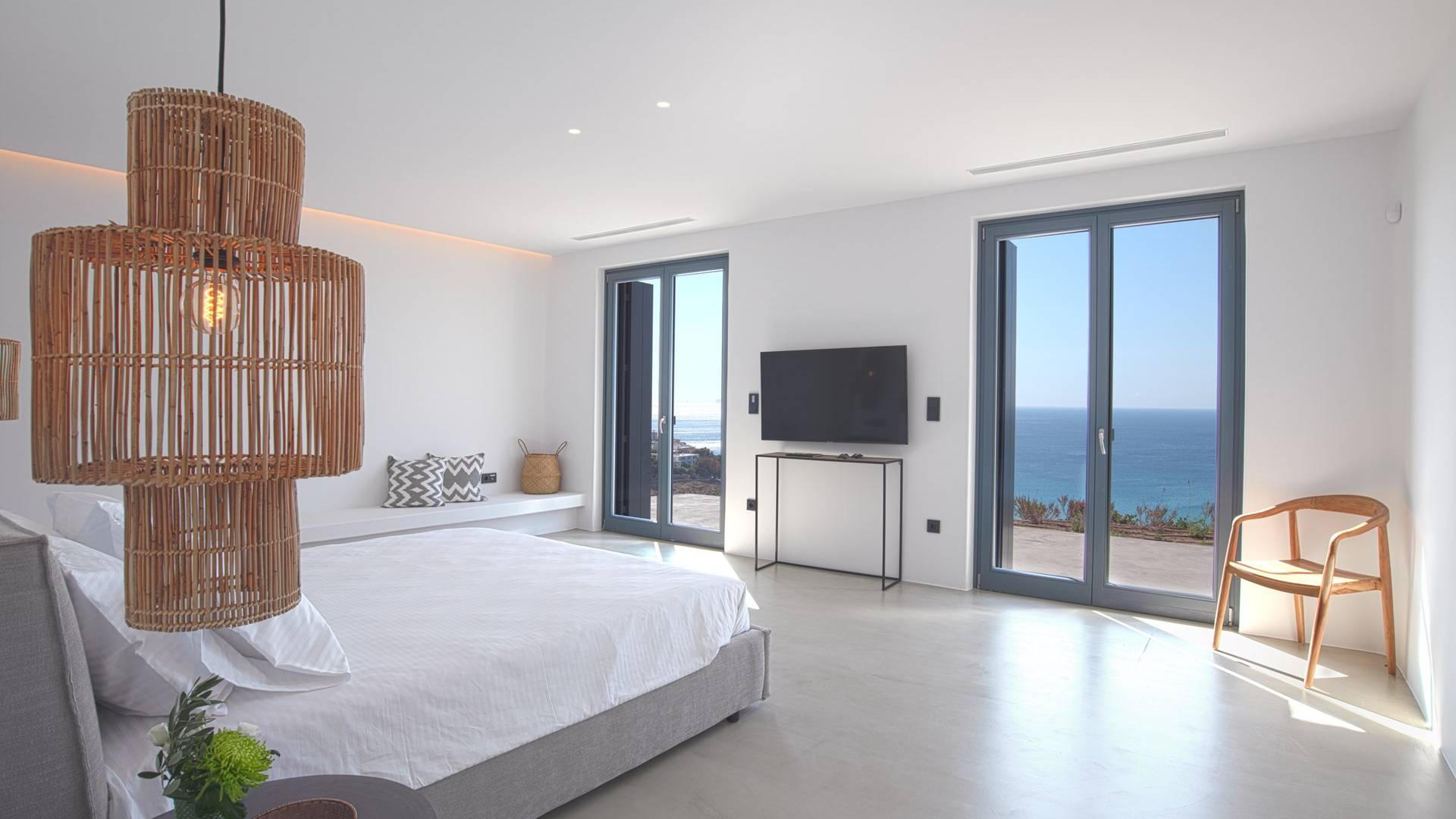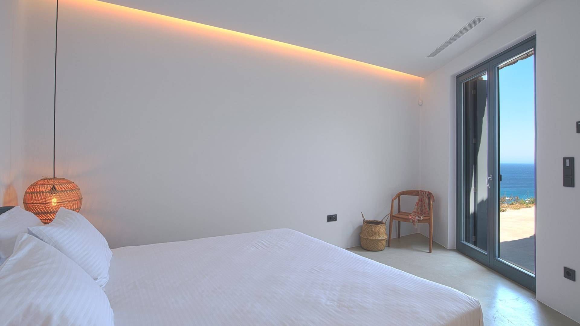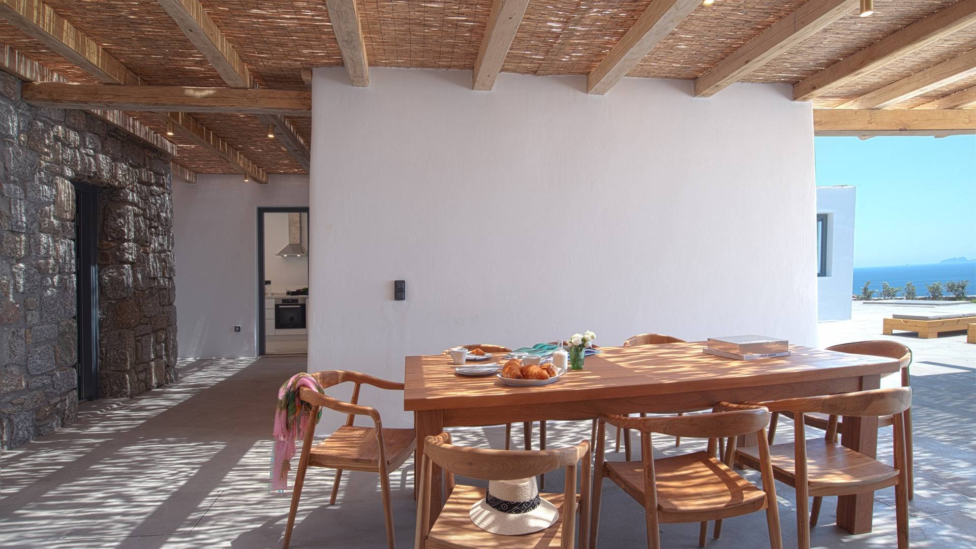 Das strahlend weiße Äußere des Wohnhauses ist teilweise mit Stein verkleidet, sodass es so aussieht, als wäre es aus seiner Umgebung herausgewachsen. Ständig vernarrt in die herrliche Aussicht auf die Ägäis, stattete der Architekt die Terrasse mit bequemen Lounge-/Essplätzen, einer Open-Air-Küche und einem wunderschönen Infinity-Pool aus, die alle auf eine Meereslandschaft ausgerichtet sind, die sich im Laufe des Tages ständig verändert.