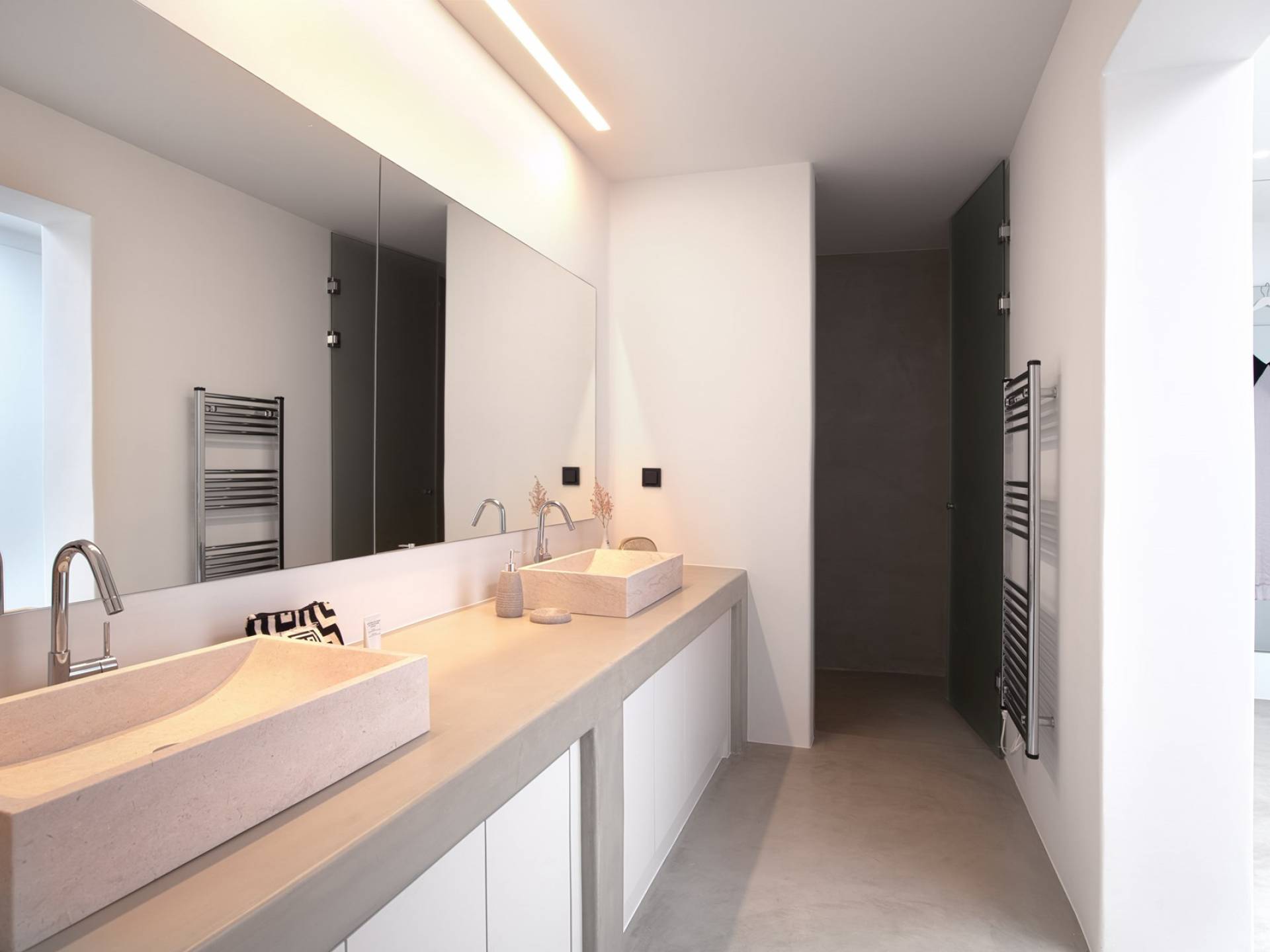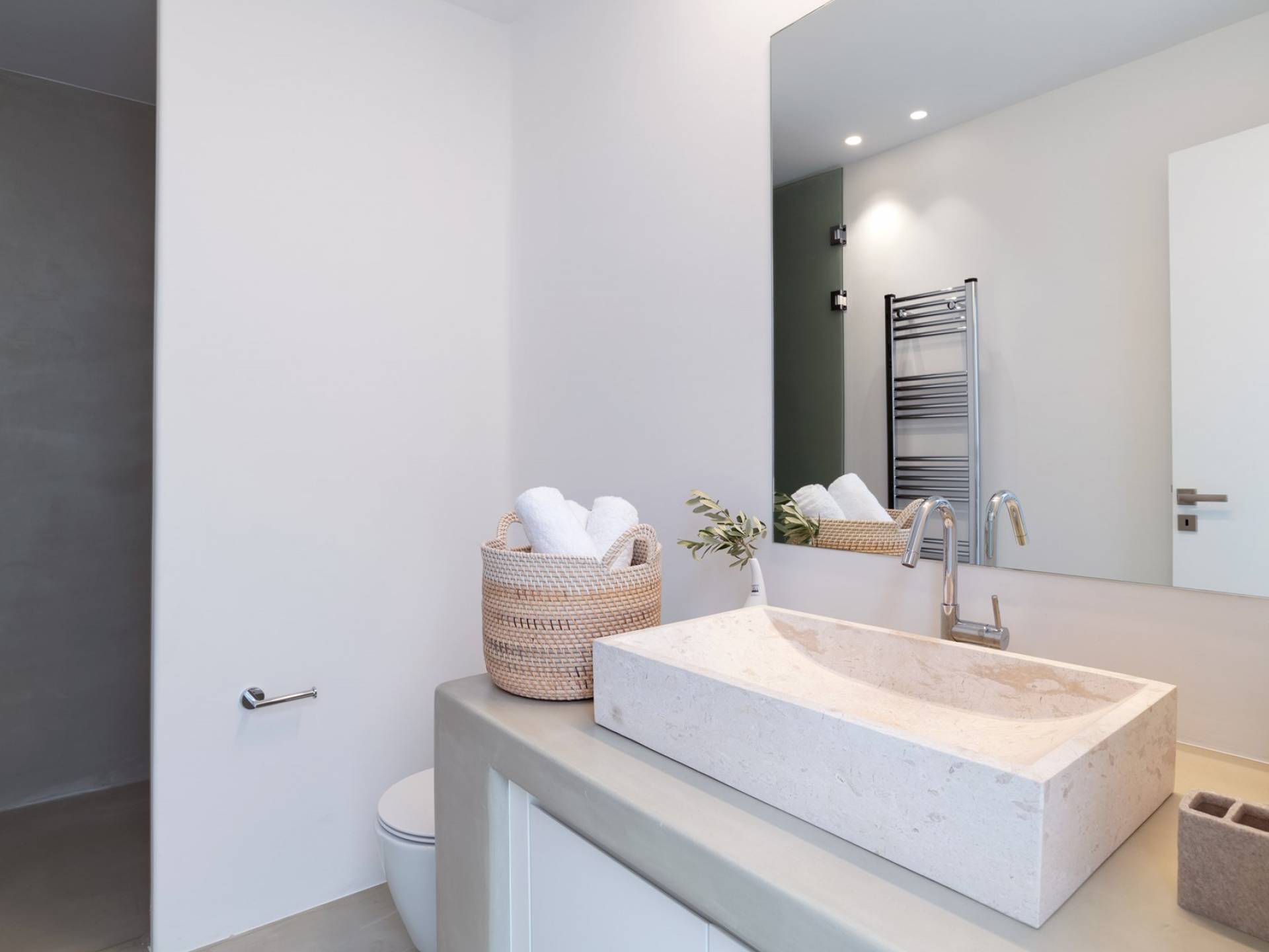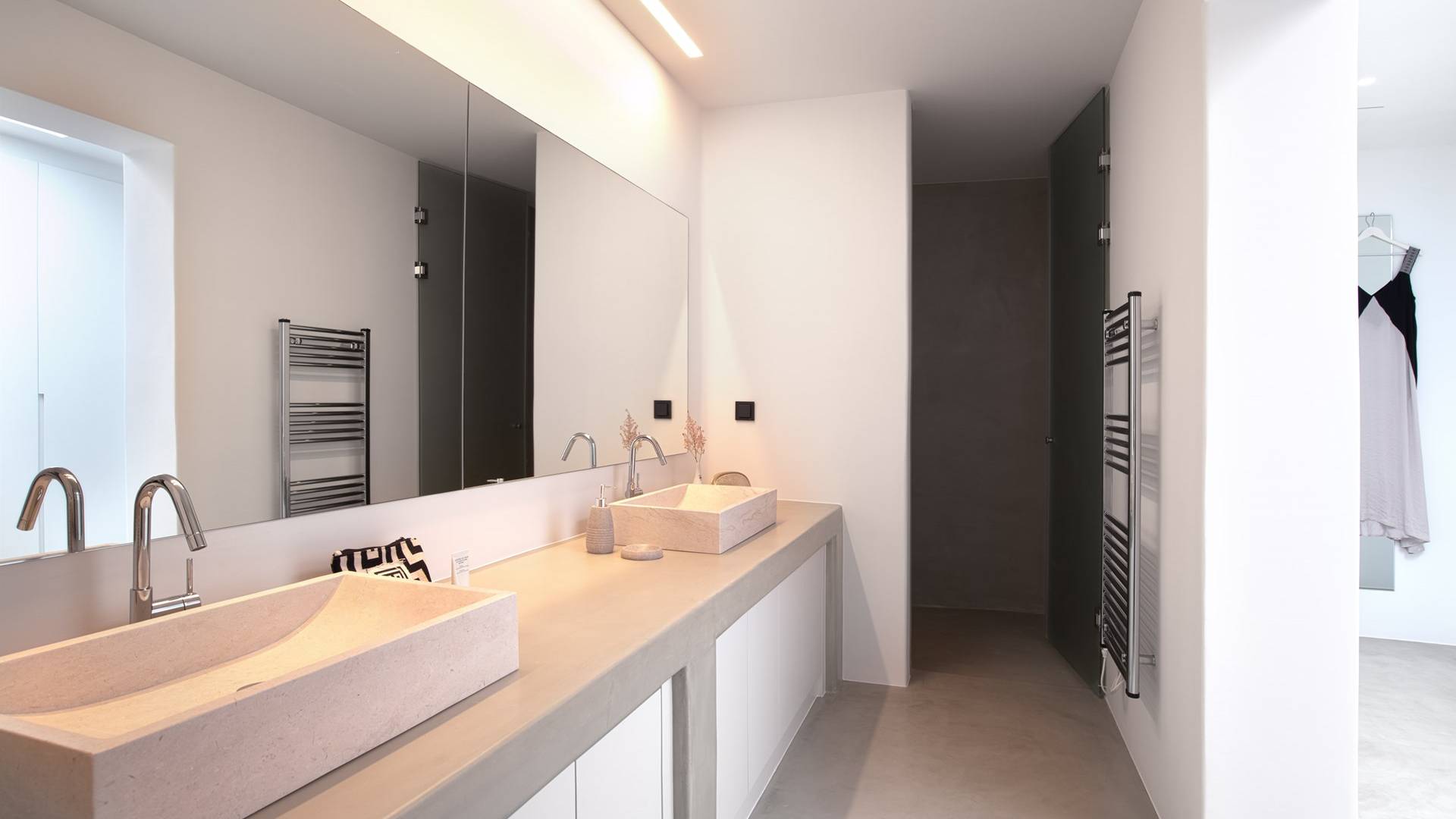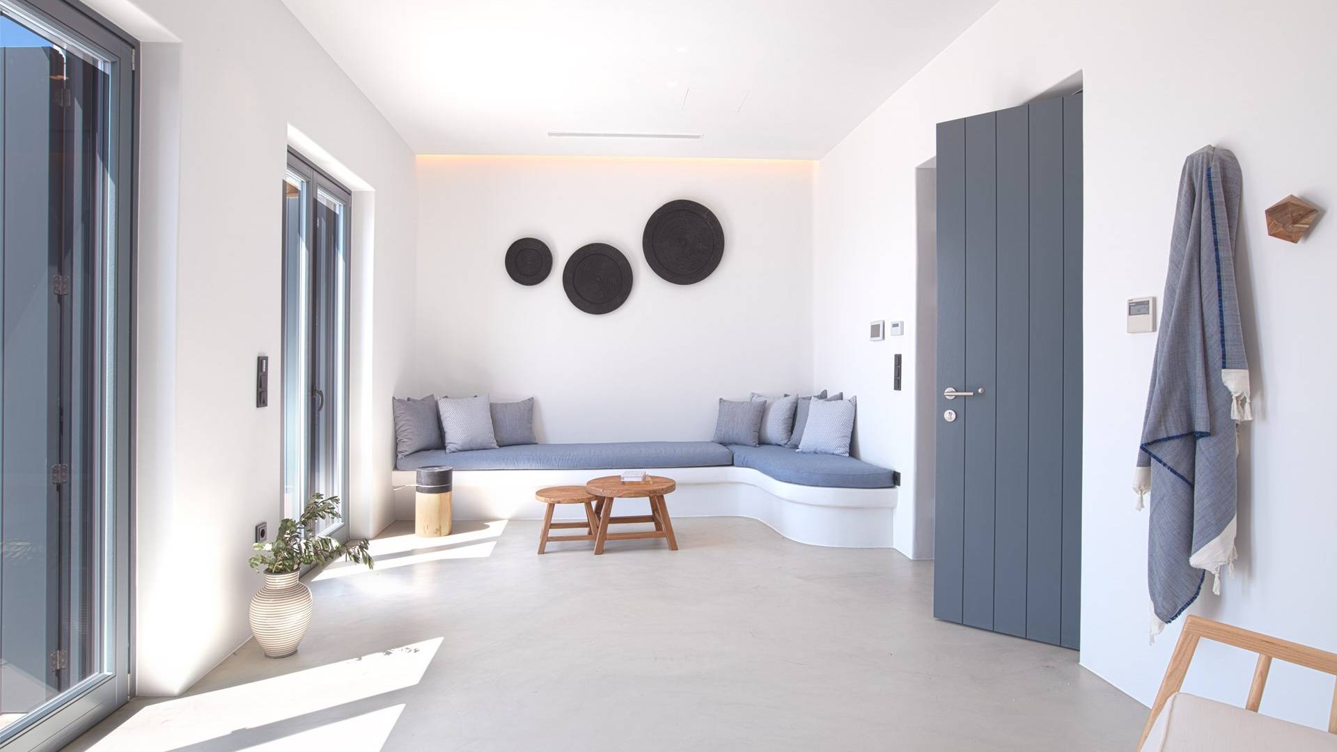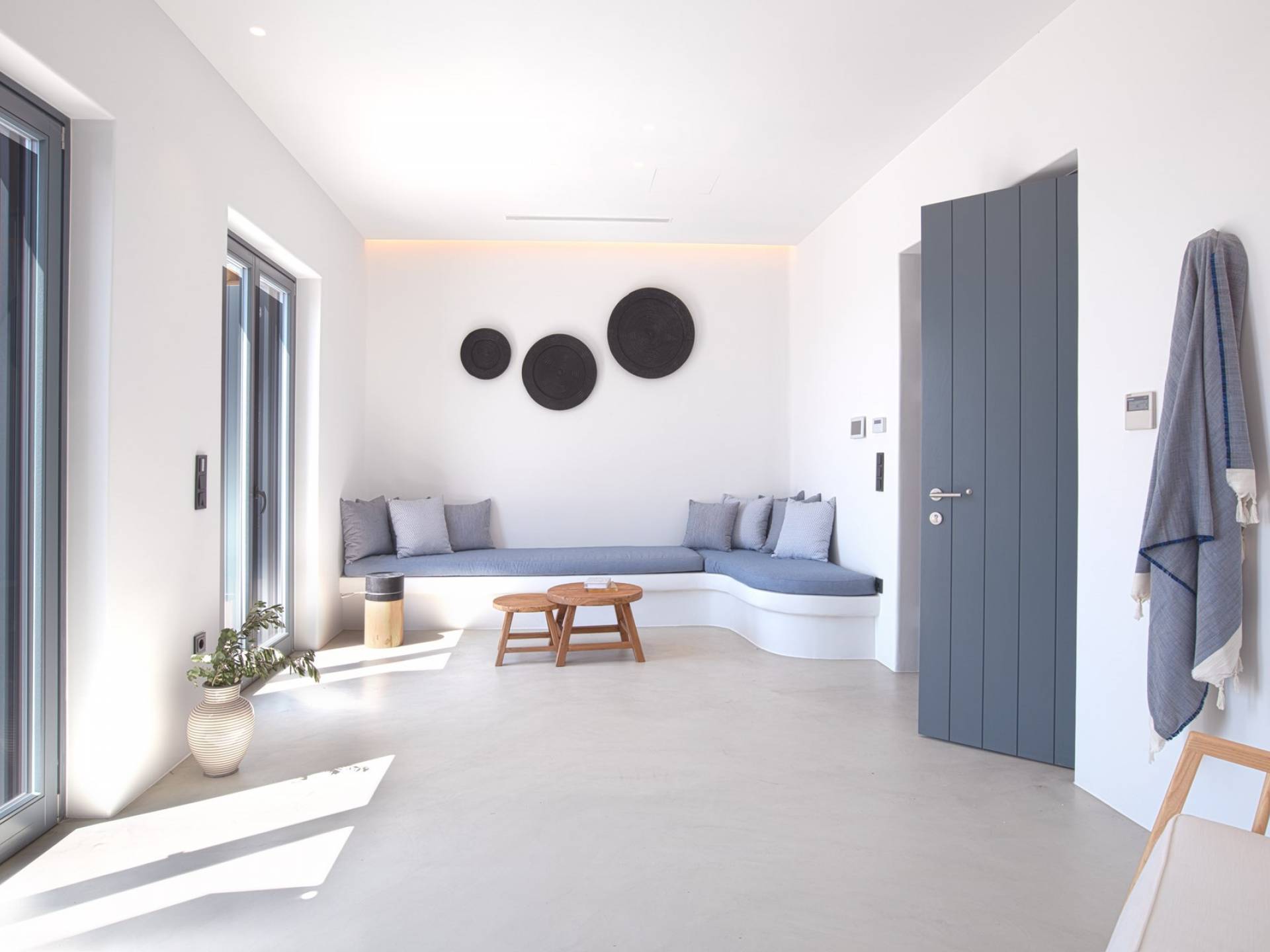 Unter dem traditionellen Äußeren befinden sich zeitgemäße Wohnbereiche, die sorgfältig gestaltet wurden, um gleichzeitig ein Gefühl von Raffinesse und Entspannung zu vermitteln. Minimal zu einem Fehler, die Innenräume verfügen über Betonböden und eine einheitliche weiße Palette, die durch diskrete Details in Schwarz und Blau ergänzt wird. Ein paar Details aus Holz und Korbgeflecht knüpfen an die natürliche Umgebung des Hauses an. Es gibt hier einen bewussten Verzicht auf Ornamente, der einem doppelten Zweck dient: um die Tatsache anzuerkennen, dass die Landschaft der einzige Protagonist in dieser Szene ist, und um ein Gefühl absoluter Ruhe ohne unnötige Ablenkungen zu erzeugen. Rund um das Haus werden Fenster und Glastüren verwendet, um den Innenraum mit den Terrassen zu verbinden und unterschiedliche Ausblicke auf die Umgebung zu bieten. Das Haus besteht aus zwei Ebenen; Das Erdgeschoss verfügt über ein lichtdurchflutetes Wohnzimmer, eine voll ausgestattete Küche, ein Schlafzimmer mit separatem Eingang und ein Badezimmer, während sich die anderen drei Schlafzimmer und vier Badezimmer auf der unteren Ebene befinden.