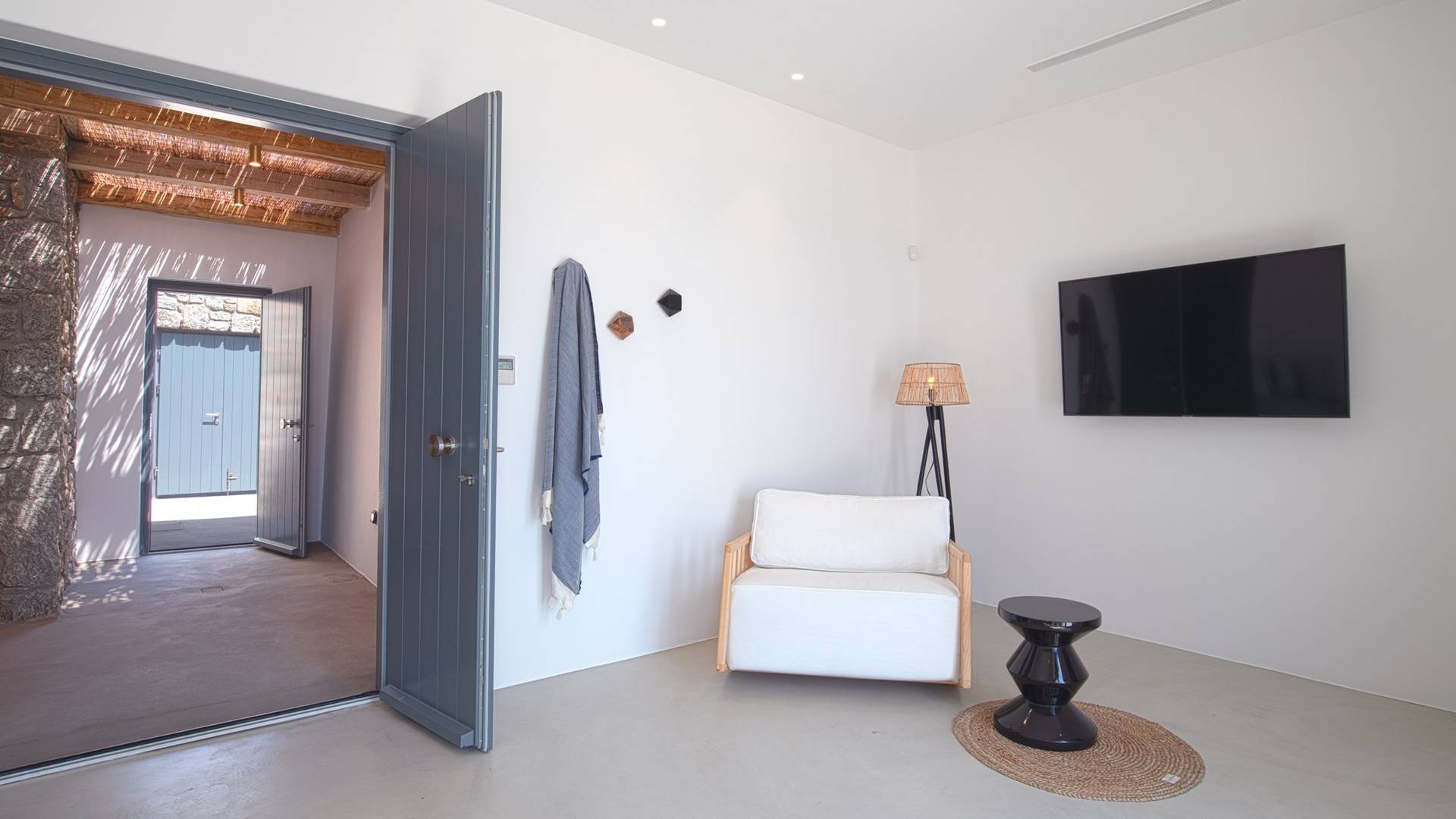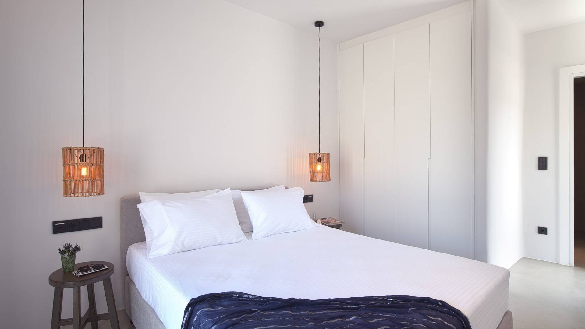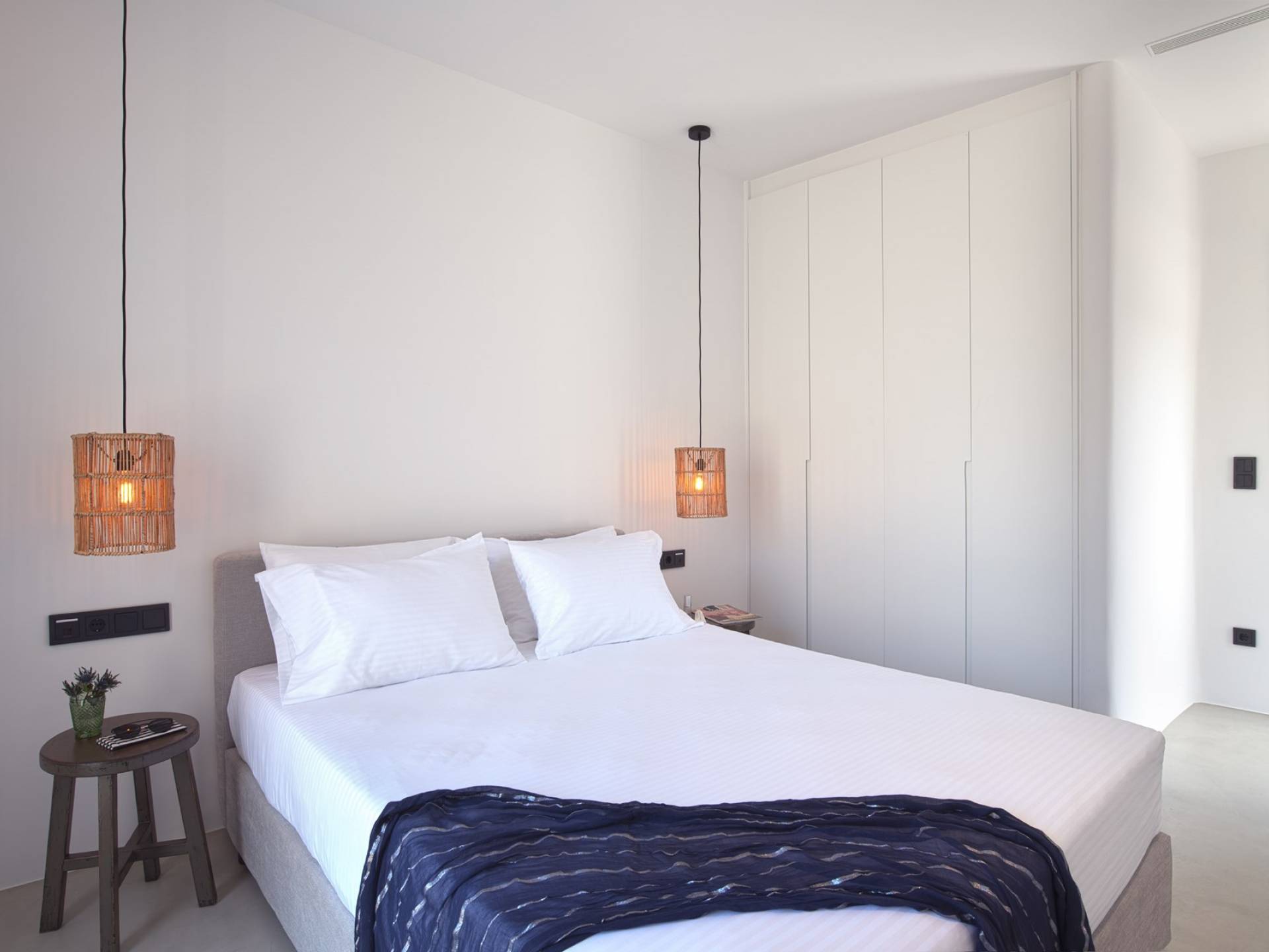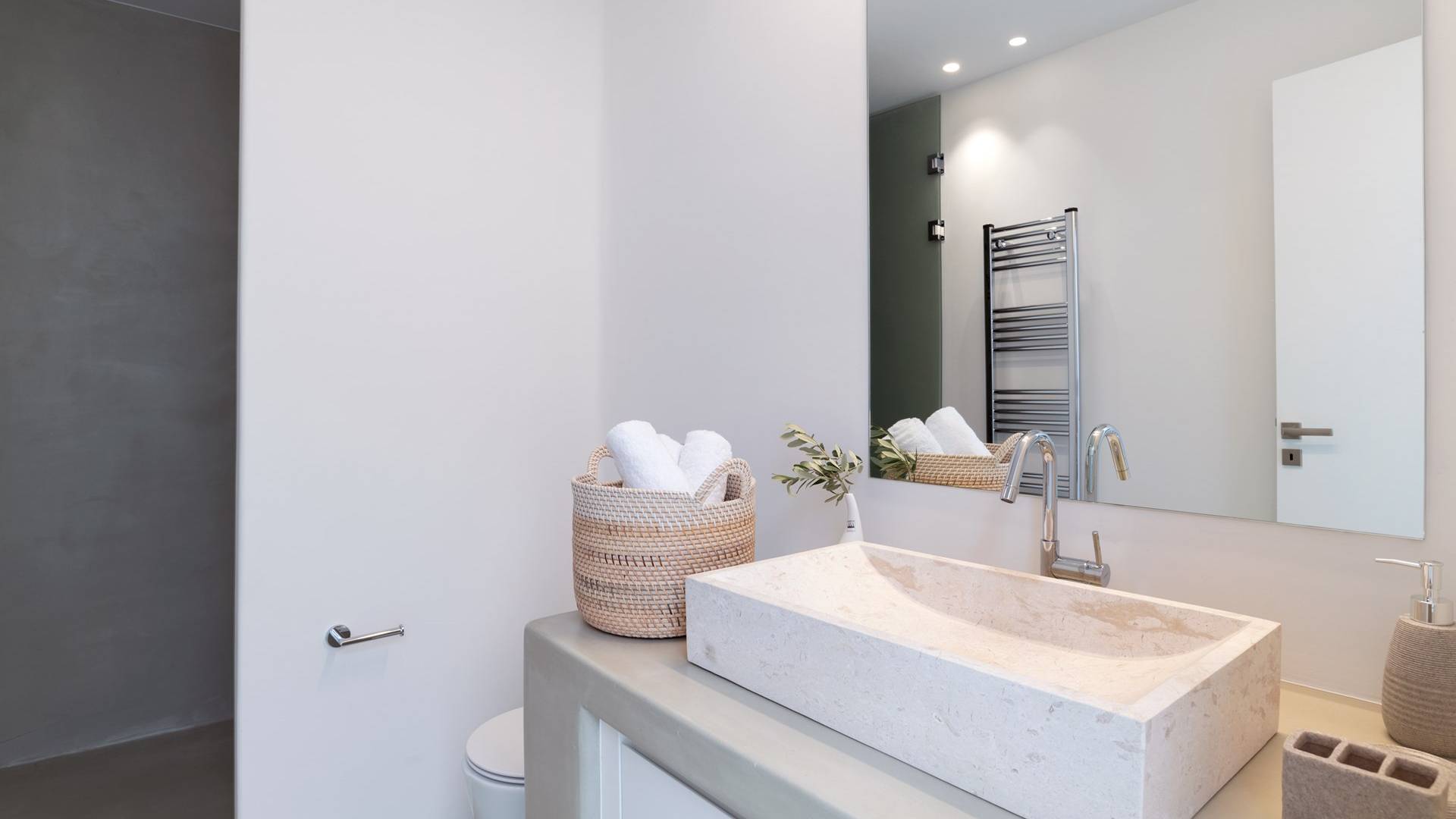 Unter dem traditionellen Äußeren befinden sich zeitgemäße Wohnbereiche, die sorgfältig gestaltet wurden, um gleichzeitig ein Gefühl von Raffinesse und Entspannung zu vermitteln. Minimal zu einem Fehler, die Innenräume verfügen über Betonböden und eine einheitliche weiße Palette, die durch diskrete Details in Schwarz und Blau ergänzt wird. Ein paar Details aus Holz und Korbgeflecht knüpfen an die natürliche Umgebung des Hauses an. Es gibt hier einen bewussten Verzicht auf Ornamente, der einem doppelten Zweck dient: um die Tatsache anzuerkennen, dass die Landschaft der einzige Protagonist in dieser Szene ist, und um ein Gefühl absoluter Ruhe ohne unnötige Ablenkungen zu erzeugen. Rund um das Haus werden Fenster und Glastüren verwendet, um den Innenraum mit den Terrassen zu verbinden und unterschiedliche Ausblicke auf die Umgebung zu bieten. Das Haus besteht aus zwei Ebenen; Das Erdgeschoss verfügt über ein lichtdurchflutetes Wohnzimmer, eine voll ausgestattete Küche, ein Schlafzimmer mit separatem Eingang und ein Badezimmer, während sich die anderen drei Schlafzimmer und vier Badezimmer auf der unteren Ebene befinden.