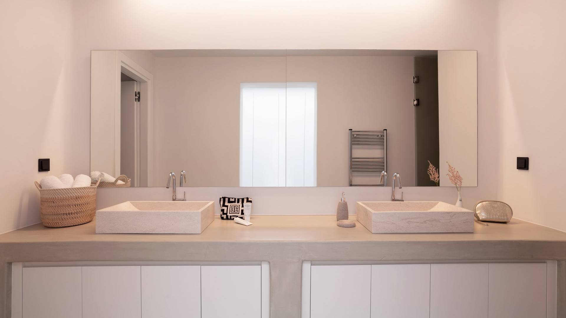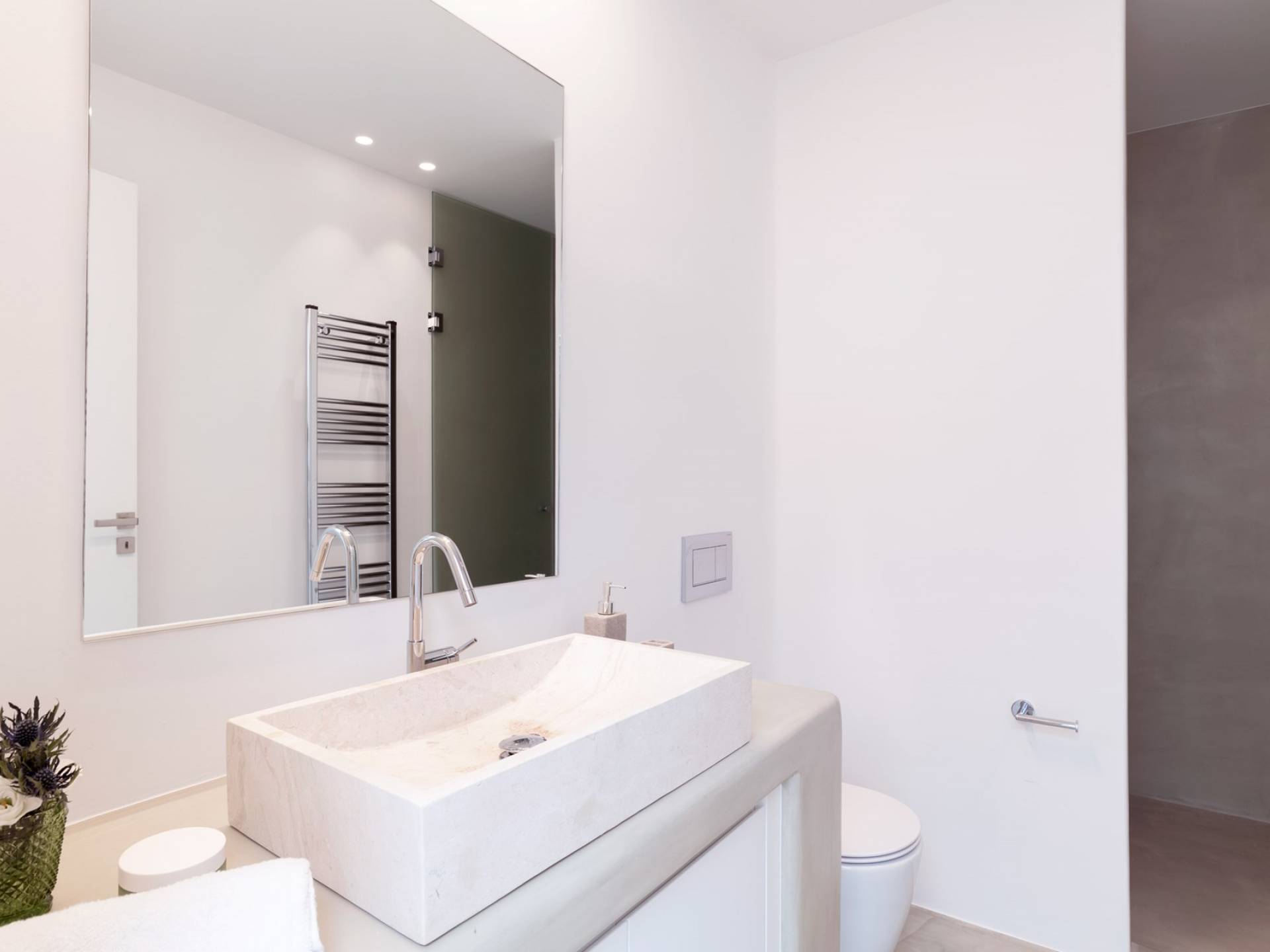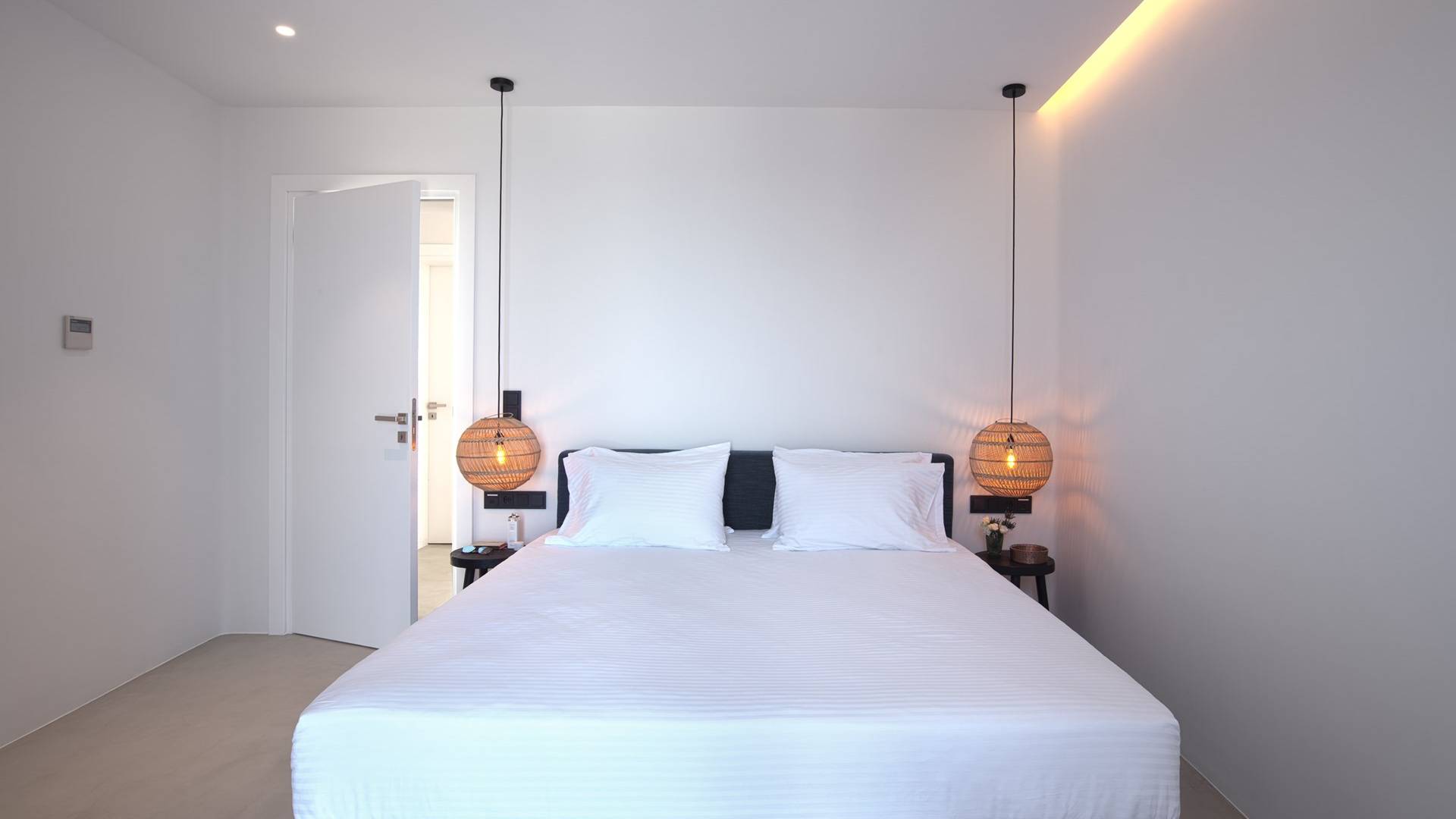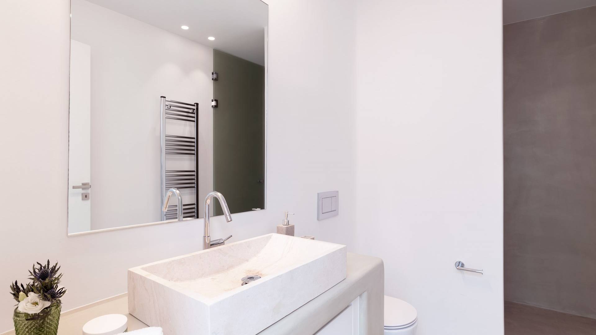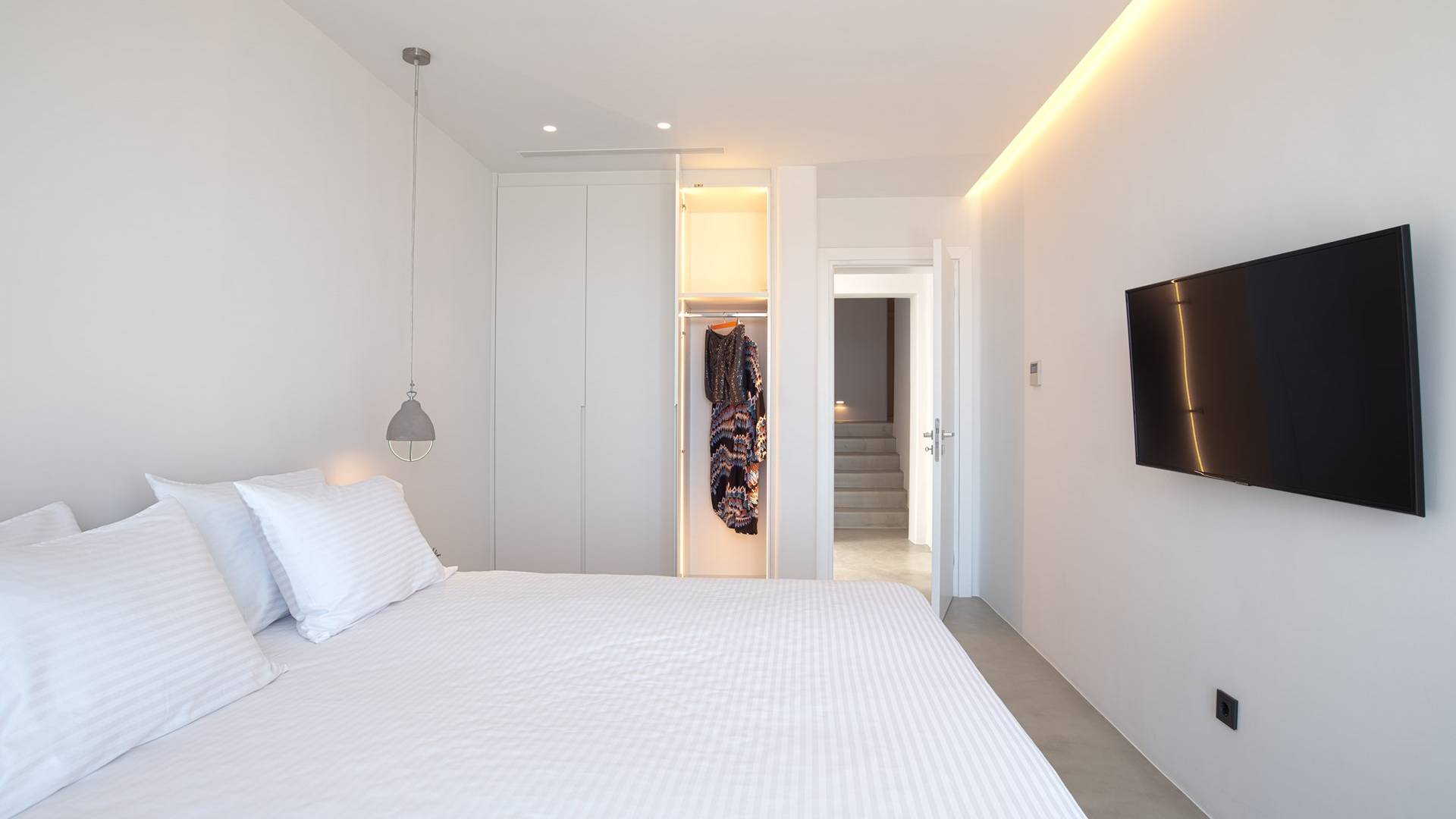 Unter dem traditionellen Äußeren befinden sich zeitgemäße Wohnbereiche, die sorgfältig gestaltet wurden, um gleichzeitig ein Gefühl von Raffinesse und Entspannung zu vermitteln. Minimal zu einem Fehler, die Innenräume verfügen über Betonböden und eine einheitliche weiße Palette, die durch diskrete Details in Schwarz und Blau ergänzt wird. Ein paar Details aus Holz und Korbgeflecht knüpfen an die natürliche Umgebung des Hauses an. Es gibt hier einen bewussten Verzicht auf Ornamente, der einem doppelten Zweck dient: um die Tatsache anzuerkennen, dass die Landschaft der einzige Protagonist in dieser Szene ist, und um ein Gefühl absoluter Ruhe ohne unnötige Ablenkungen zu erzeugen. Rund um das Haus werden Fenster und Glastüren verwendet, um den Innenraum mit den Terrassen zu verbinden und unterschiedliche Ausblicke auf die Umgebung zu bieten. Das Haus besteht aus zwei Ebenen; Das Erdgeschoss verfügt über ein lichtdurchflutetes Wohnzimmer, eine voll ausgestattete Küche, ein Schlafzimmer mit separatem Eingang und ein Badezimmer, während sich die anderen drei Schlafzimmer und vier Badezimmer auf der unteren Ebene befinden.