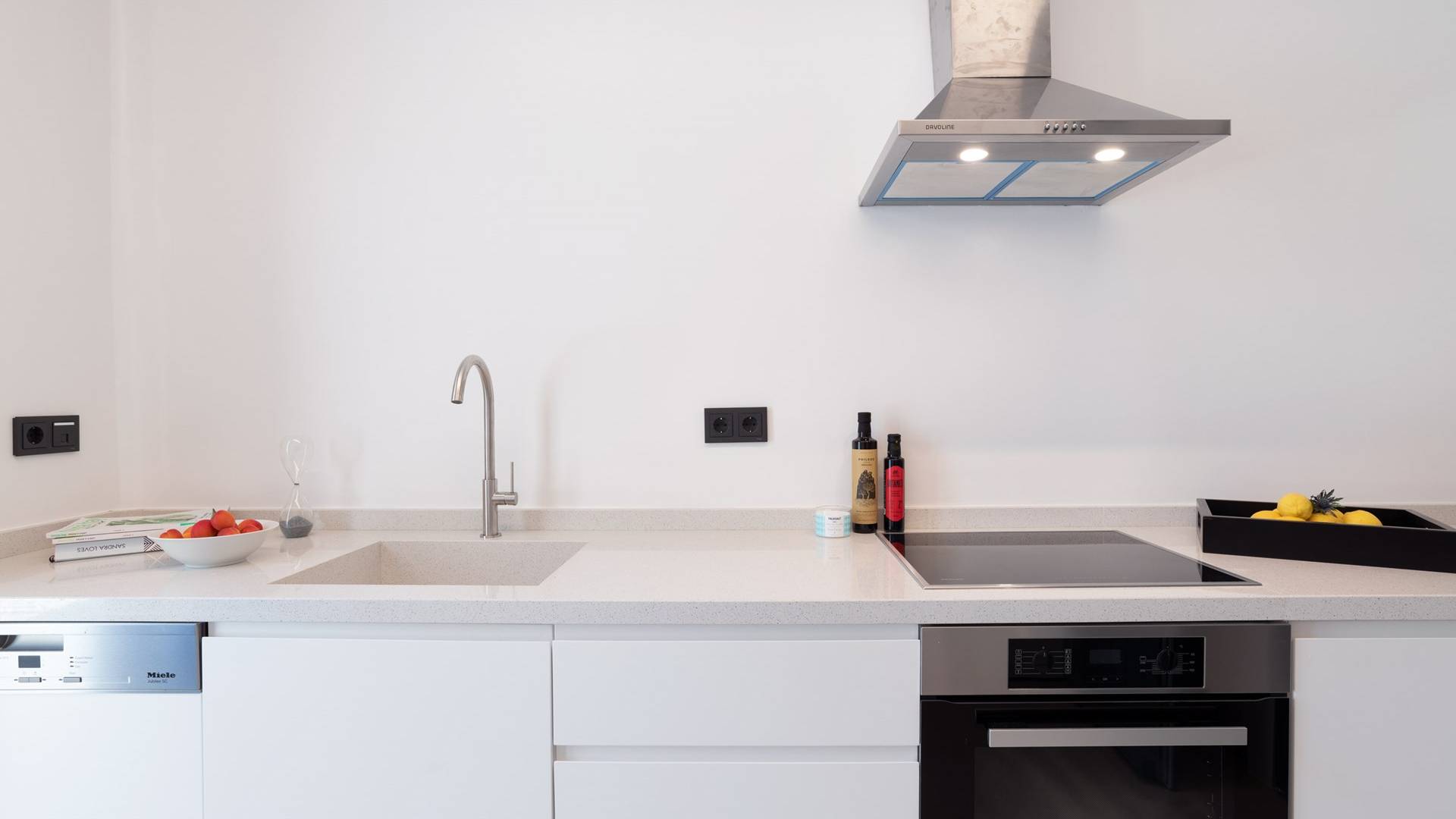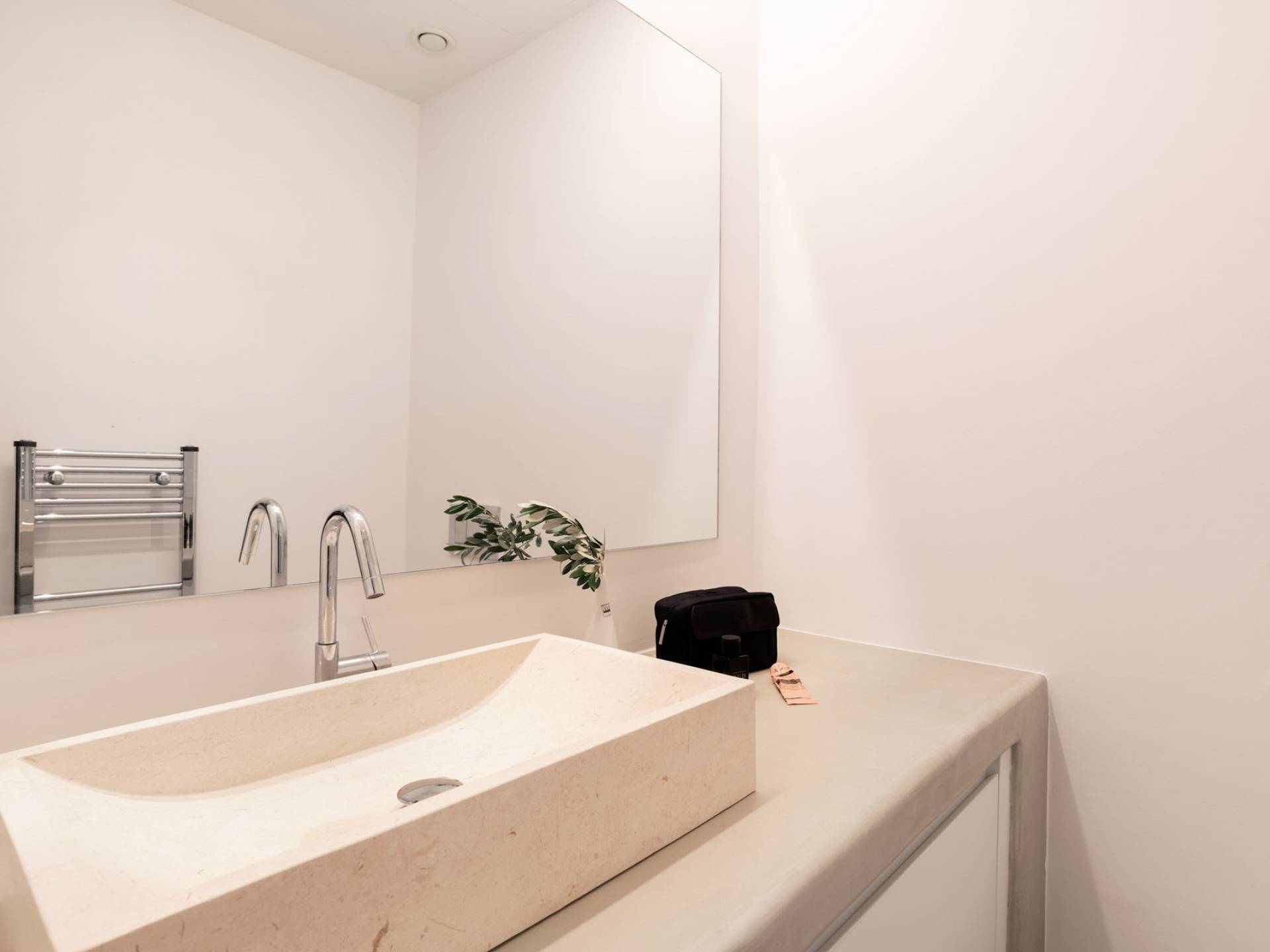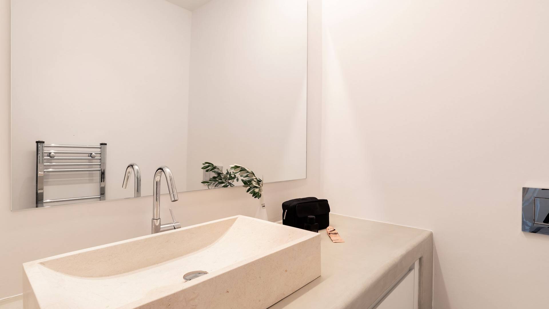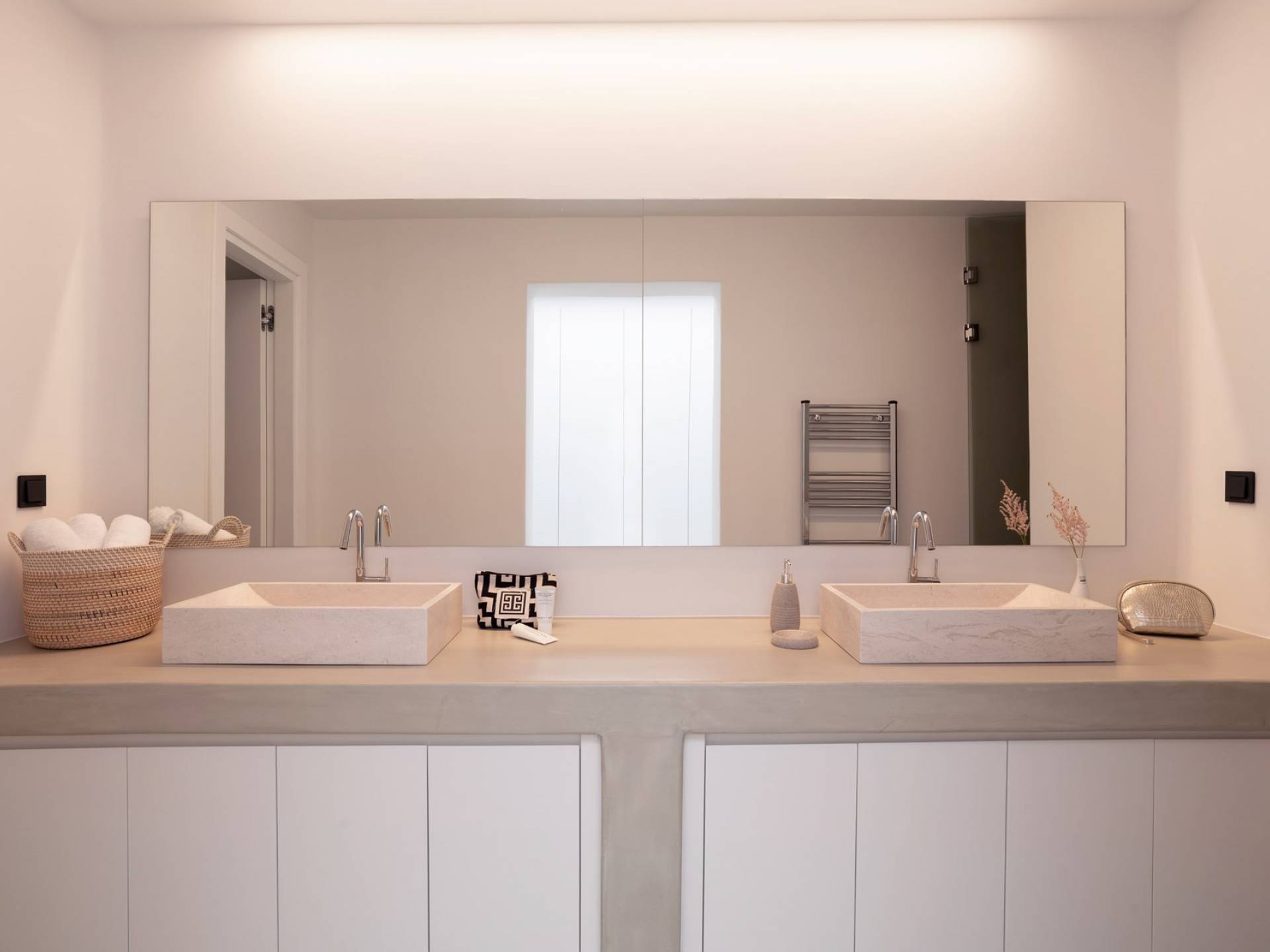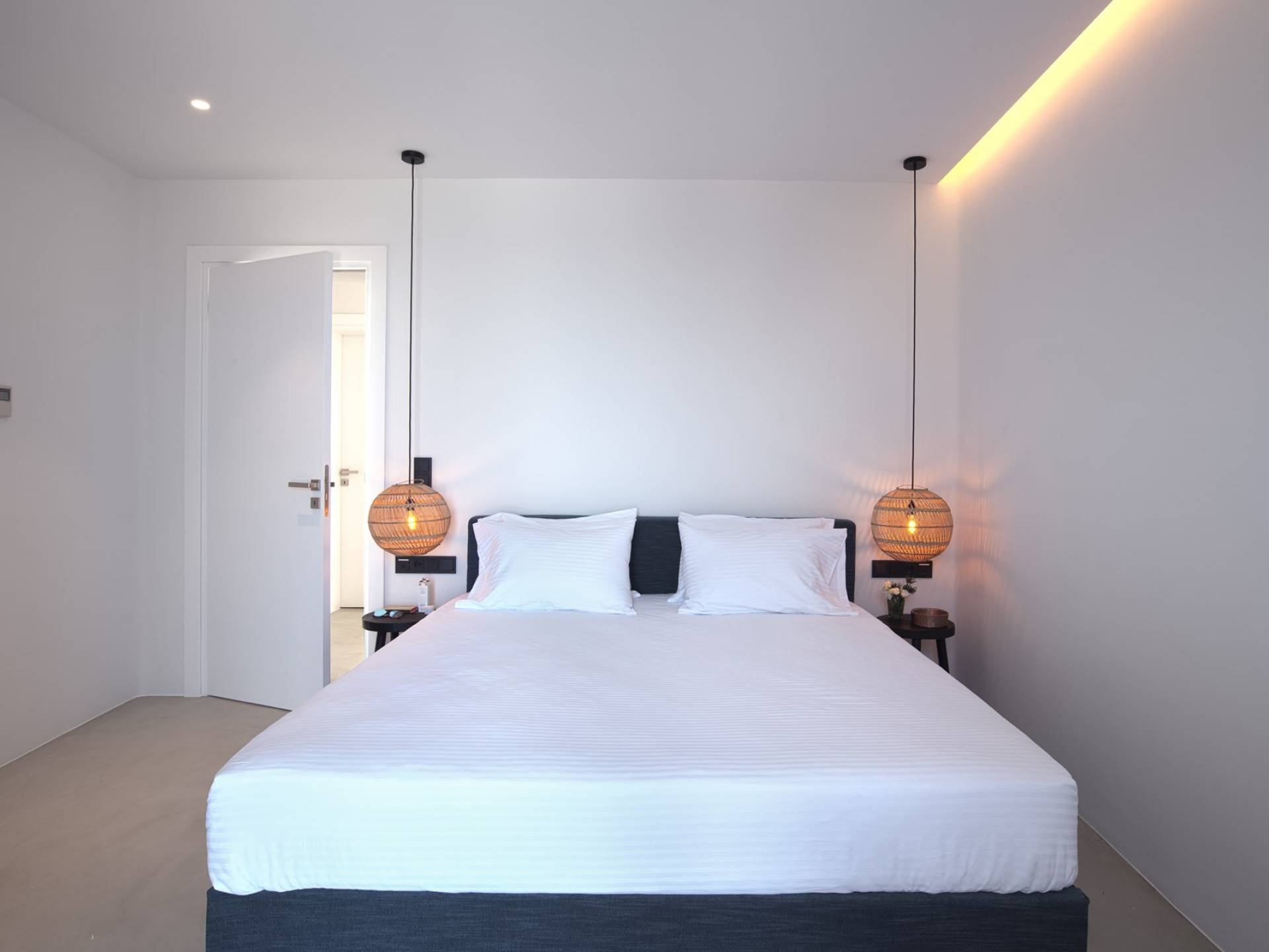 Unter dem traditionellen Äußeren befinden sich zeitgemäße Wohnbereiche, die sorgfältig gestaltet wurden, um gleichzeitig ein Gefühl von Raffinesse und Entspannung zu vermitteln. Minimal zu einem Fehler, die Innenräume verfügen über Betonböden und eine einheitliche weiße Palette, die durch diskrete Details in Schwarz und Blau ergänzt wird. Ein paar Details aus Holz und Korbgeflecht knüpfen an die natürliche Umgebung des Hauses an. Es gibt hier einen bewussten Verzicht auf Ornamente, der einem doppelten Zweck dient: um die Tatsache anzuerkennen, dass die Landschaft der einzige Protagonist in dieser Szene ist, und um ein Gefühl absoluter Ruhe ohne unnötige Ablenkungen zu erzeugen. Rund um das Haus werden Fenster und Glastüren verwendet, um den Innenraum mit den Terrassen zu verbinden und unterschiedliche Ausblicke auf die Umgebung zu bieten. Das Haus besteht aus zwei Ebenen; Das Erdgeschoss verfügt über ein lichtdurchflutetes Wohnzimmer, eine voll ausgestattete Küche, ein Schlafzimmer mit separatem Eingang und ein Badezimmer, während sich die anderen drei Schlafzimmer und vier Badezimmer auf der unteren Ebene befinden.