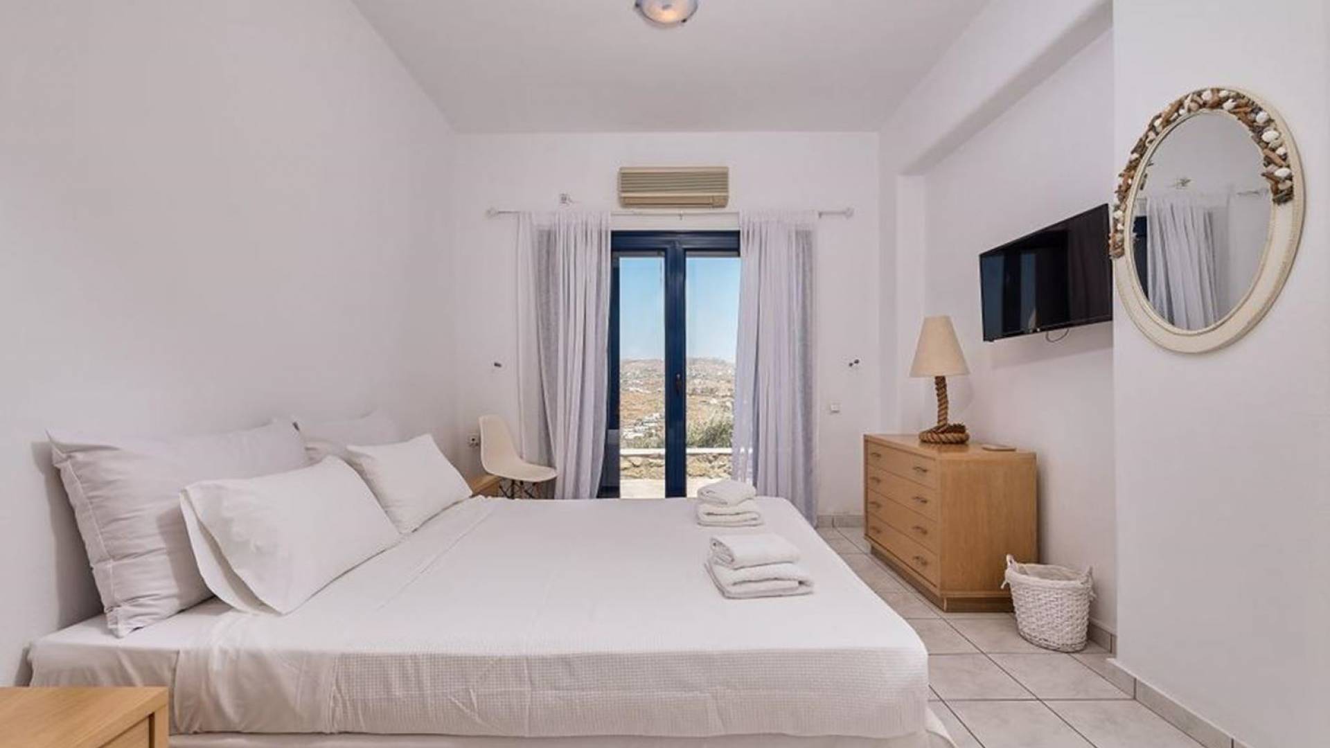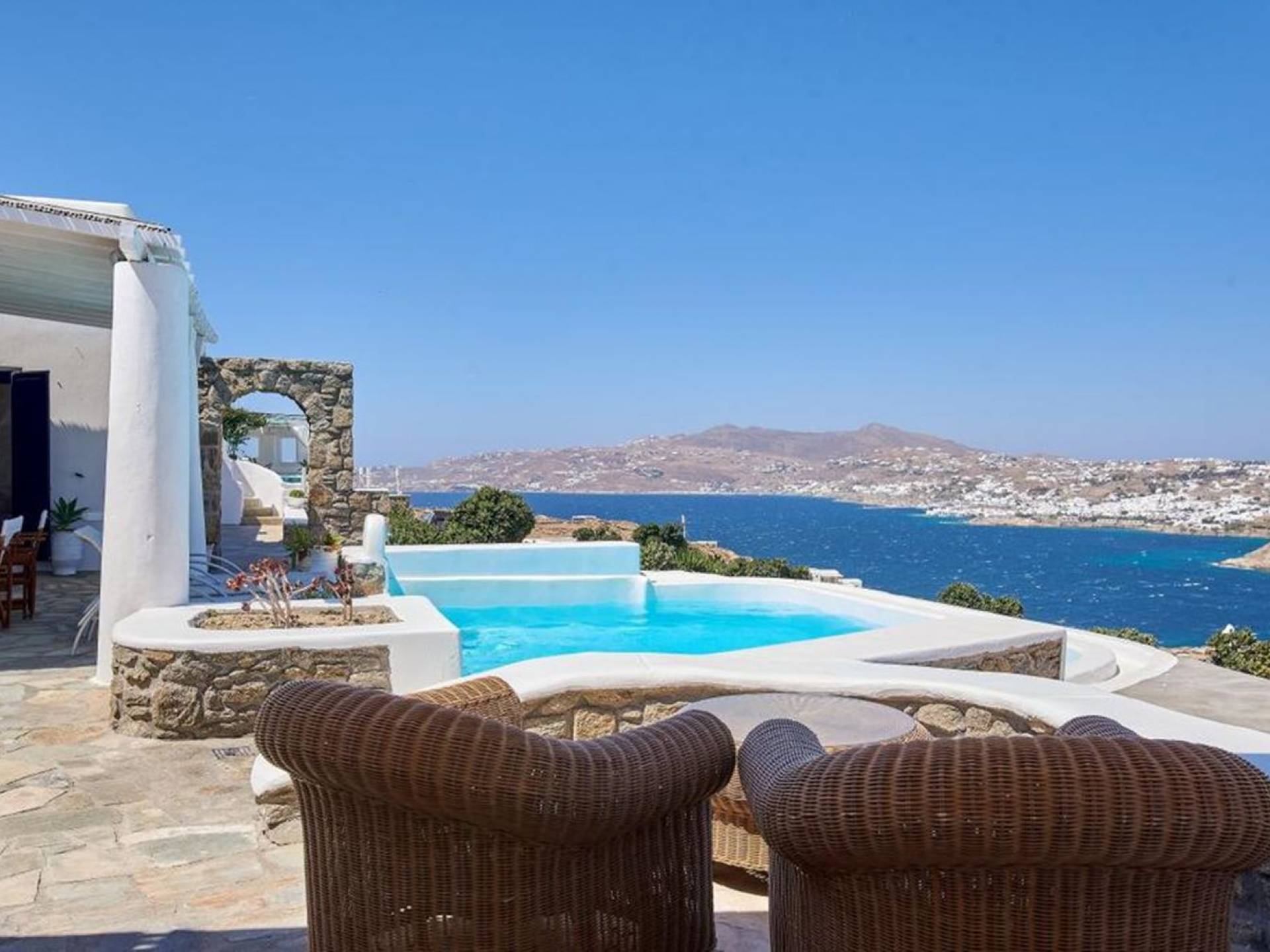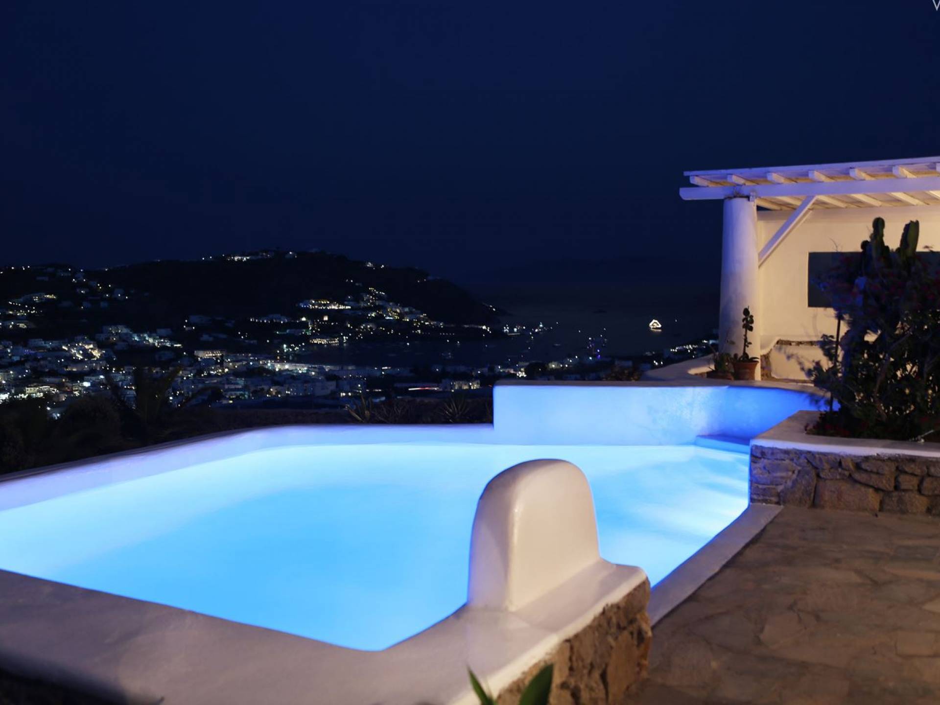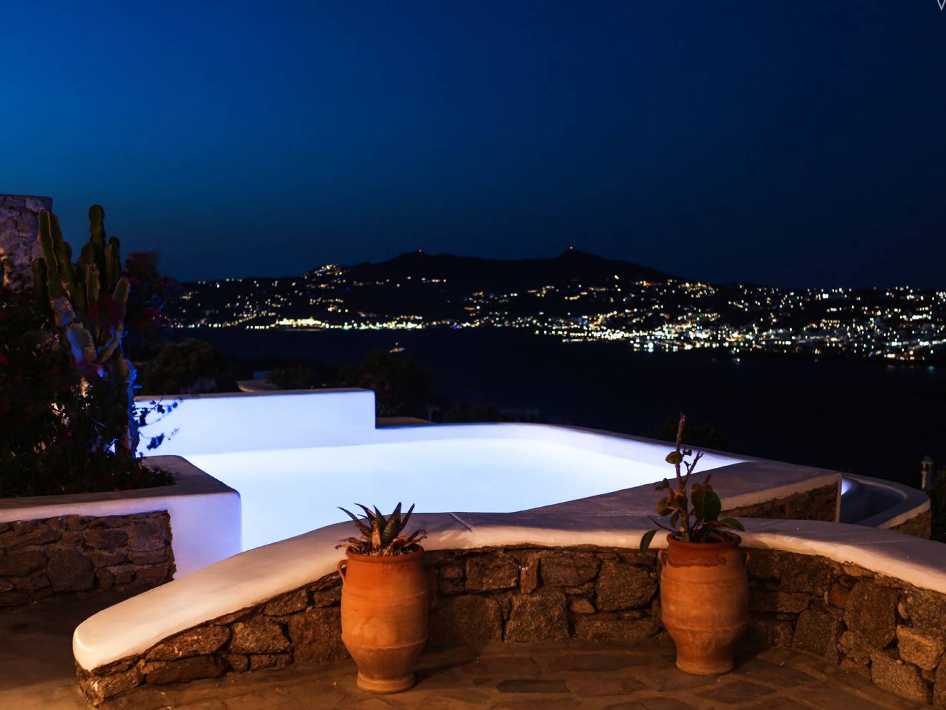 Aella Villa Mykonos ist eine Luxusvilla mit 4 Schlafzimmern und einem privaten Pool. Die Aella Villa befindet sich in der Gegend von Kanalia auf Mykonos, nur wenige Gehminuten vom atemberaubenden Strand von Ornos entfernt. Die atemberaubende Aussicht beinhaltet einen Panoramablick auf das Land und Ornos. Es verfügt über Parkplätze für 4 Autos auf einem Grundstück voller Blumen sowie einen Barbeque/Grill mit einem großen Wohnbereich, der vor Wind und Sonne geschützt ist.