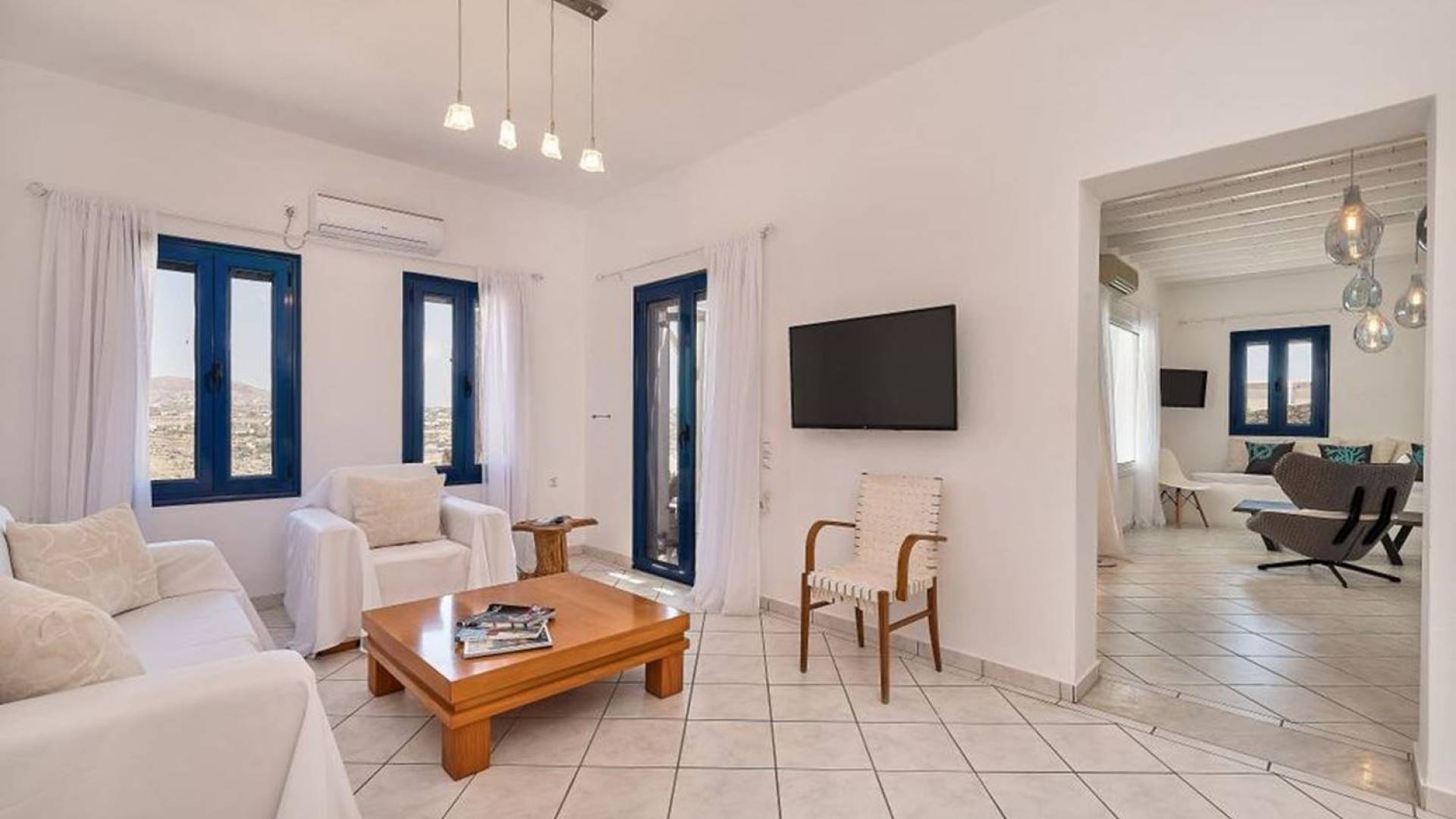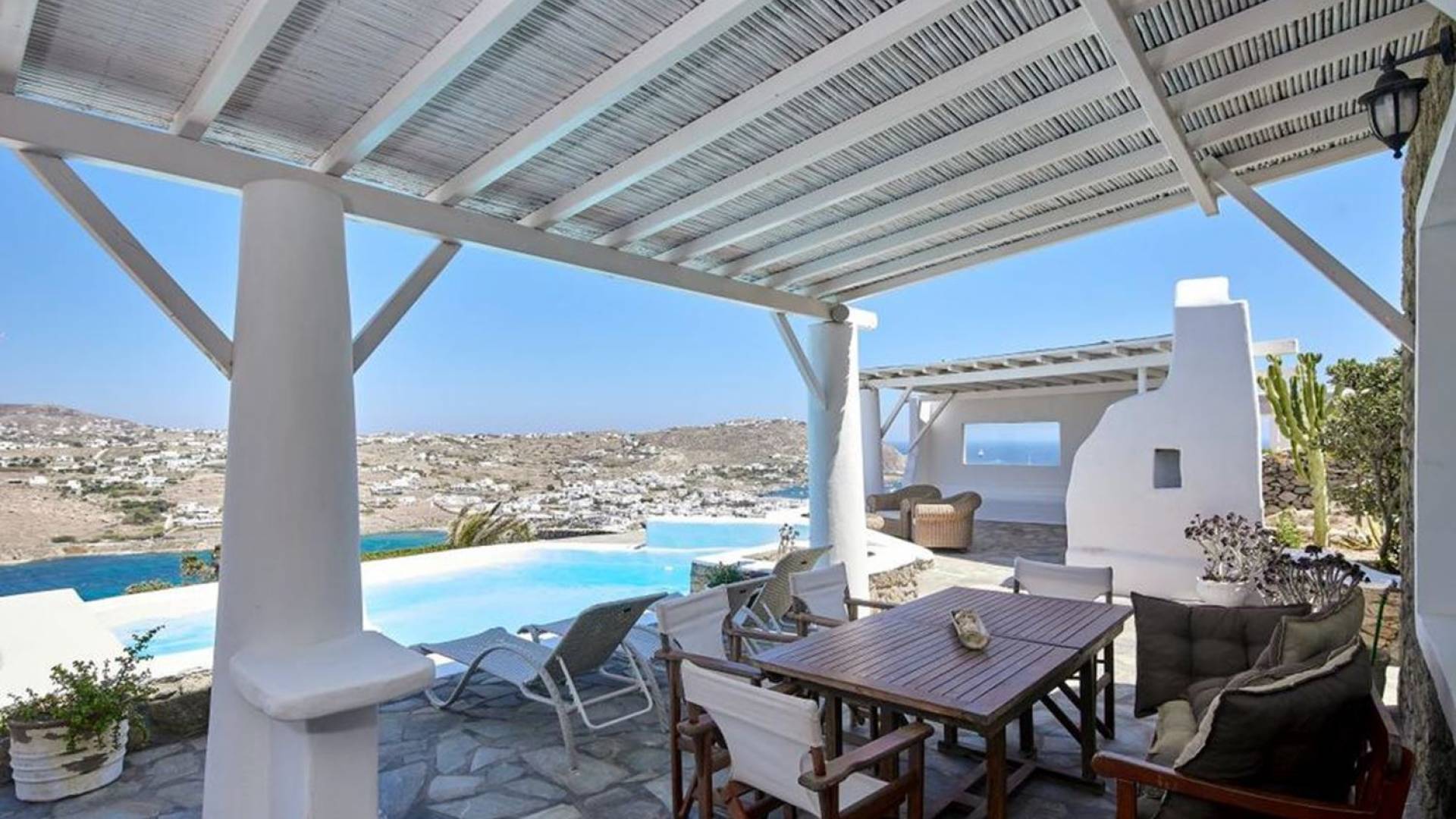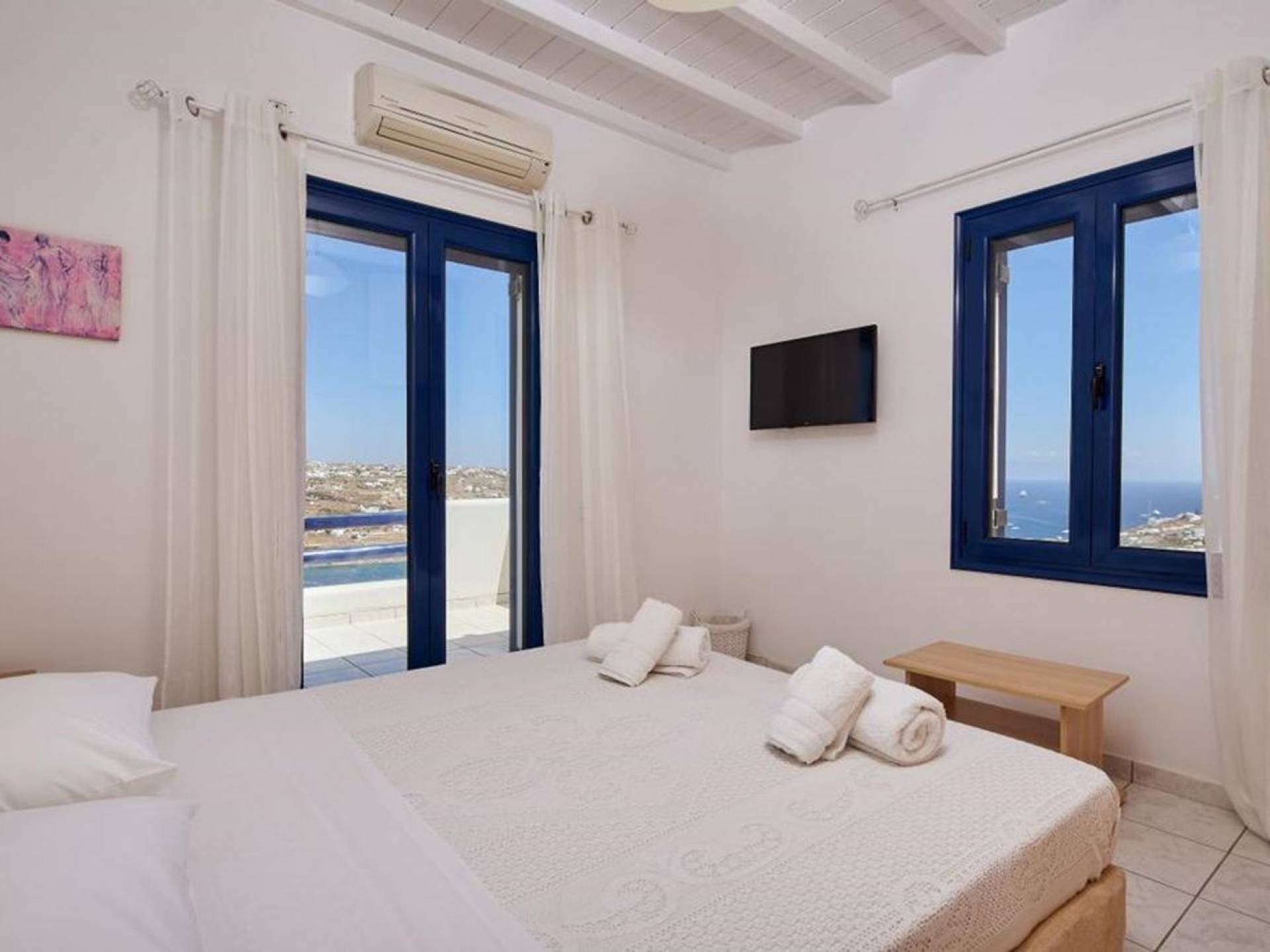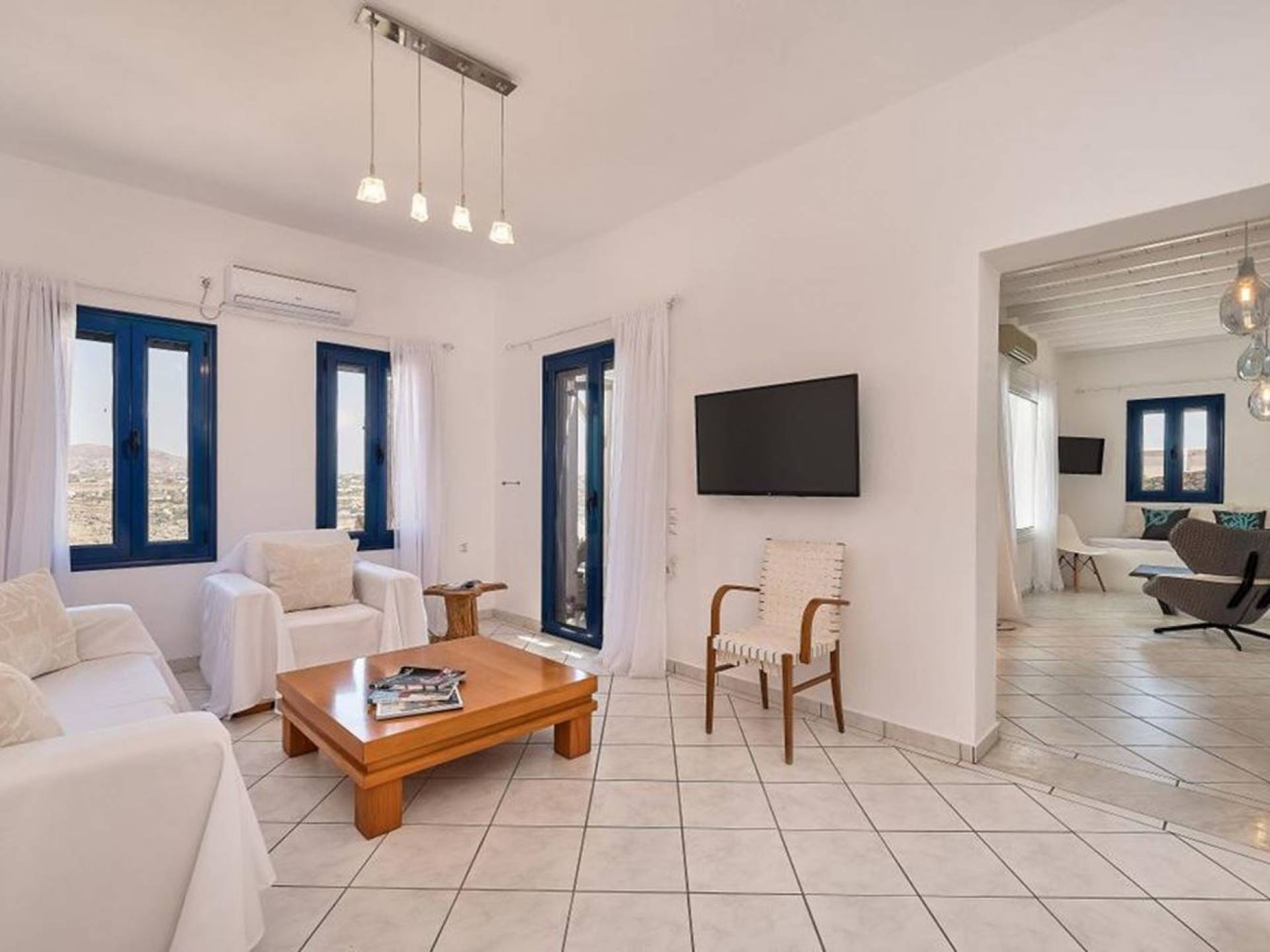 Aella Villa Mykonos ist eine Luxusvilla mit 4 Schlafzimmern und einem privaten Pool. Die Aella Villa befindet sich in der Gegend von Kanalia auf Mykonos, nur wenige Gehminuten vom atemberaubenden Strand von Ornos entfernt. Die atemberaubende Aussicht beinhaltet einen Panoramablick auf das Land und Ornos. Es verfügt über Parkplätze für 4 Autos auf einem Grundstück voller Blumen sowie einen Barbeque/Grill mit einem großen Wohnbereich, der vor Wind und Sonne geschützt ist.