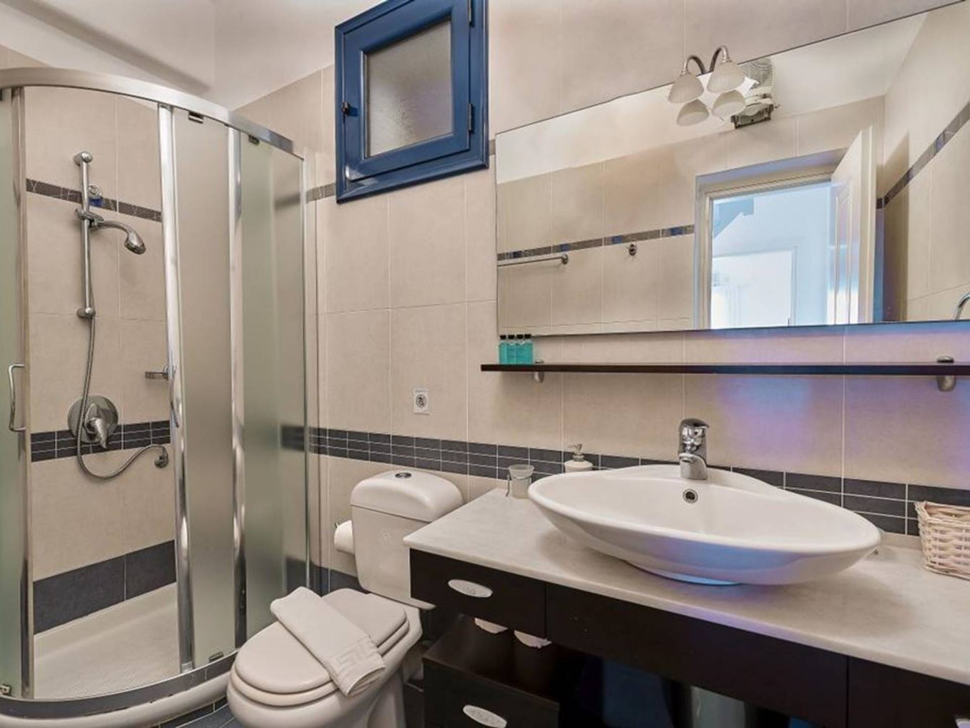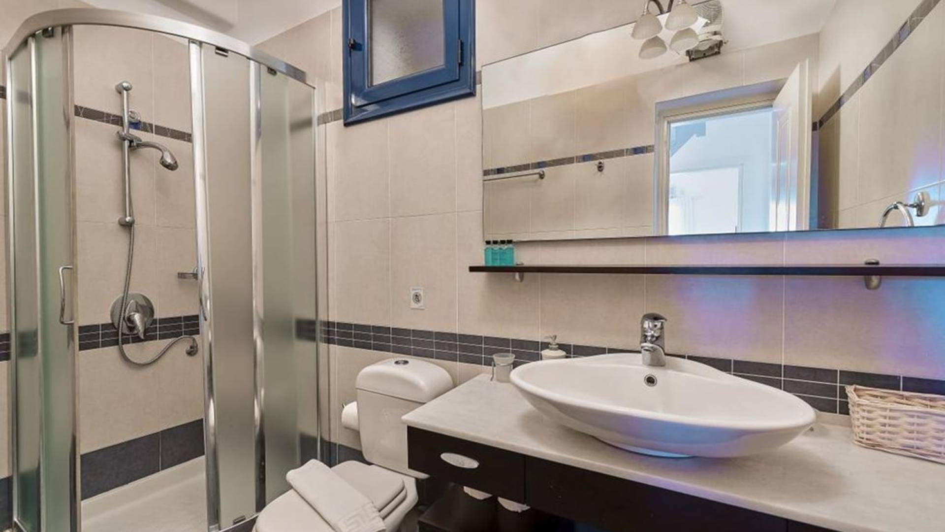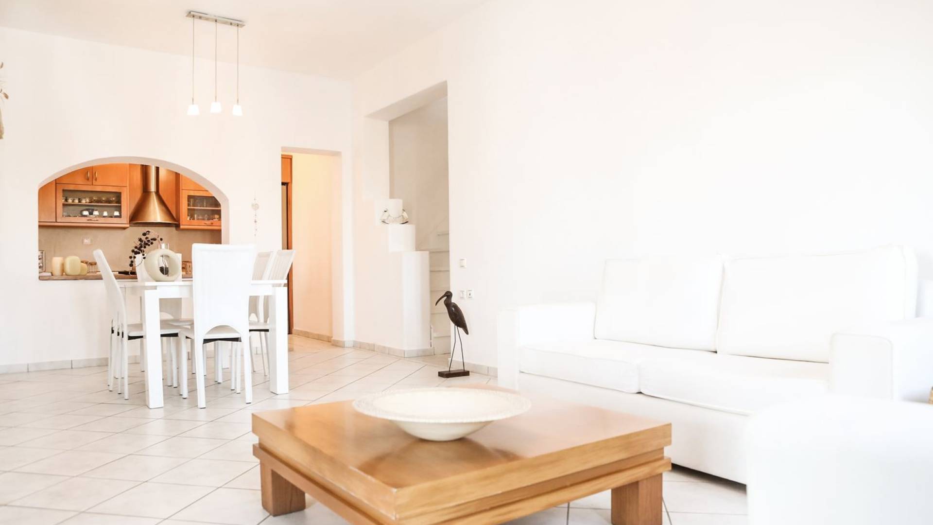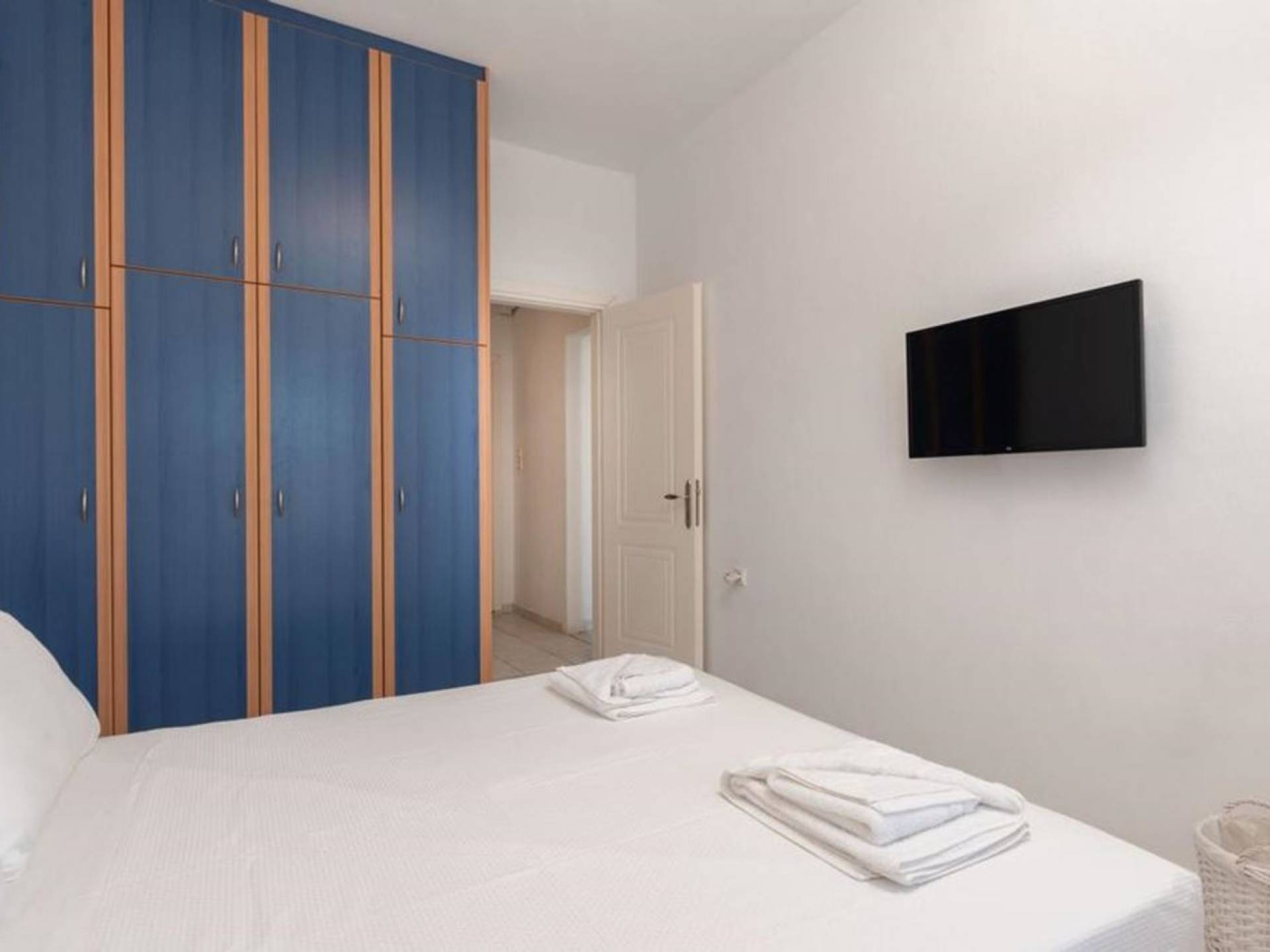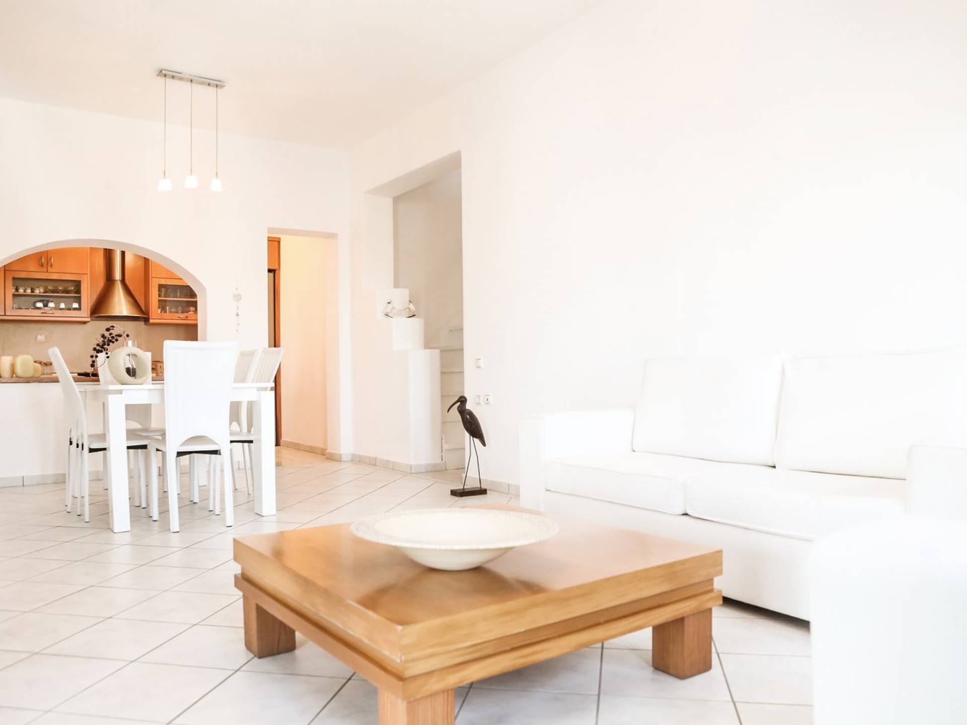 Im Erdgeschoss befindet sich das Wohnzimmer mit ägäischen Sofas und Kamin, es gibt zwei Schlafzimmer mit jeweils eigenem Bad und Kleiderschrank. Ebenfalls im Erdgeschoss befindet sich eine voll ausgestattete Küche sowie ein toller Essbereich und auch ein Badezimmer. Wenn Sie von der Treppe in den ersten Stock der Villa gehen, finden Sie das Hauptschlafzimmer, das über einen eigenen Balkon verfügt, sowie das Kinderzimmer und ein Badezimmer. Unter den Schlafzimmern im ersten Stock gibt es ein zusätzliches Zimmer mit einem Sofa/Bett, das Platz für eine weitere Person bietet.