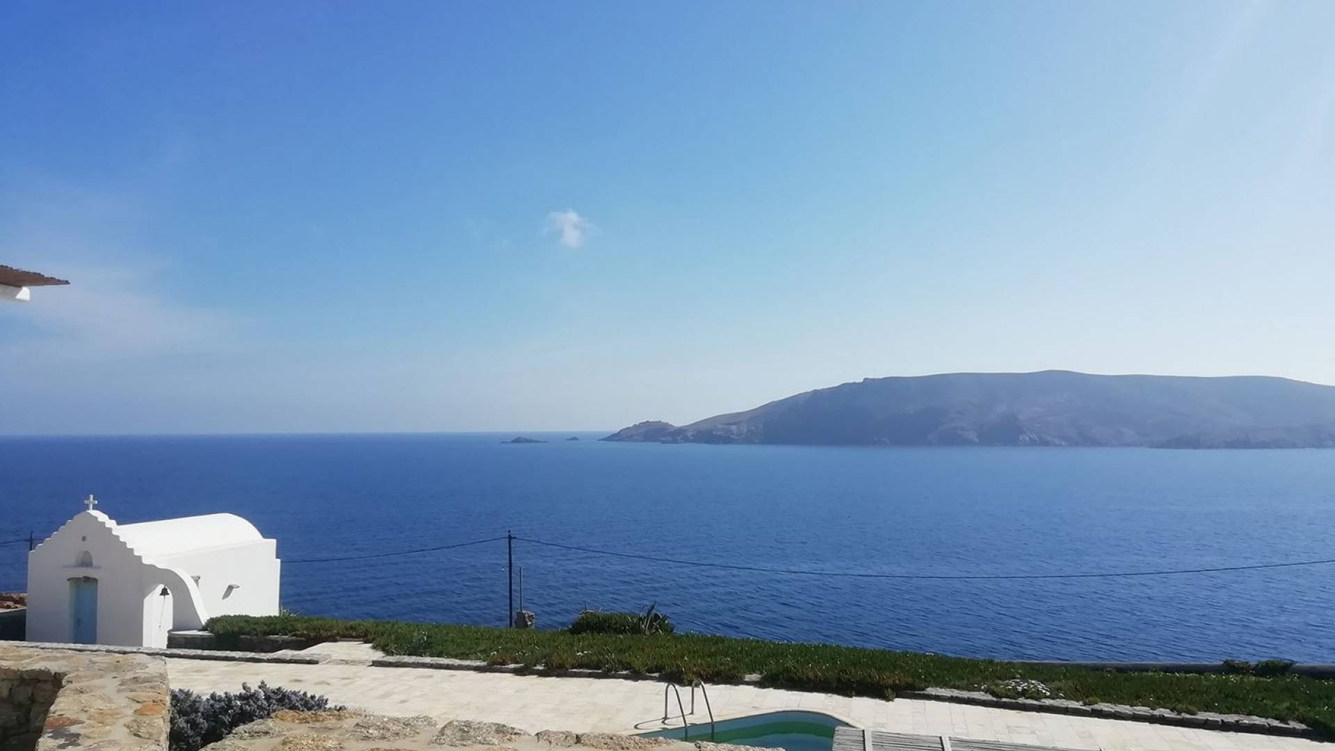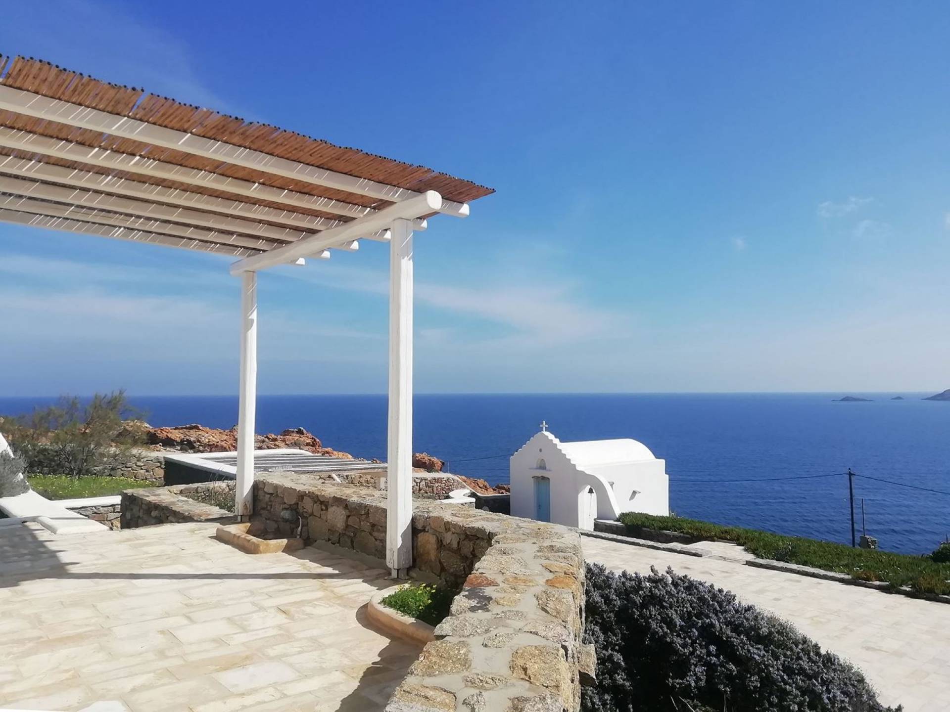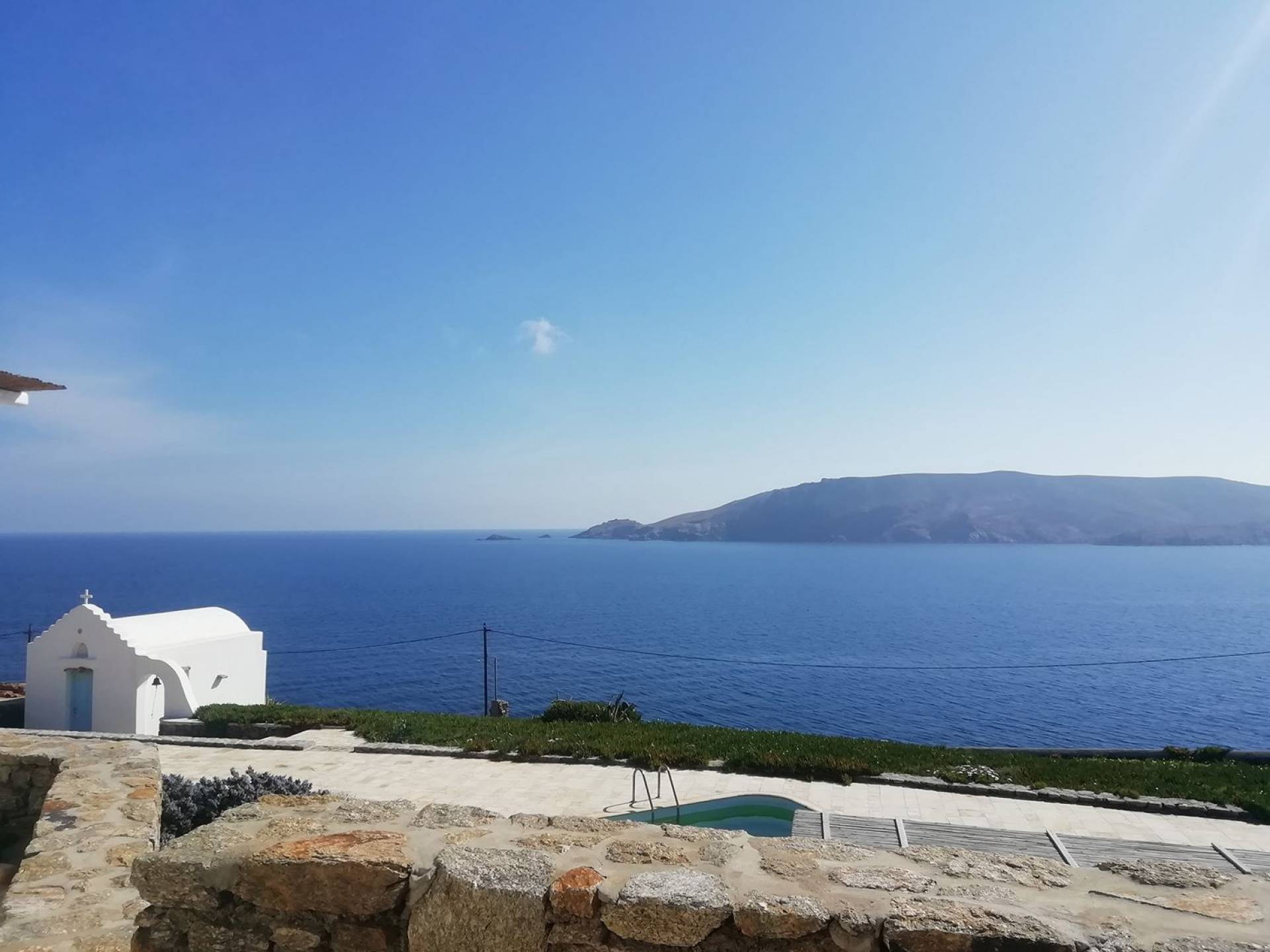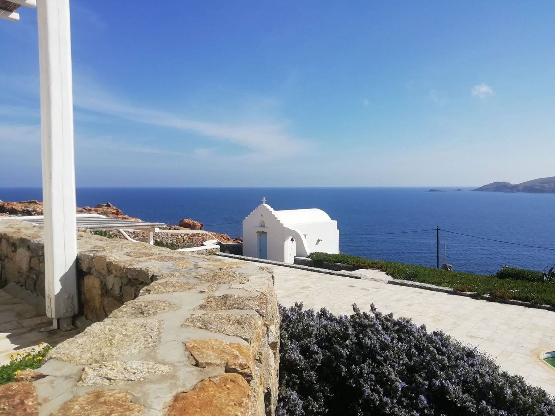 Die geräumige Poolterrasse ist perfekt für Dinnerpartys oder Hochzeiten! Was können sich ein paar mehr wünschen als weite, erstaunliche Aussichten, eine private kleine malerische Kirche und türkisfarbenes Wasser direkt vor ihrer wunderschönen Villa ... Nach intensiven mykonischen Nächten schätzen alle Gäste das Flair eines abgelegenen Zufluchtsorts und die atemberaubende Aussicht auf den Sonnenaufgang. p>