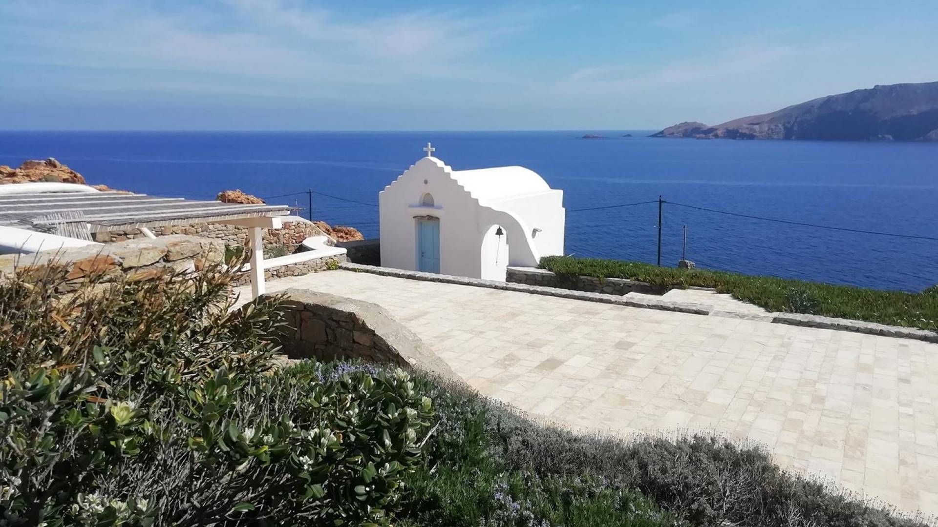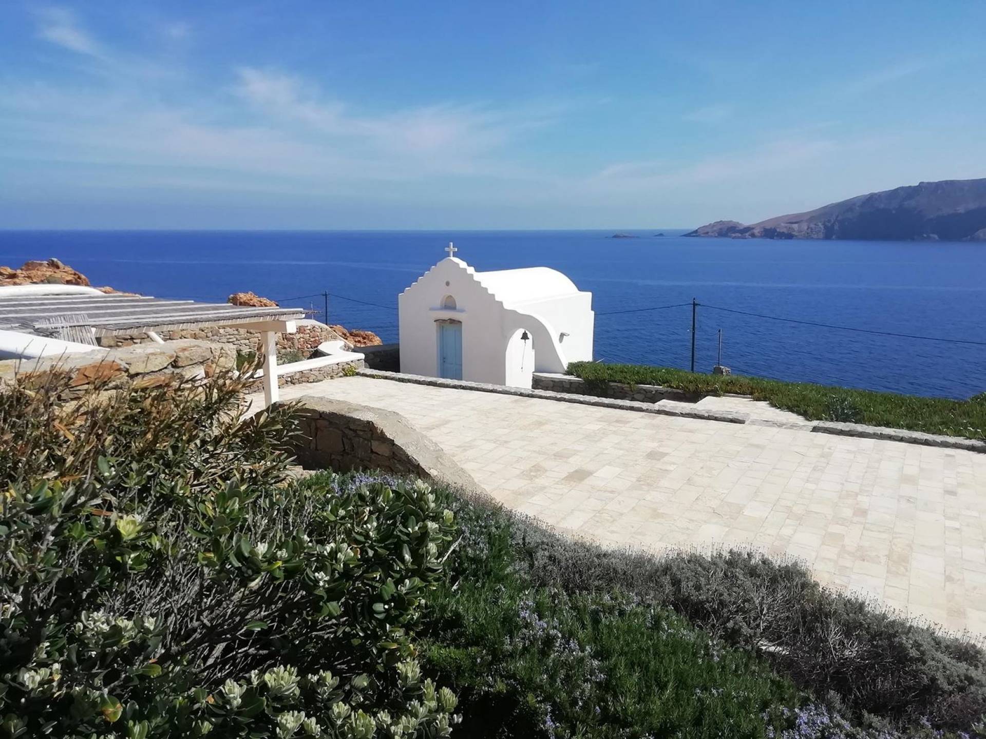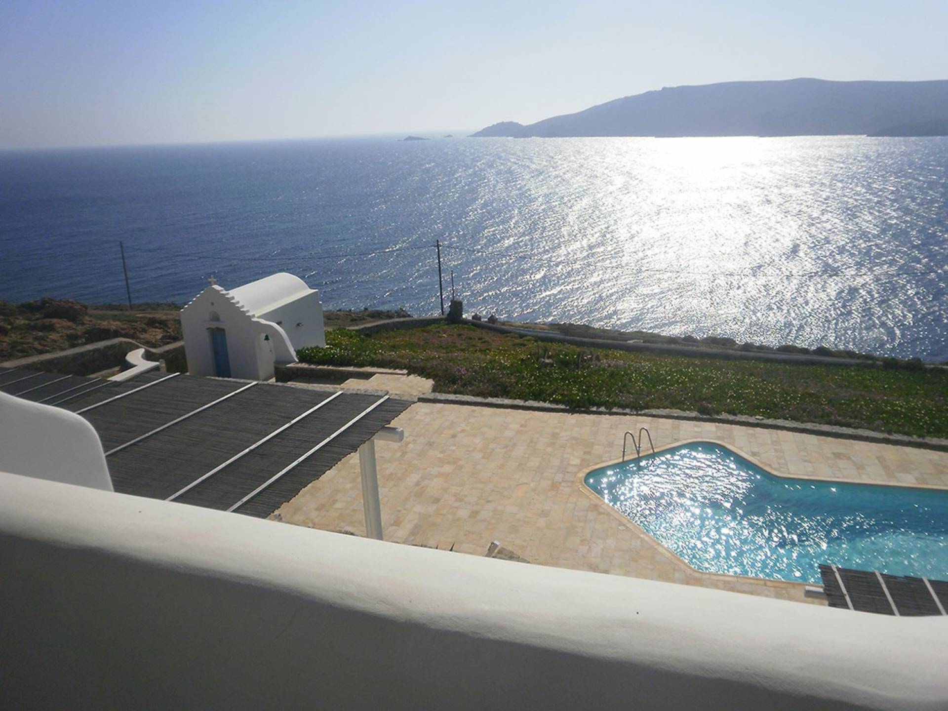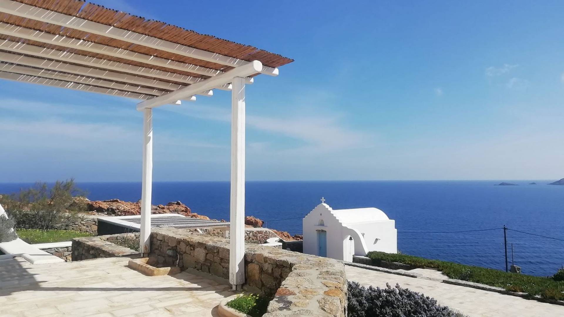 Die geräumige Poolterrasse ist perfekt für Dinnerpartys oder Hochzeiten! Was können sich ein paar mehr wünschen als weite, erstaunliche Aussichten, eine private kleine malerische Kirche und türkisfarbenes Wasser direkt vor ihrer wunderschönen Villa ... Nach intensiven mykonischen Nächten schätzen alle Gäste das Flair eines abgelegenen Zufluchtsorts und die atemberaubende Aussicht auf den Sonnenaufgang. p>