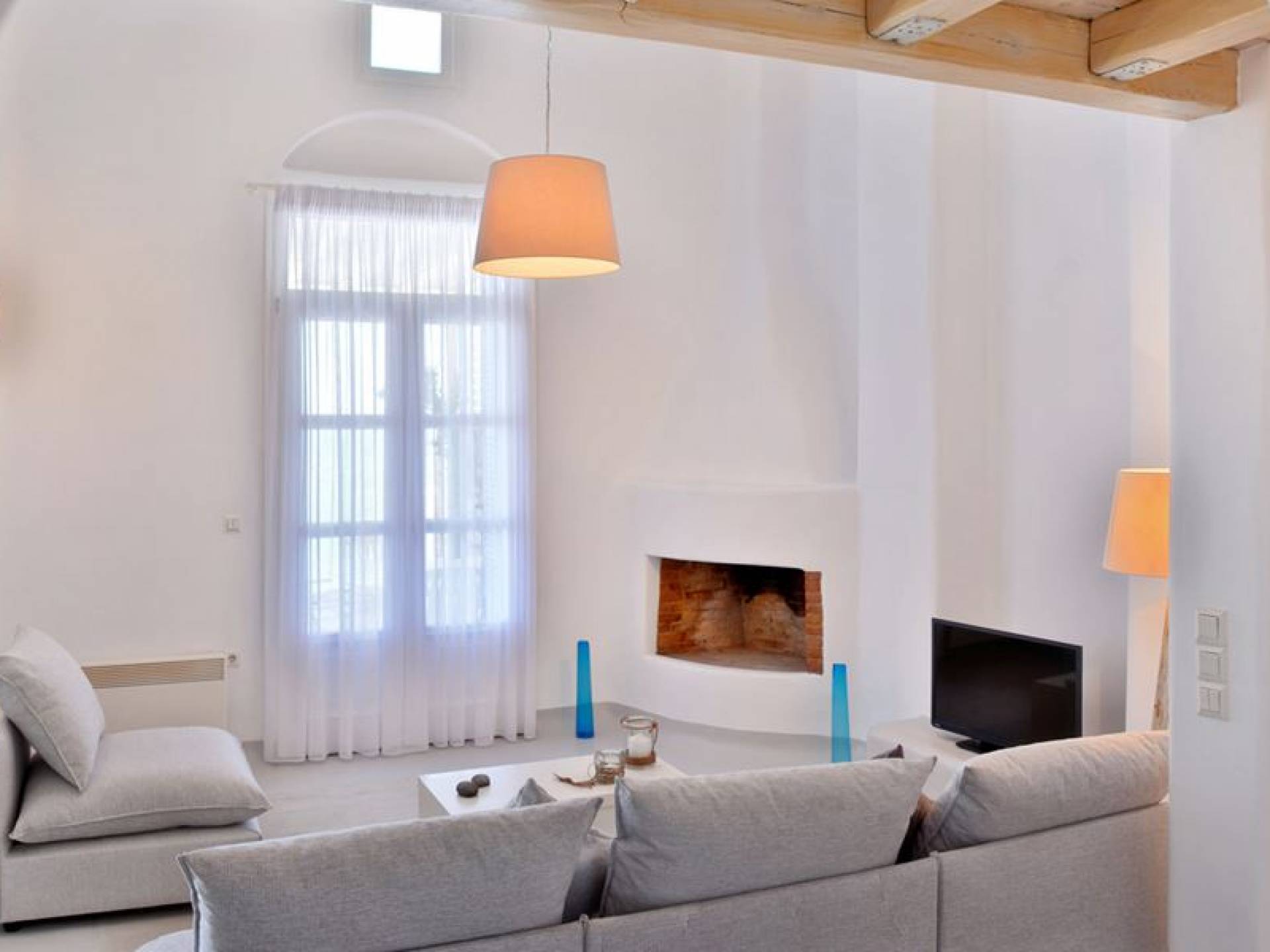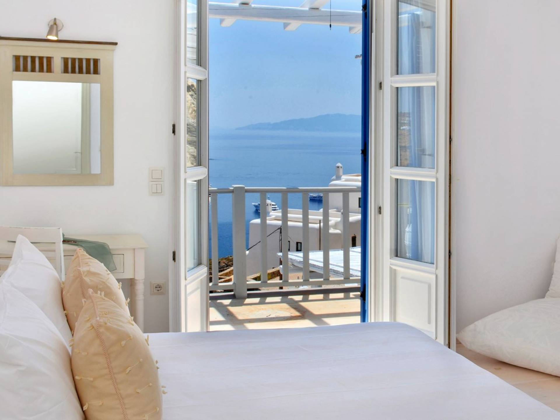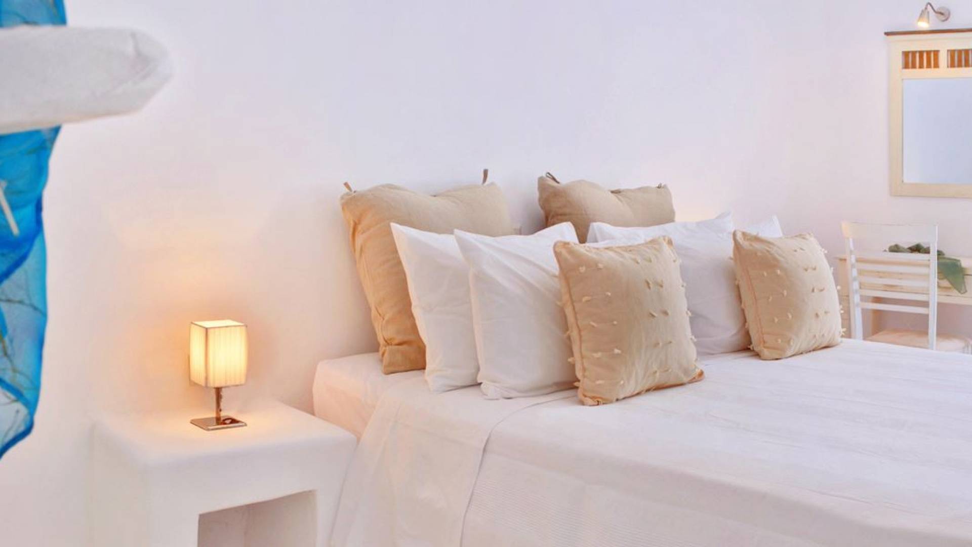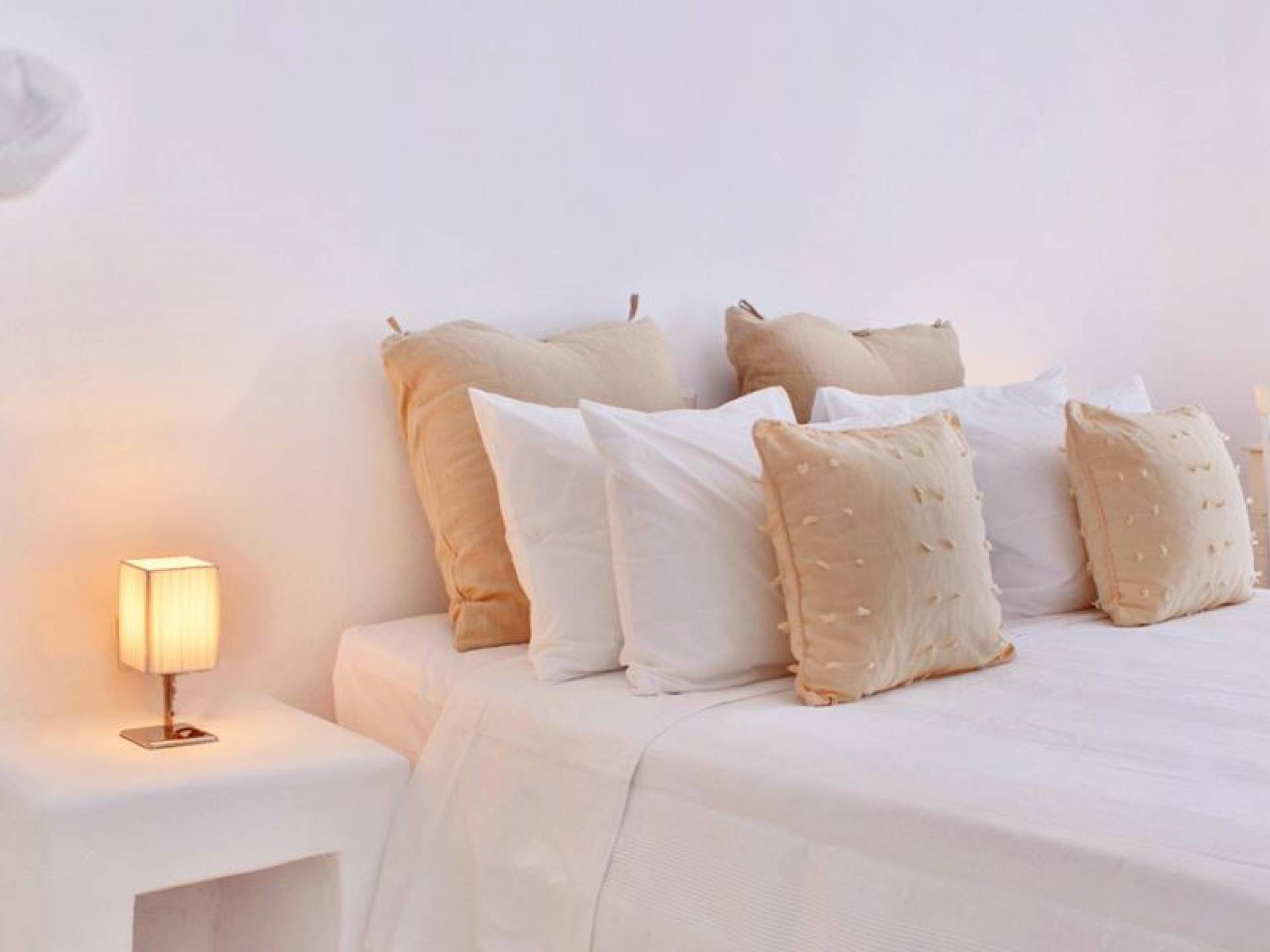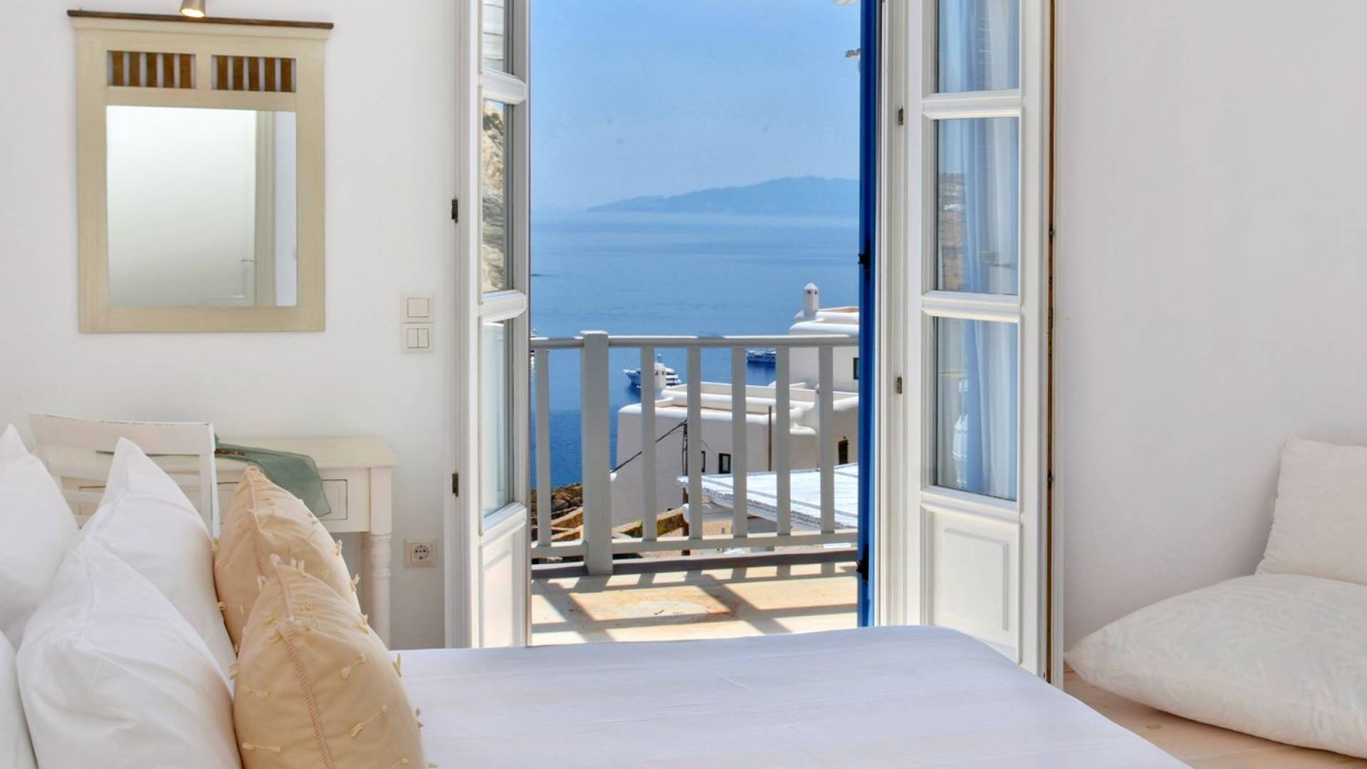 Schlichtheit und Eleganz sind die Elemente, die überall widerhallen, während die schillernde Palette von Mykonos in jedem Haus von innen nach außen den Ton angibt, wobei Weiß die Szene dominiert, während die zuckersüßen Pastelltöne ihre besondere Note hinzufügen. Die Villa Thelgo ist ohne Zweifel der perfekte Ort, um sich zurückzulehnen und bequem zu entspannen, während Sie sich den Freuden von Mykonos hingeben.