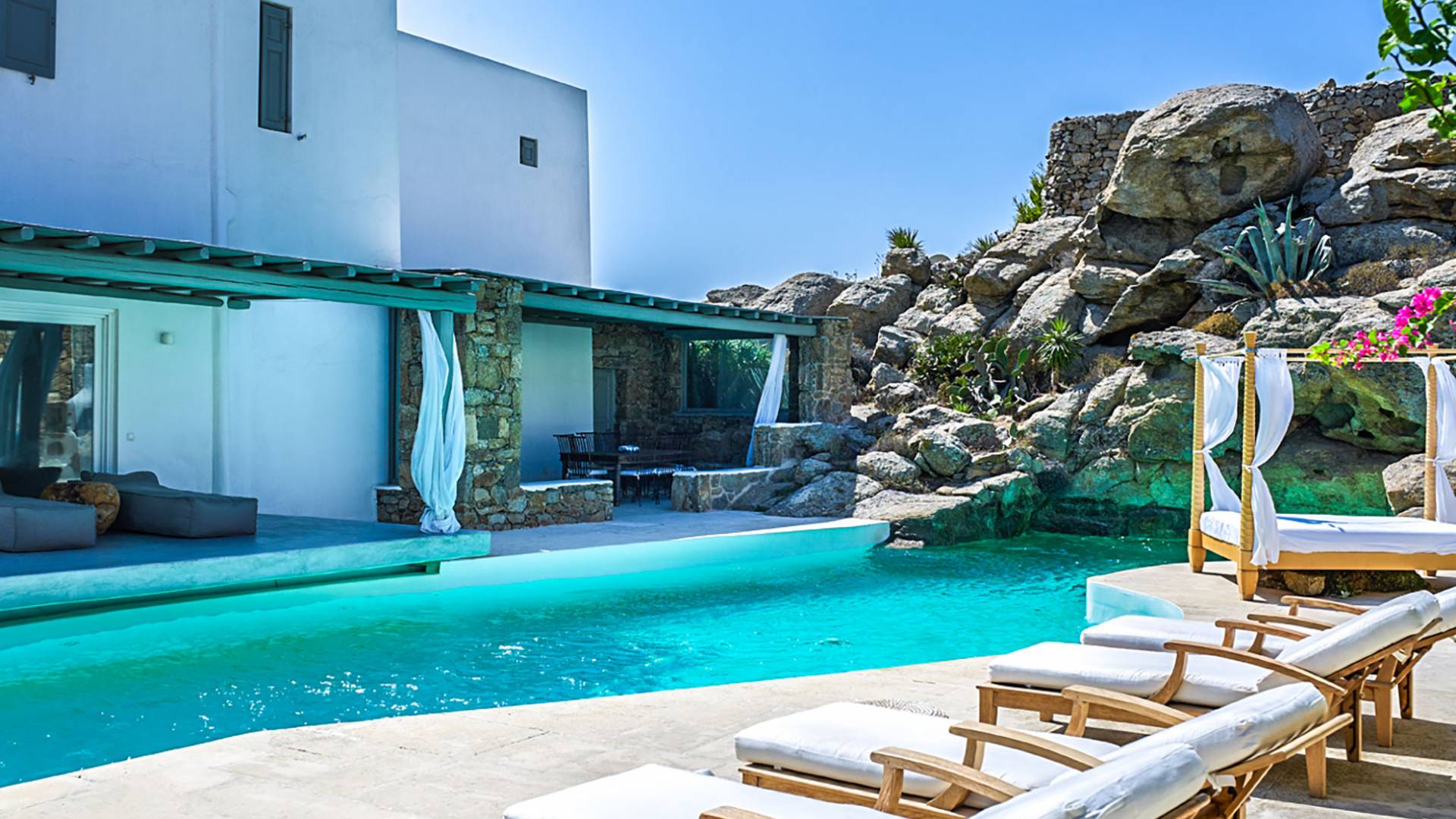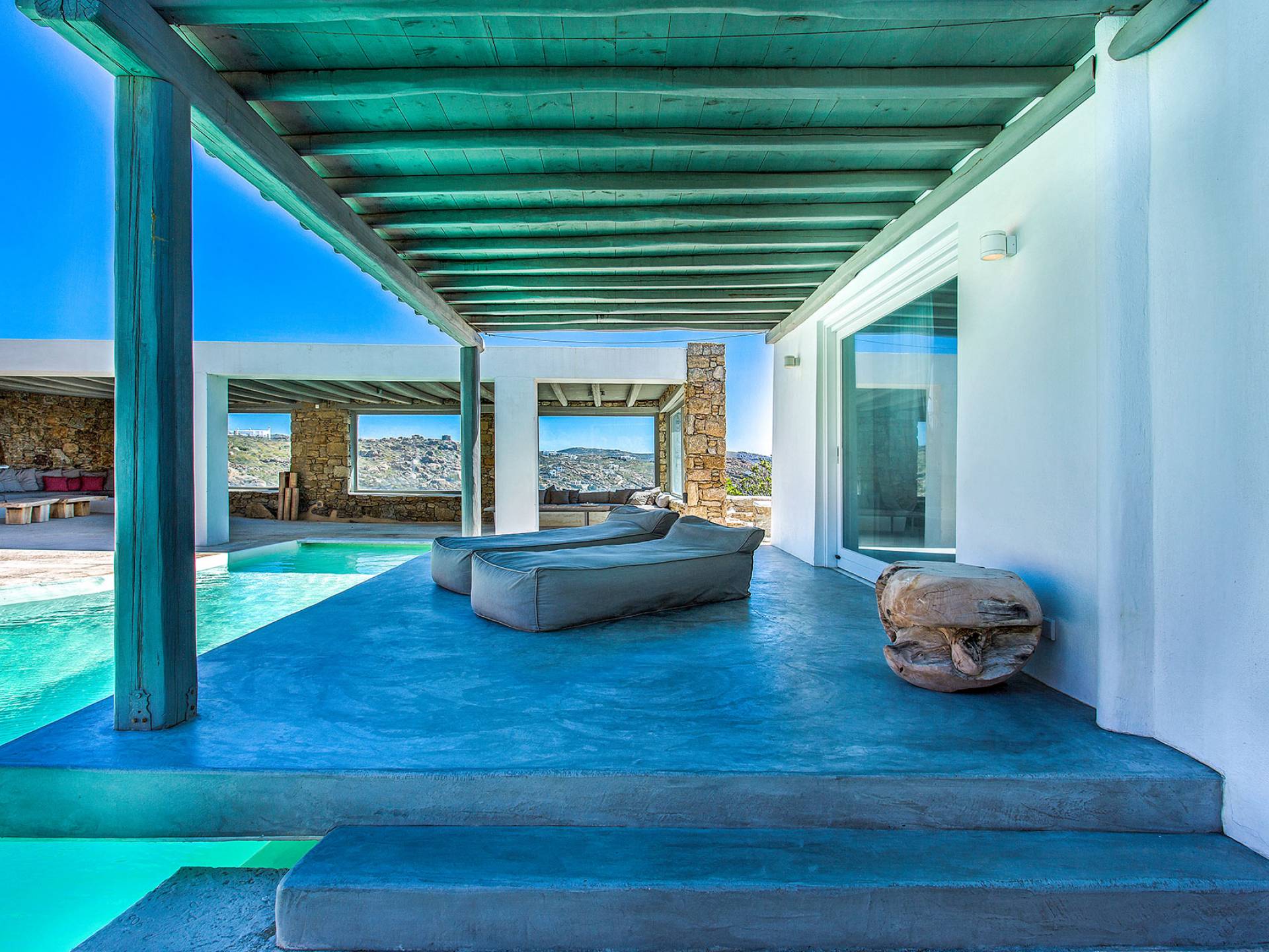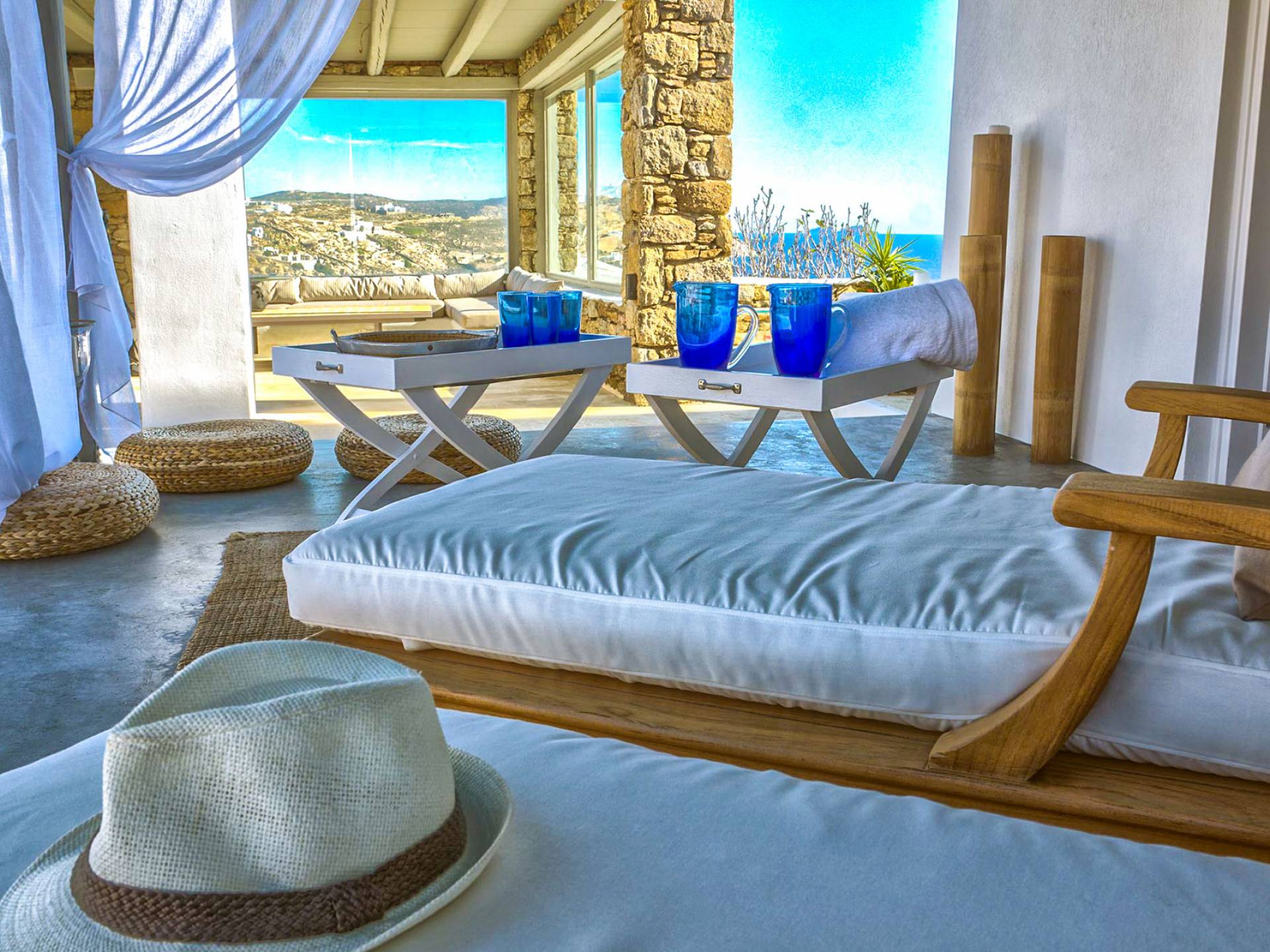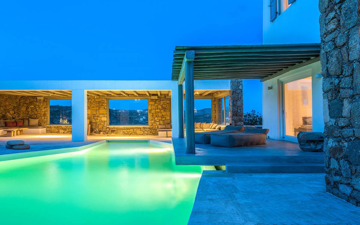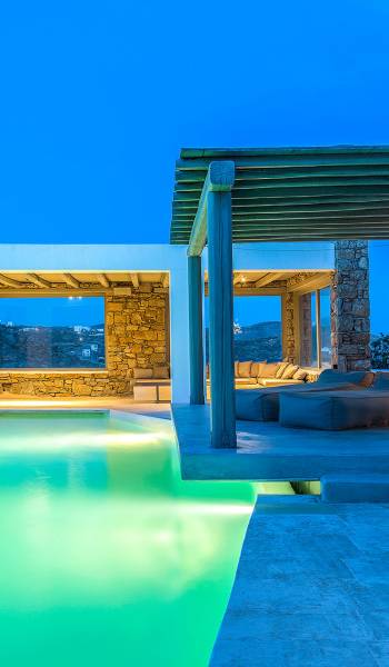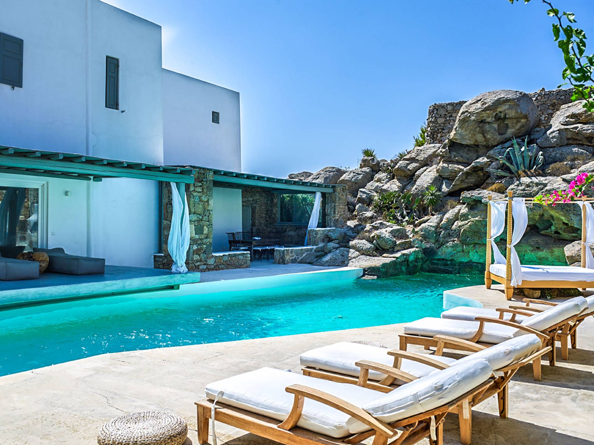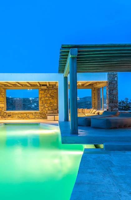 Villa Delilah Mykonos in Pyrgi ist eine luxuriöse 260 Quadratmeter große Villa, ganz in der Nähe des bekannten Super Paradise.