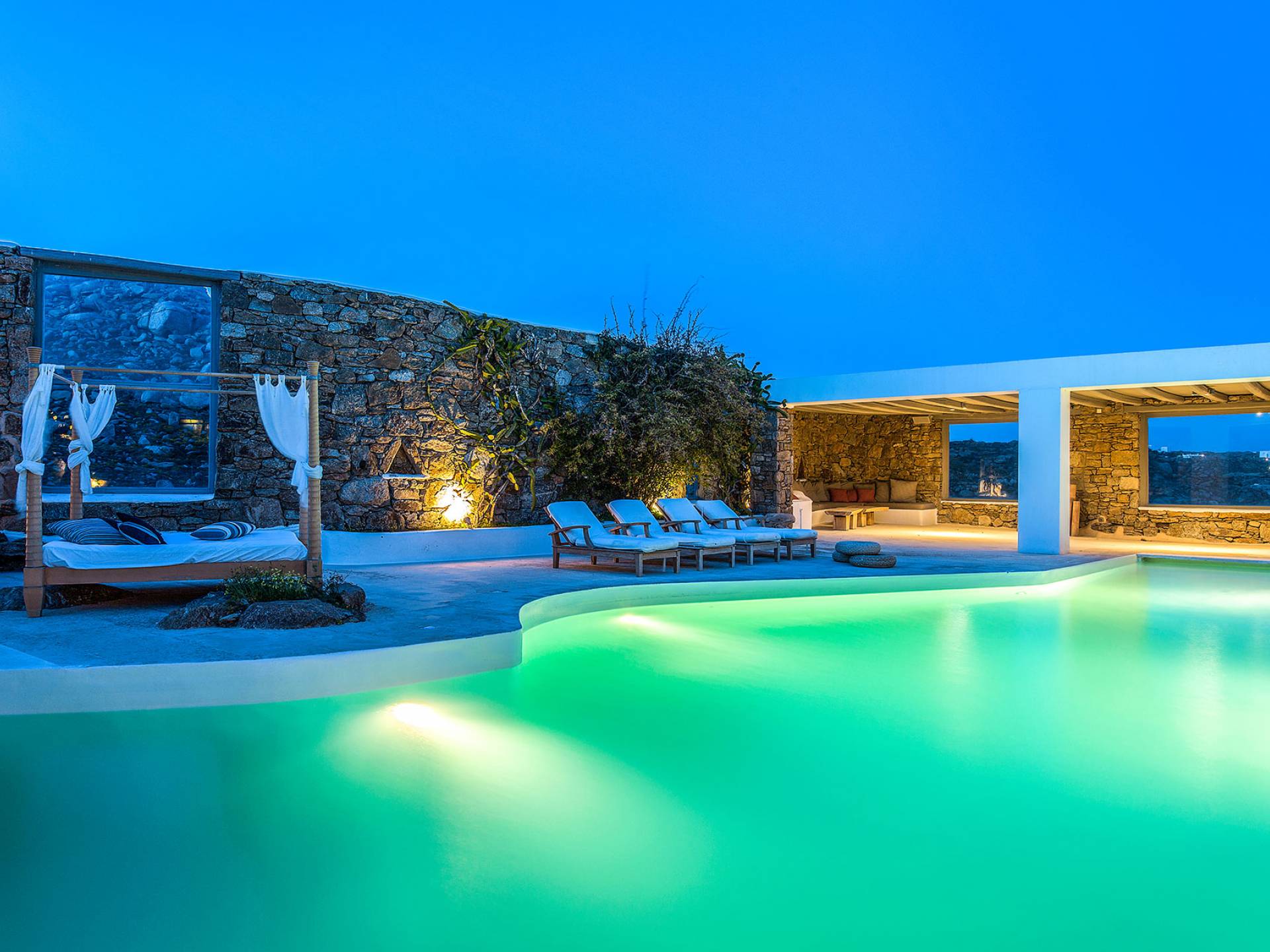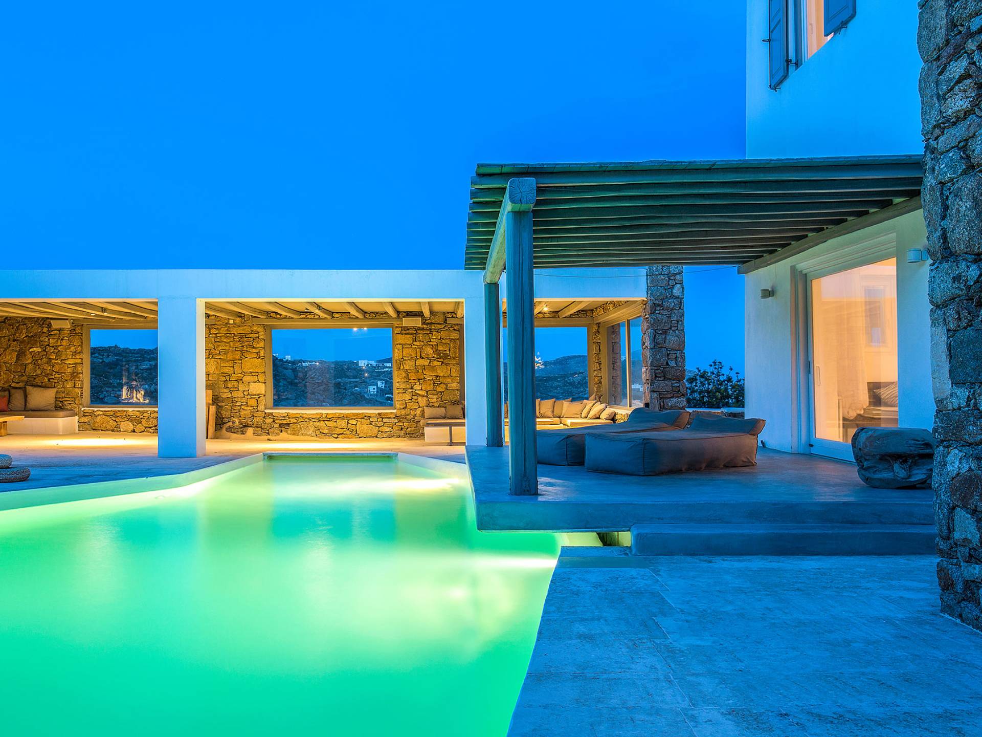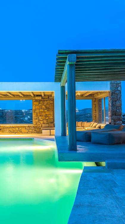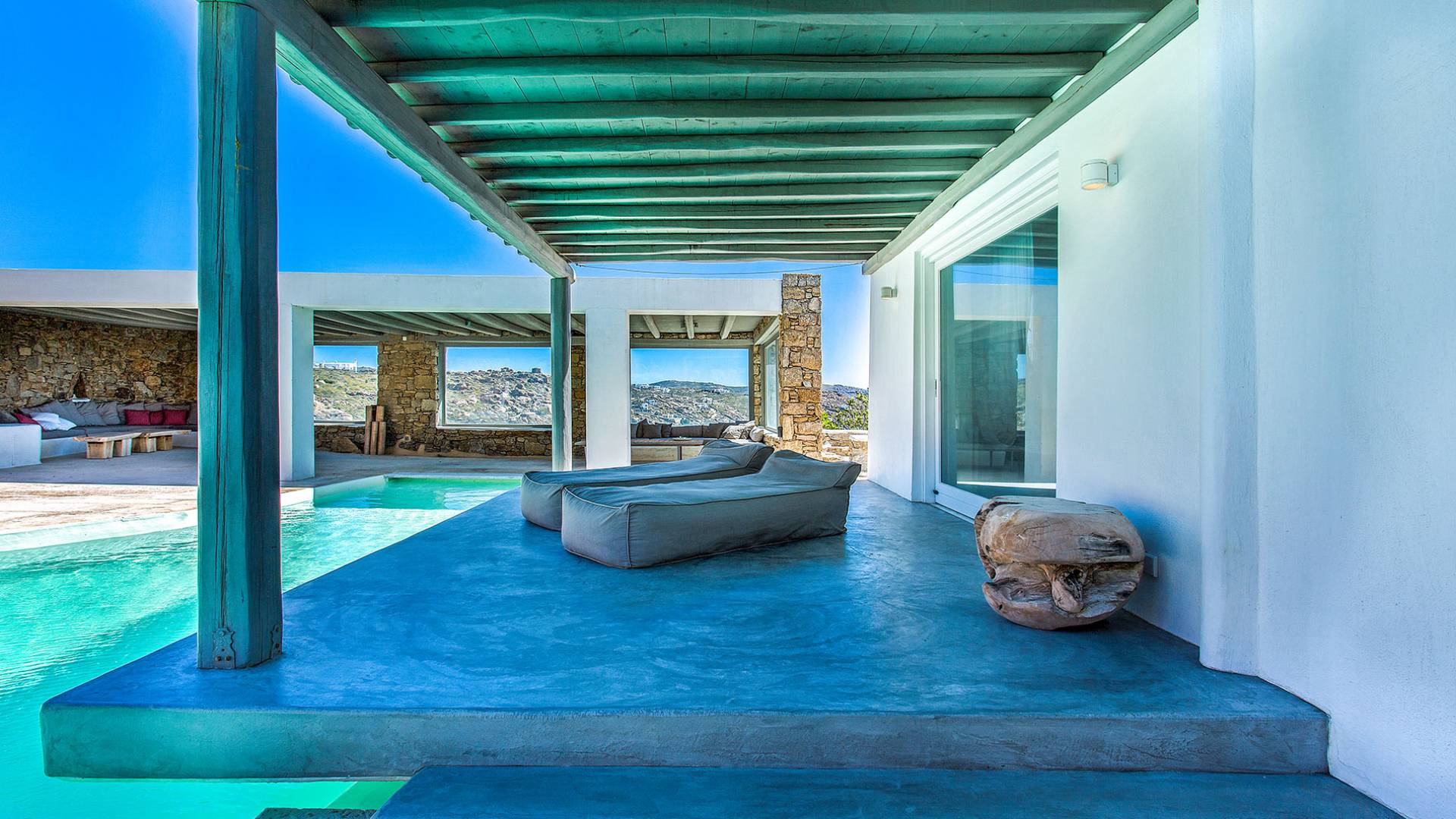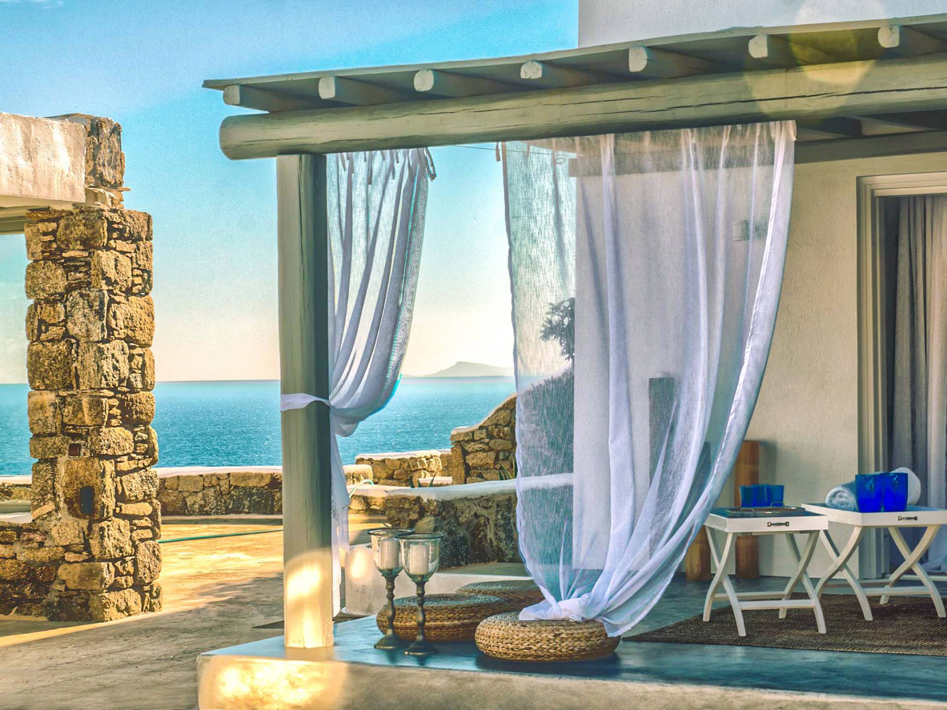 Villa Delilah Mykonos in Pyrgi ist eine luxuriöse 260 Quadratmeter große Villa, ganz in der Nähe des bekannten Super Paradise.