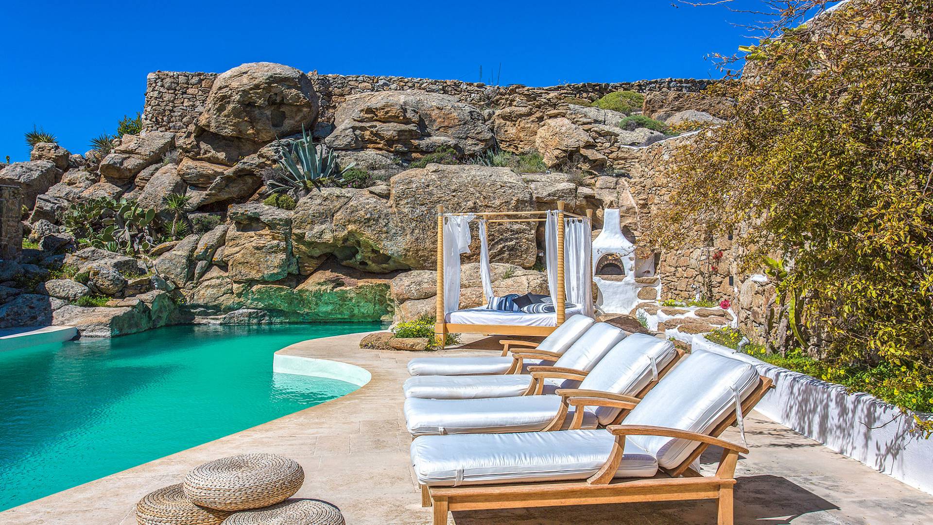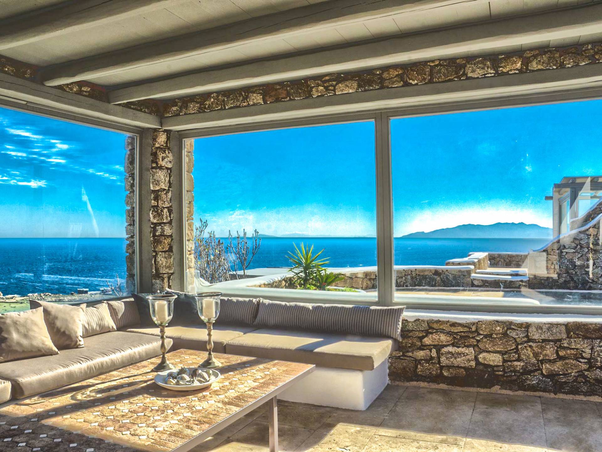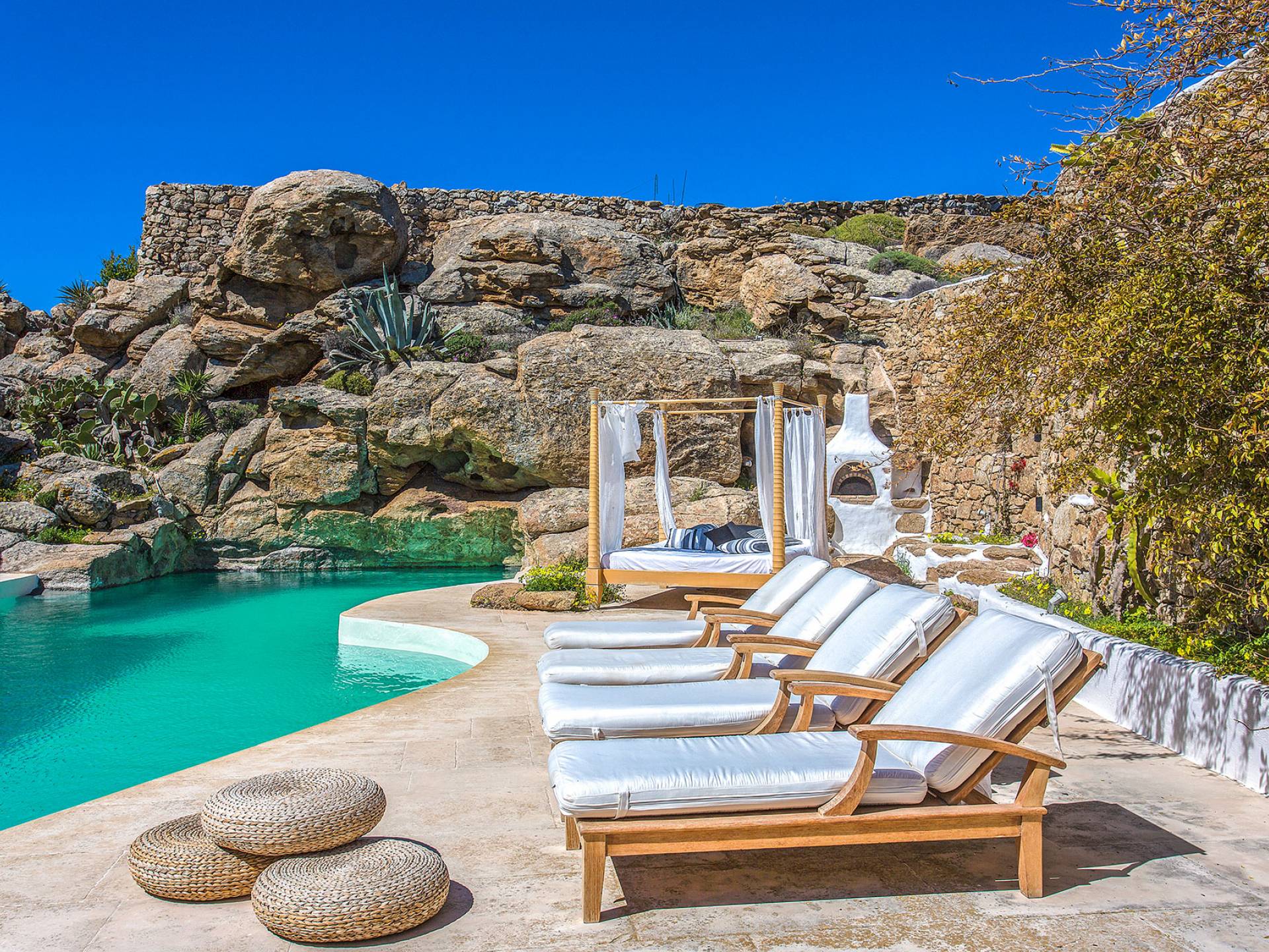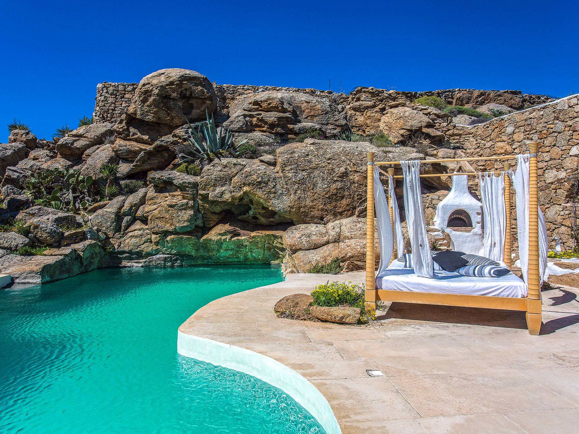 Villa Delilah Mykonos in Pyrgi ist eine luxuriöse 260 Quadratmeter große Villa, ganz in der Nähe des bekannten Super Paradise.